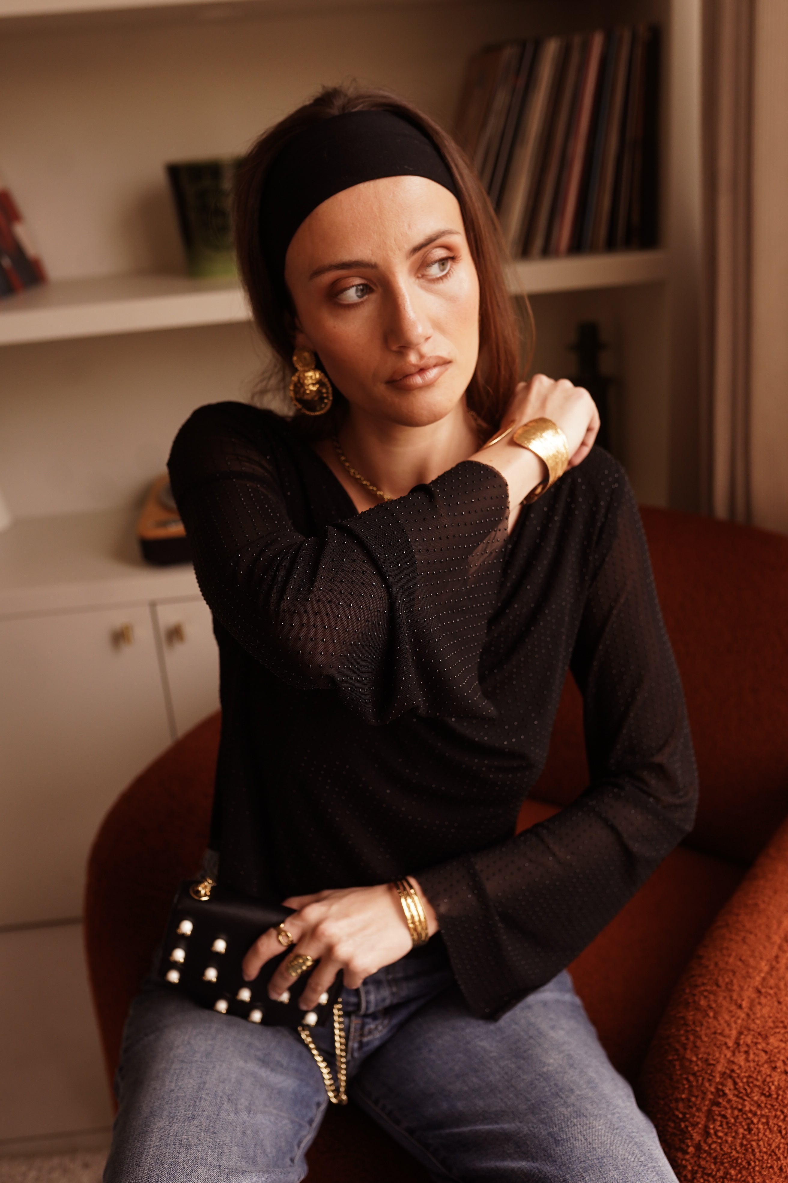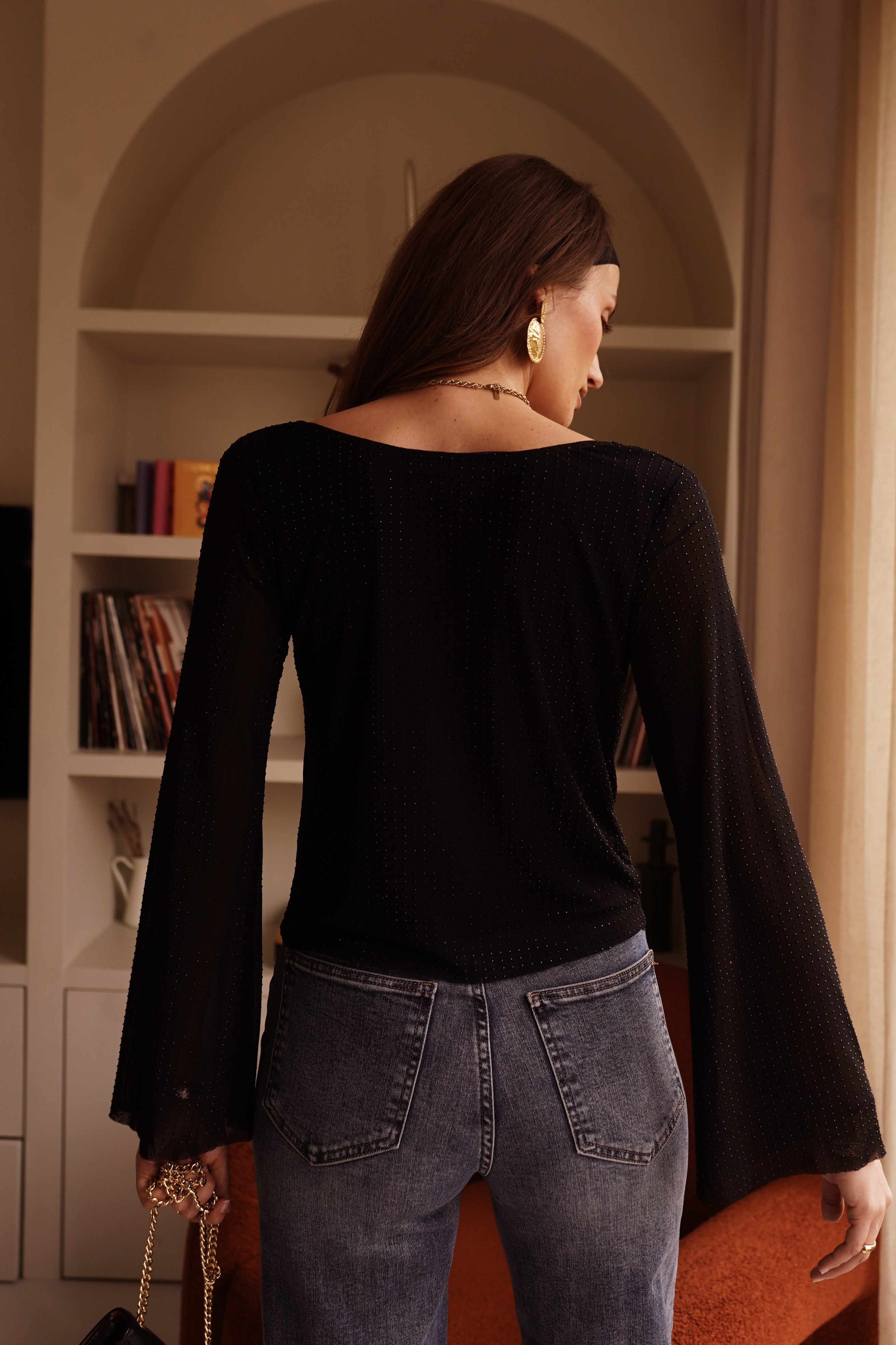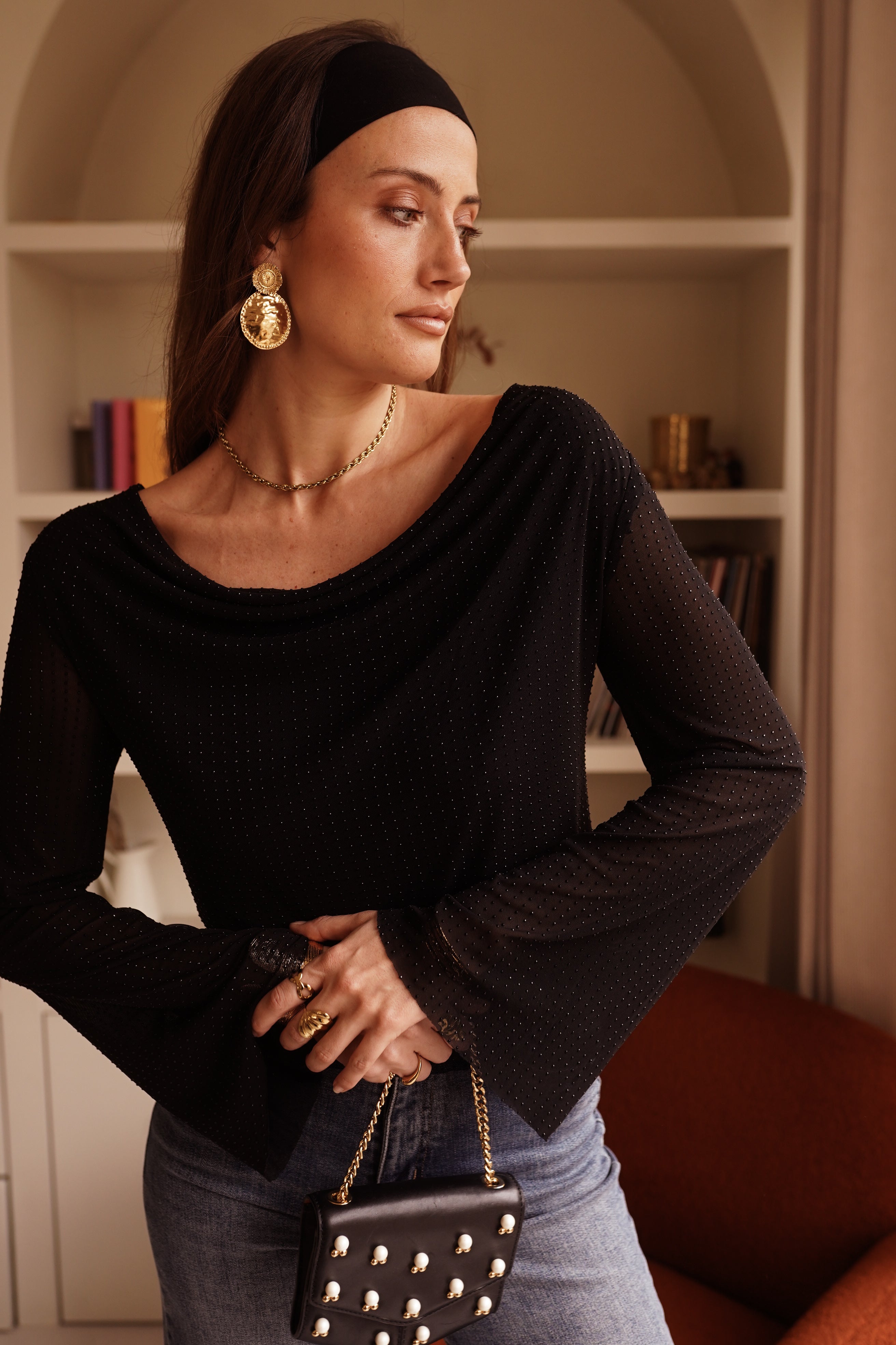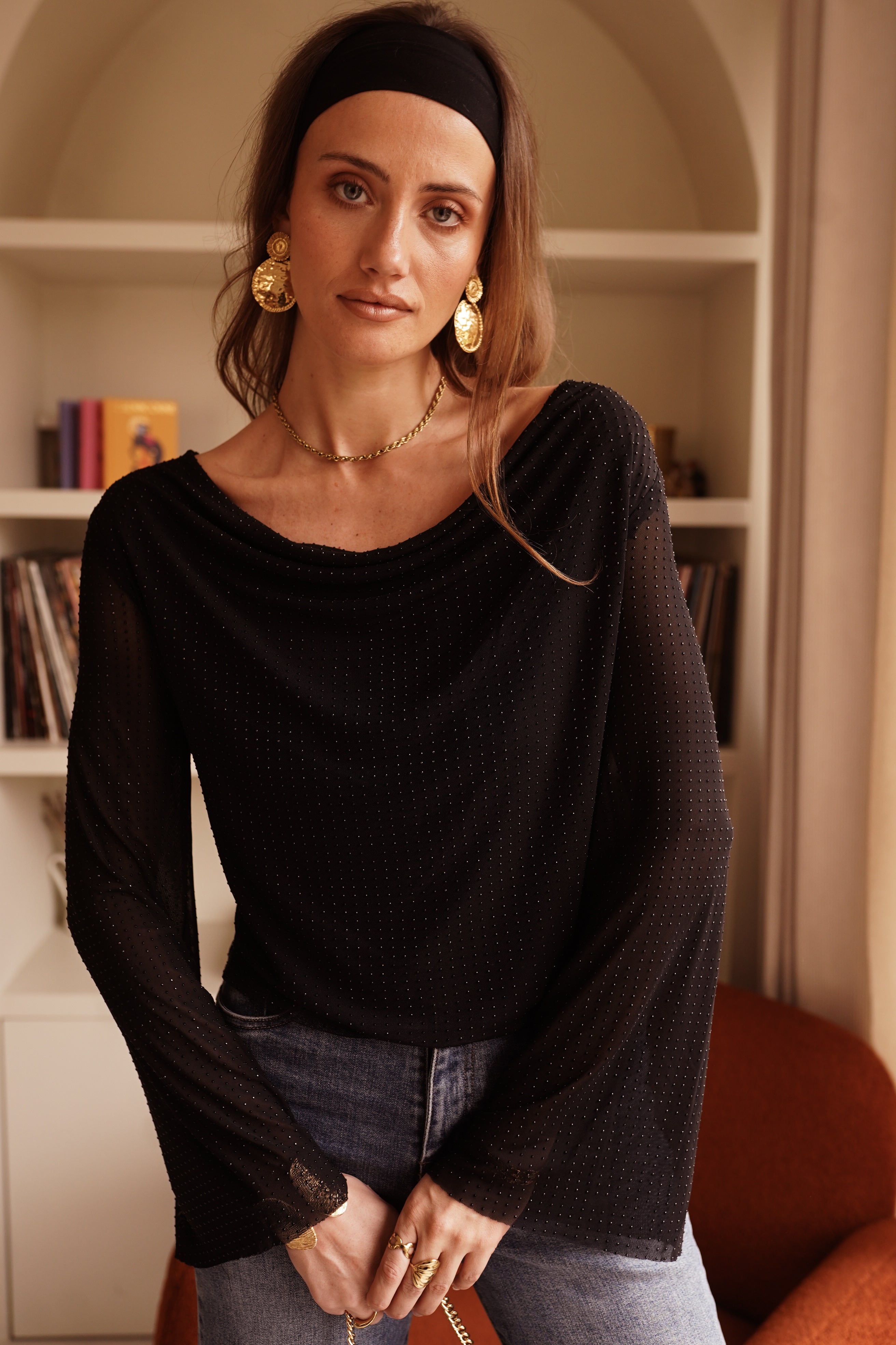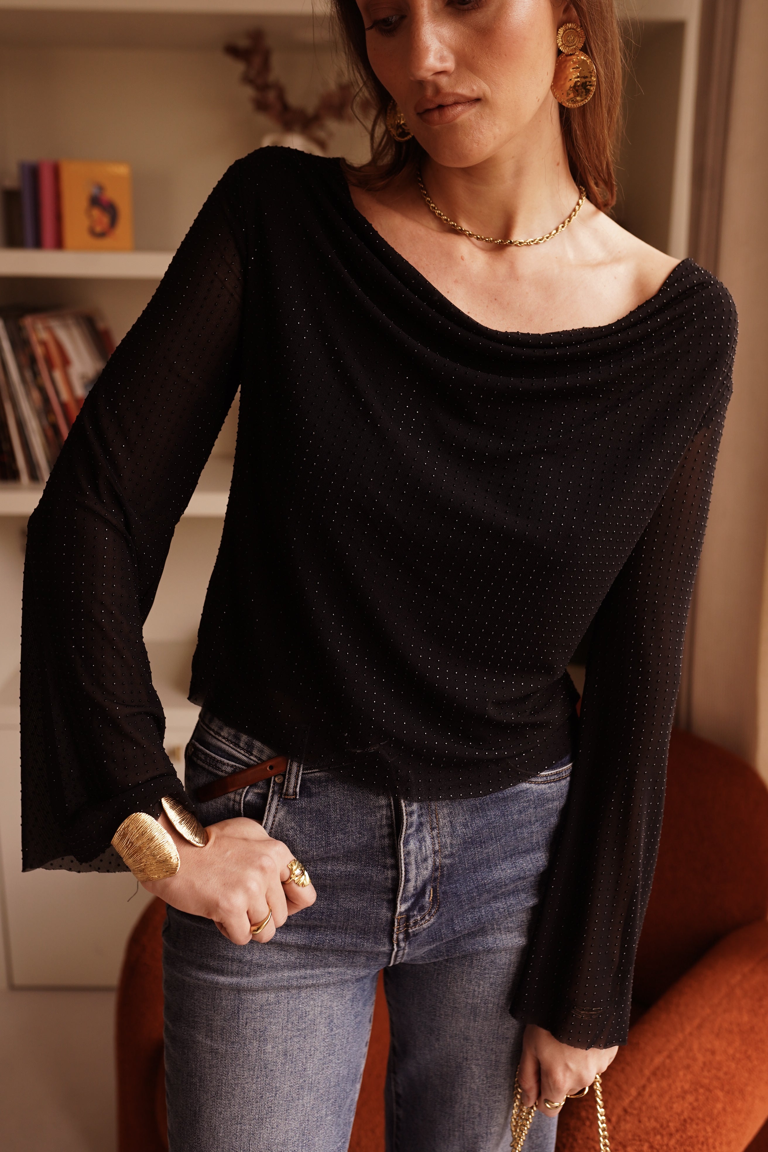 - Coupe souple, manches longues légèrement évasées et encolure délicatement dégagée