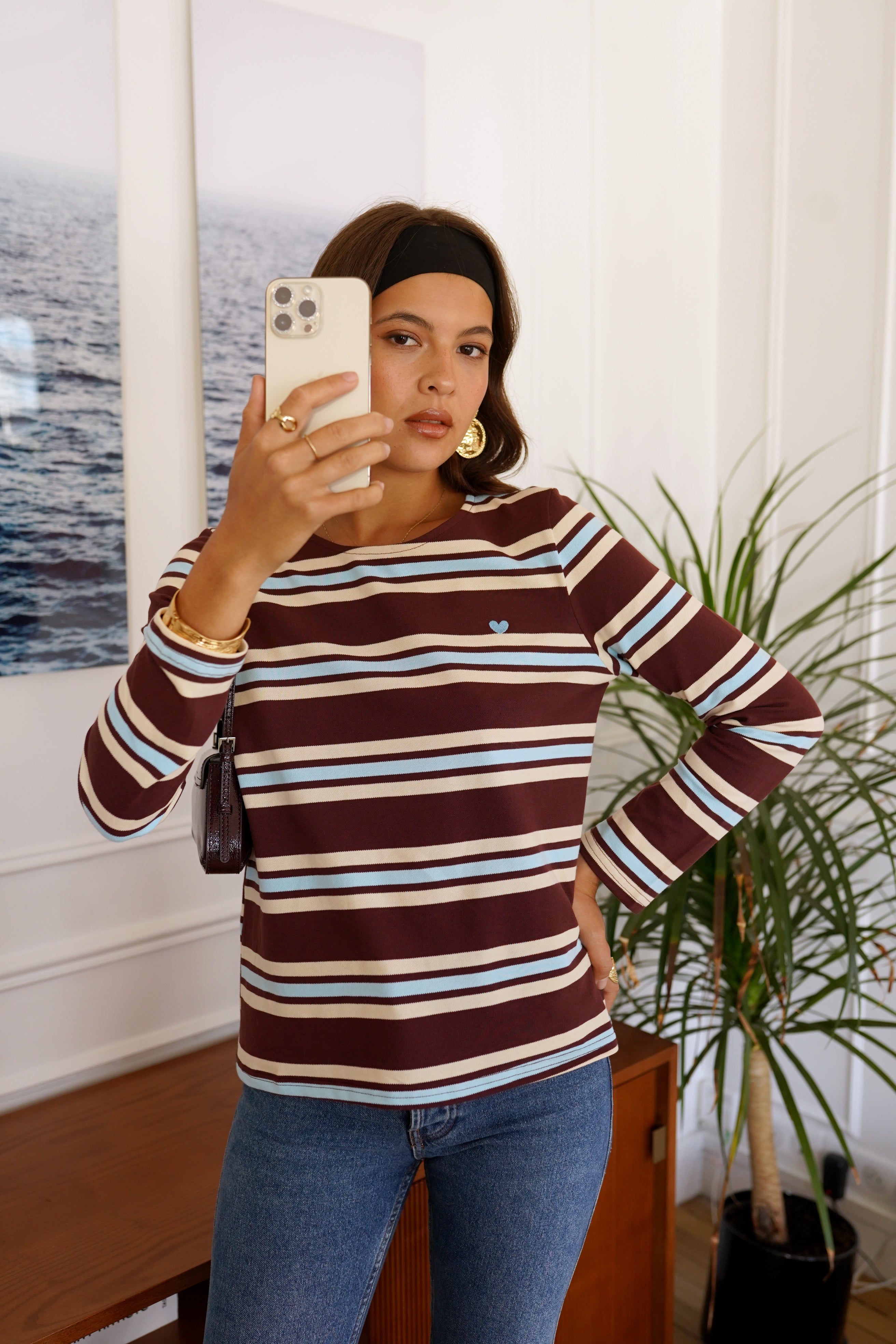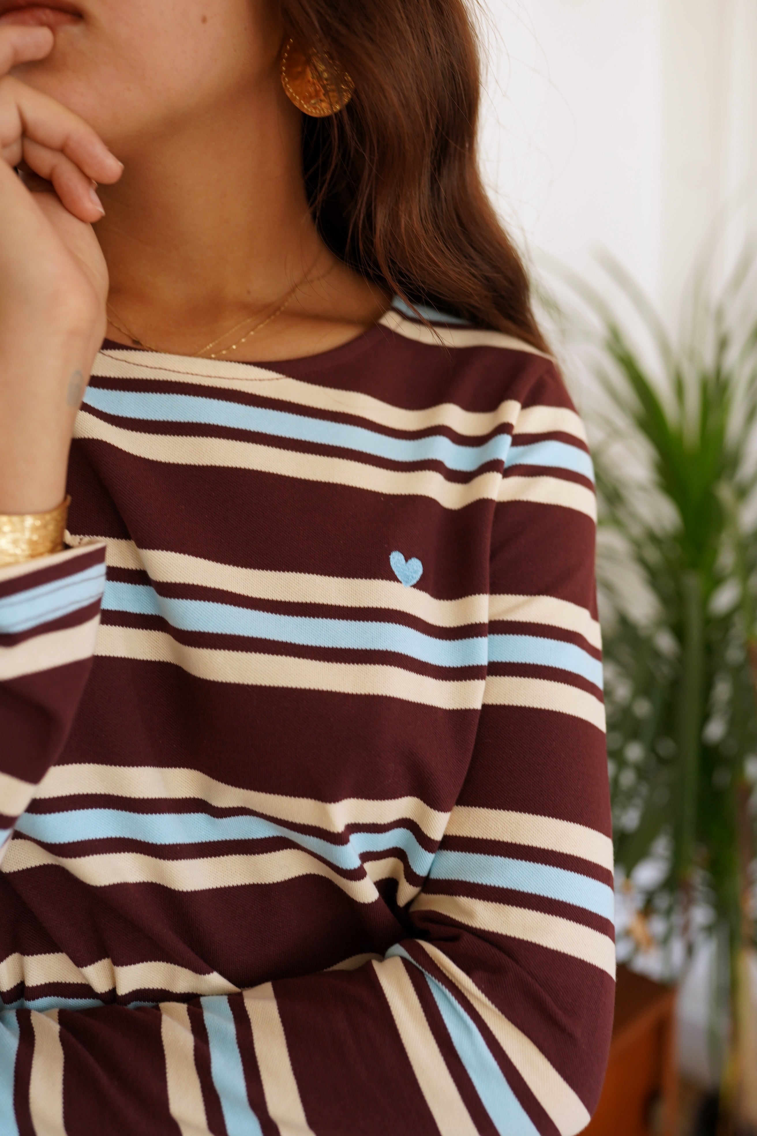 Avec ses rayures bordeaux twistées de tons crème et bleu clair, le haut Vika réinvente l’incontournable marinière avec une touche graphique et moderne. Confectionné dans une maille douce et agréable, il offre confort et style tout au long de la journée.