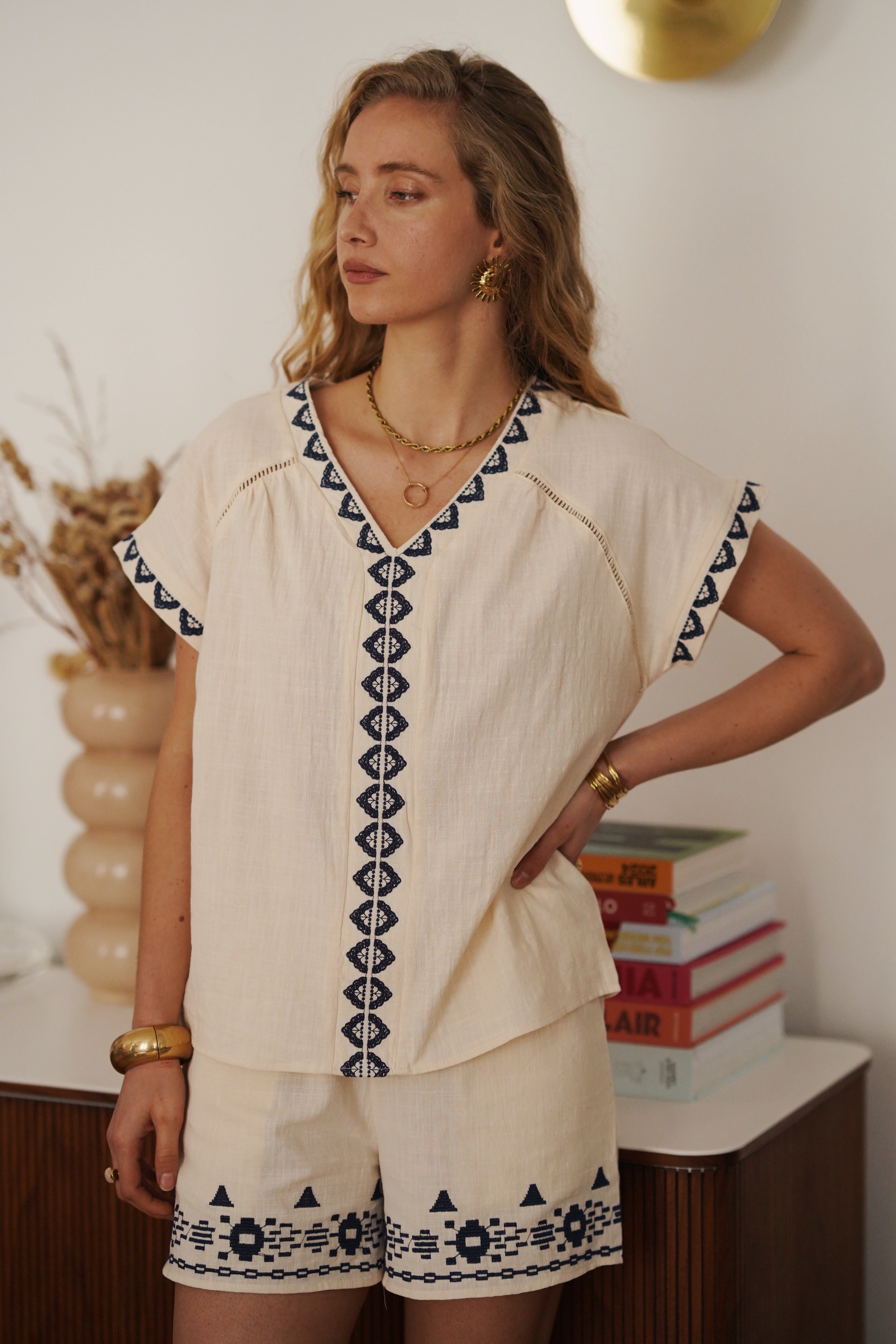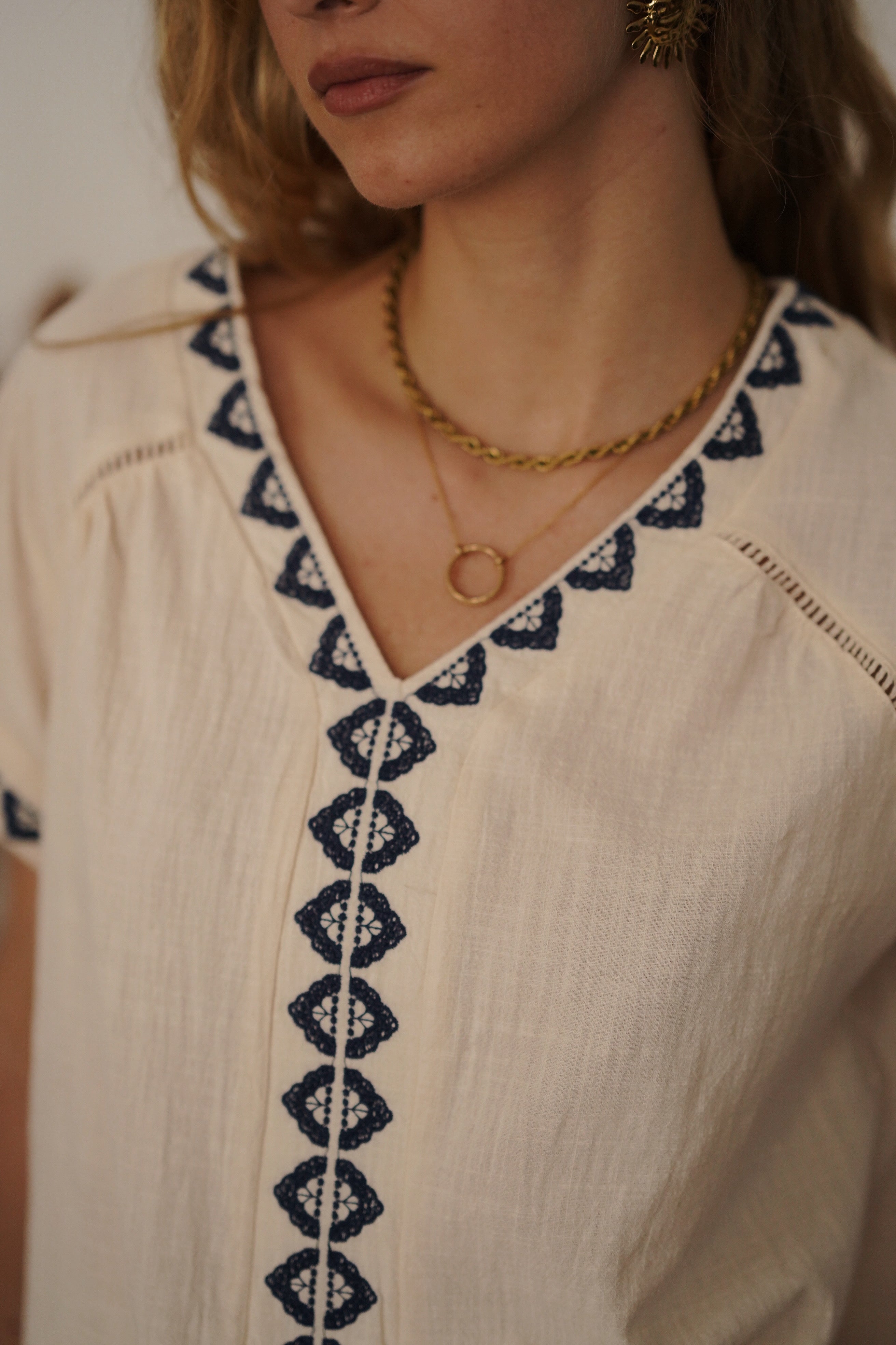 Cette blouse en coton léger, ornée de délicates broderies contrastées, est une pièce intemporelle pour un style à la fois raffiné et décontracté.