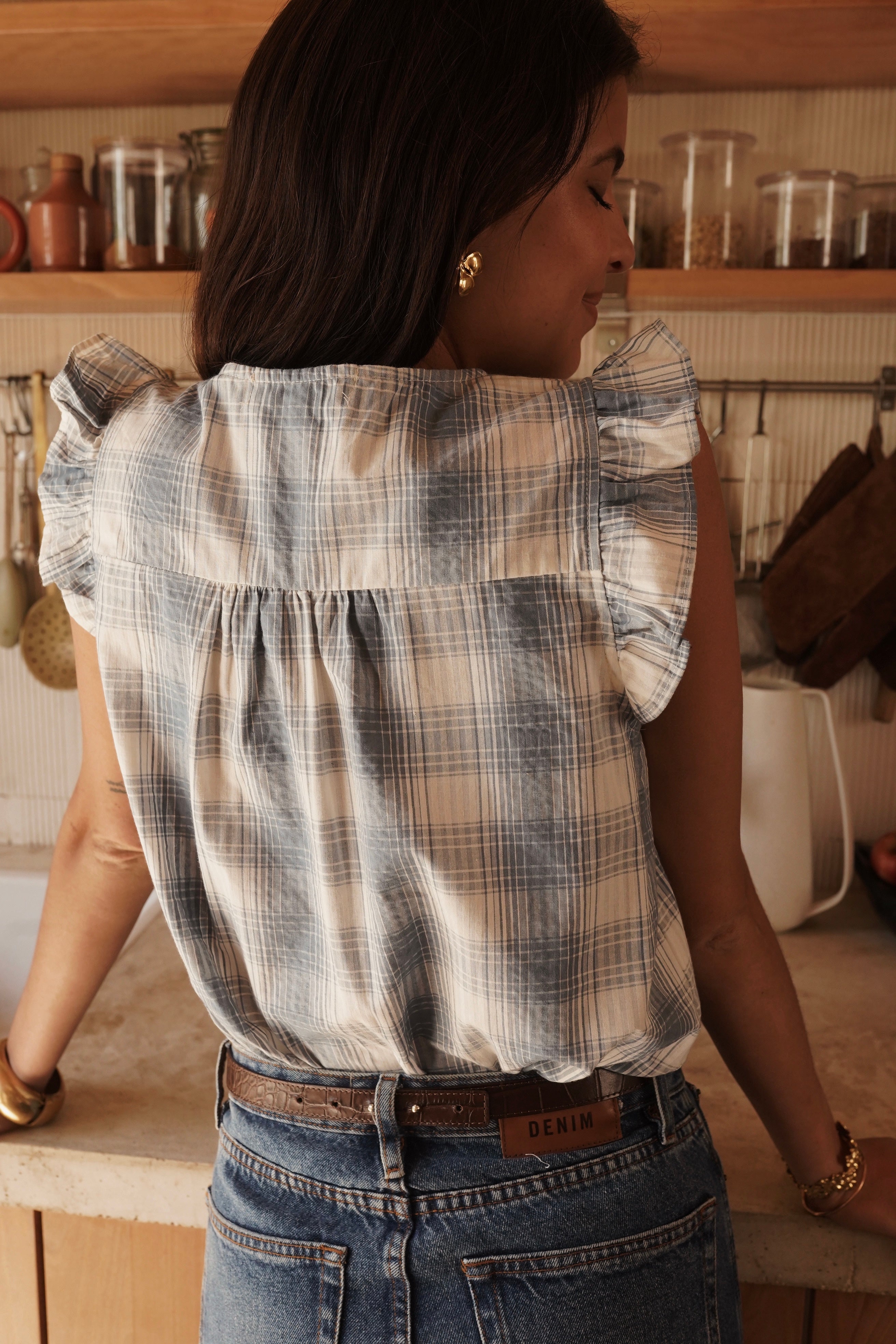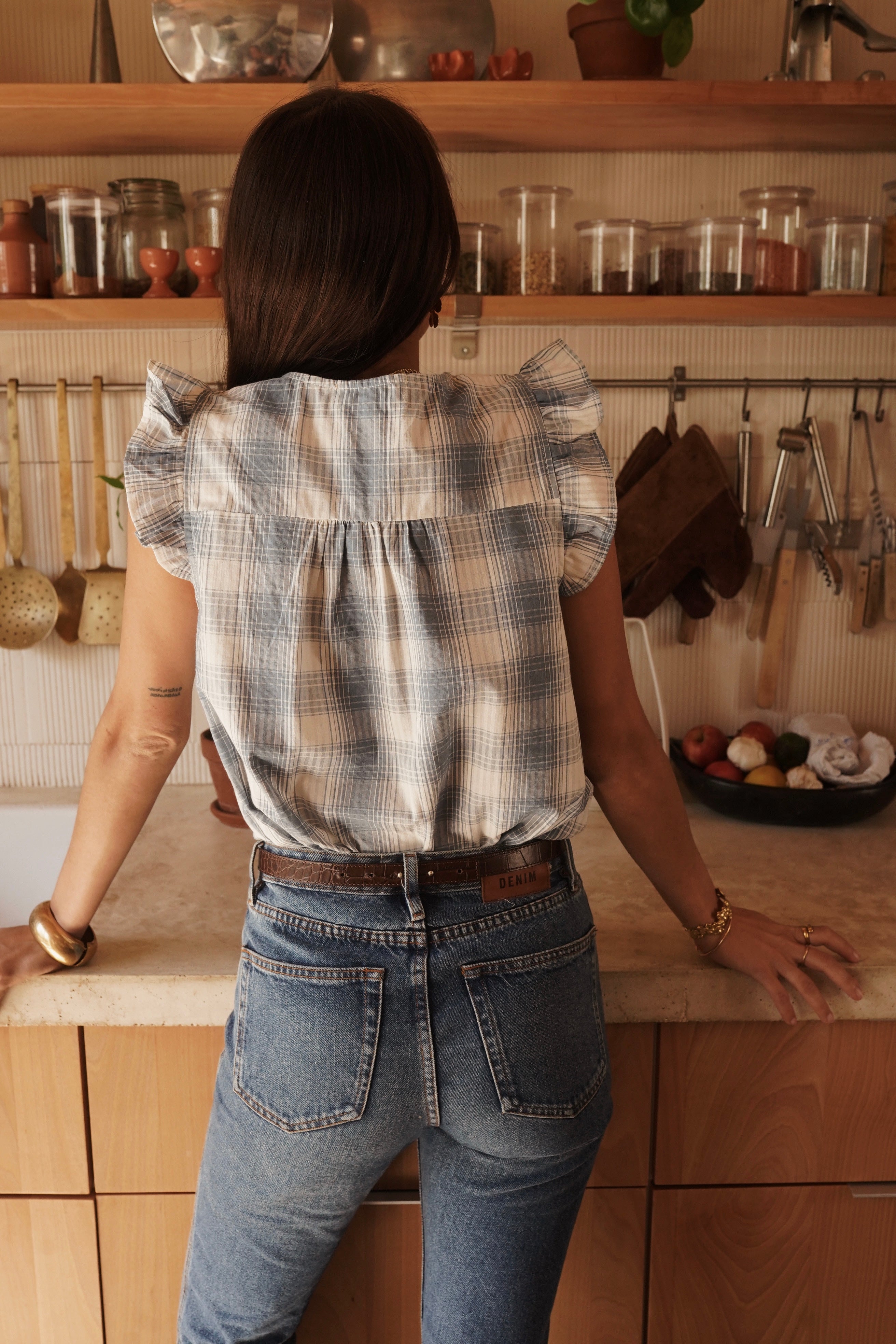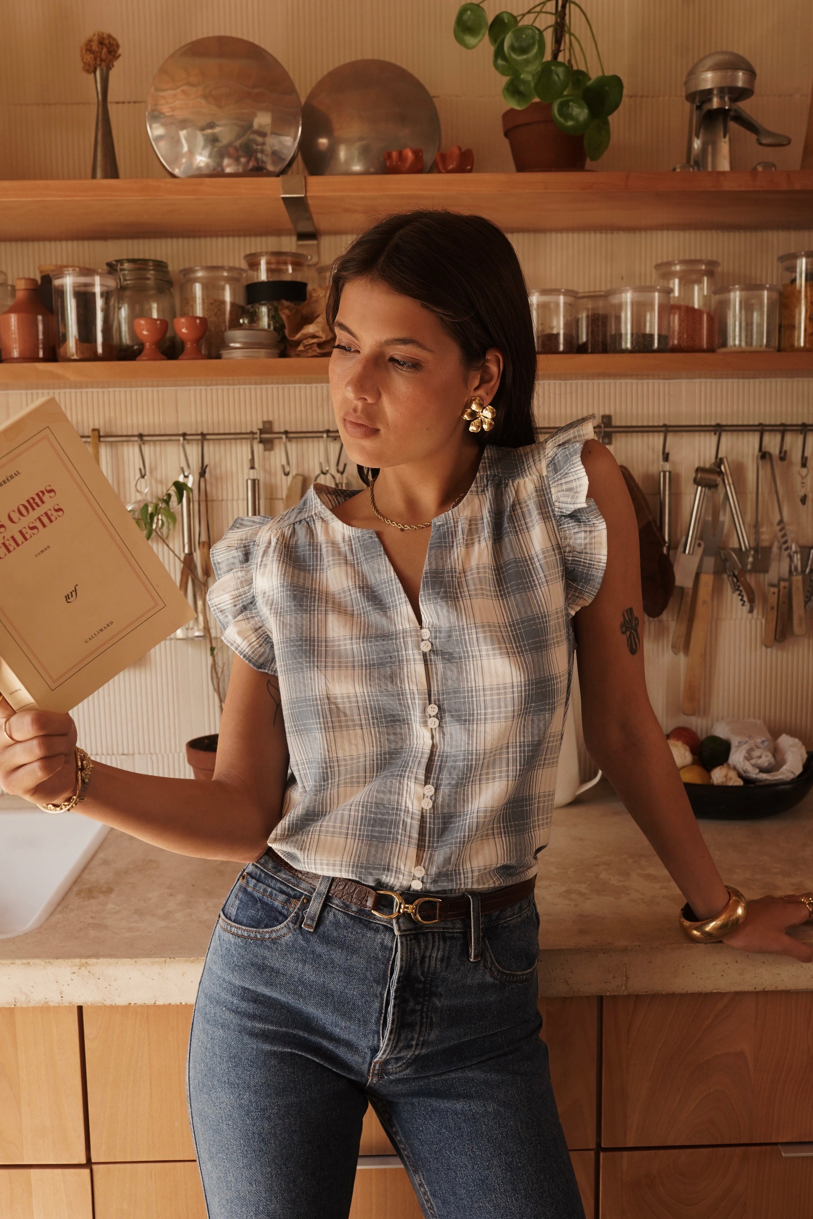 Avec son motif à carreaux délicatement patiné dans des tons de bleu doux et de beige, la blouse River évoque l’insouciance des jours d’été passés à la campagne. Sa coupe légère et fluide, ses petits boutons nacrés et ses manches courtes à volants lui confèrent un charme rétro tout en restant résolument moderne.