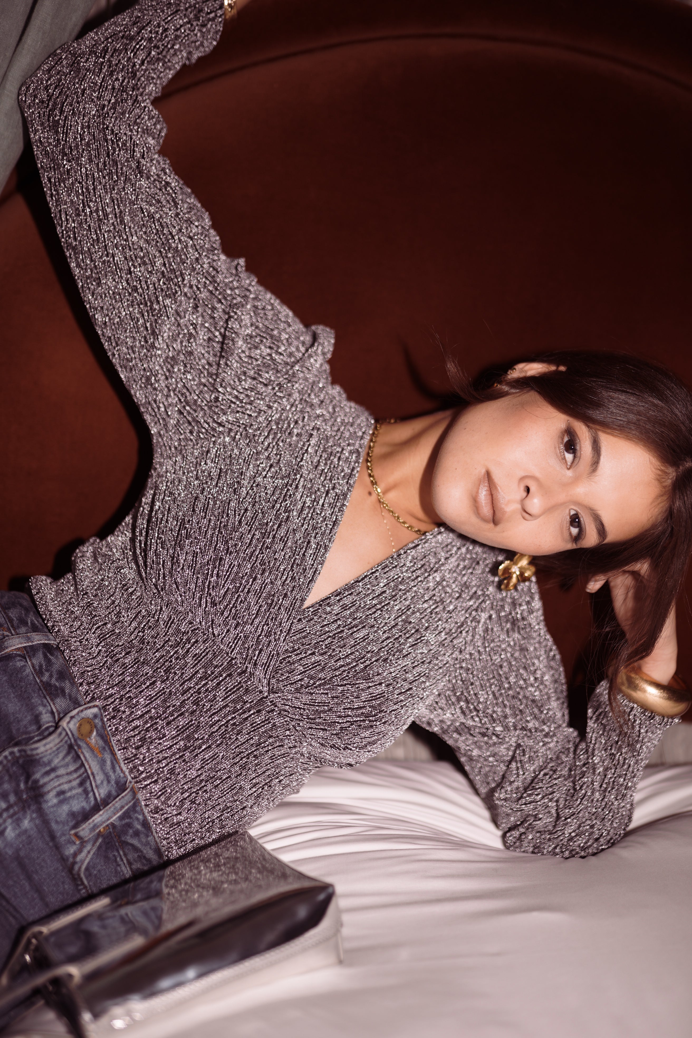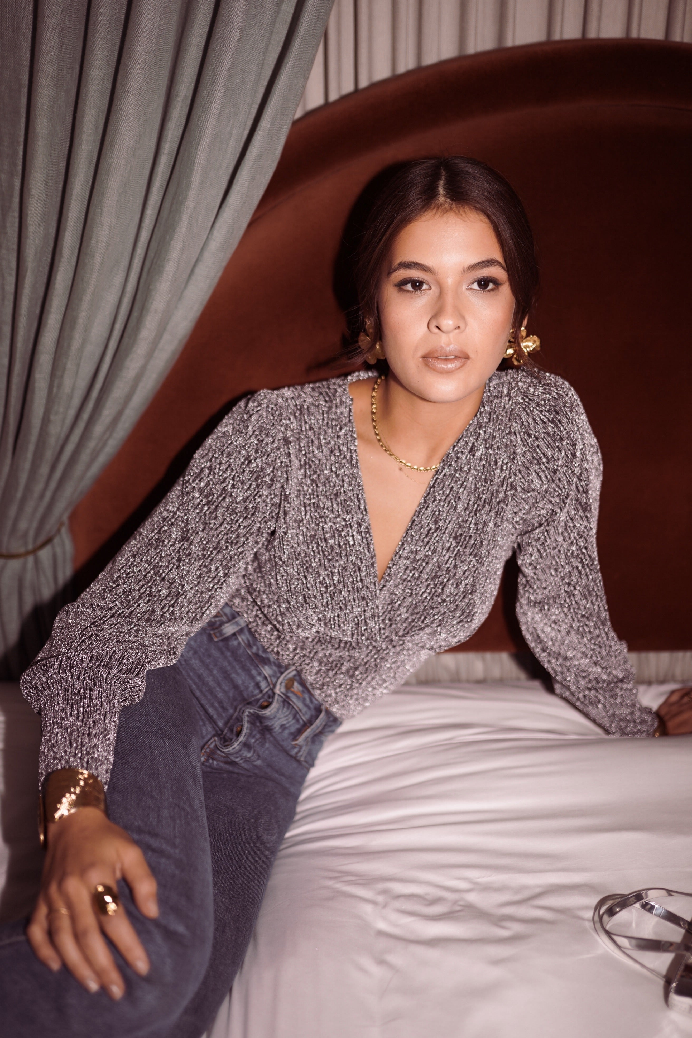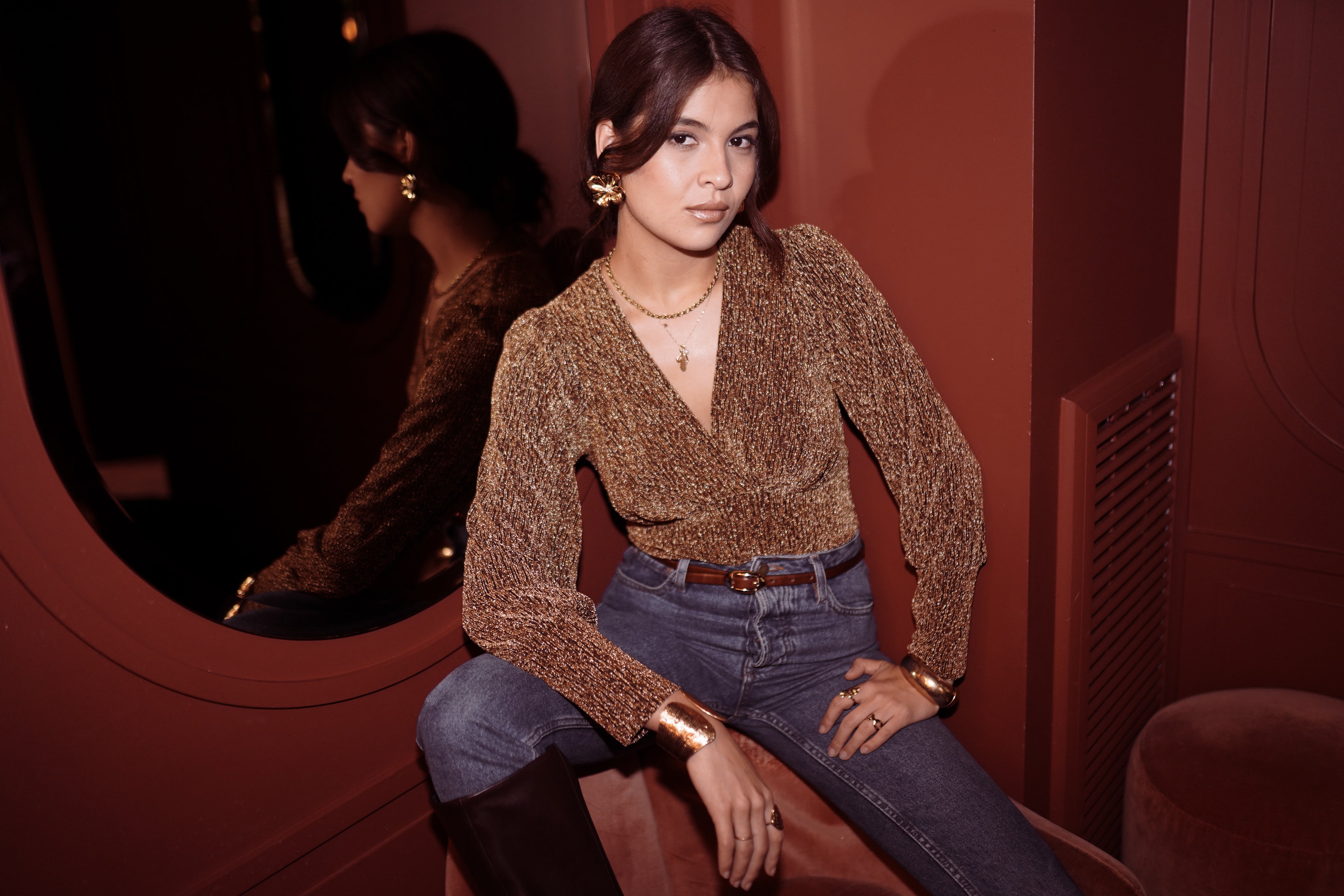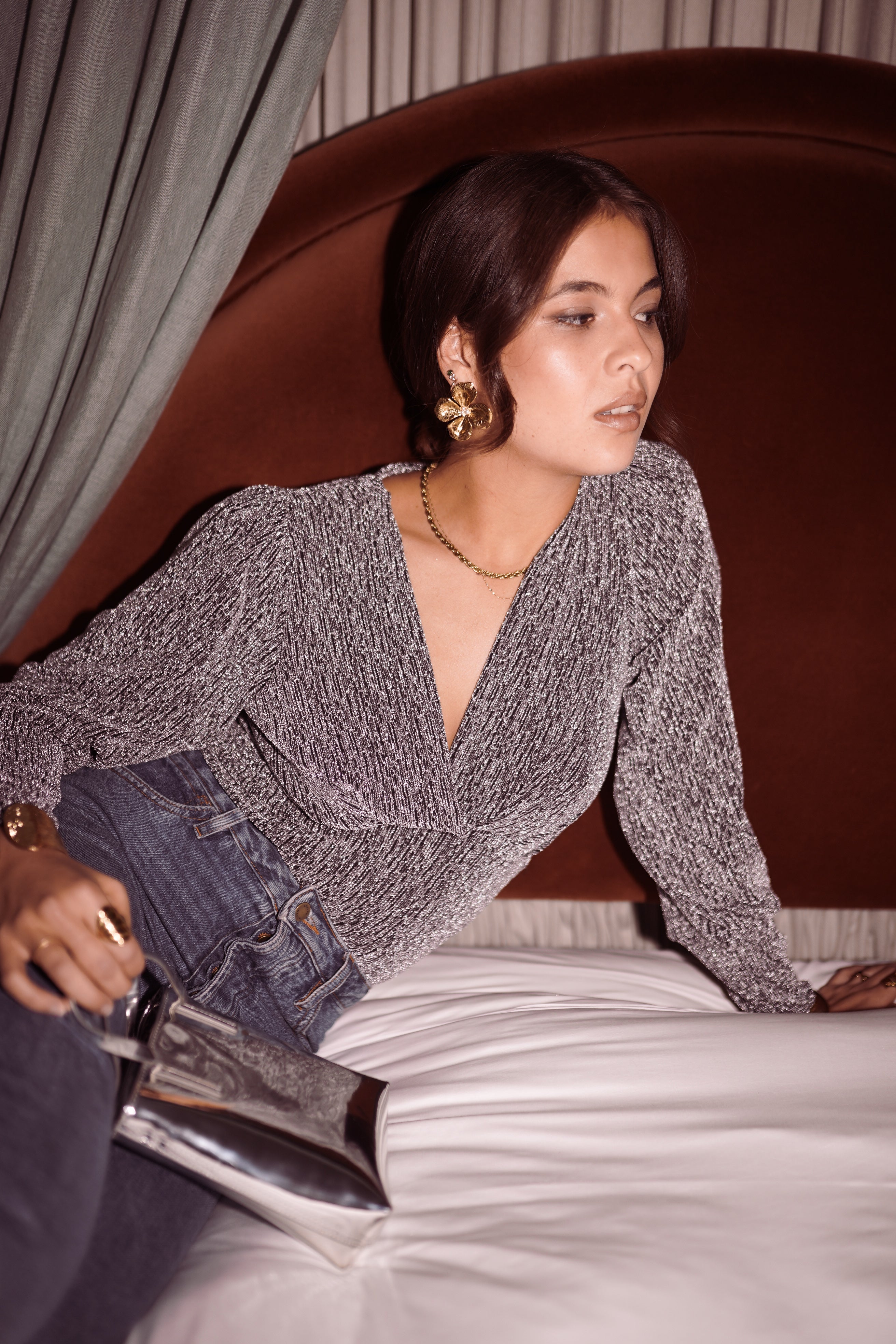 Pensé pour briller sans en faire trop, Misha réunit tout ce qu’on aime pendant la saison des fêtes : une matière lumineuse, une silhouette qui allonge et un décolleté qui sublime instantanément.