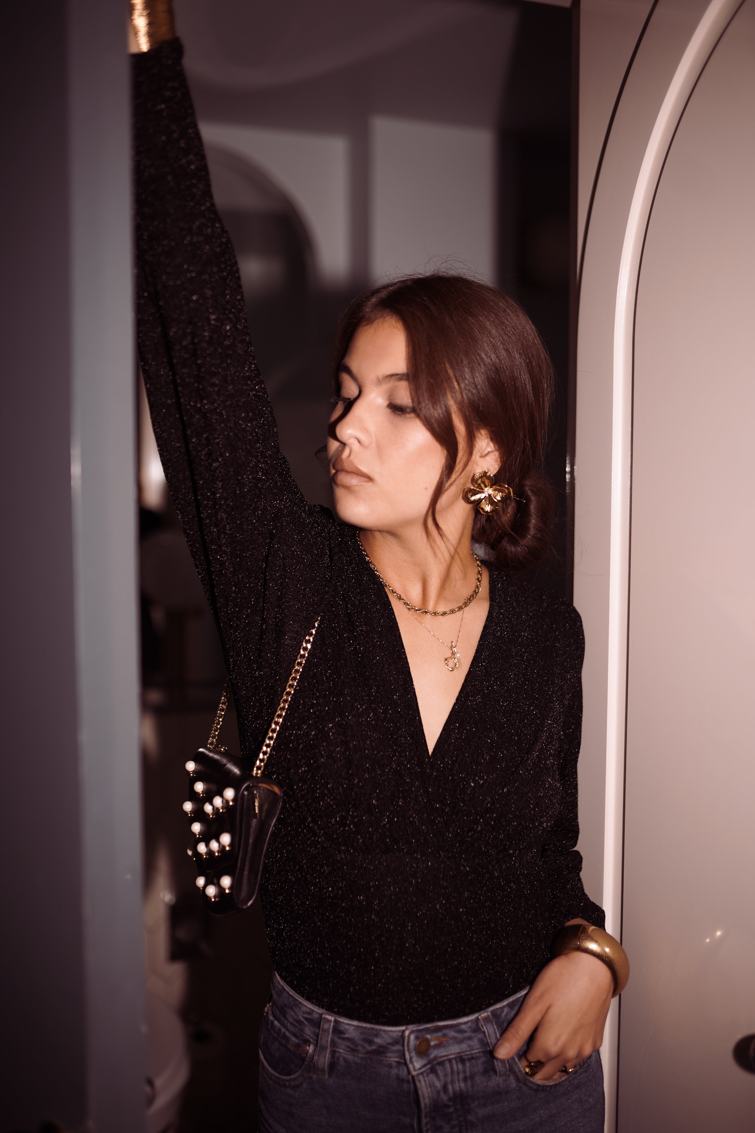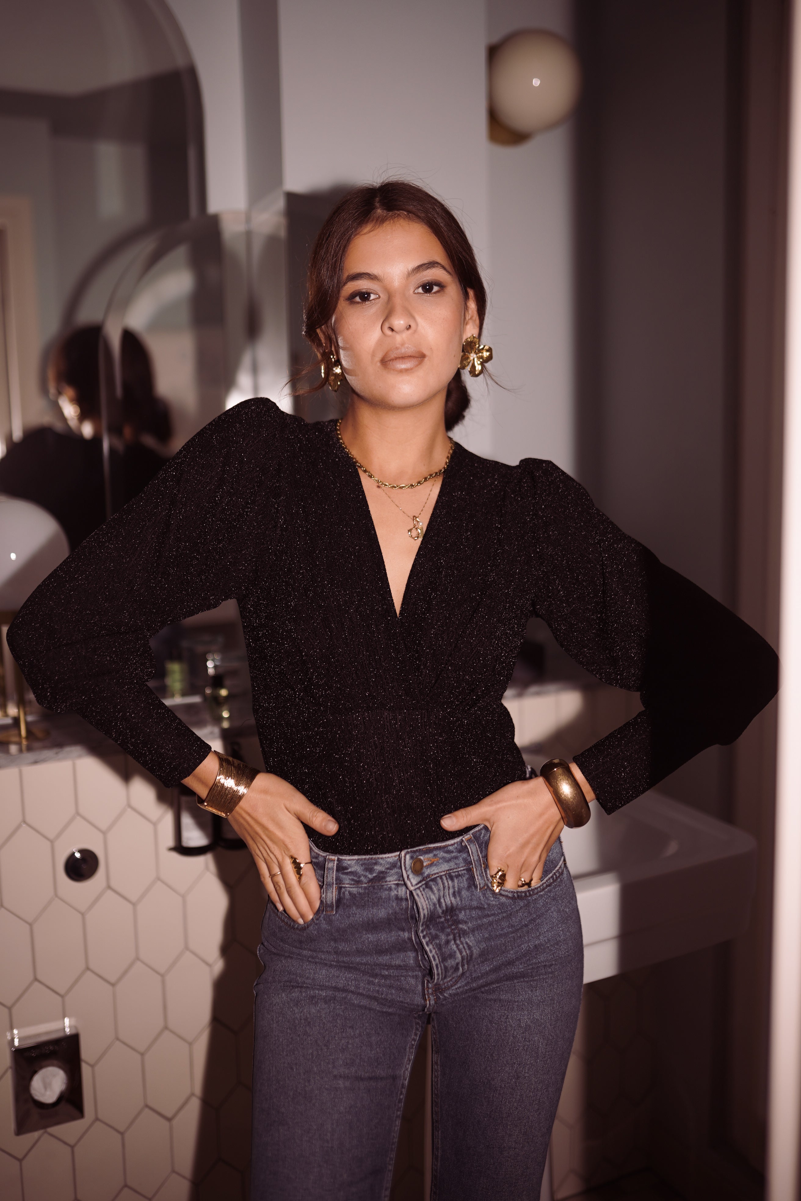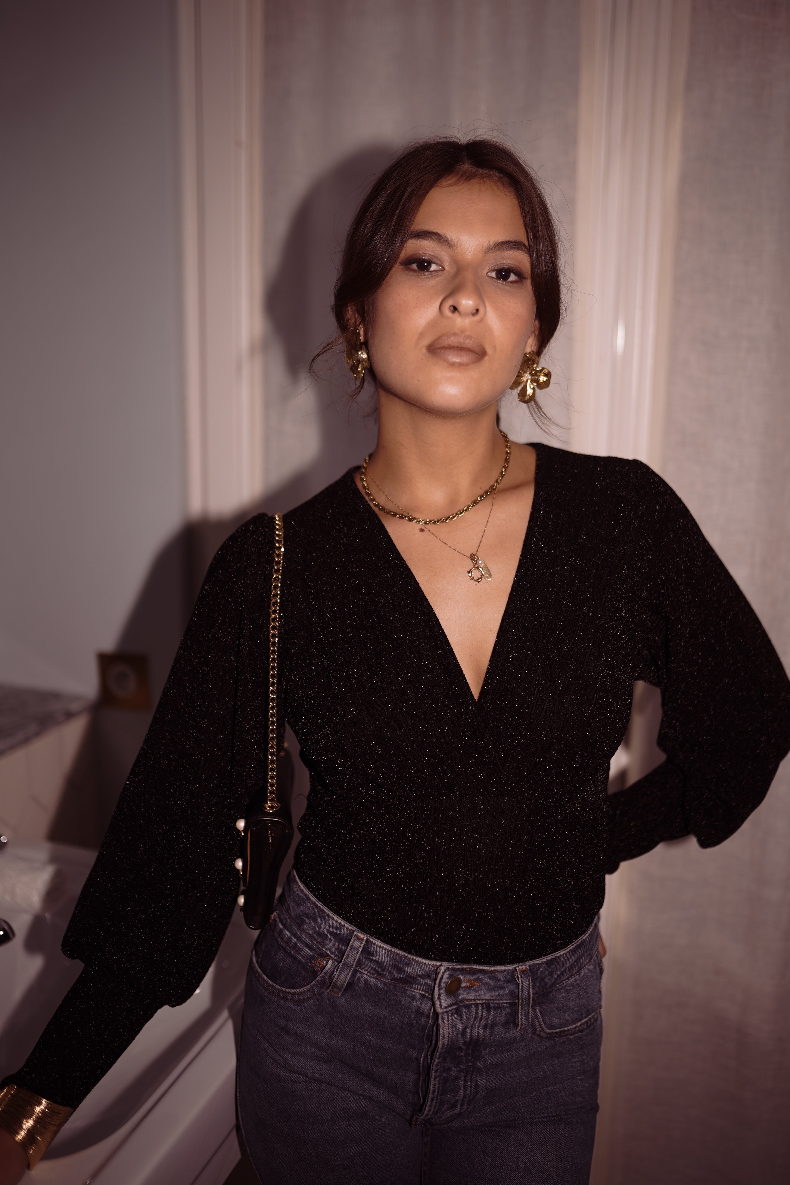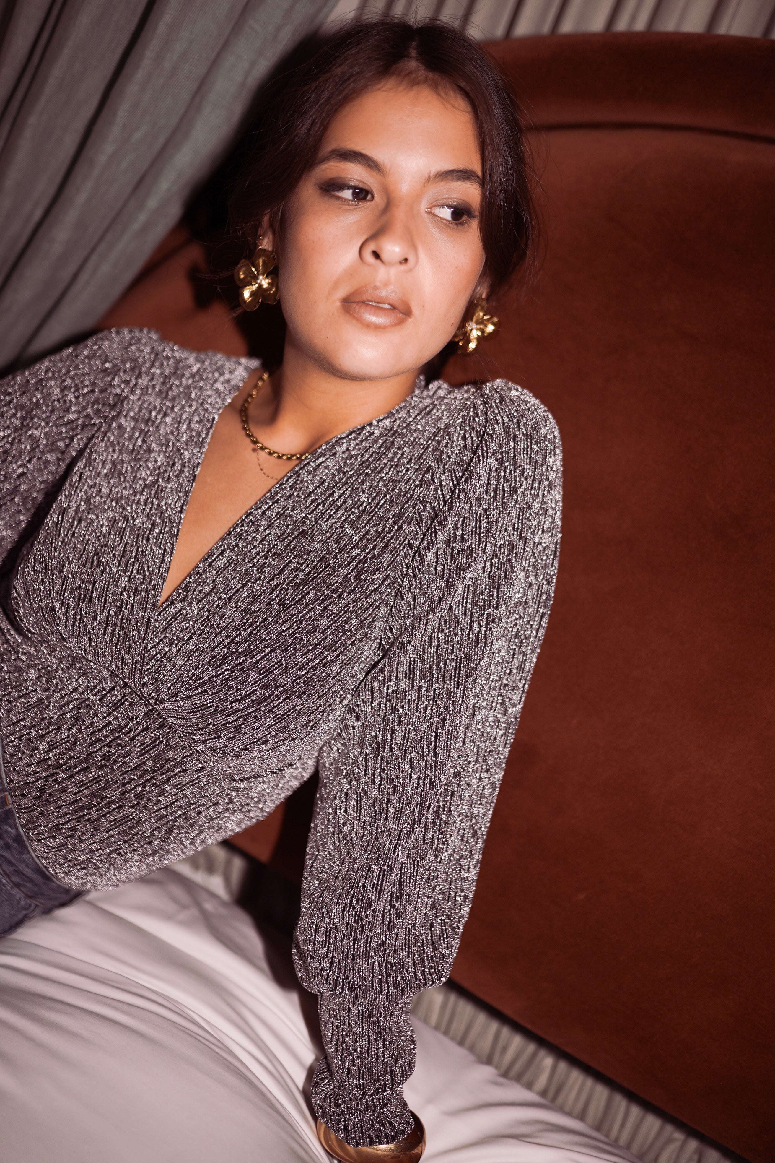 Son effet scintillant souligne chaque mouvement, ses manches ballon apportent une touche couture, et sa coupe ajustée glisse parfaitement dans un jean ou une jupe pour un look de soirée impeccable.