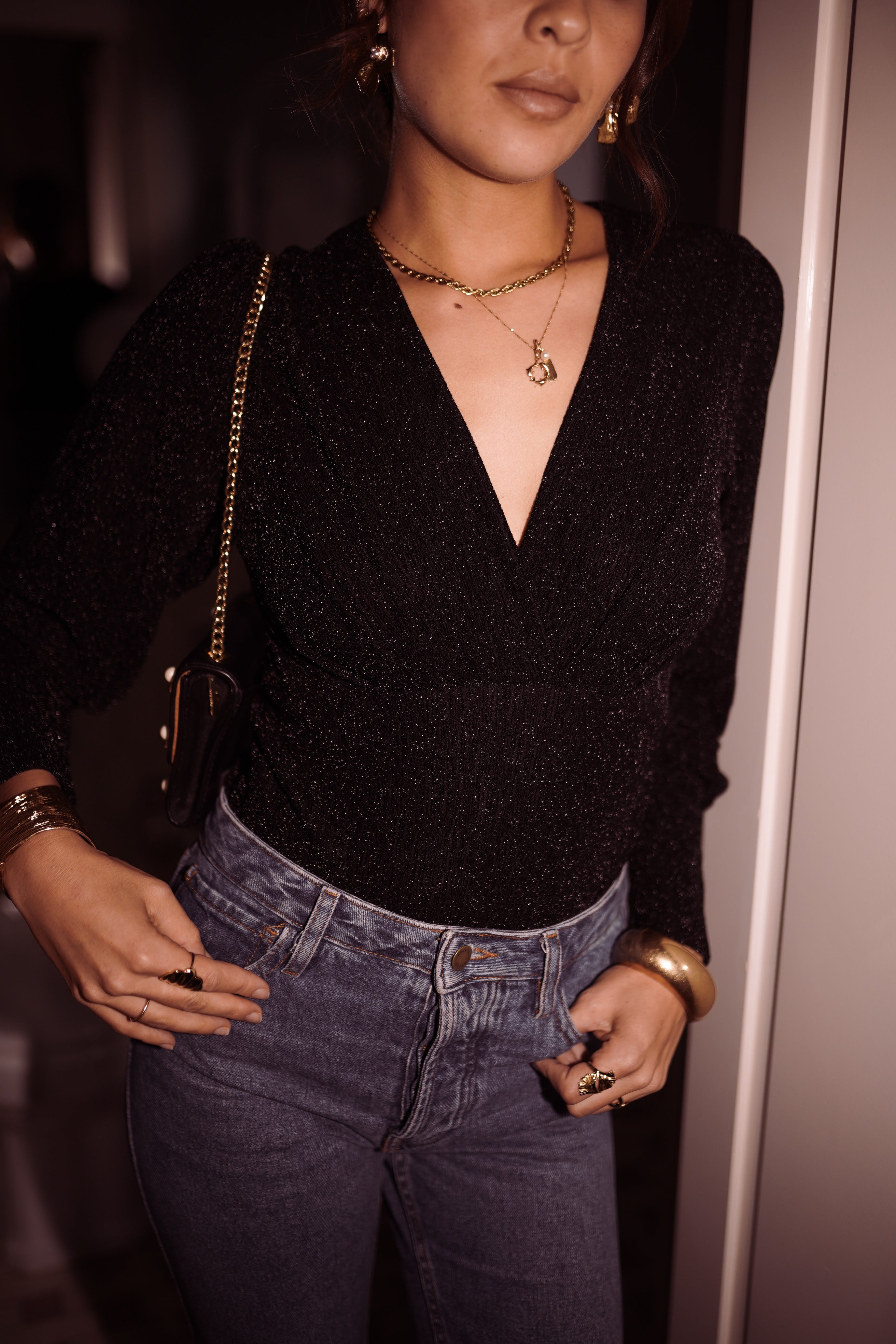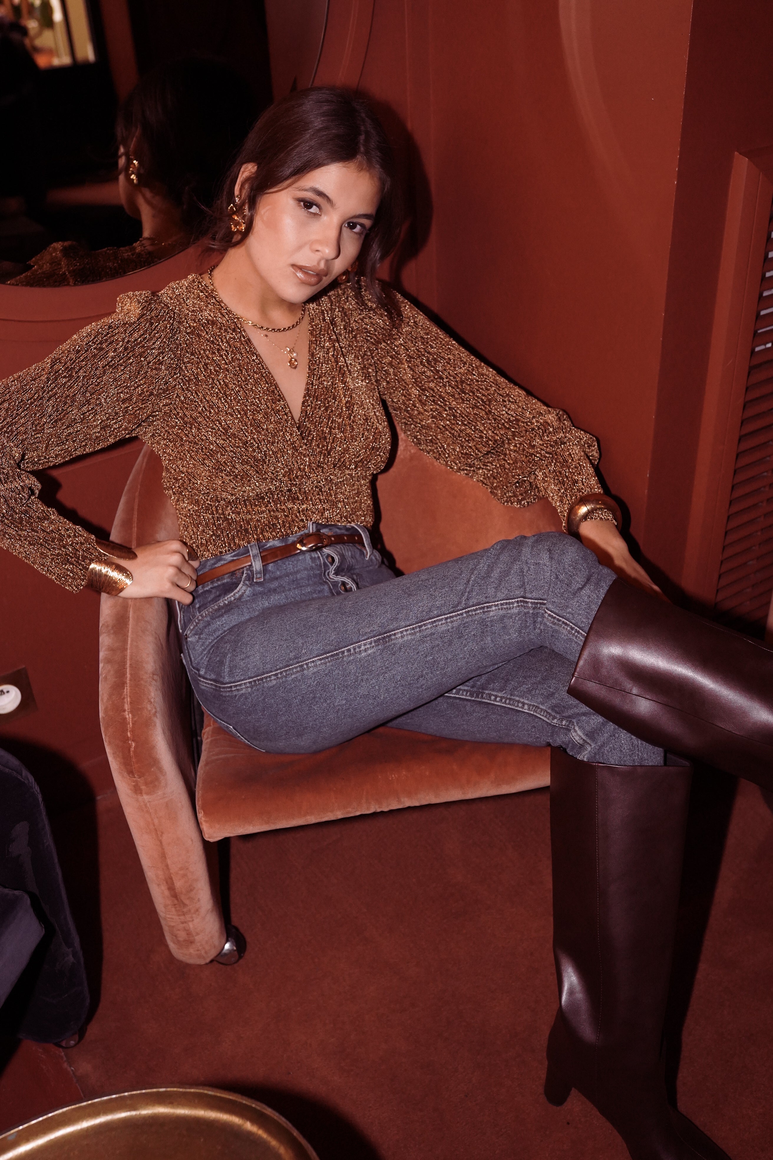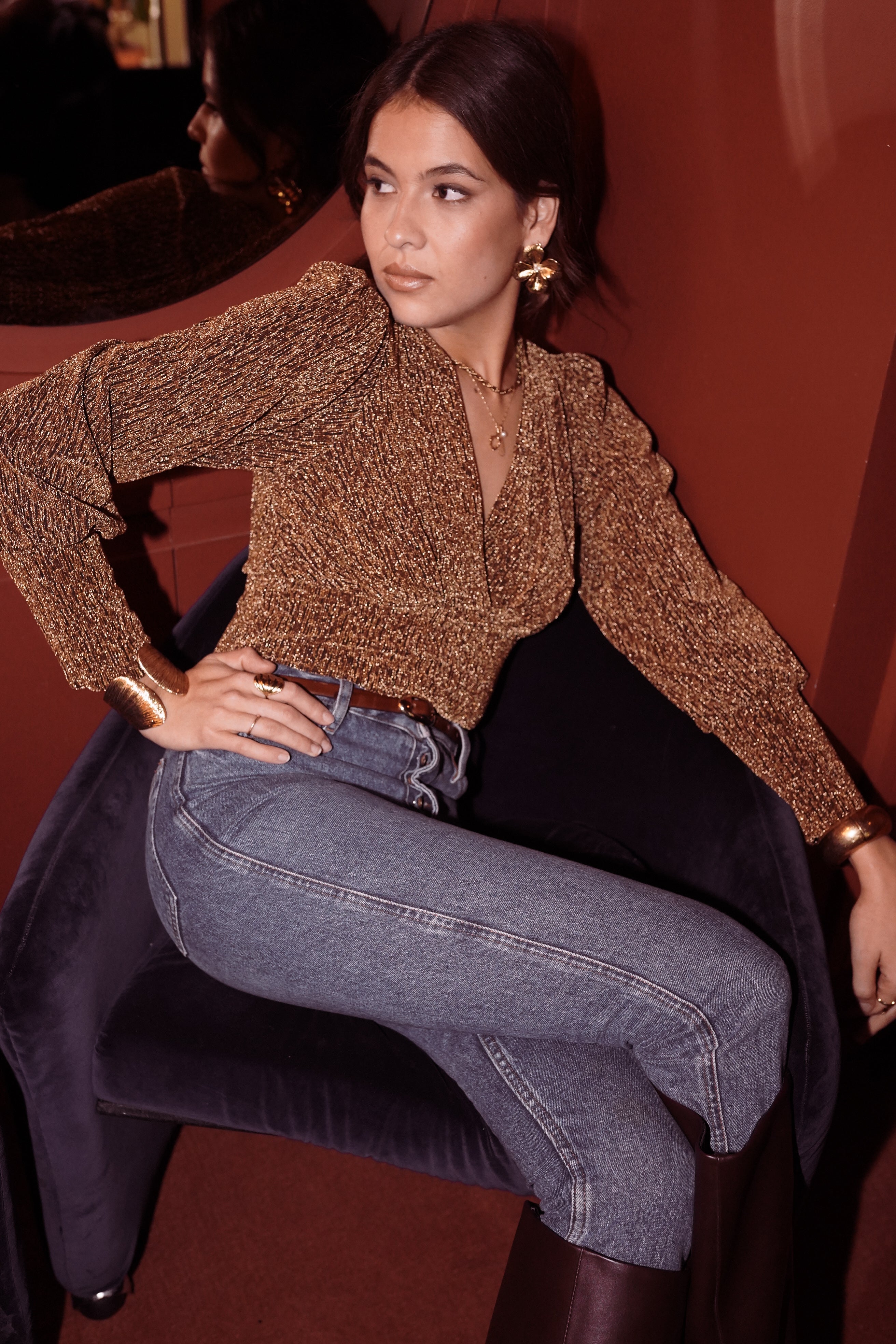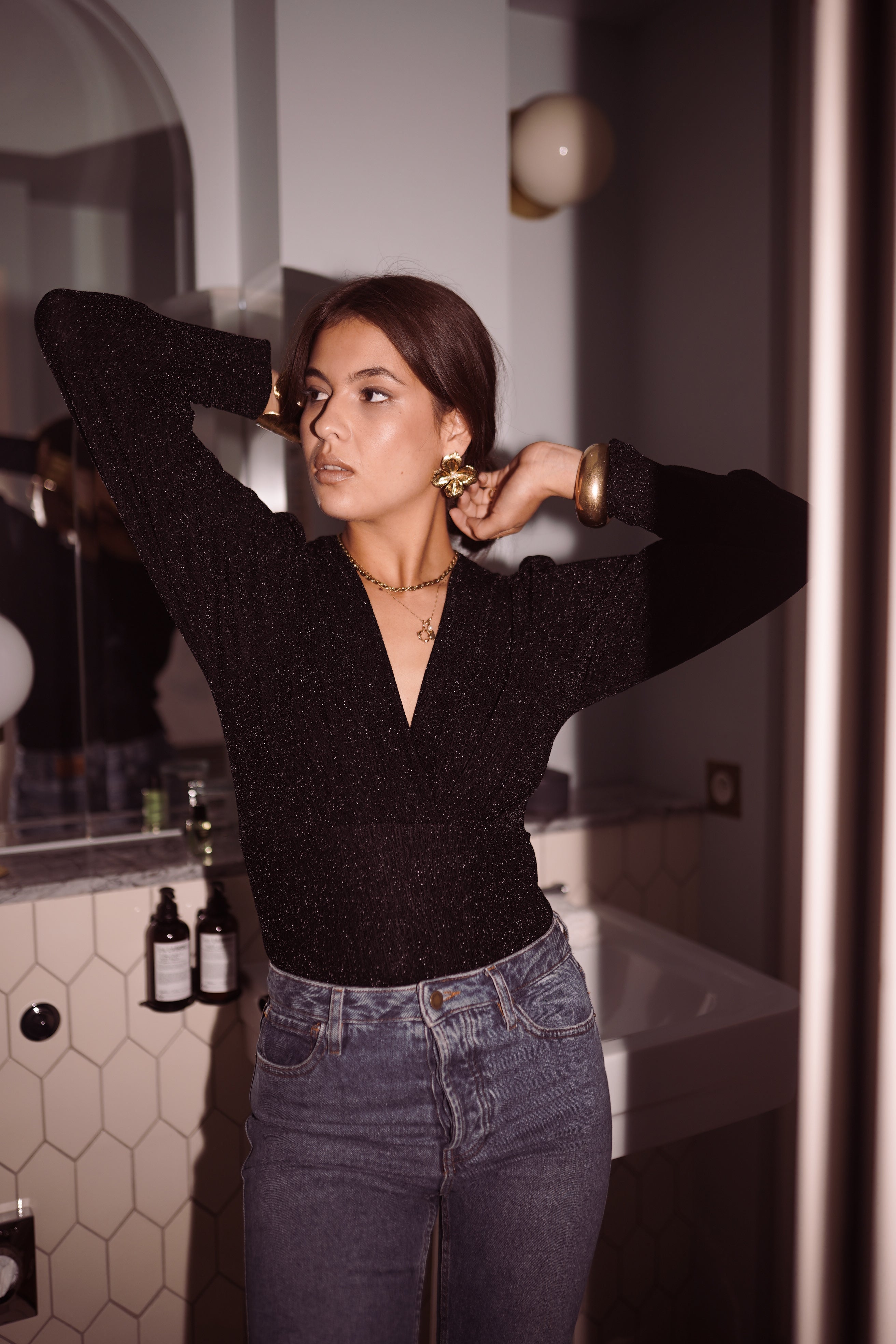 Son effet scintillant souligne chaque mouvement, ses manches ballon apportent une touche couture, et sa coupe ajustée glisse parfaitement dans un jean ou une jupe pour un look de soirée impeccable.