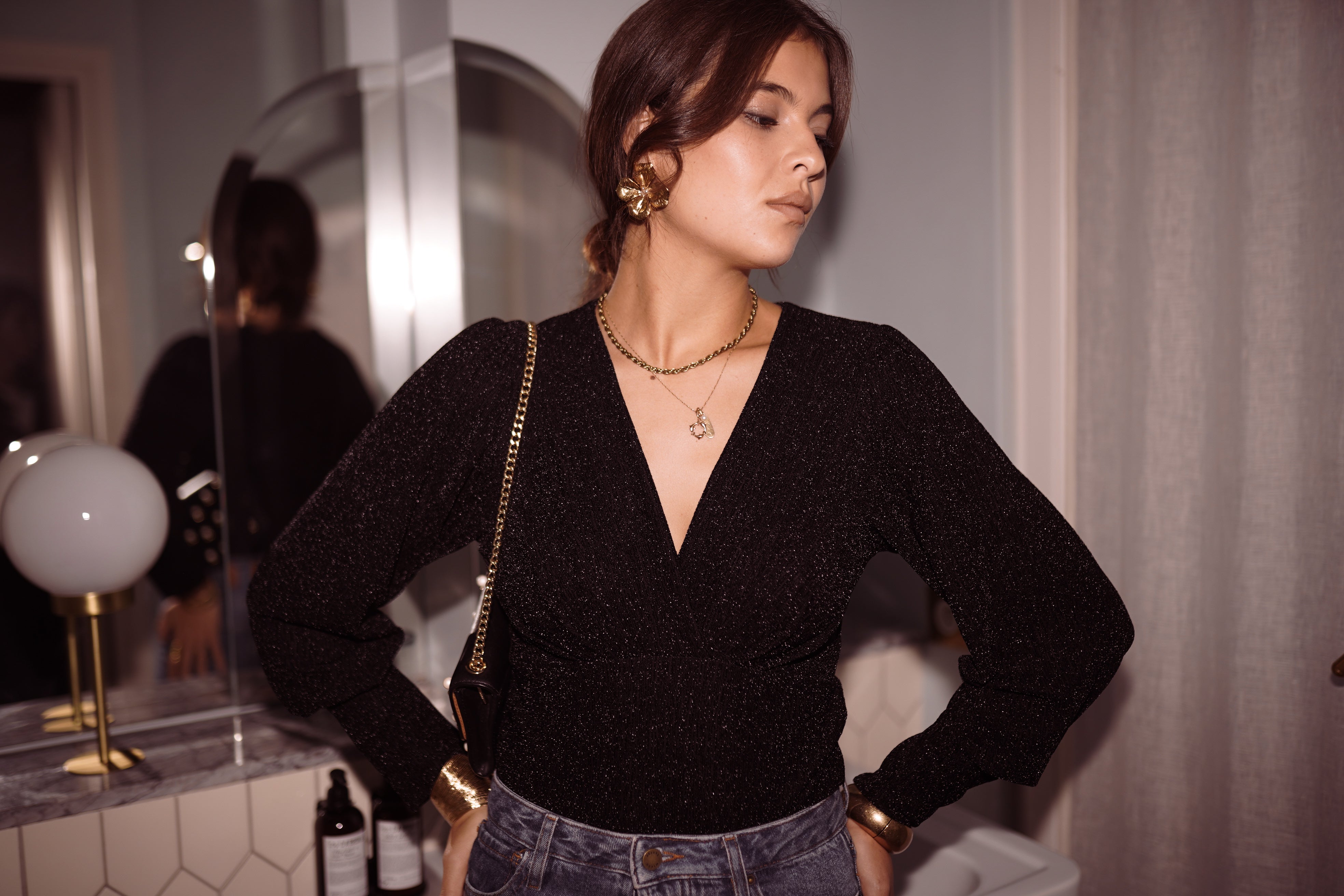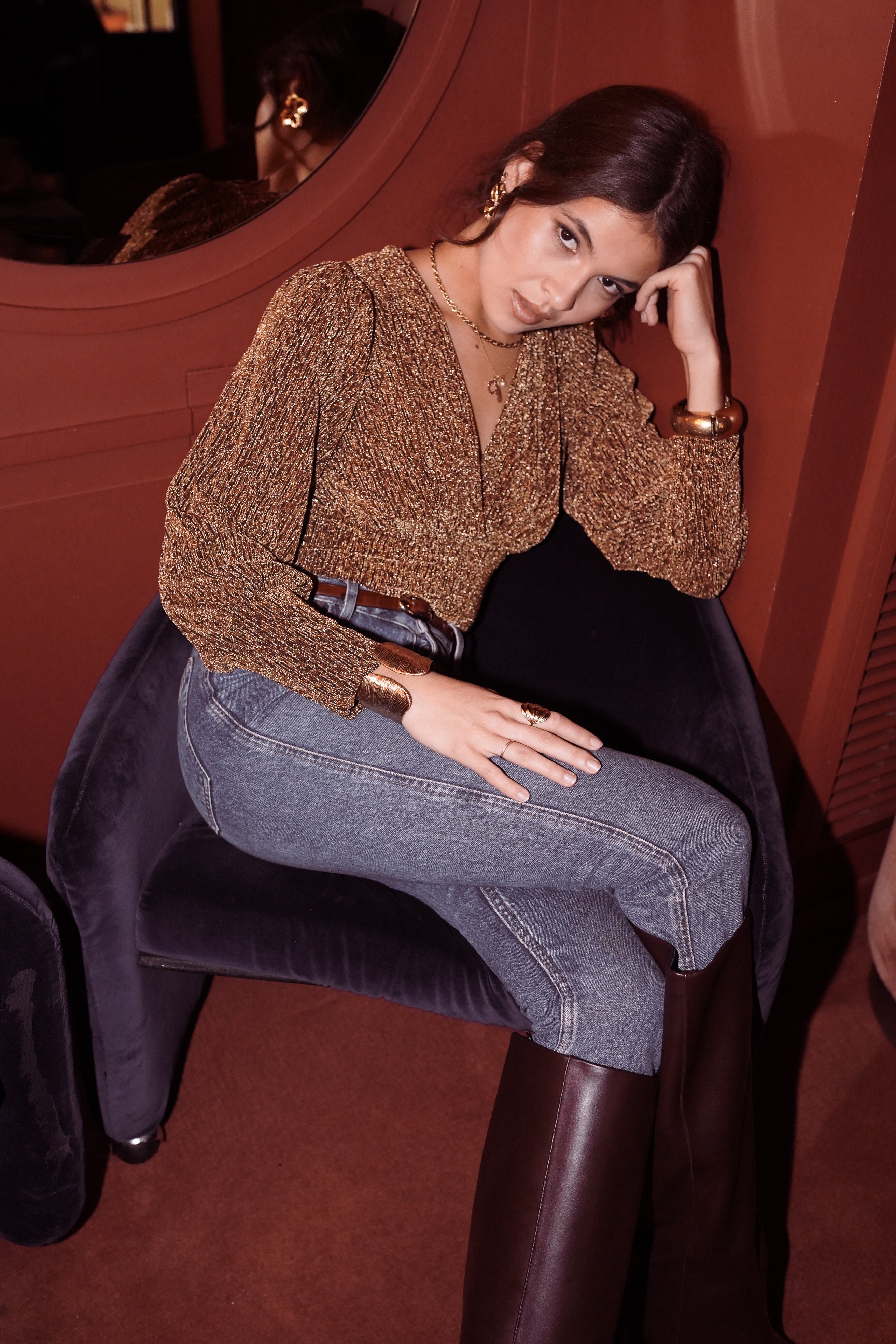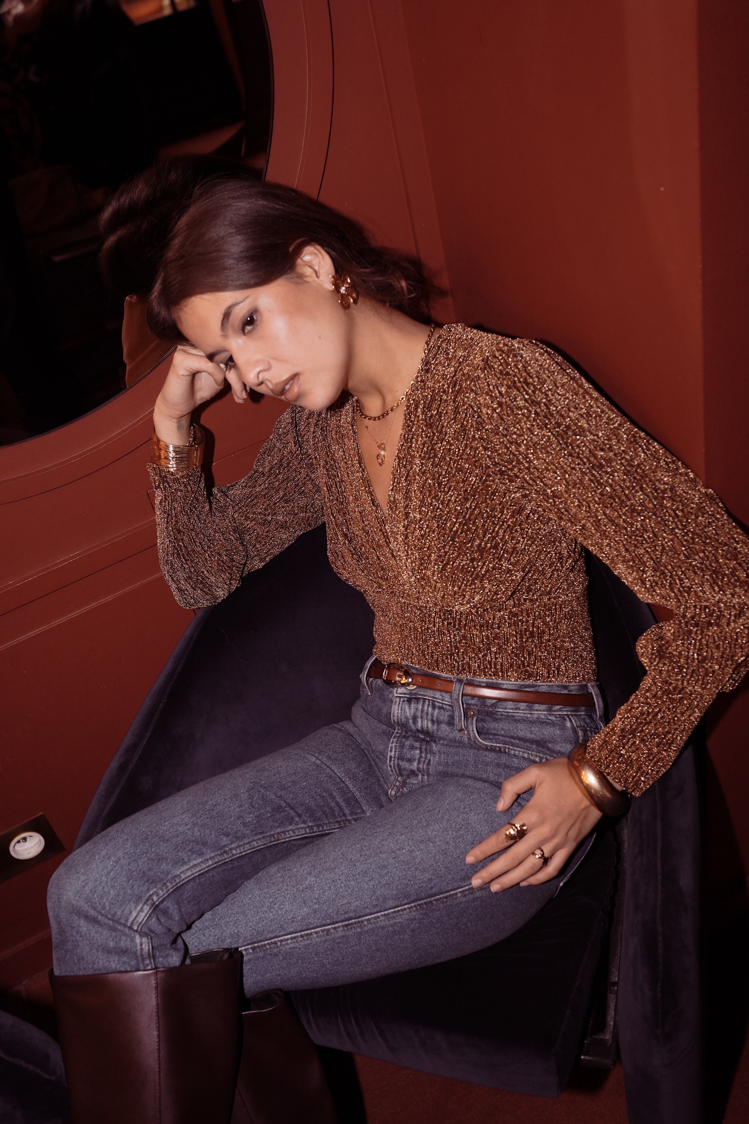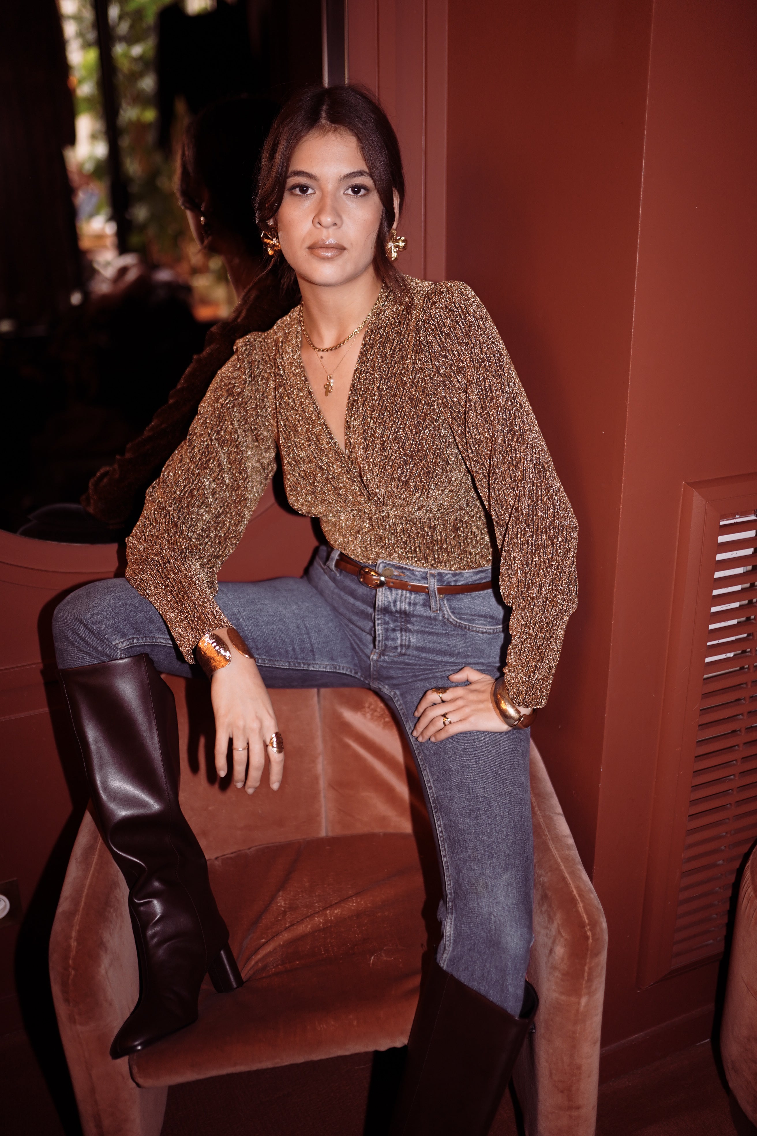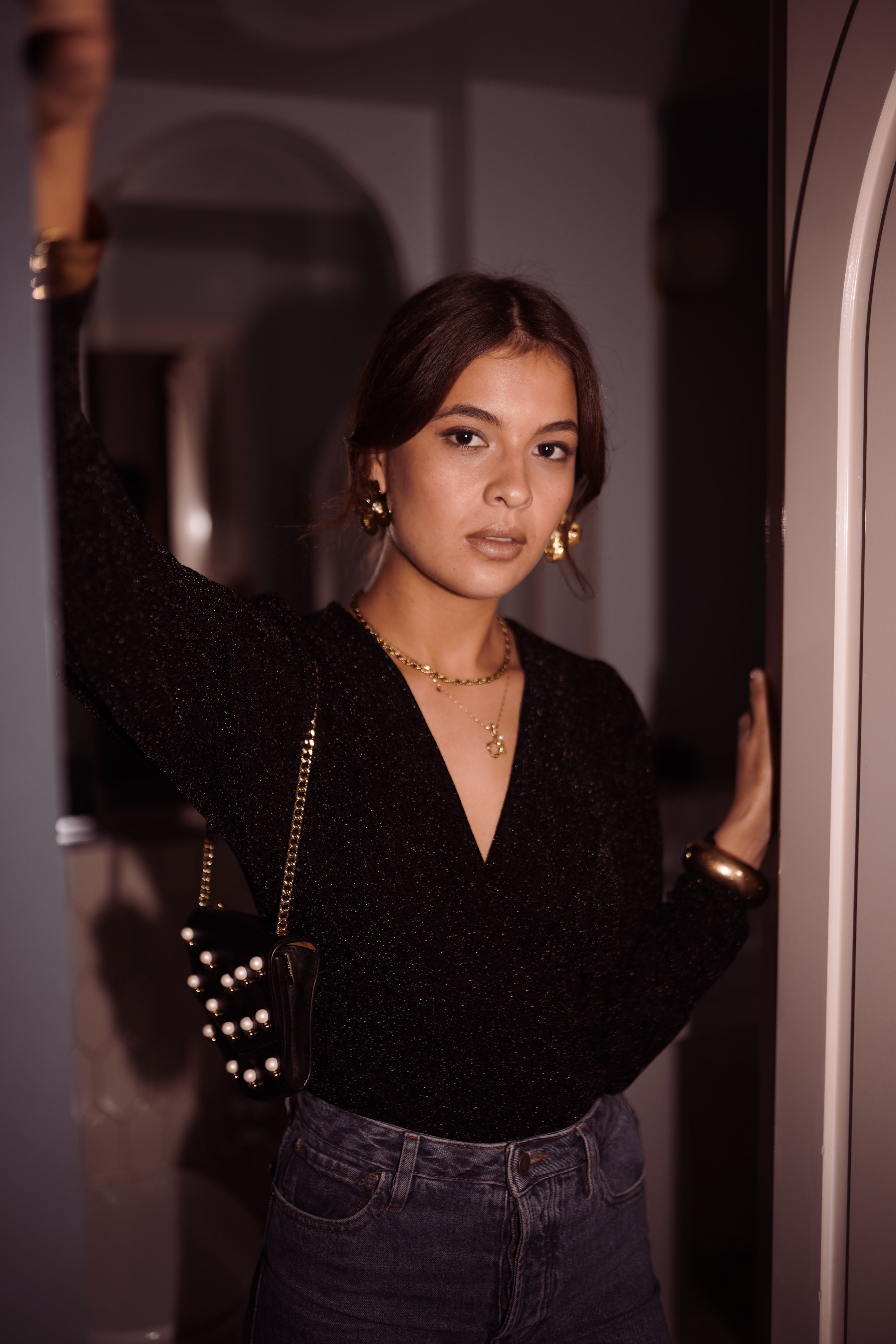 Son effet scintillant souligne chaque mouvement, ses manches ballon apportent une touche couture, et sa coupe ajustée glisse parfaitement dans un jean ou une jupe pour un look de soirée impeccable.