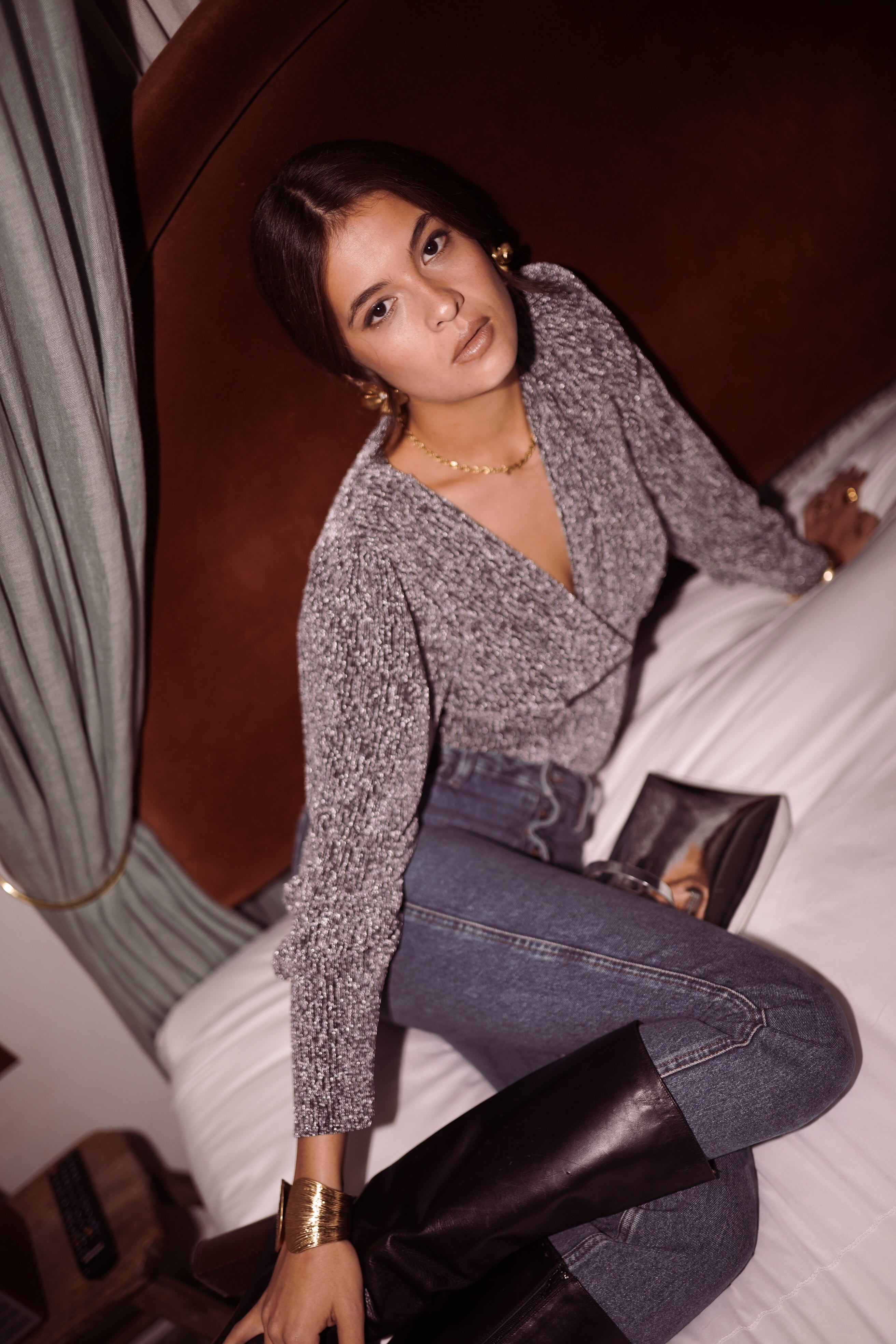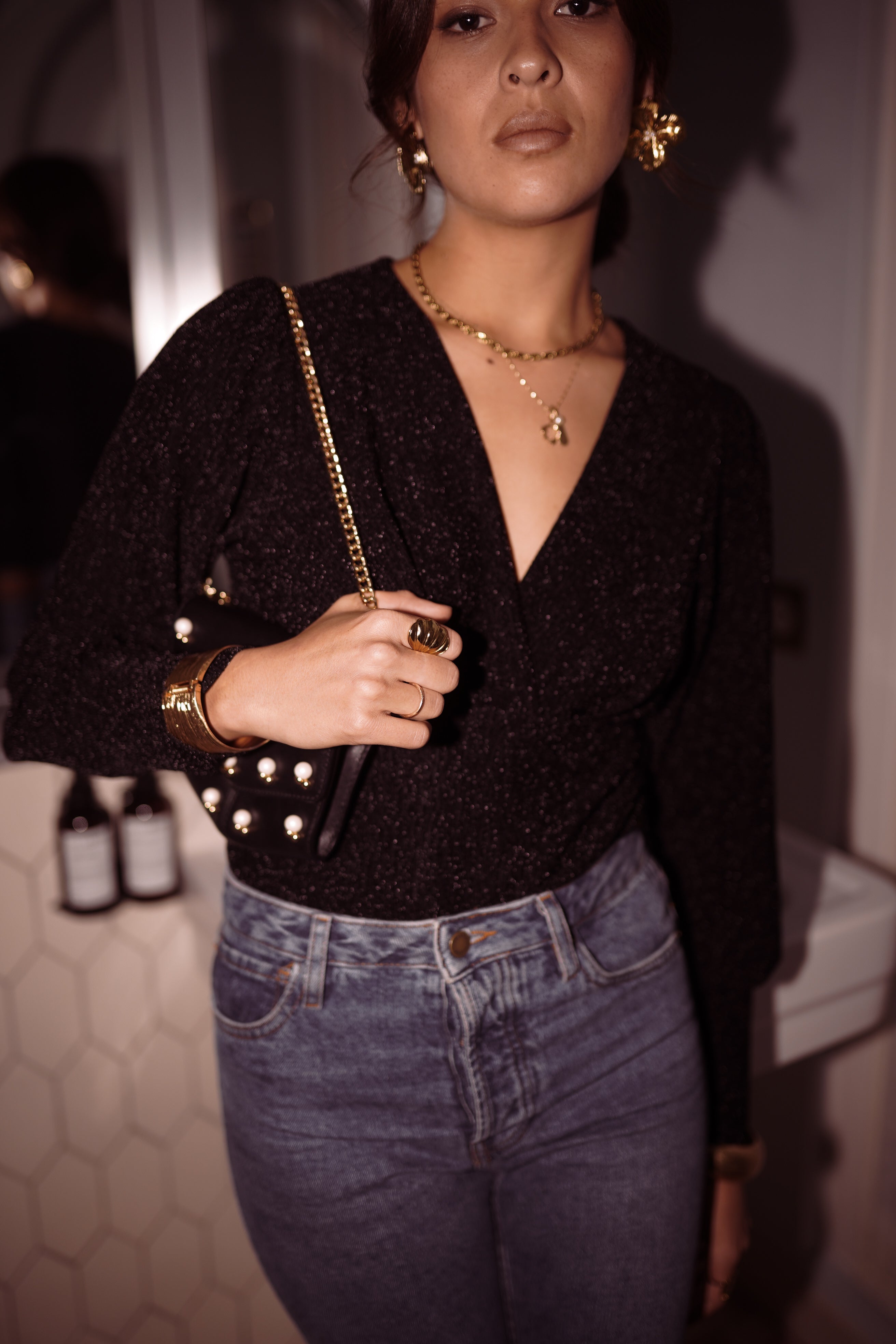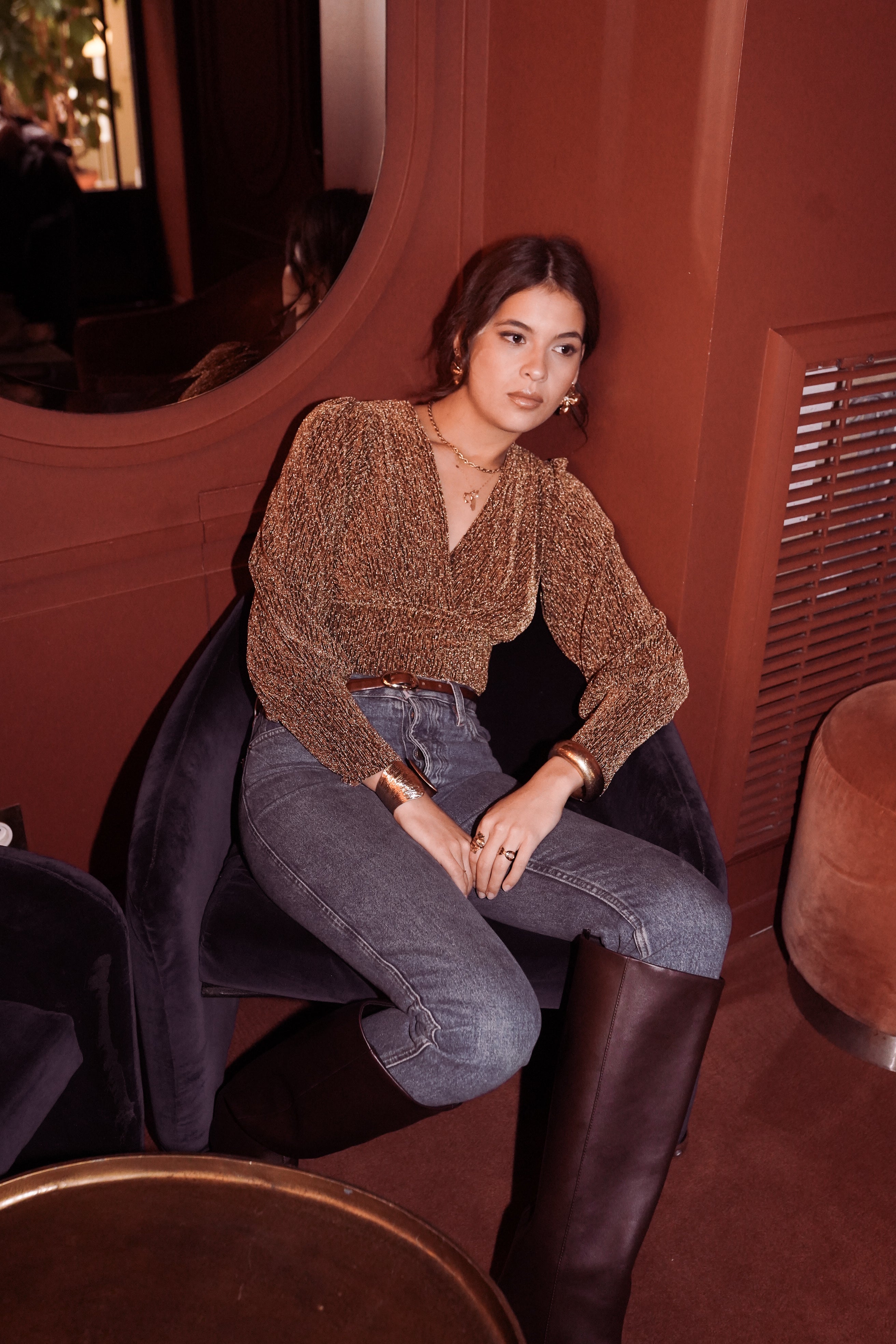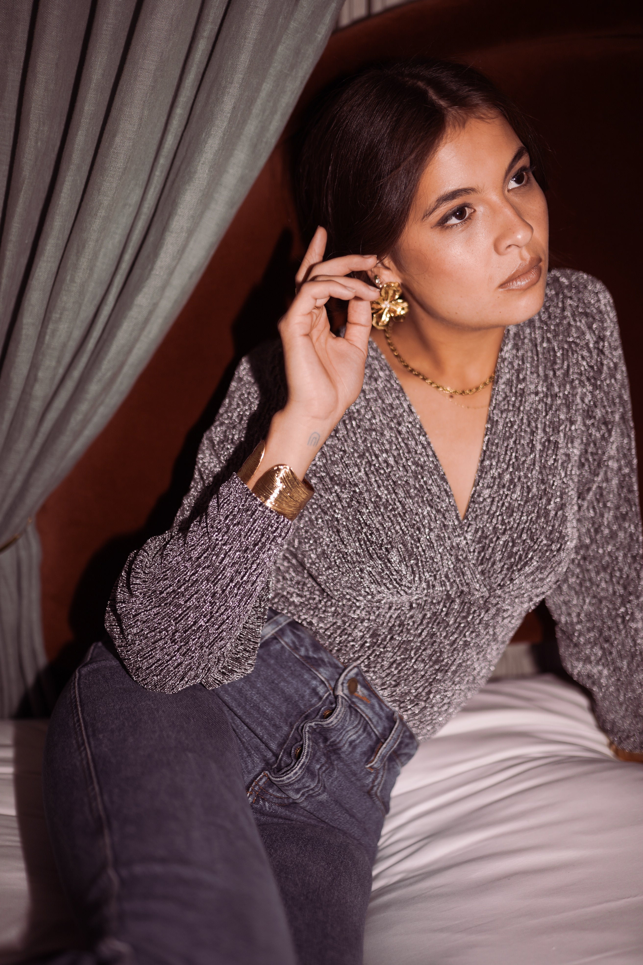 Son effet scintillant souligne chaque mouvement, ses manches ballon apportent une touche couture, et sa coupe ajustée glisse parfaitement dans un jean ou une jupe pour un look de soirée impeccable.
