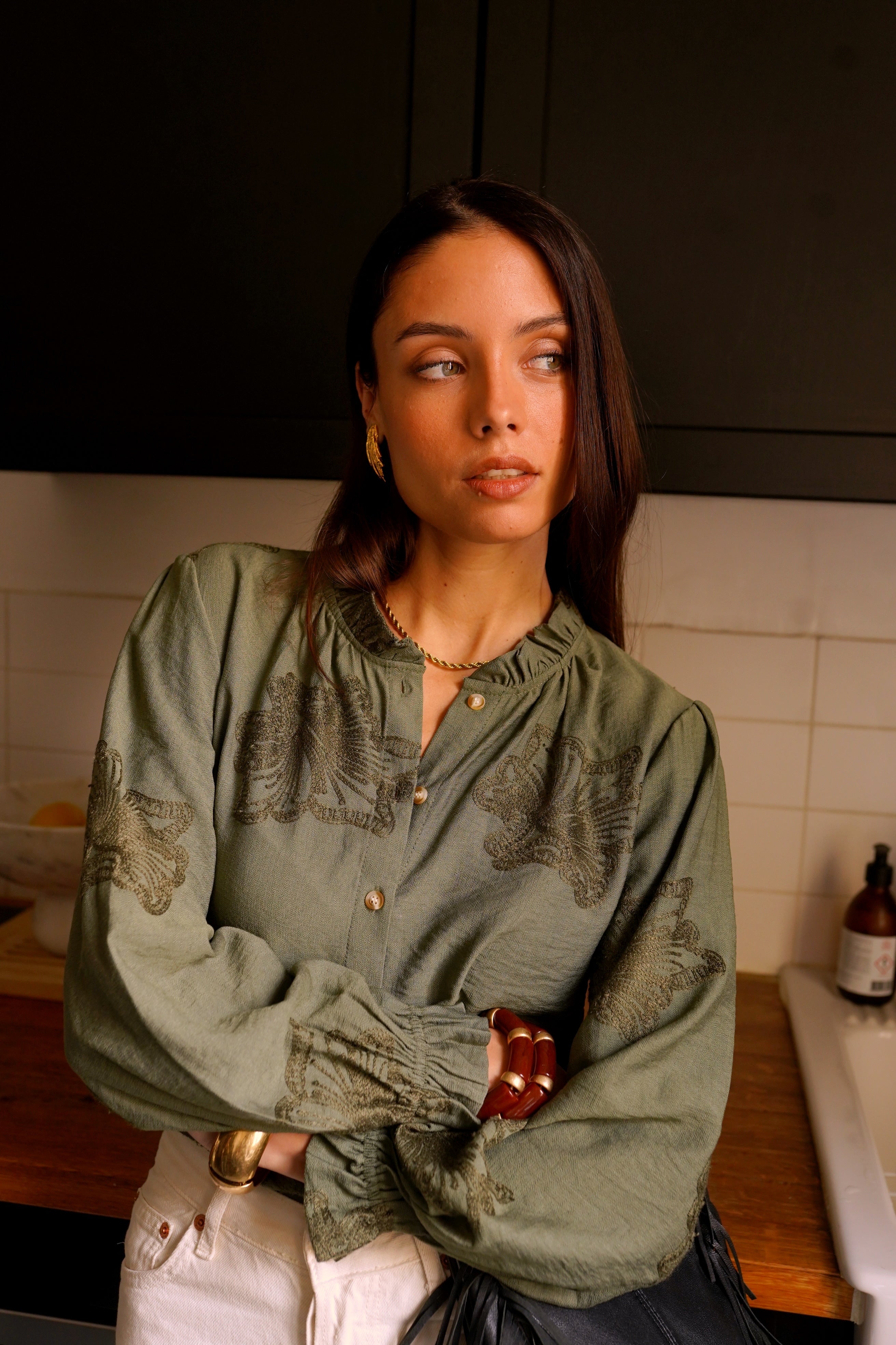 La chemise Addison charme par son raffinement discret et sa délicatesse. Confectionnée dans un vert doux agrémenté de motifs floraux ton sur ton, elle allie élégance et légèreté. Sa coupe légèrement cintrée et son col classique apportent structure et féminité, tandis que ses manches longues finement ajustées aux poignets confèrent une touche de sophistication.