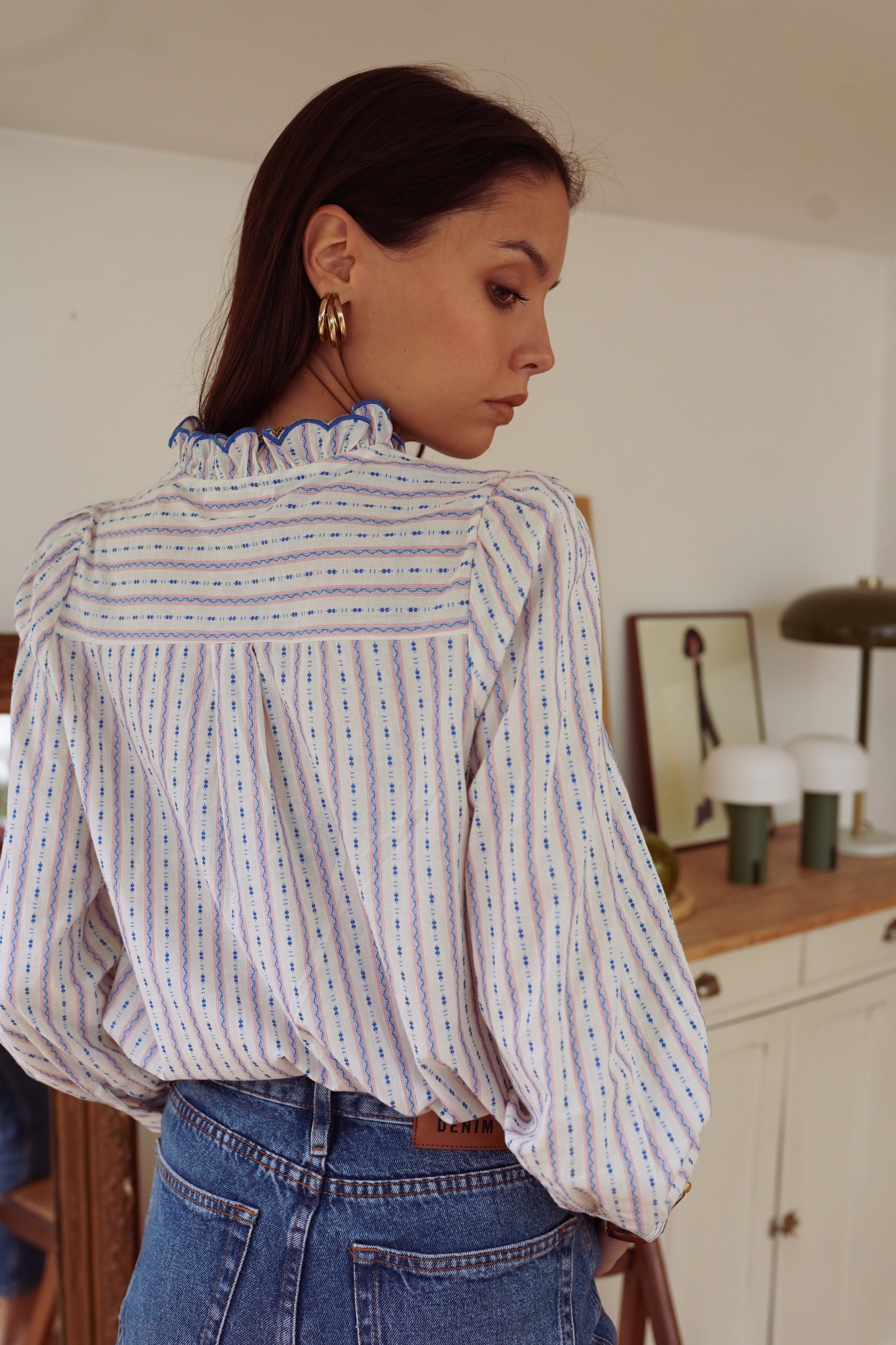 La chemise Ailee revisite l’esprit folk dans une version douce et contemporaine. Son col volanté et ses broderies contrastées en font une pièce forte, sans en faire trop. Avec sa coupe fluide et ses manches légèrement bouffantes, elle twiste les basiques du quotidien à la perfection.
