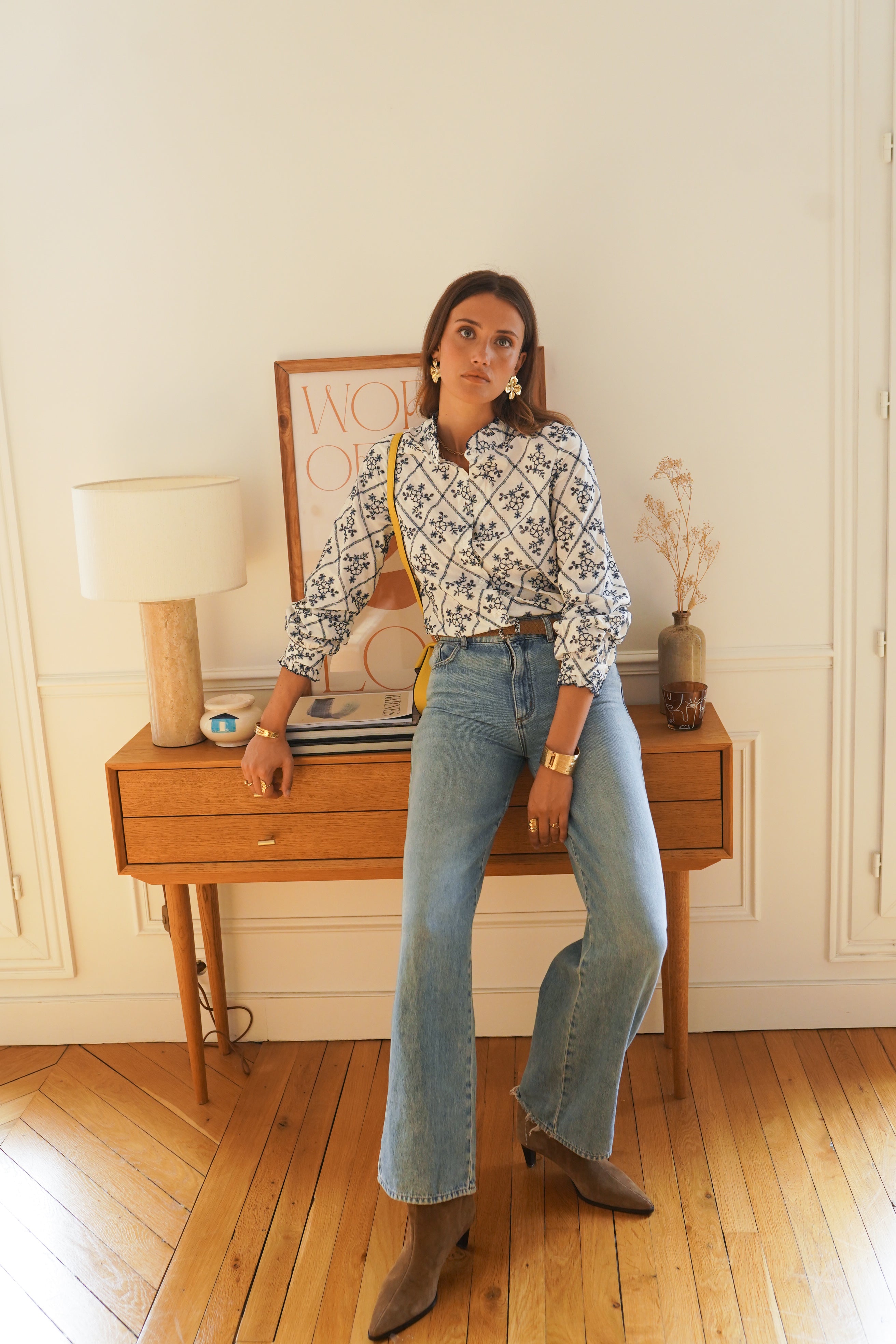 La chemise Amiel allie charme rétro et fraîcheur moderne. Son imprimé géométrique délicatement brodé crée un jeu de contraste subtil sur une toile de coton légère. Avec sa coupe droite et son col officier, elle structure la silhouette tout en restant facile à porter. Une pièce pleine de caractère, qui s’associe aussi bien à un denim brut qu’à une jupe fluide.