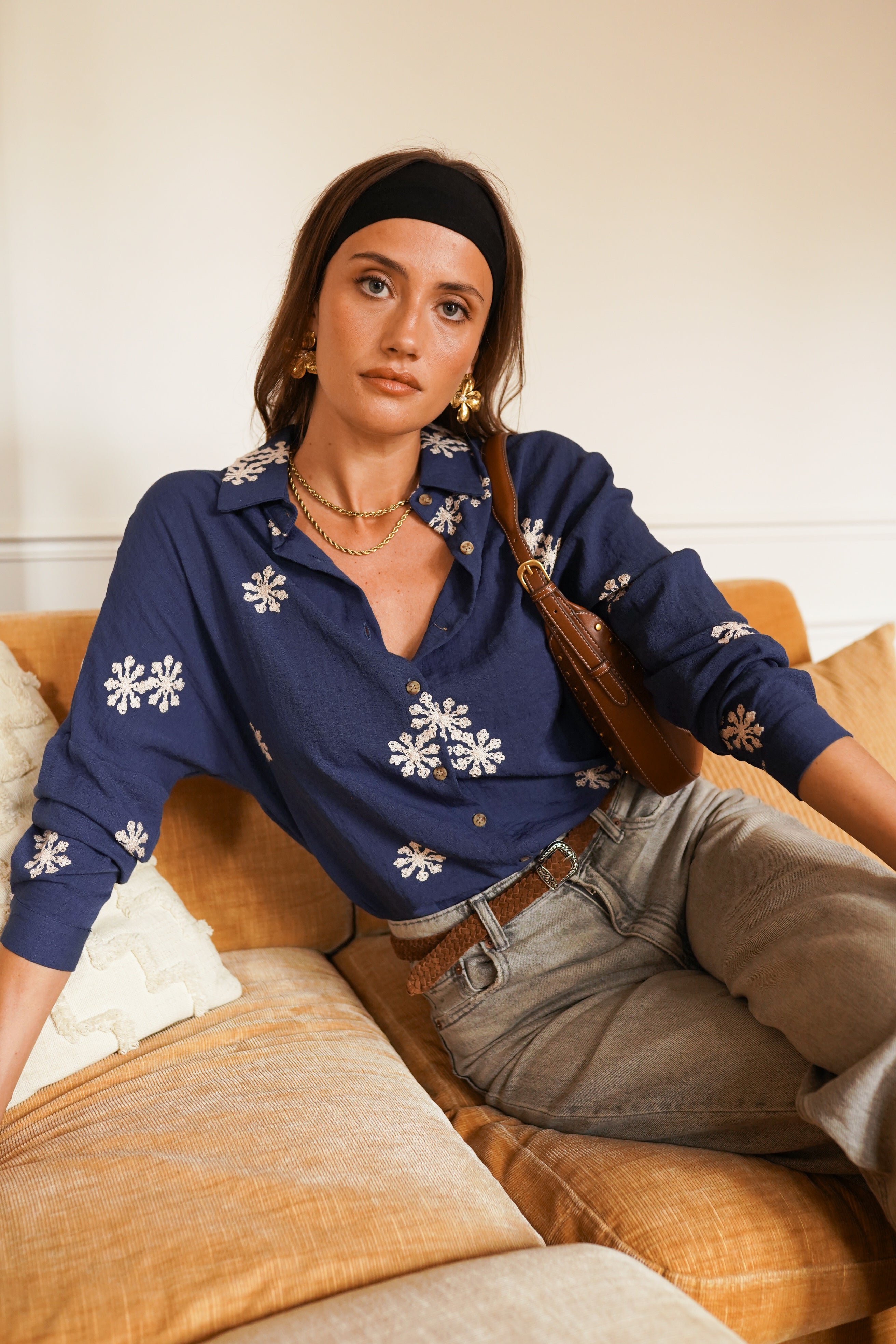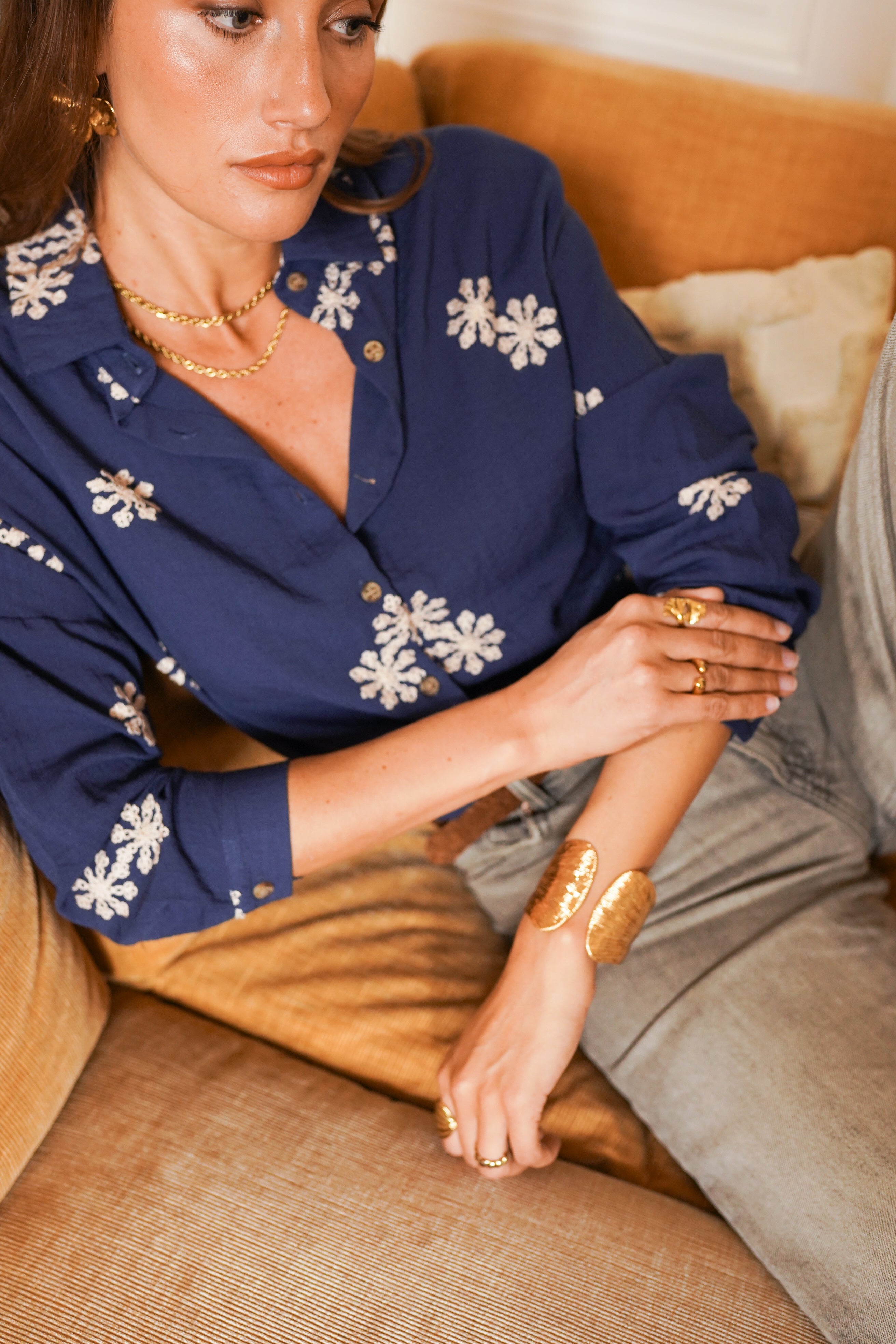 La chemise Anja séduit par son allure bohème et sa richesse de détails. Son coton léger, brodé de motifs floraux contrastés, capte la lumière tout en apportant relief et douceur à la silhouette. Le col ouvert et la coupe fluide signent une allure décontractée, féminine sans effort.
