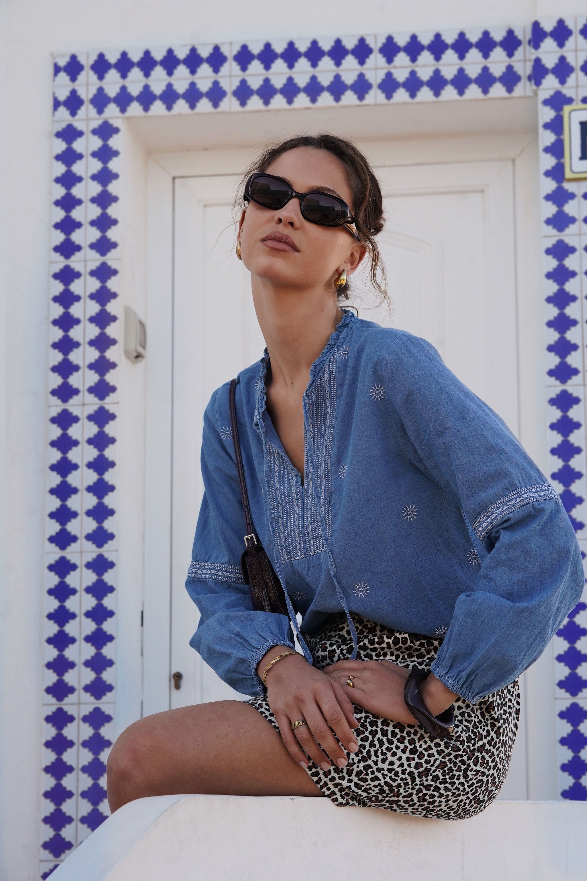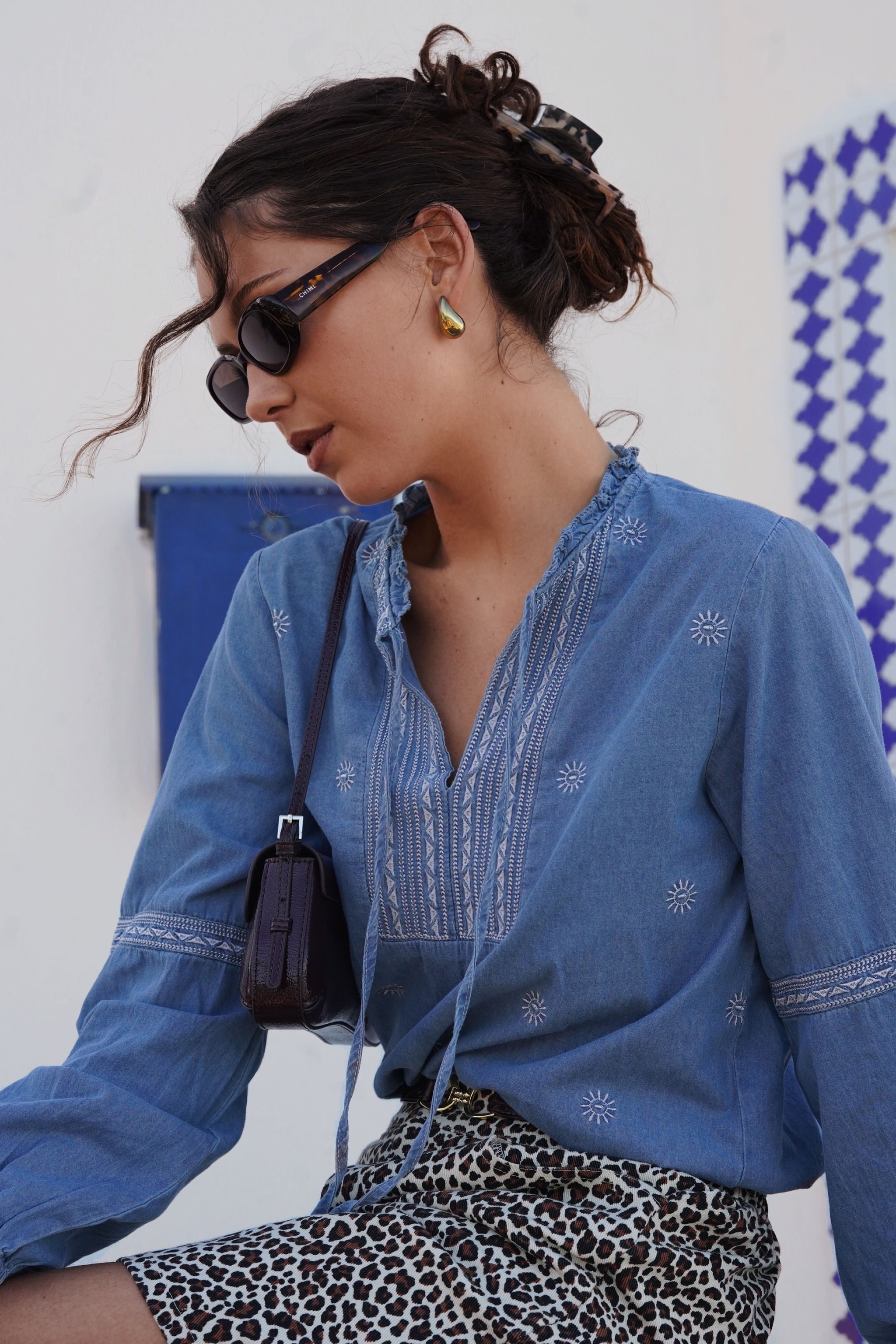 Cette blouse Céleste en denim brodé allie style bohème et modernité avec une touche casual-chic. Son tissu en denim léger est agrémenté de broderies blanches délicates, apportant une dimension artisanale et raffinée.