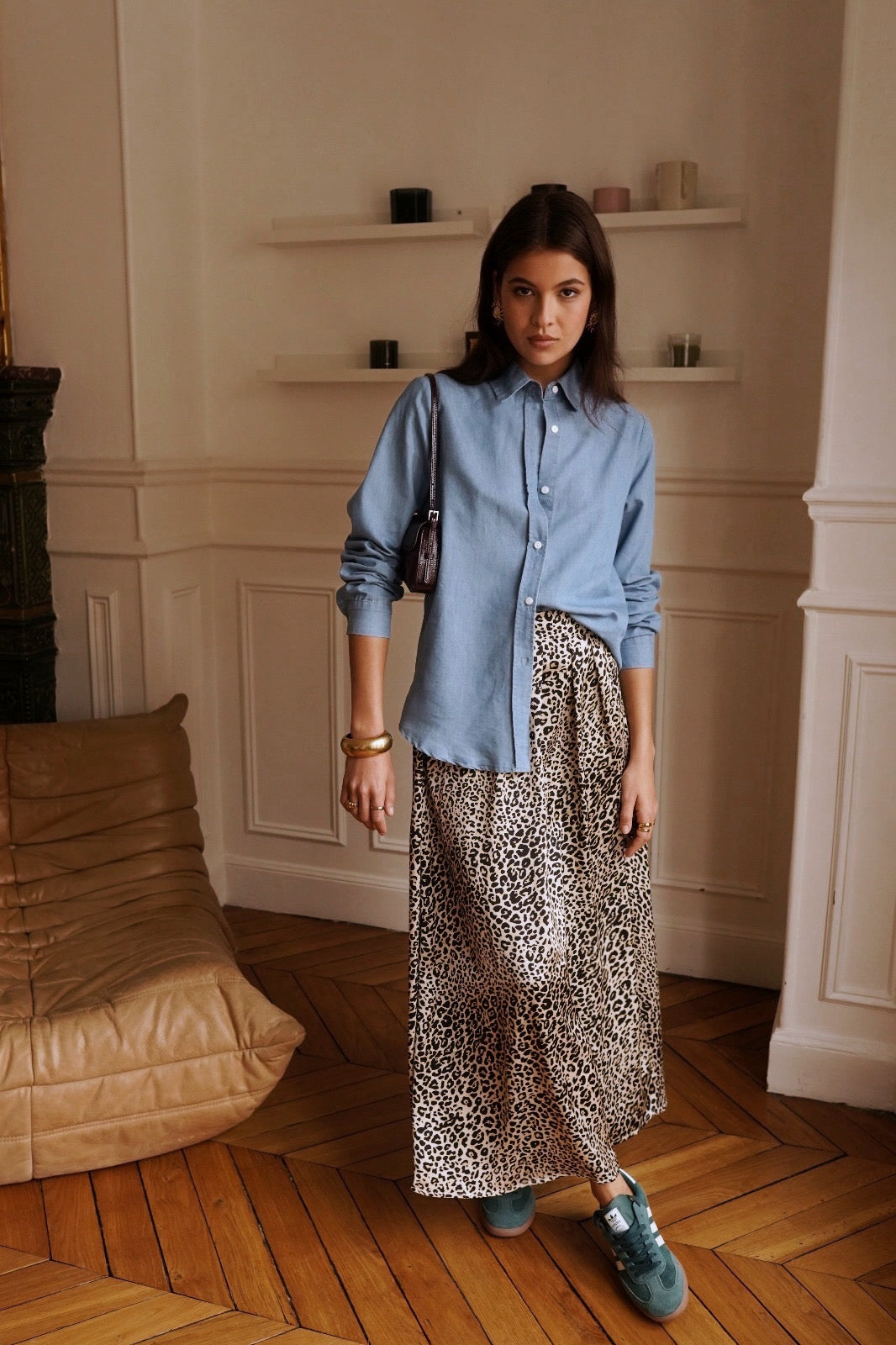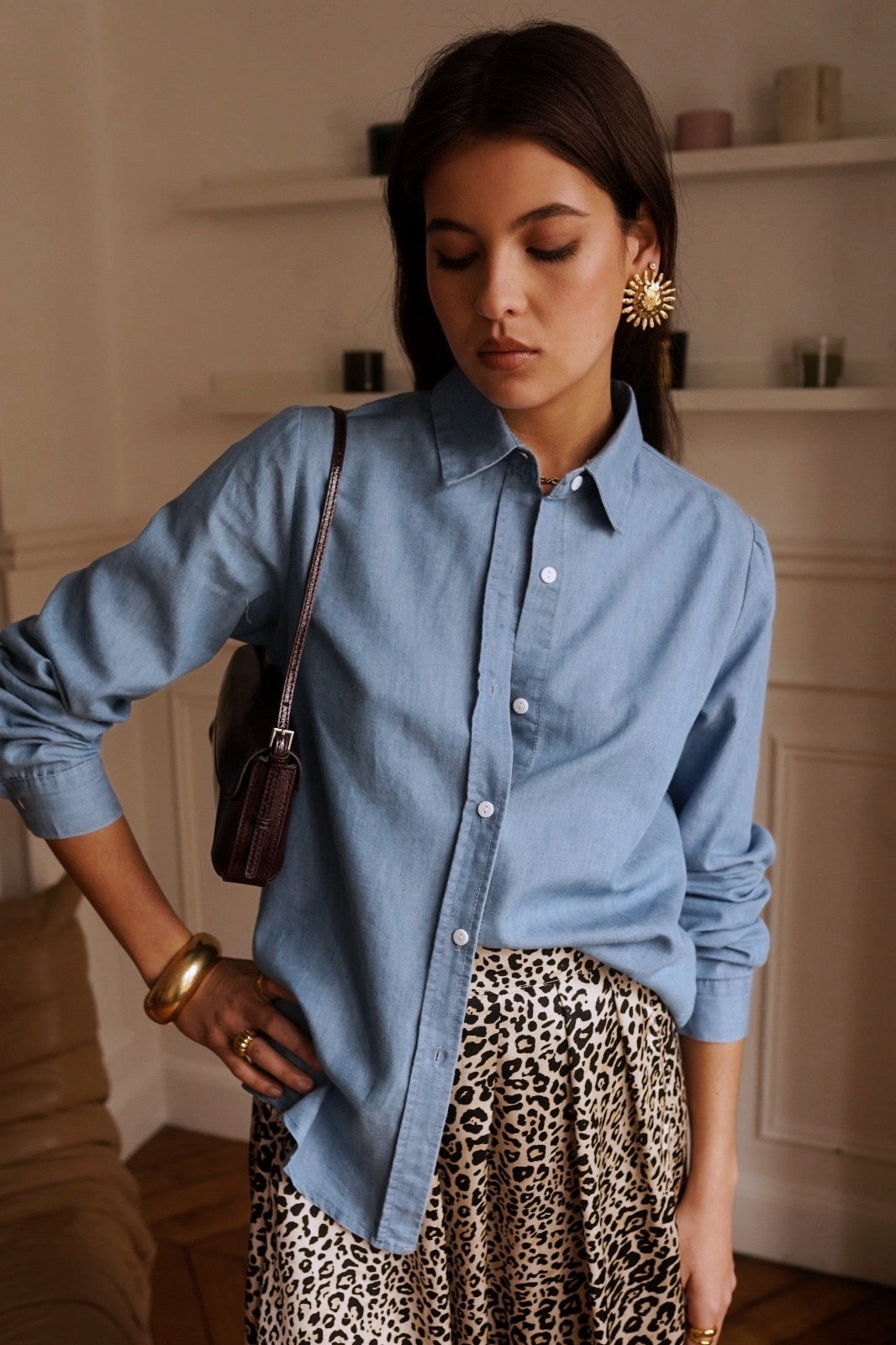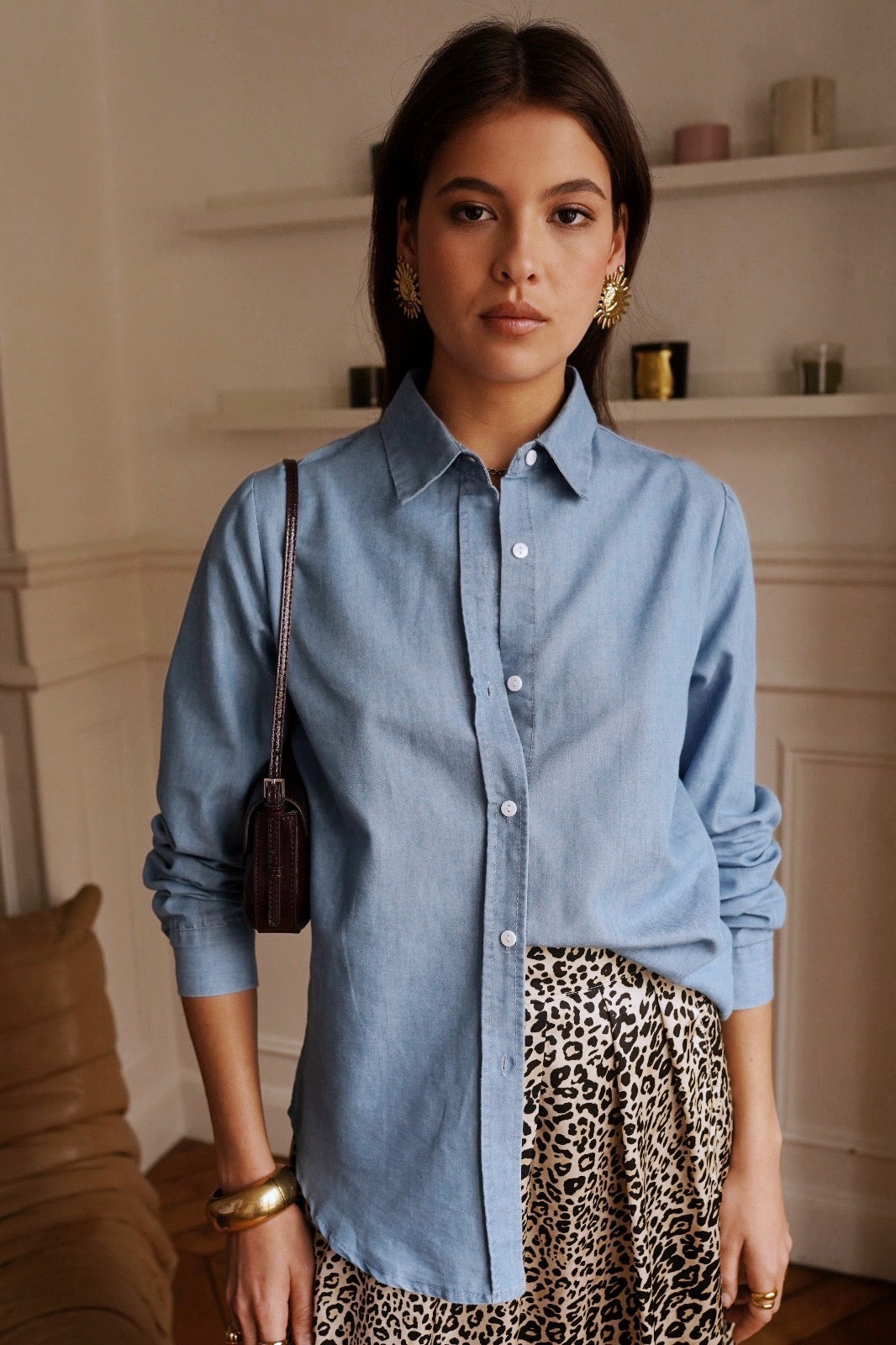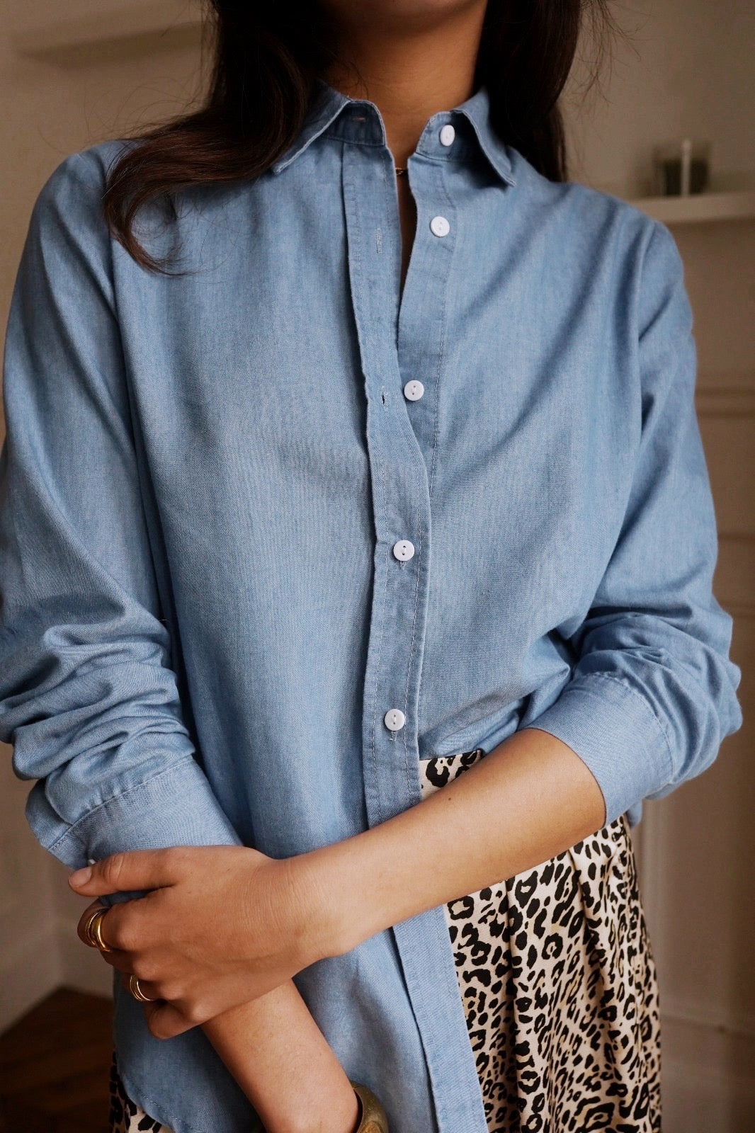 Dotée d’un col classique et d’une fermeture boutonnée, elle se porte aussi bien ouverte sur un top que fermée pour un look sophistiqué. Cette chemise en denim léger, un indispensable du dressing.