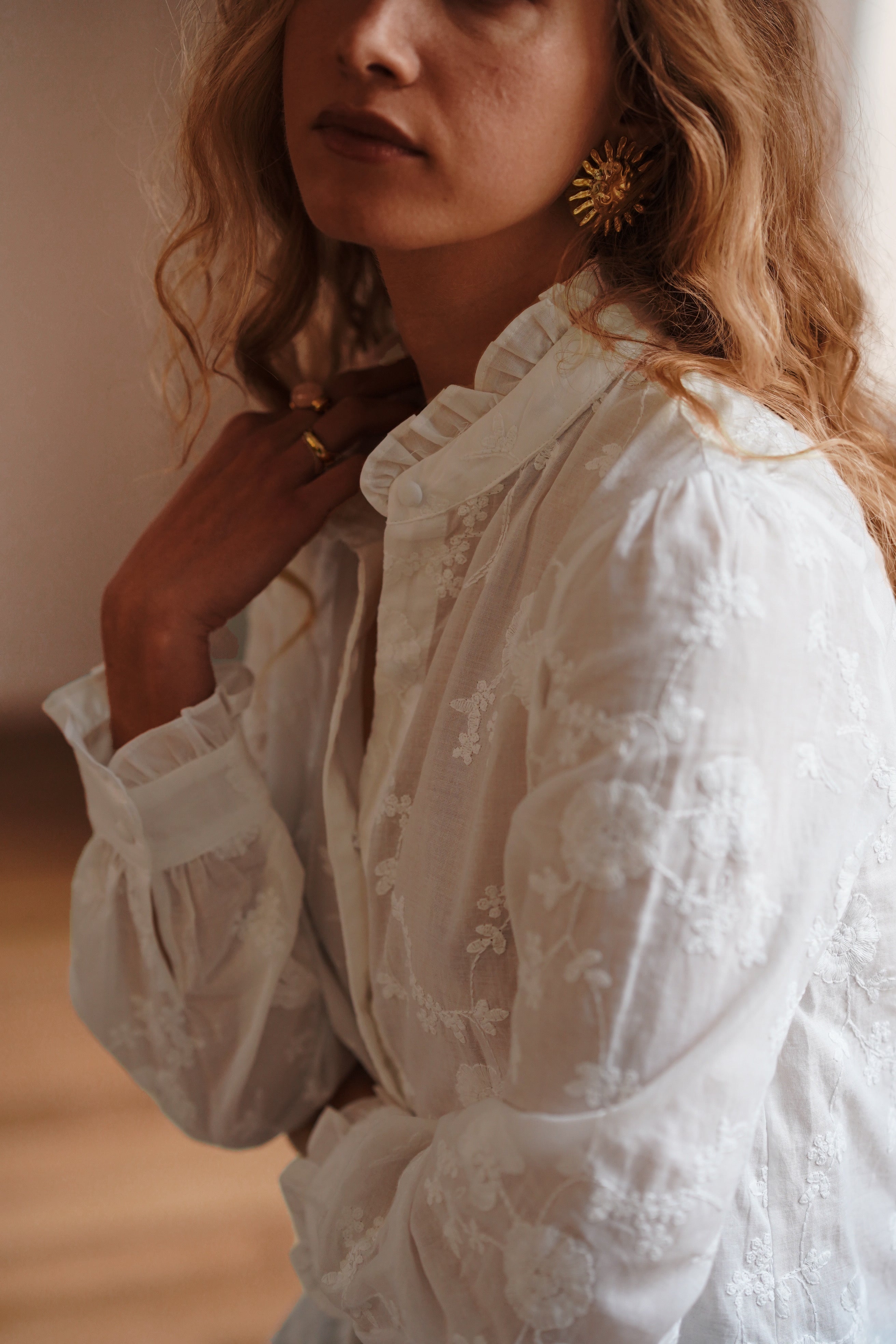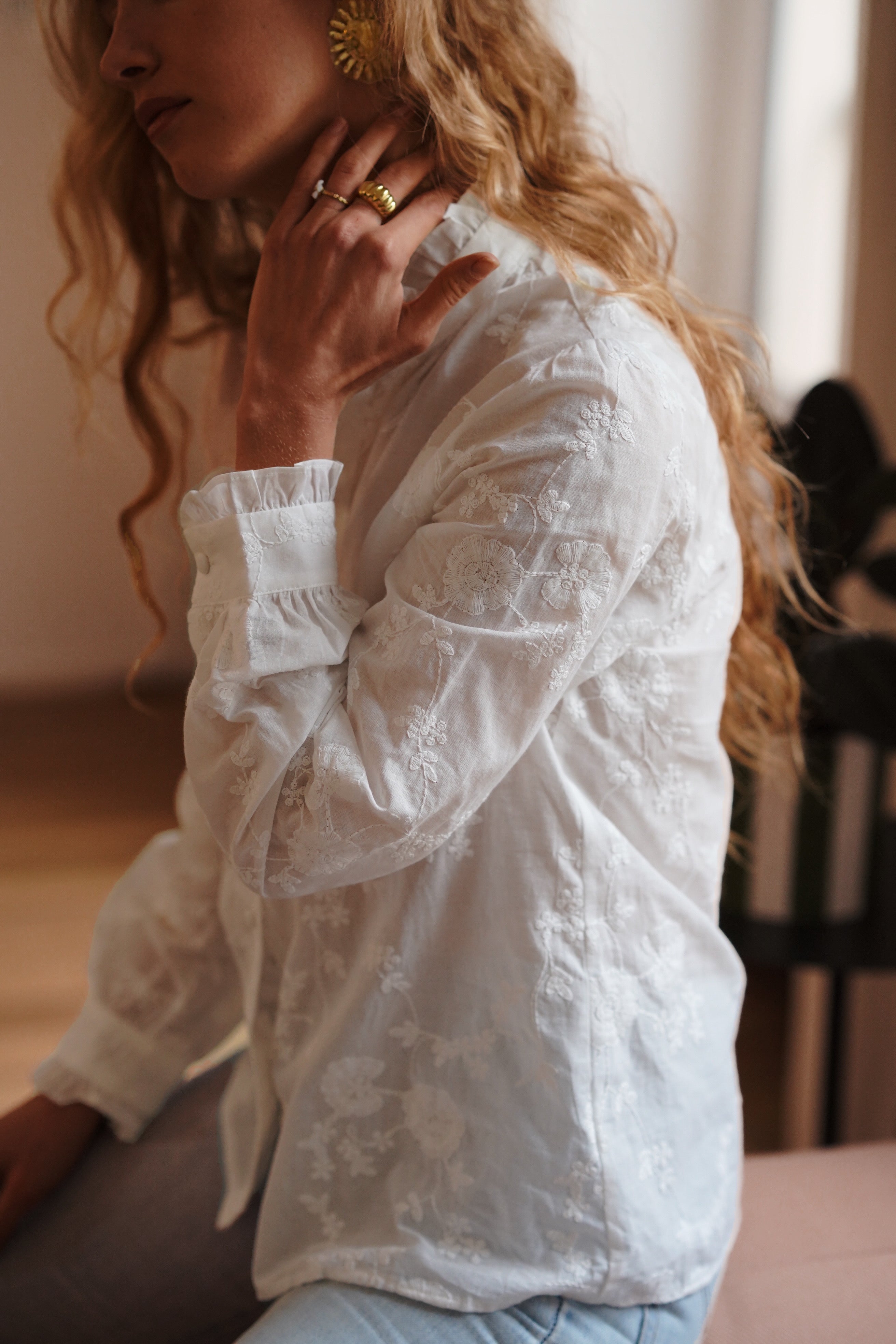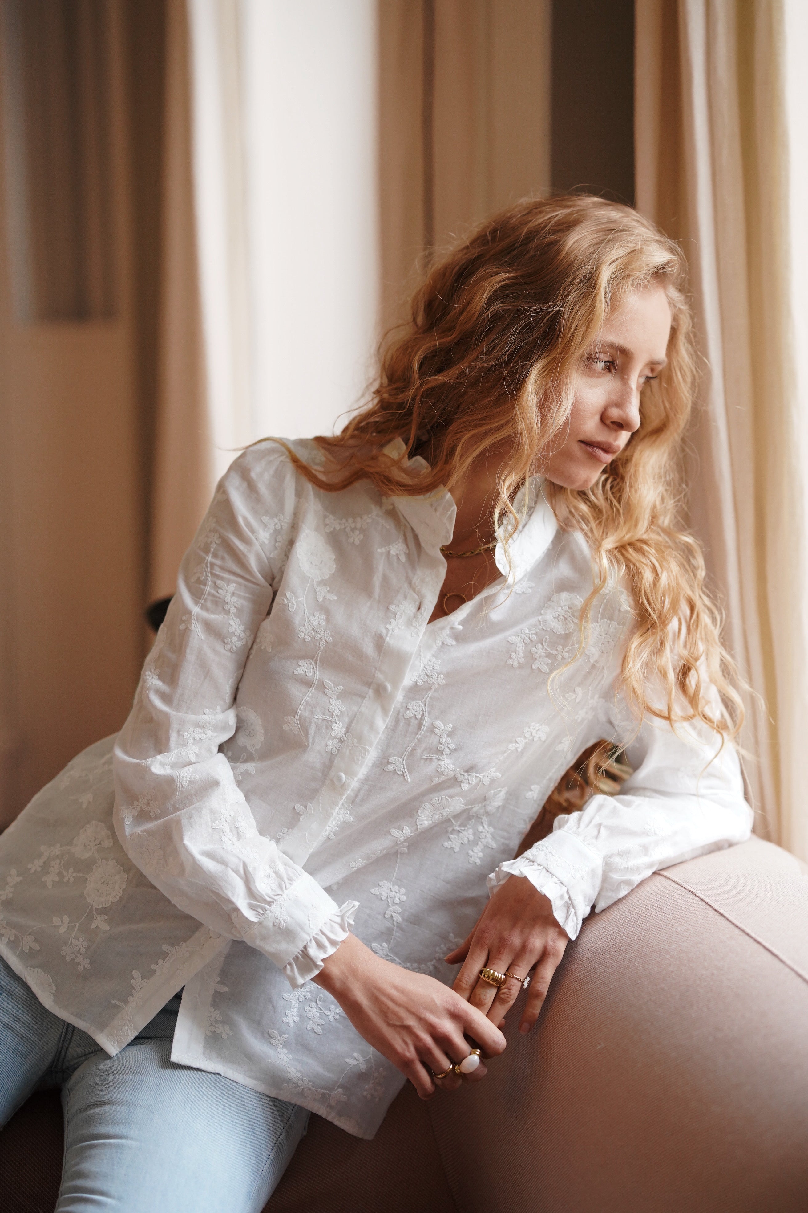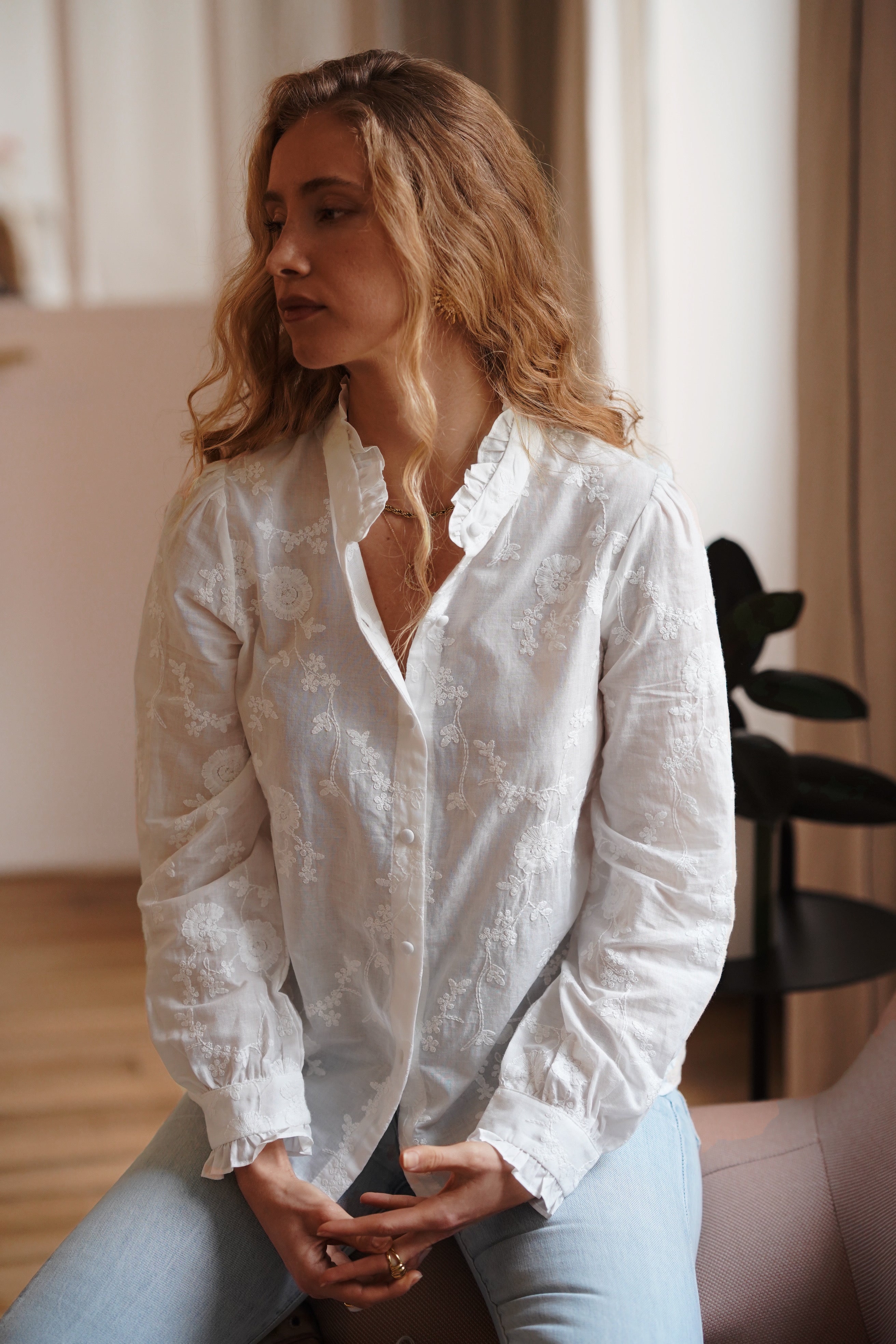 Cette chemise blanche brodée est un véritable essentiel au charme romantique et intemporel. Confectionnée dans une matière légère, elle se distingue par ses broderies délicates qui ajoutent une touche d’élégance subtile.