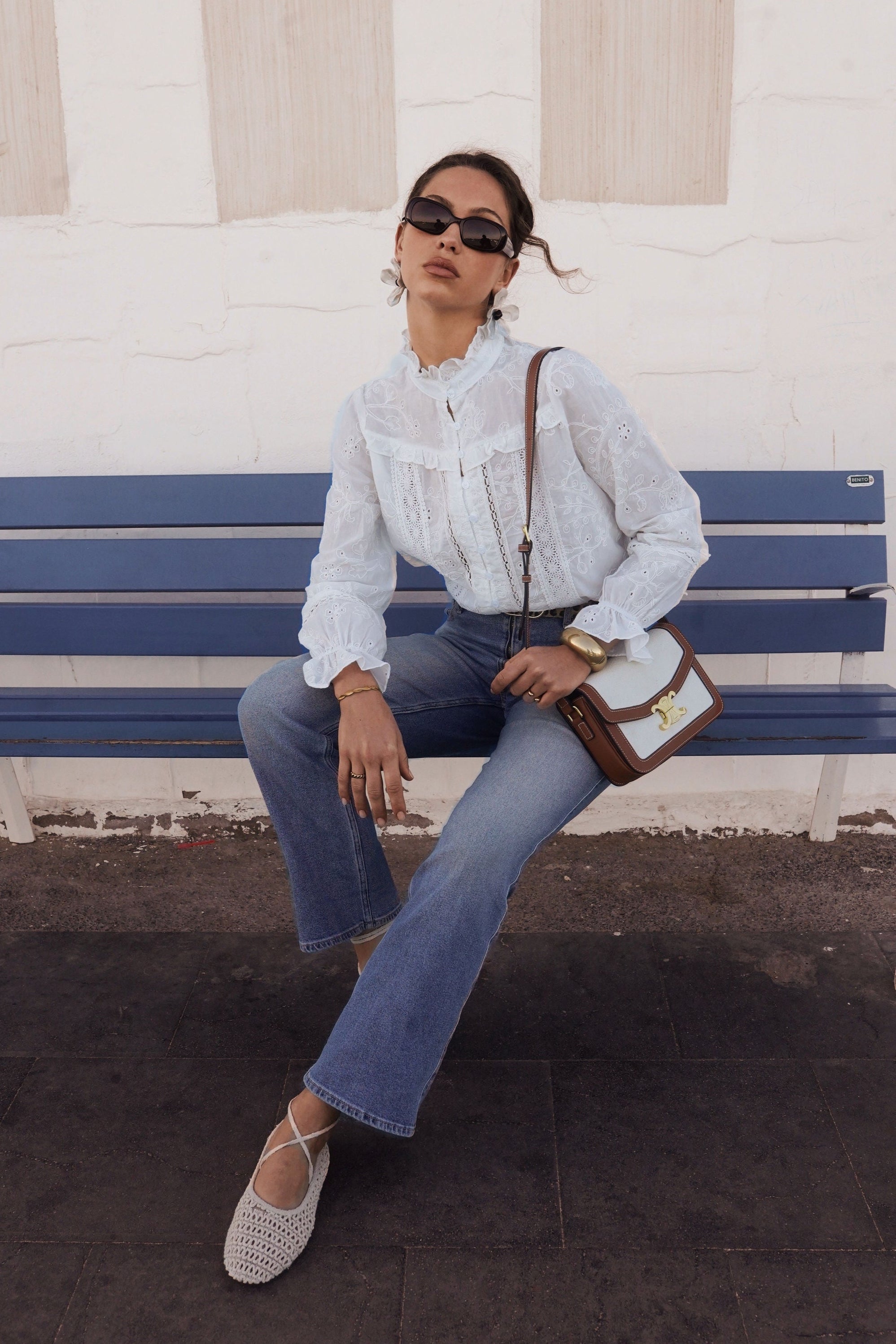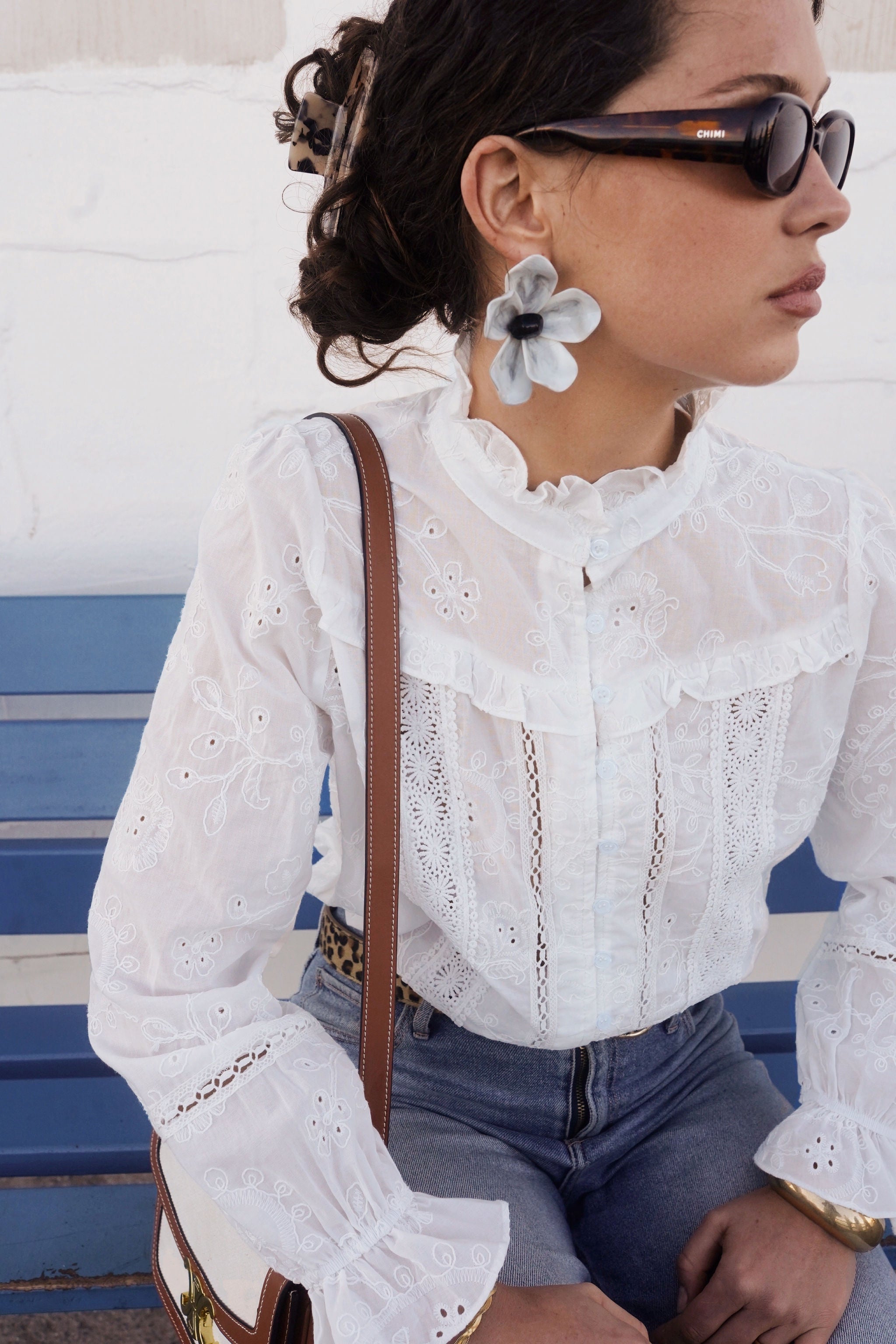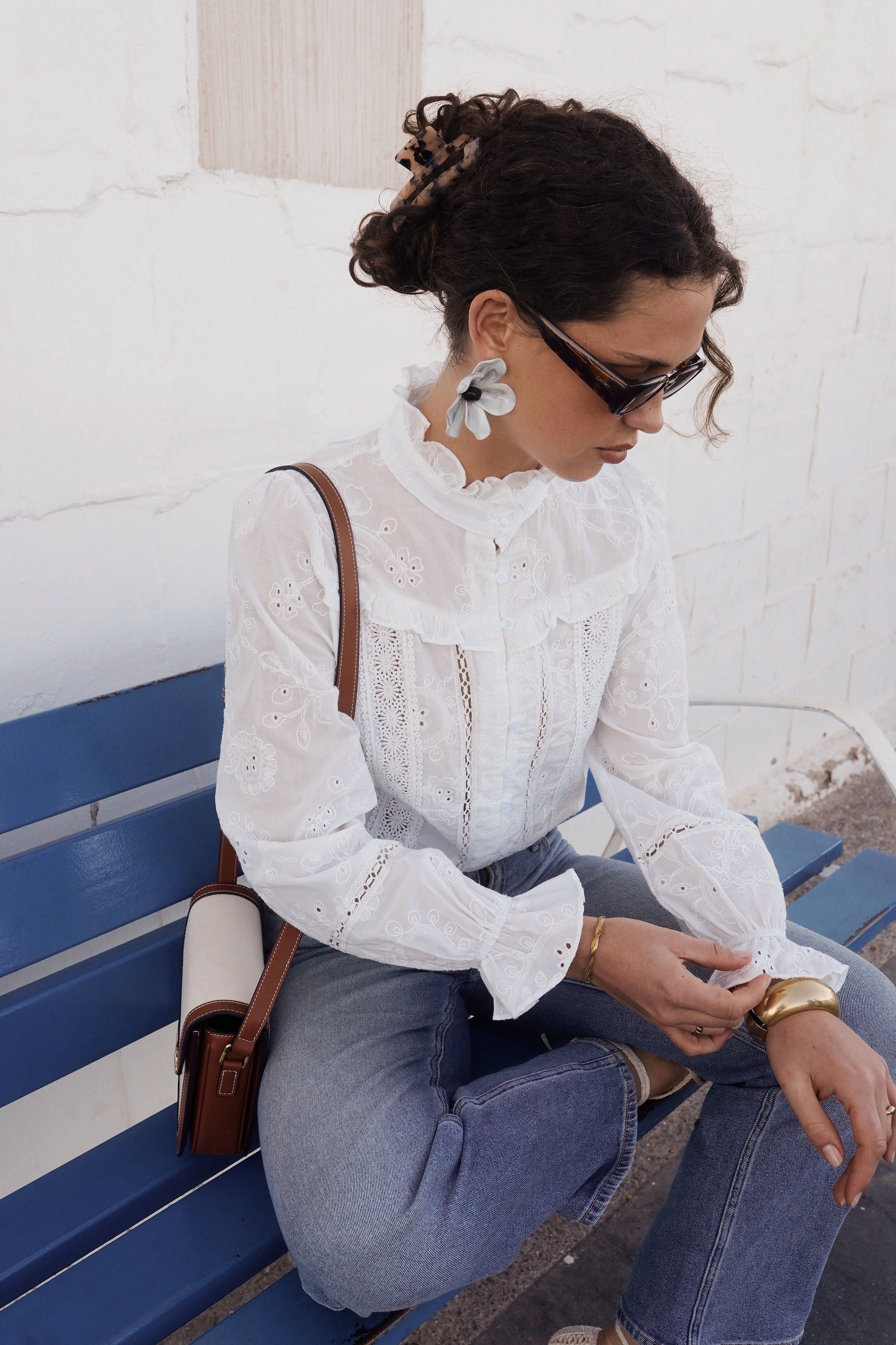 Tissu brodé avec des jeux d'ajourés, col légèrement montant froncé, poignets élastiqués.