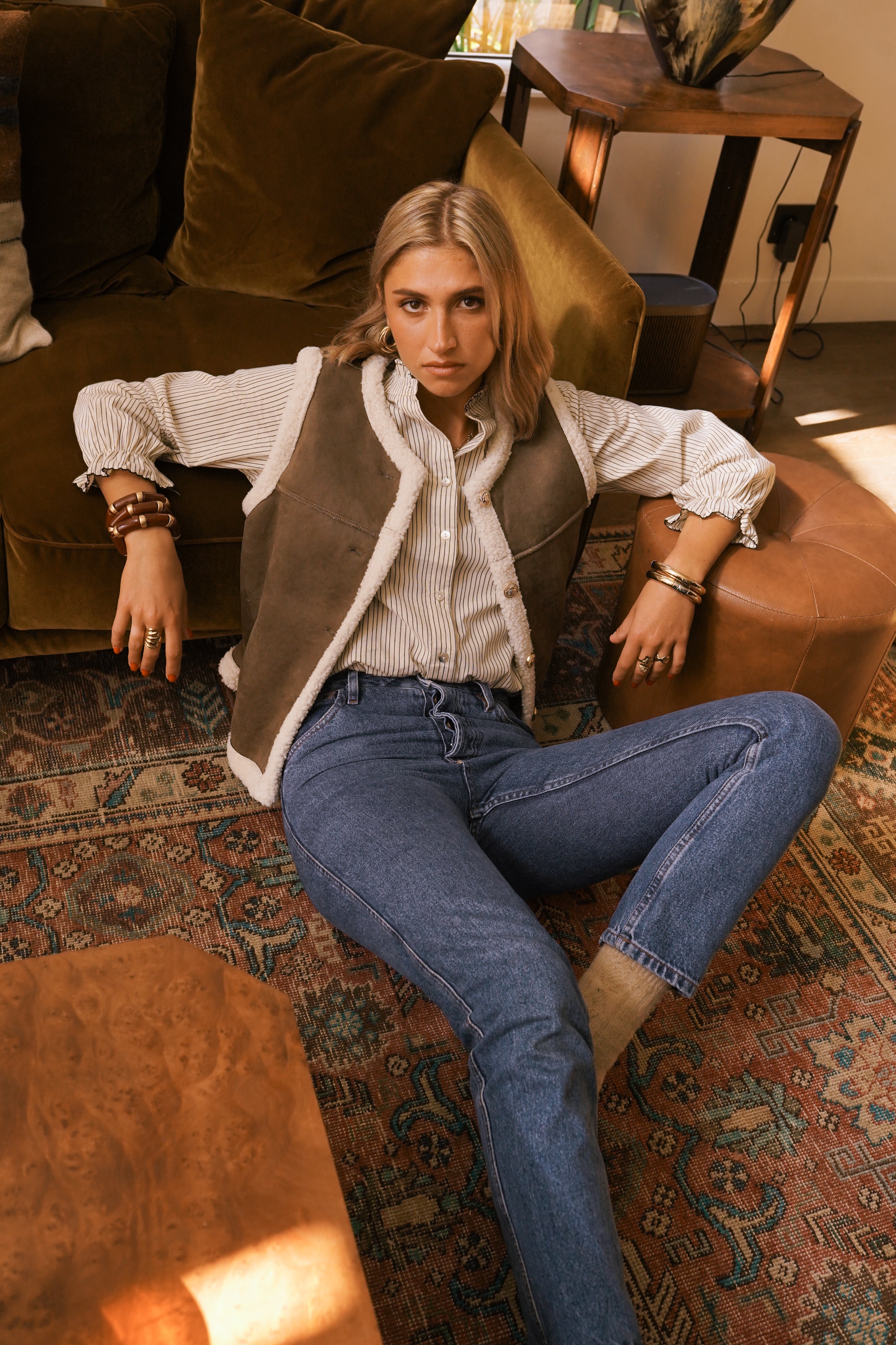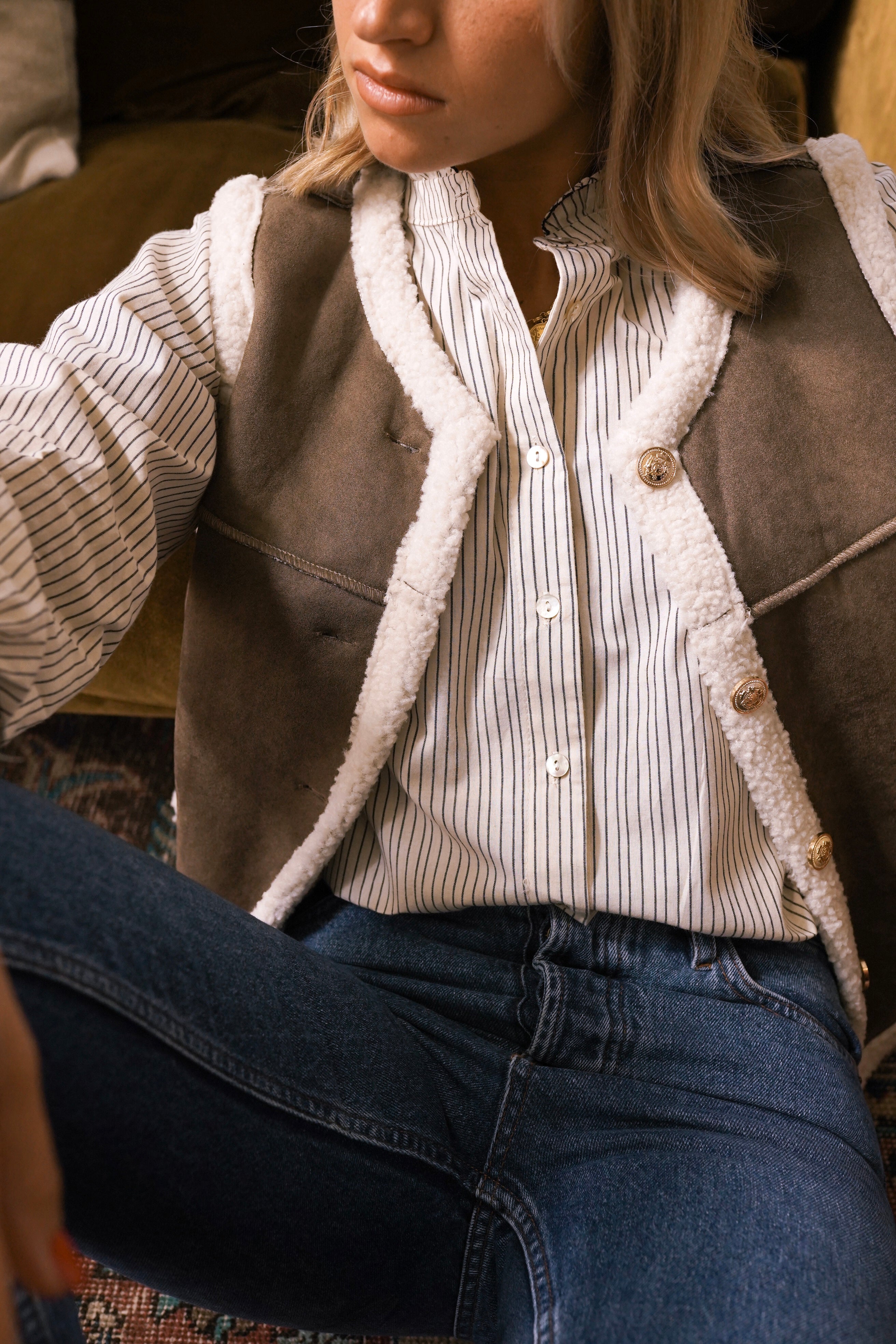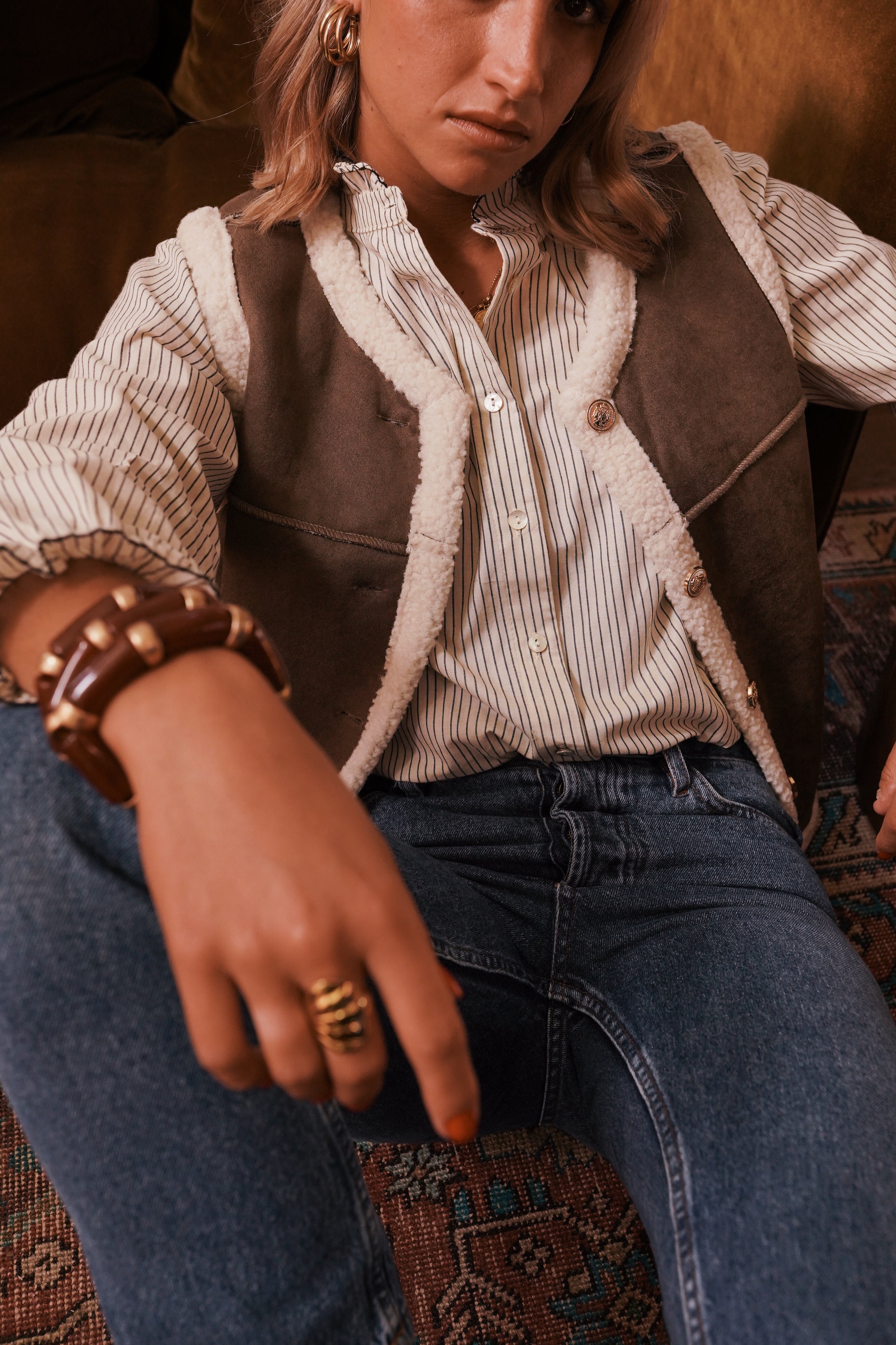 Portez la Jacob avec le gilet Marly et un denim clair pour un look country chic réchauffé d’accessoires dorés.