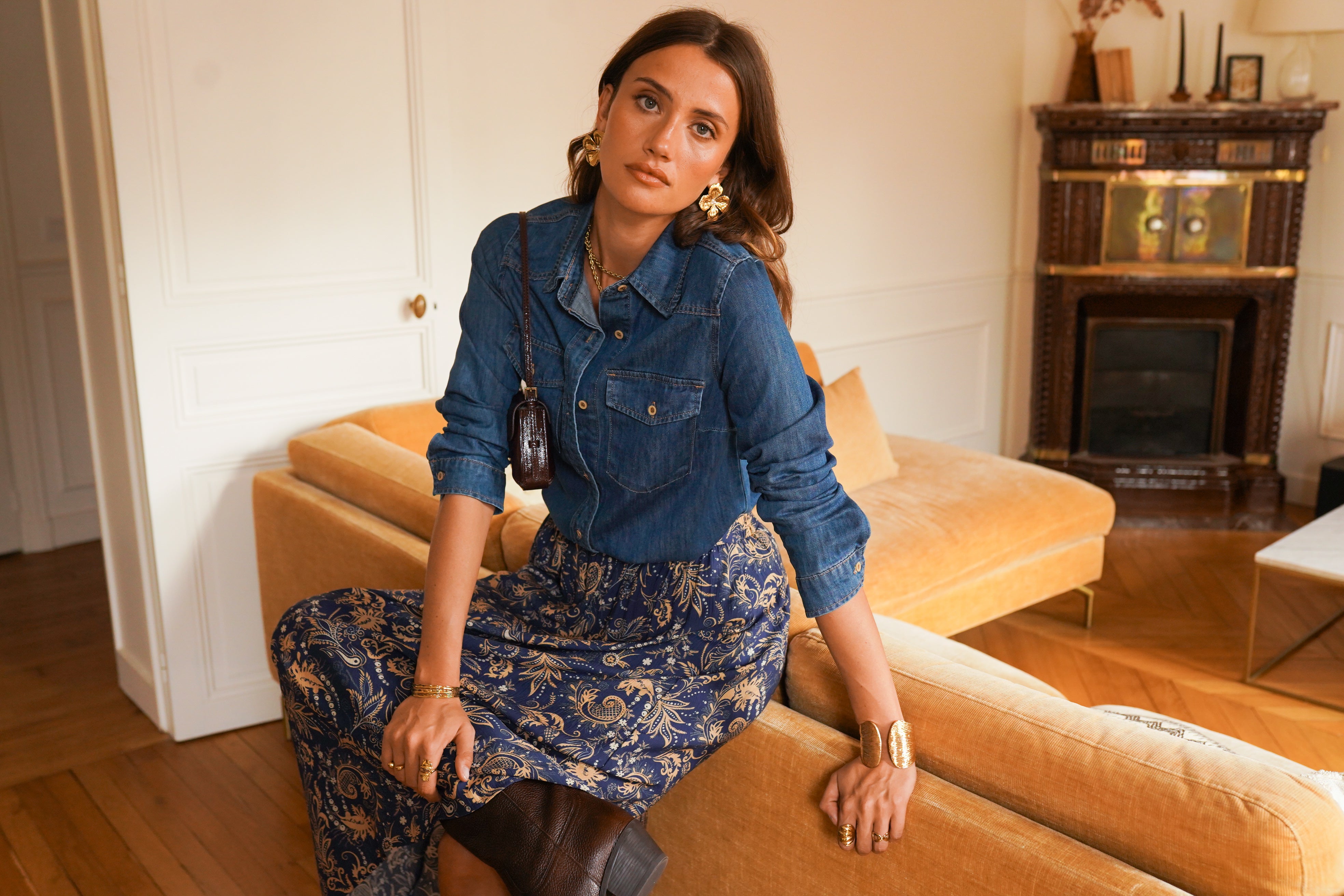 À porter rentrée dans une jupe imprimée ou un pantalon taille haute pour un look folk revisité. En total look denim, elle révèle tout son caractère.