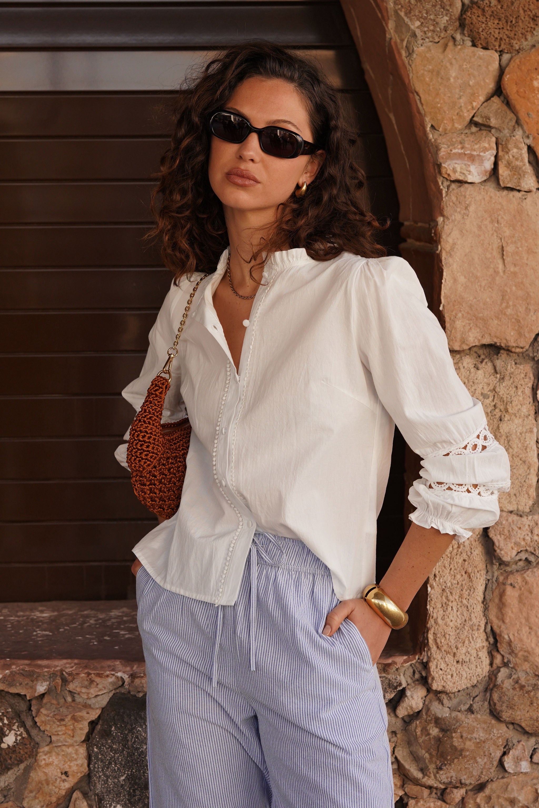 Manches longues avec broderies ajourées, poignets élastiqués et col froncé.
