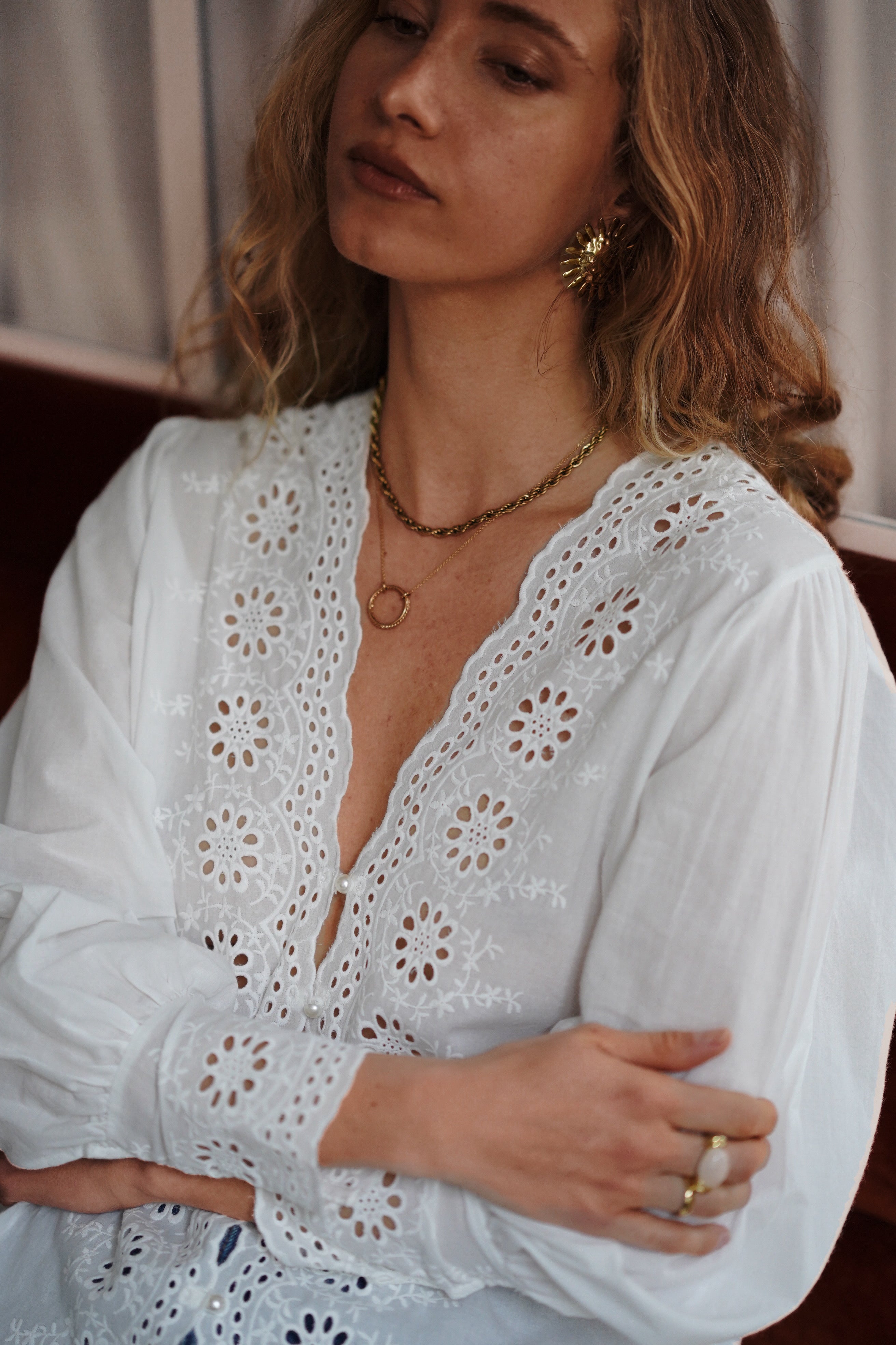 La chemise Nora est blouse en broderie anglaise blanche, élégante et féminine. Elle est confectionnée dans un tissu léger et fluide, parfait pour un look bohème et raffiné.