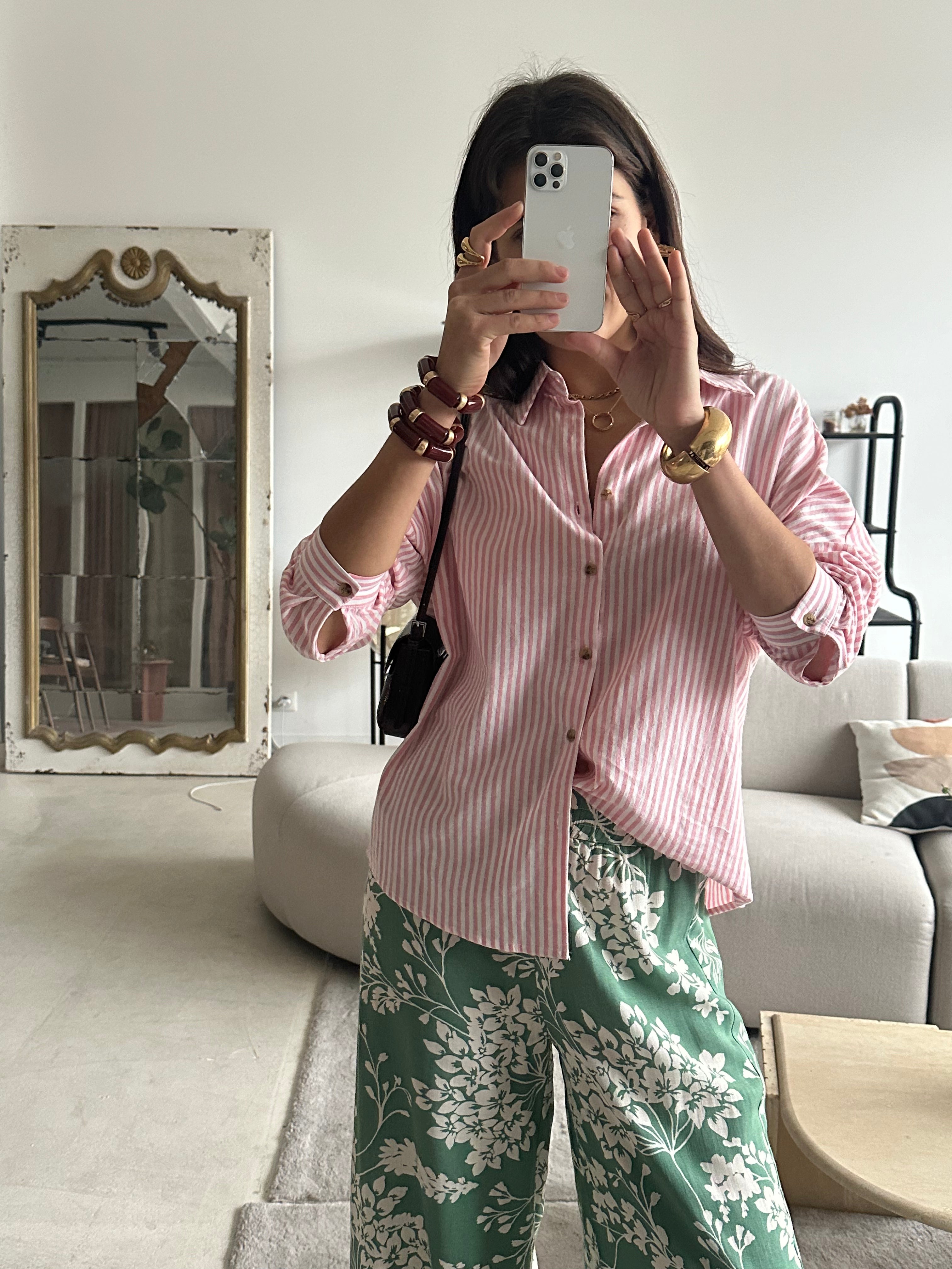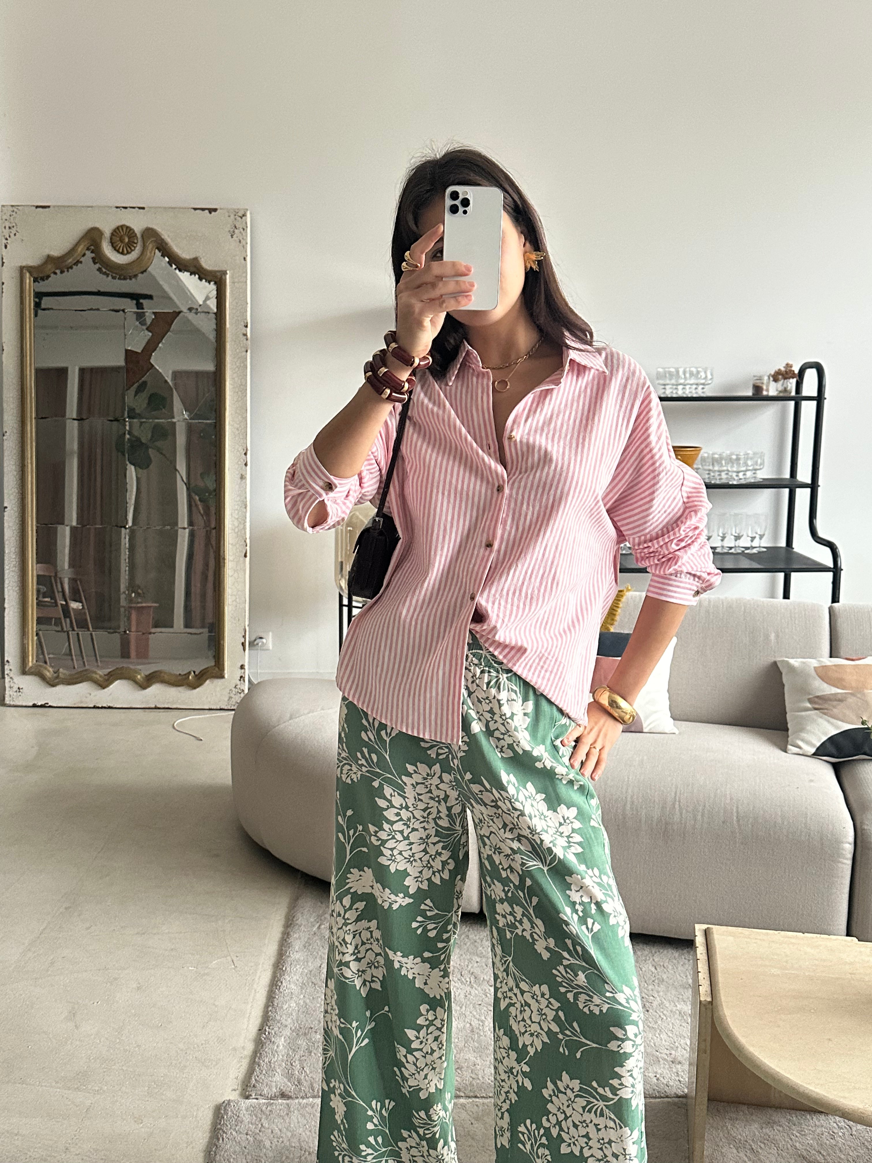 Chemise rose rayée blanche, effet légèrement oversized.