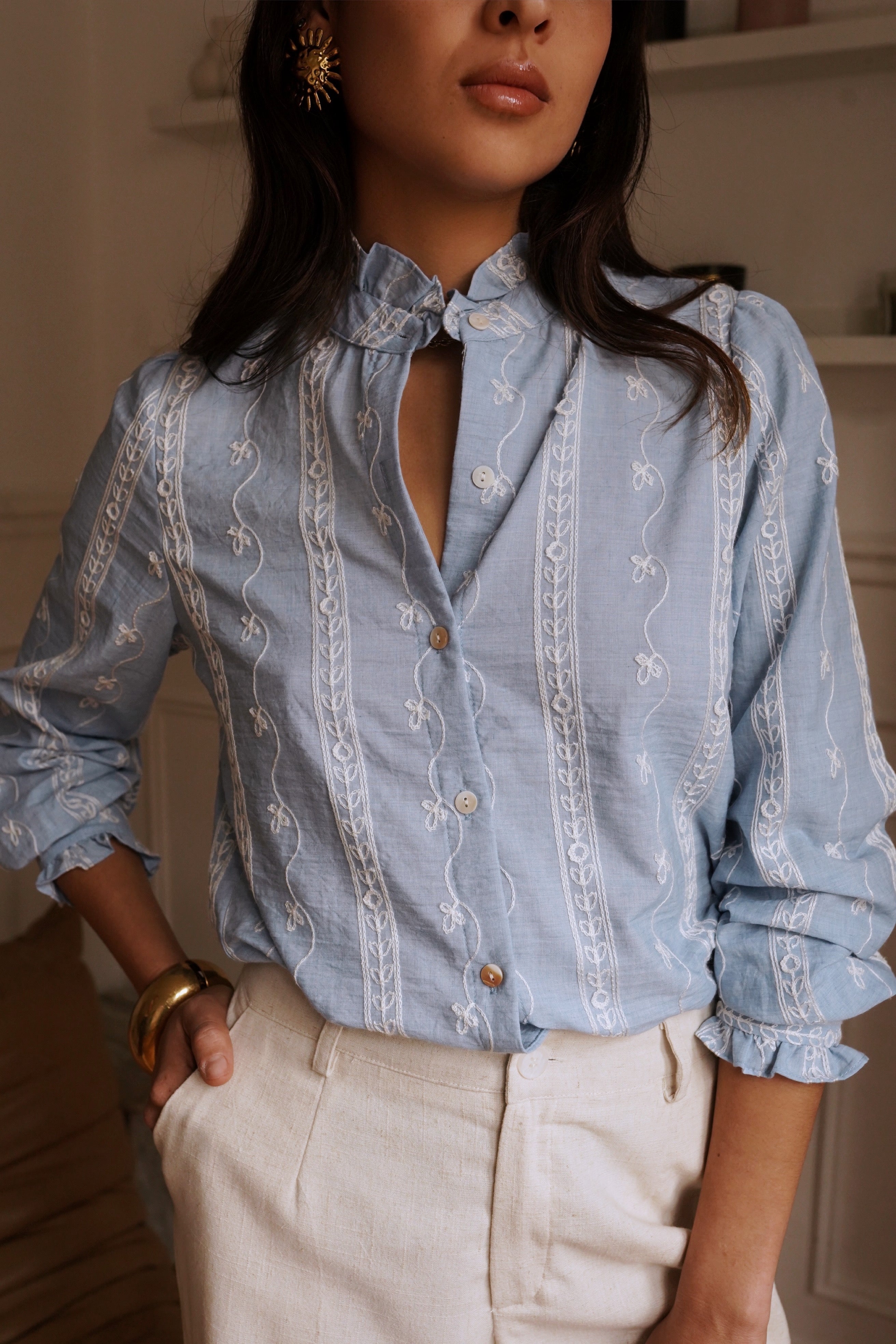Le col froncé, subtilement travaillé, confère à la chemise une allure romantique et féminine, pour une silhouette élégante et raffinée. Caractériser par ses manches longues finement décorées de broderies crème, qui ajoutent une touche de sophistication et de délicatesse à son design.