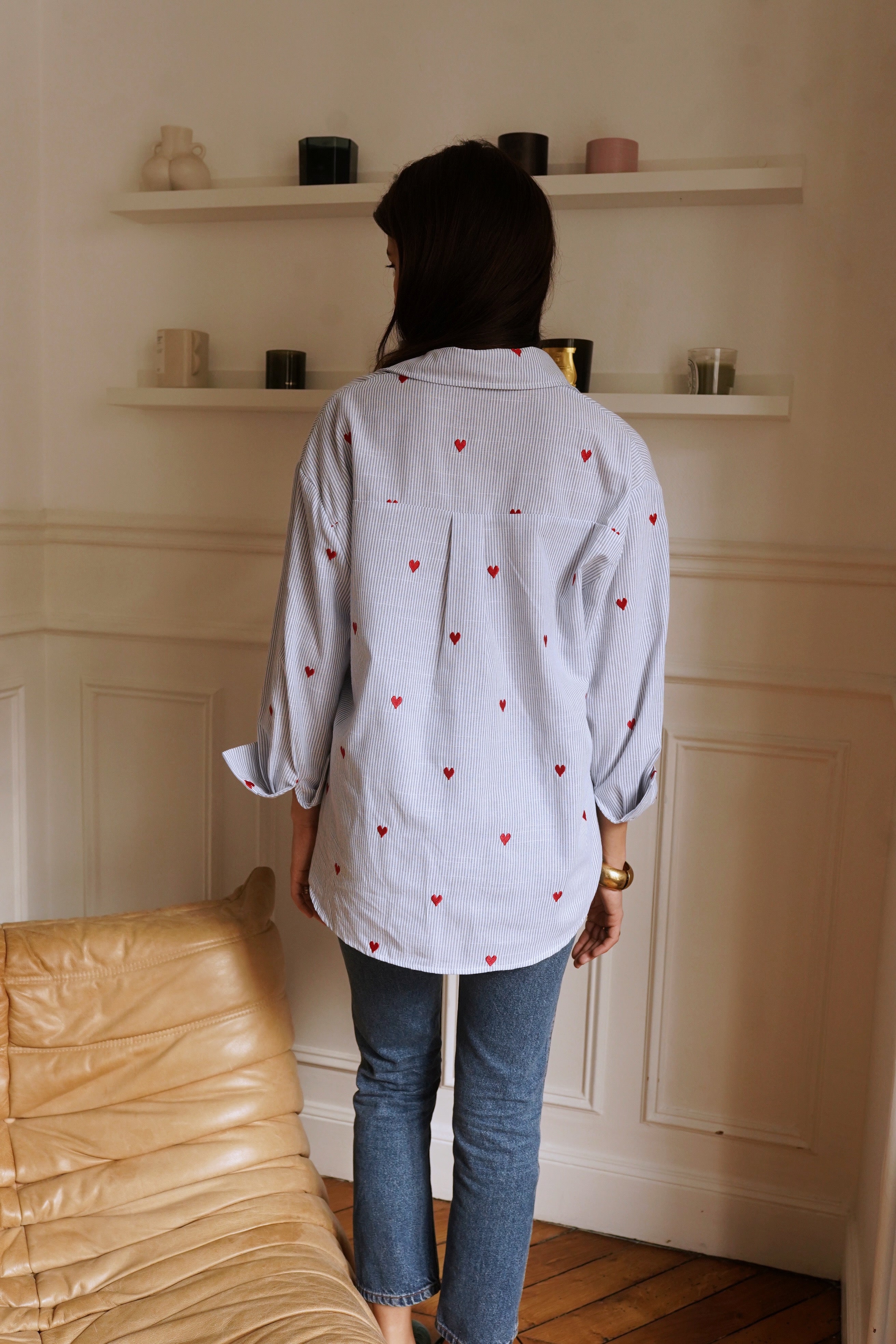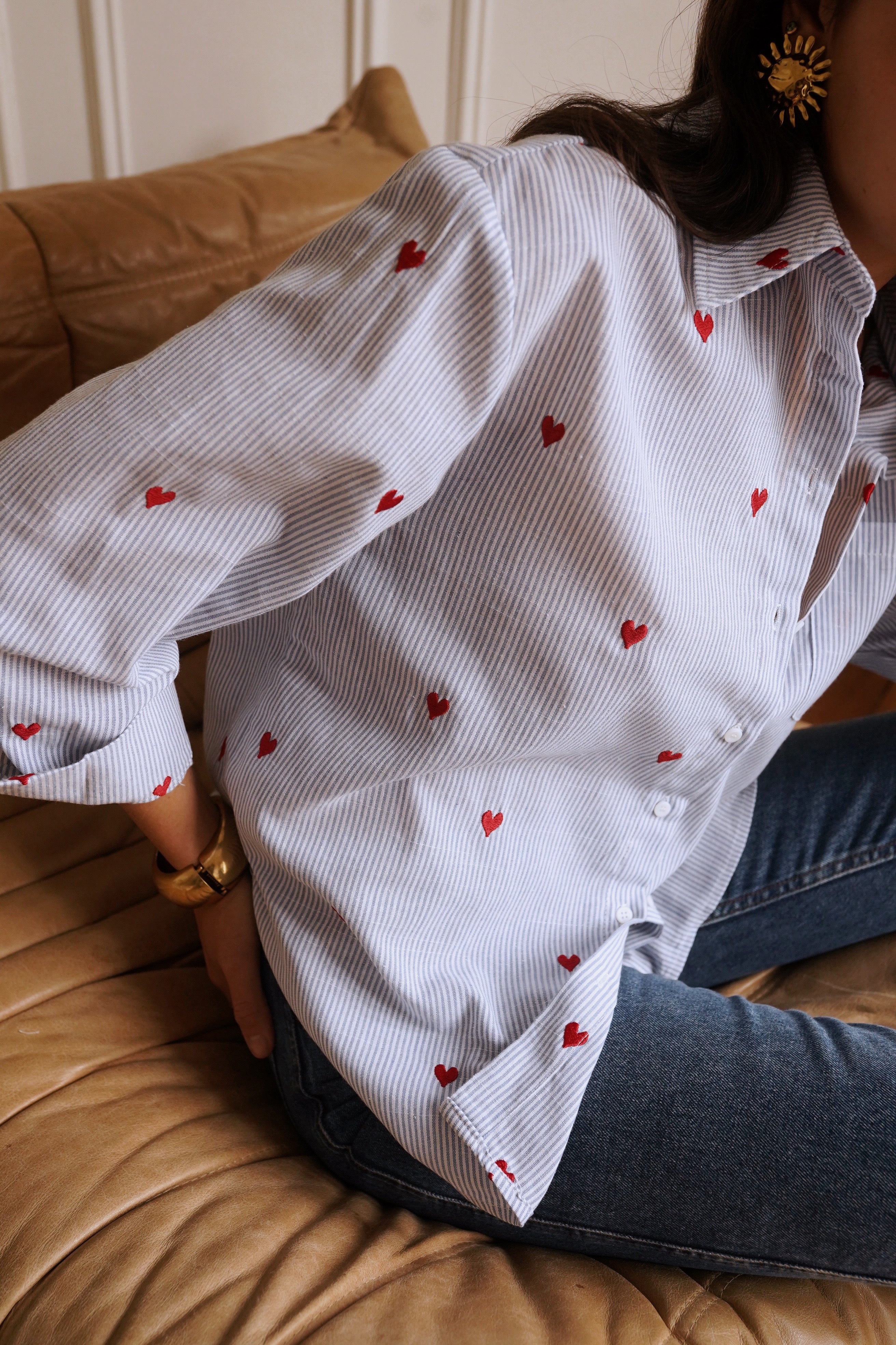 Cette chemise bleue allie élégance et romantisme avec ses délicats cœurs brodés en rouge. Son tissu léger et sa coupe intemporelle en font une pièce facile à porter, aussi bien pour un look casual que plus sophistiqué. Les broderies apportent une touche de fantaisie et de charme, contrastant joliment avec le bleu profond du tissu. Idéale avec un jean pour une tenue décontractée ou glissée dans une jupe pour une allure plus féminine et raffinée.