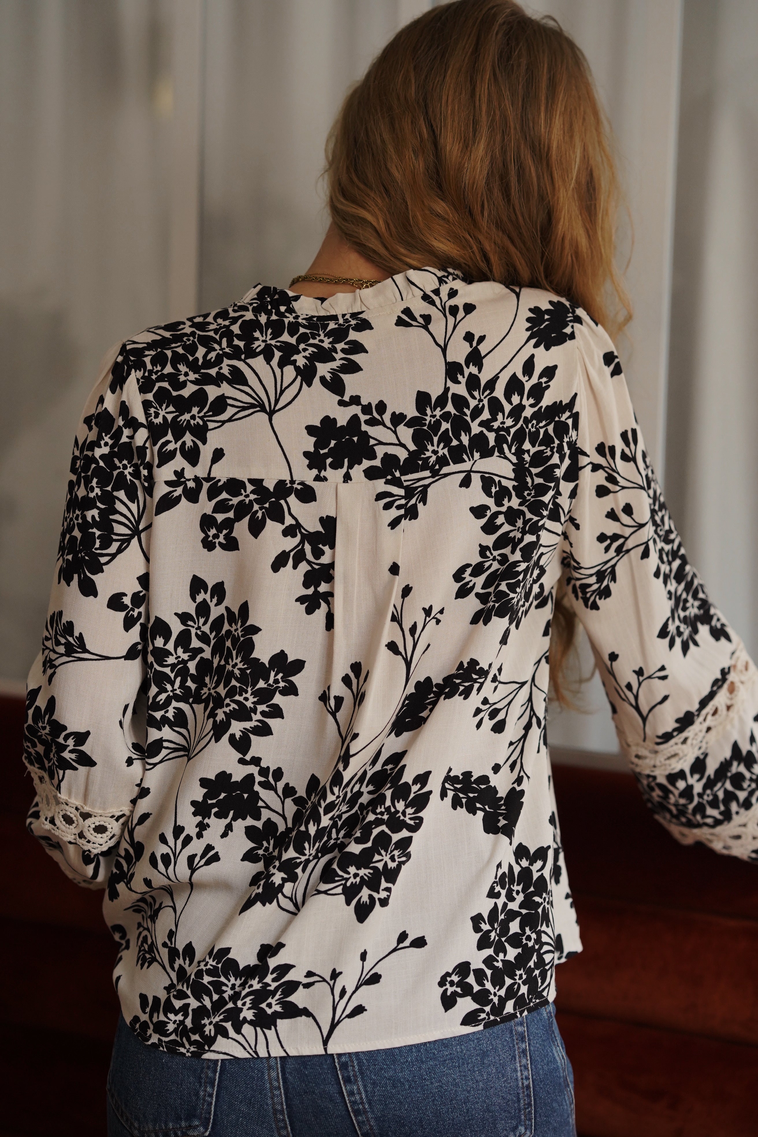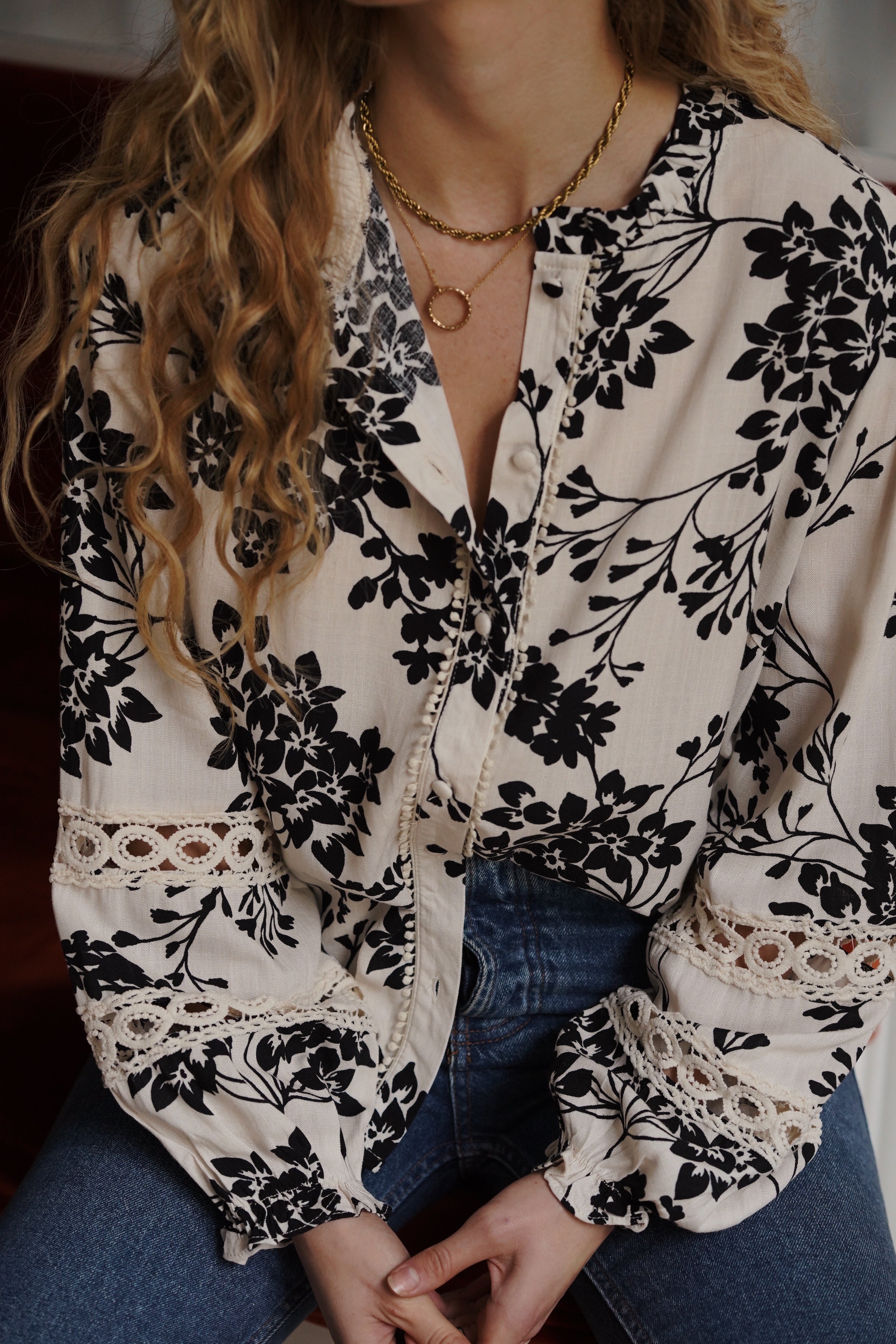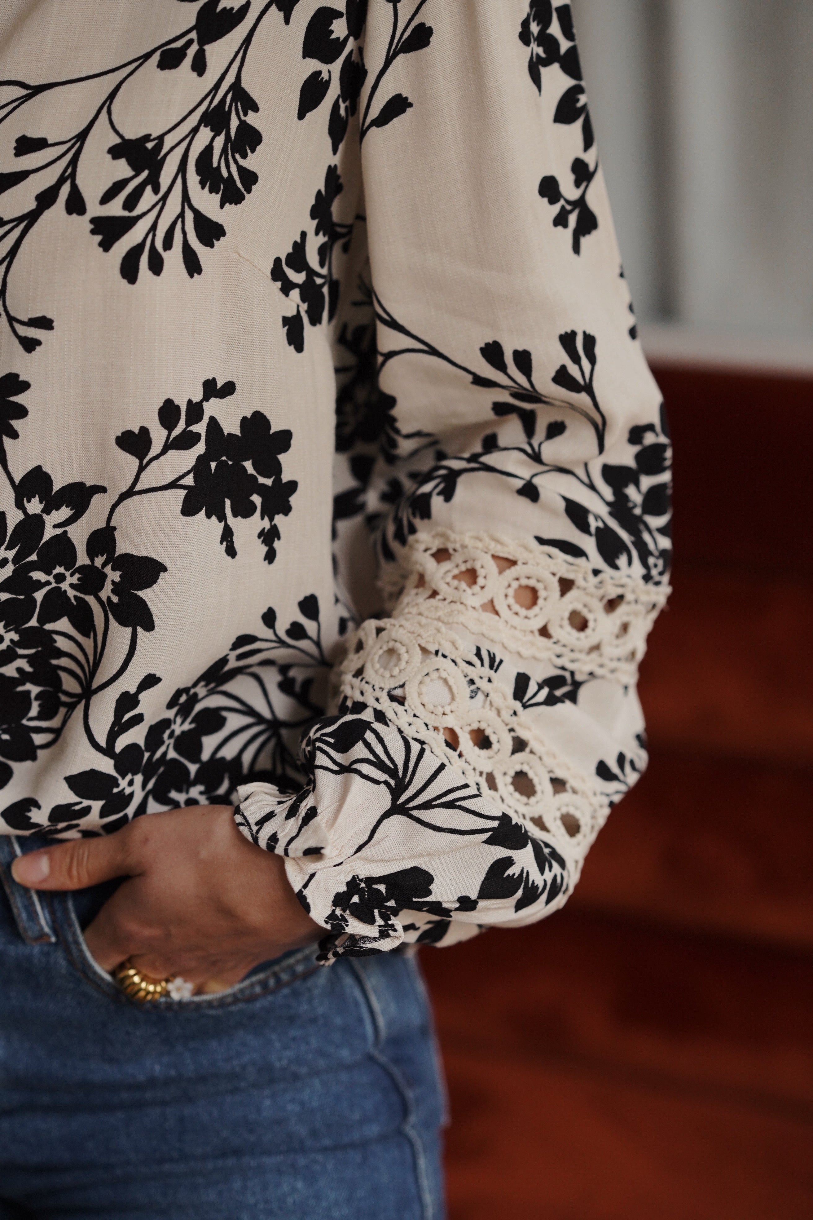 Manches longues avec broderies ajourées, poignets élastiqués et col froncé.