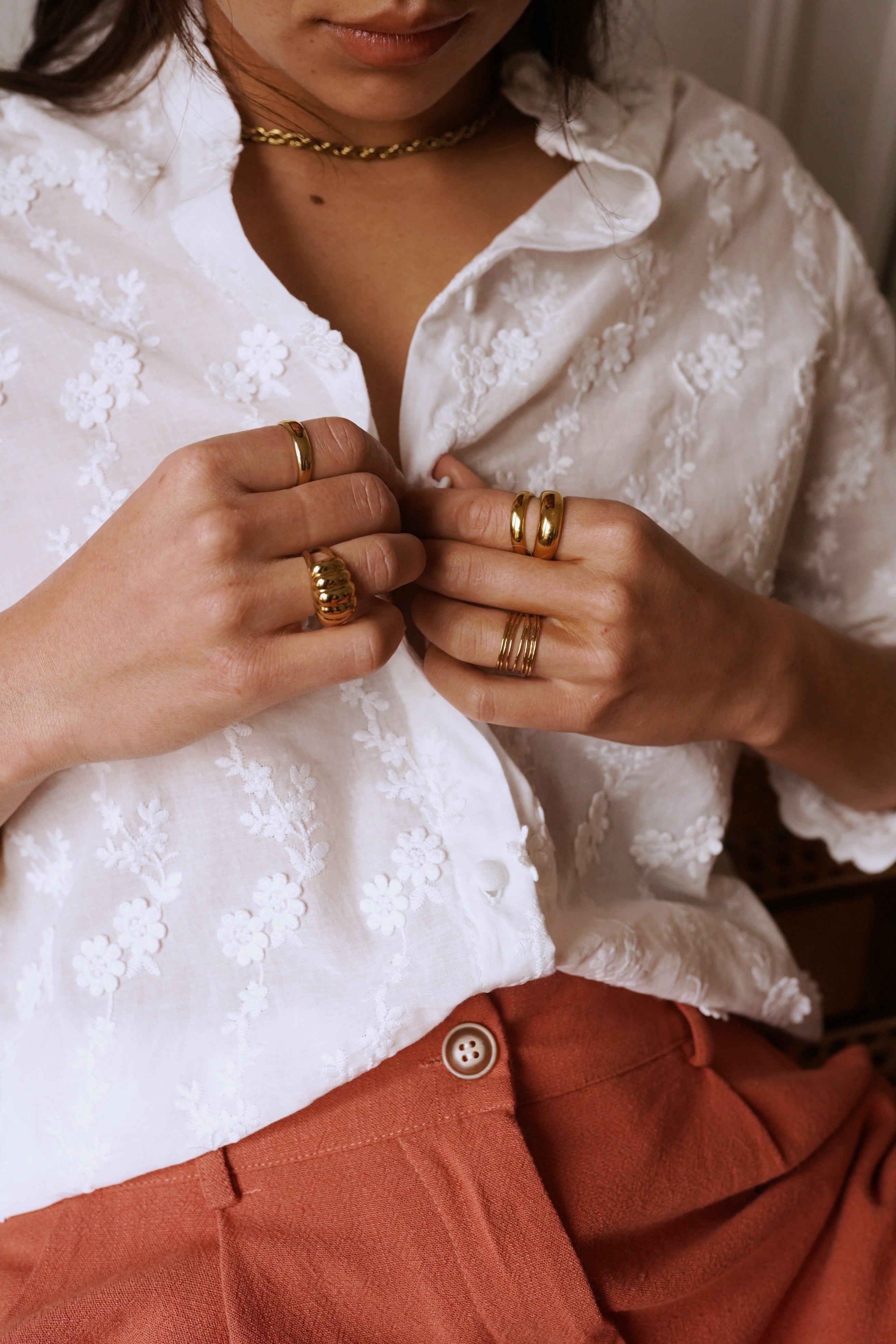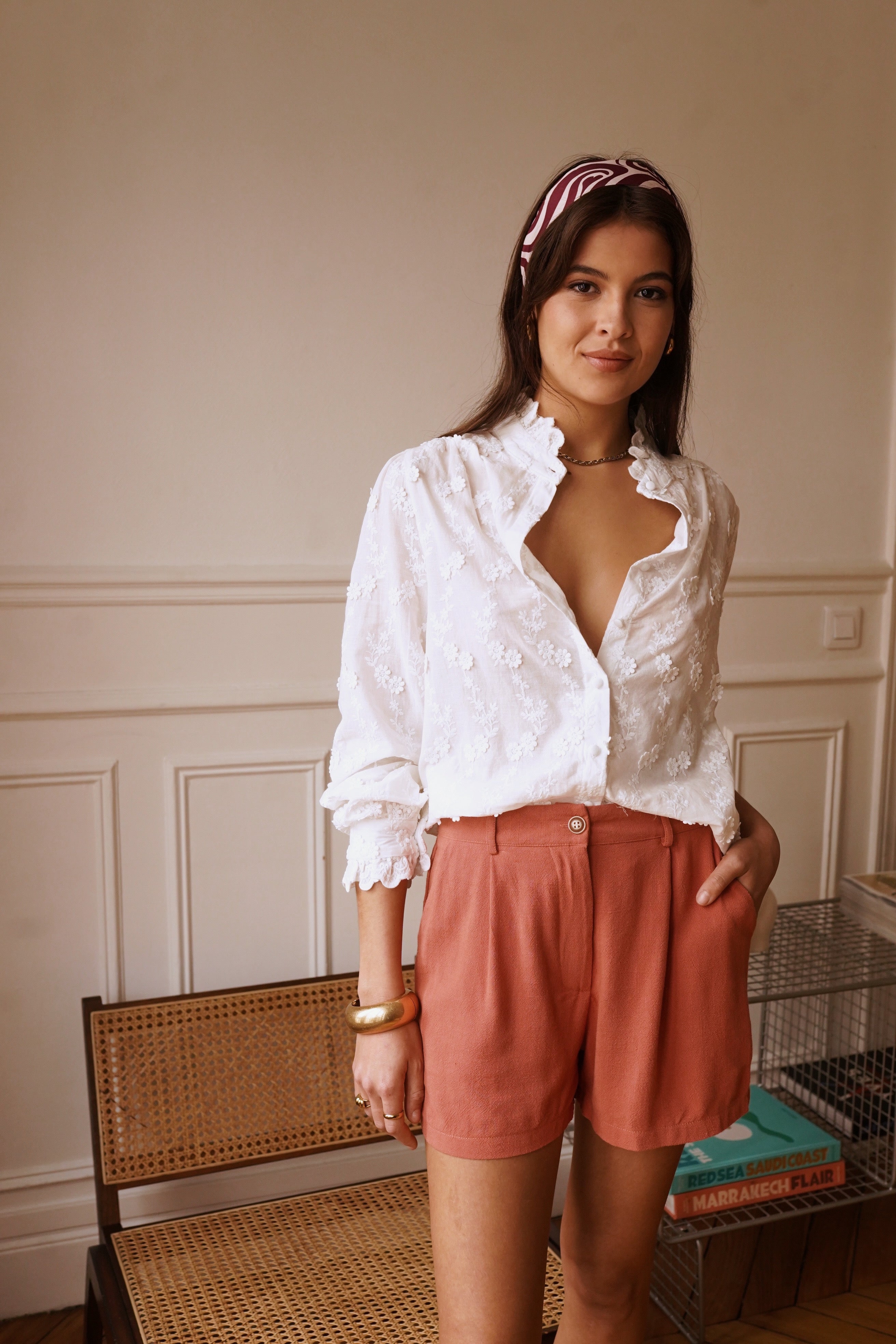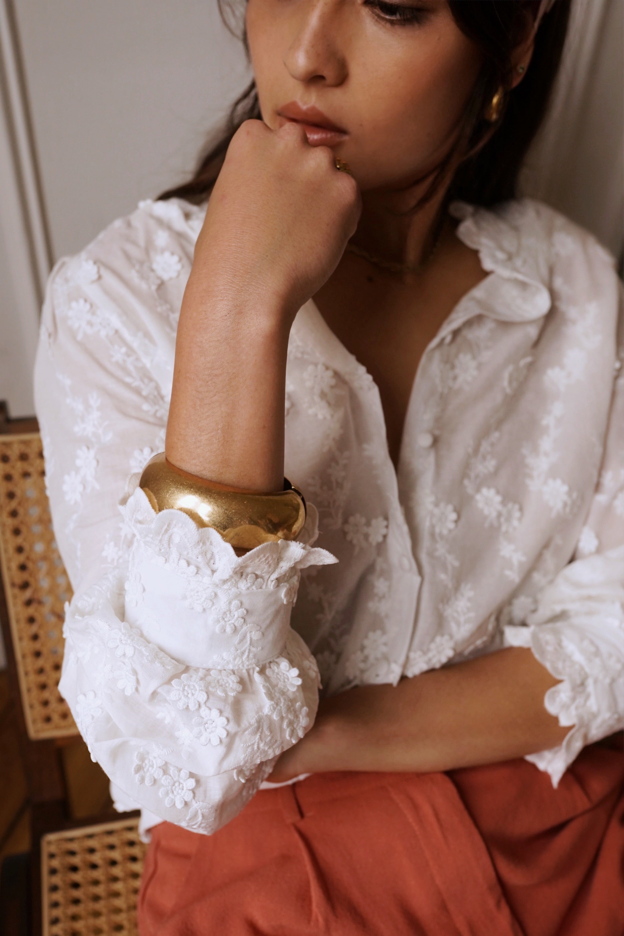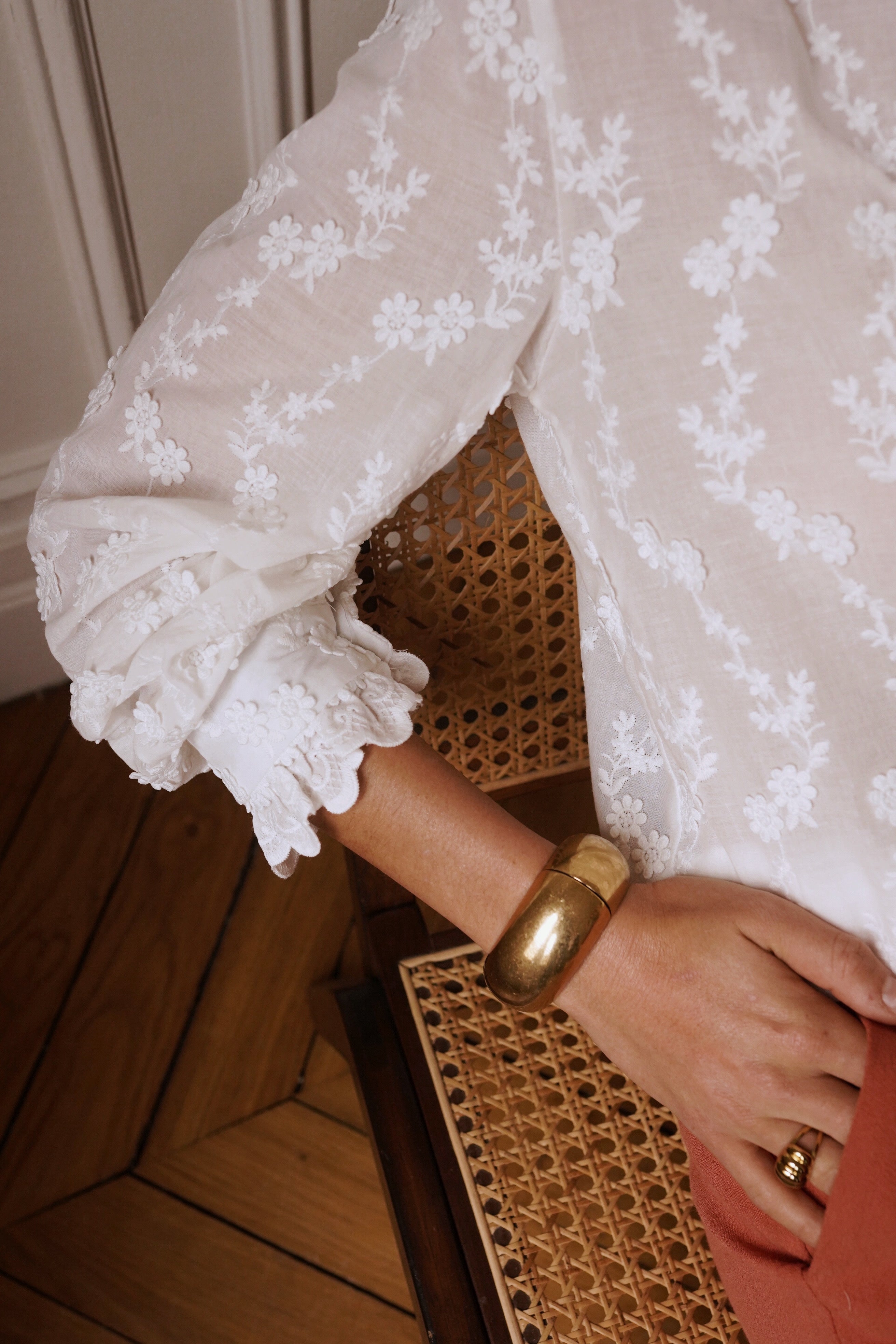 Apportez une touche de délicatesse à votre garde-robe avec cette superbe chemise blanche ornée de broderies raffinées. Son design intemporel allie féminité et élégance, parfait pour un look à la fois chic et décontracté.