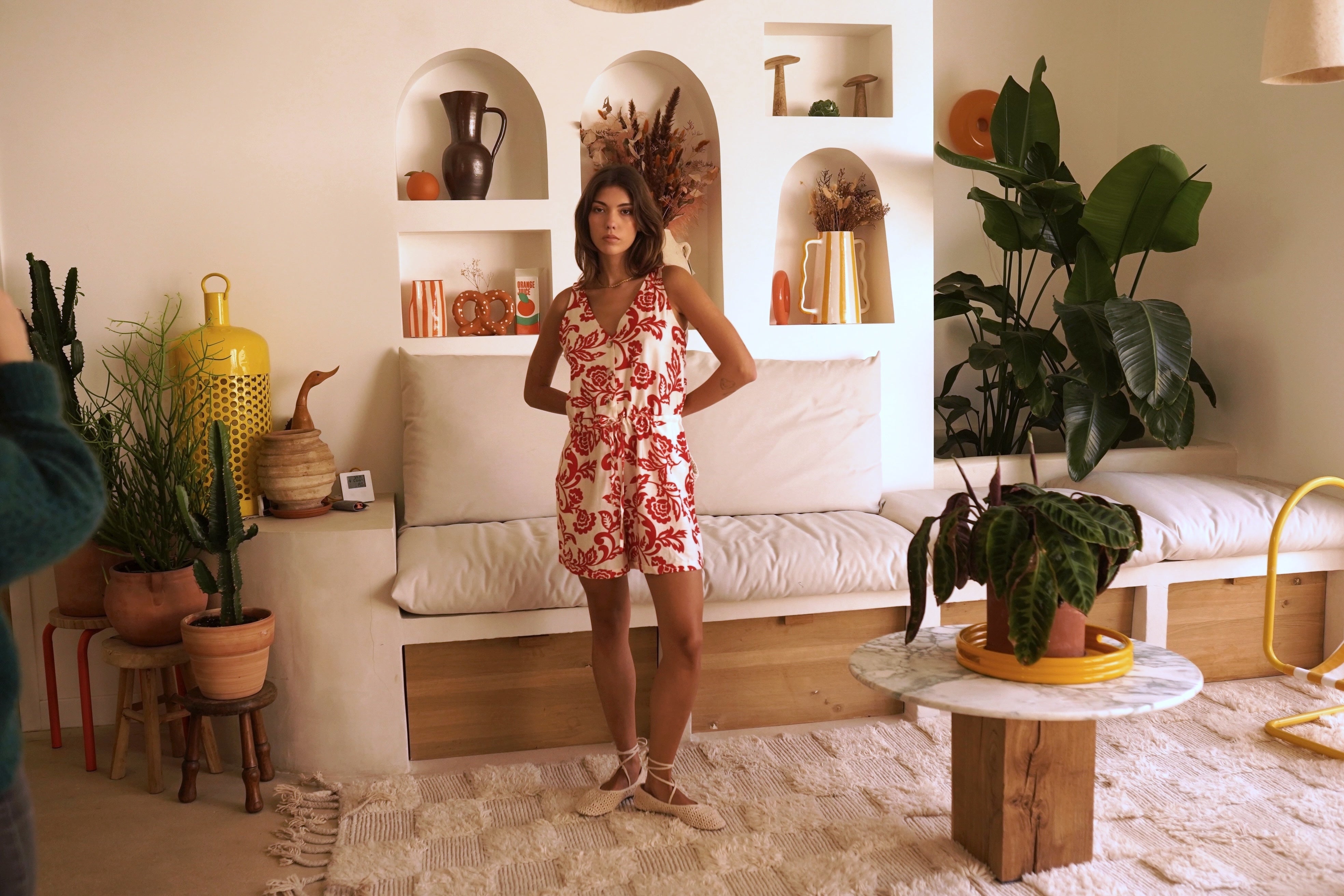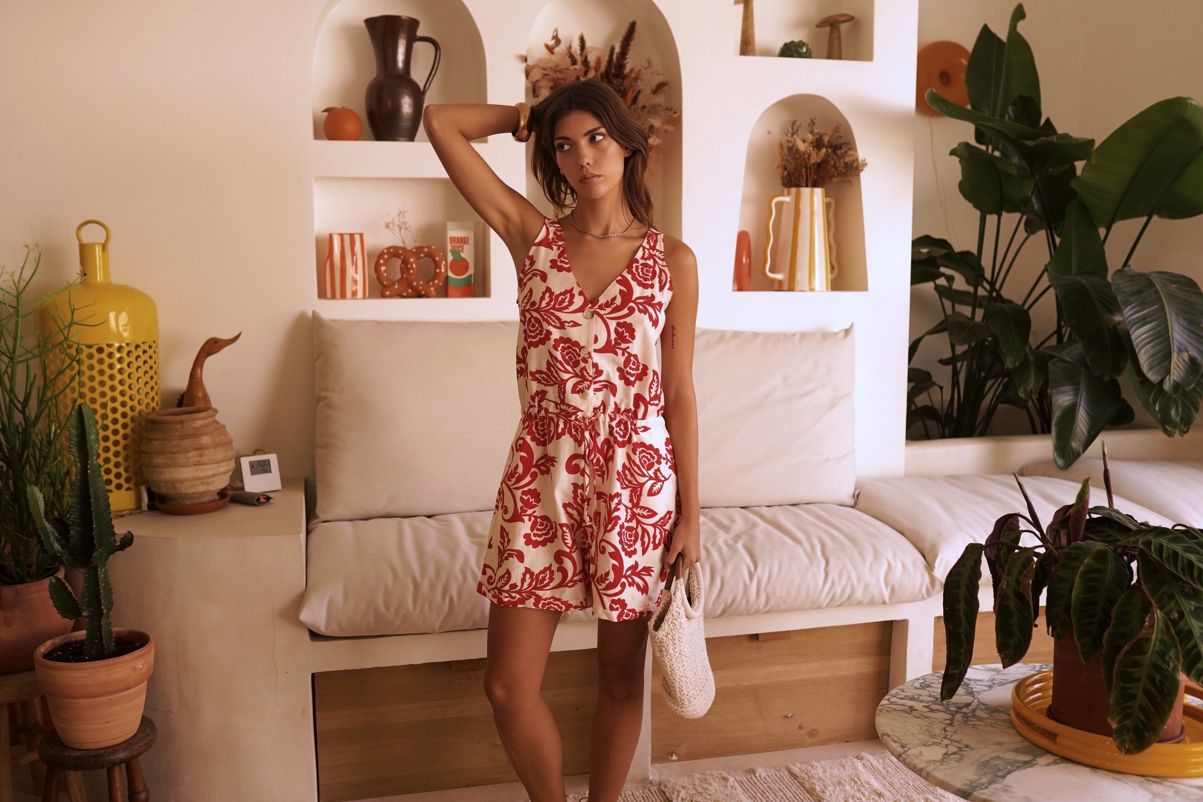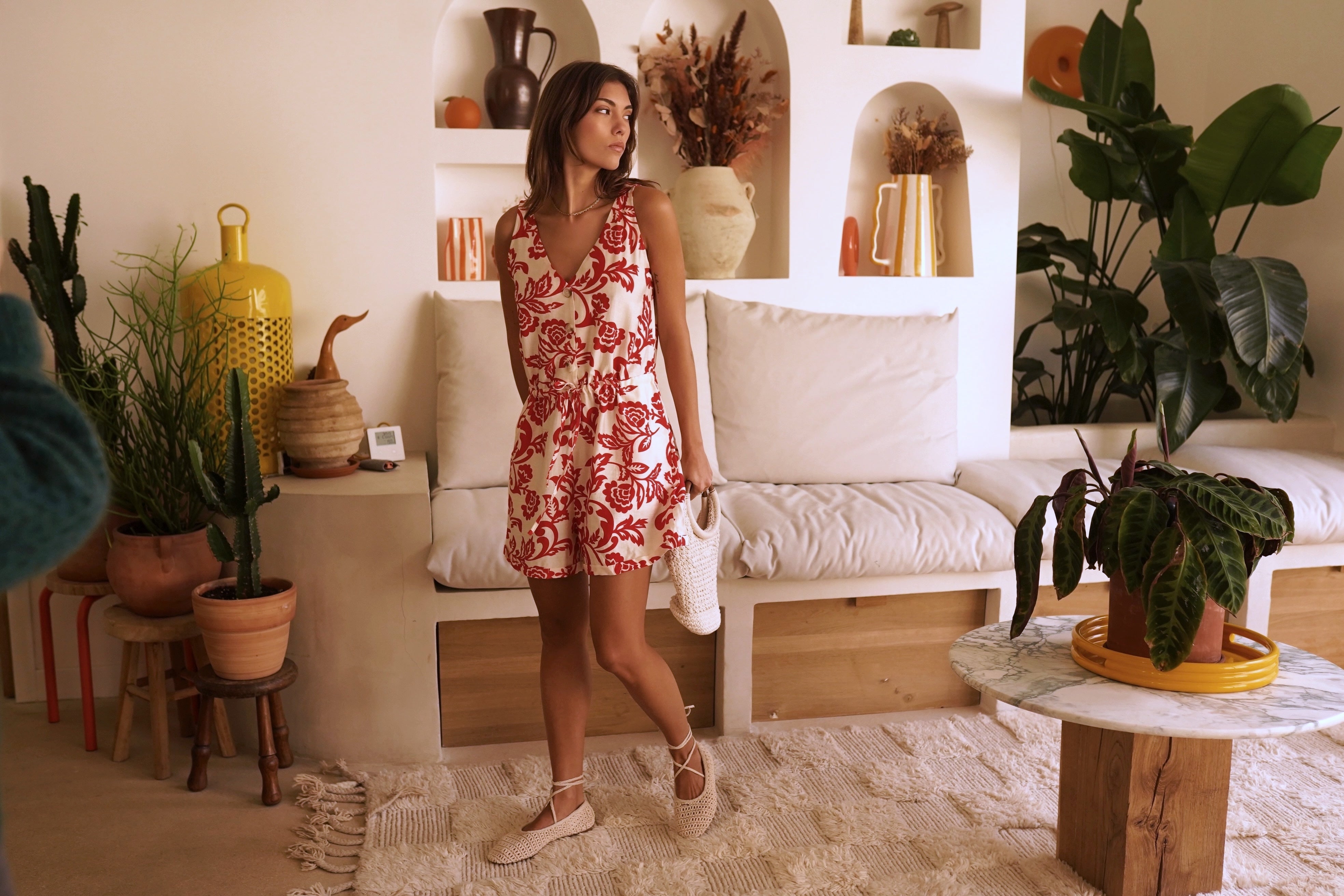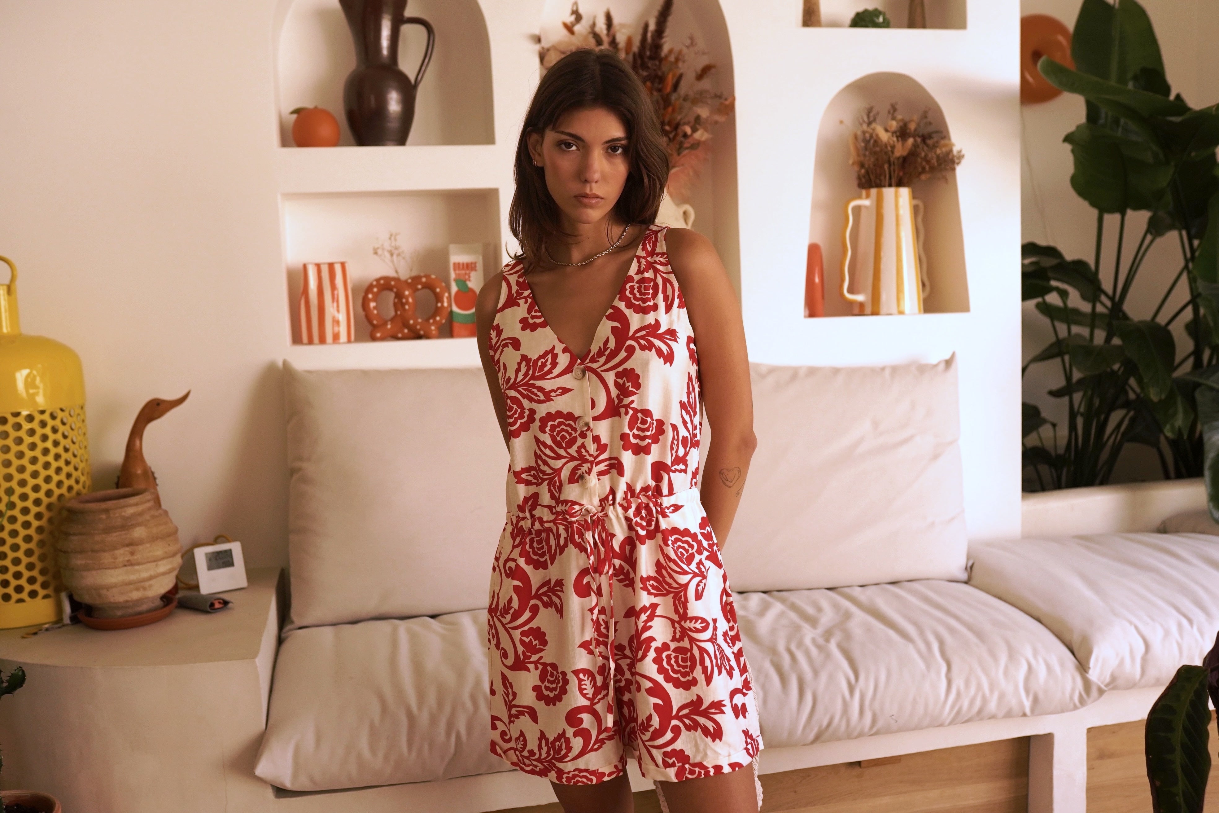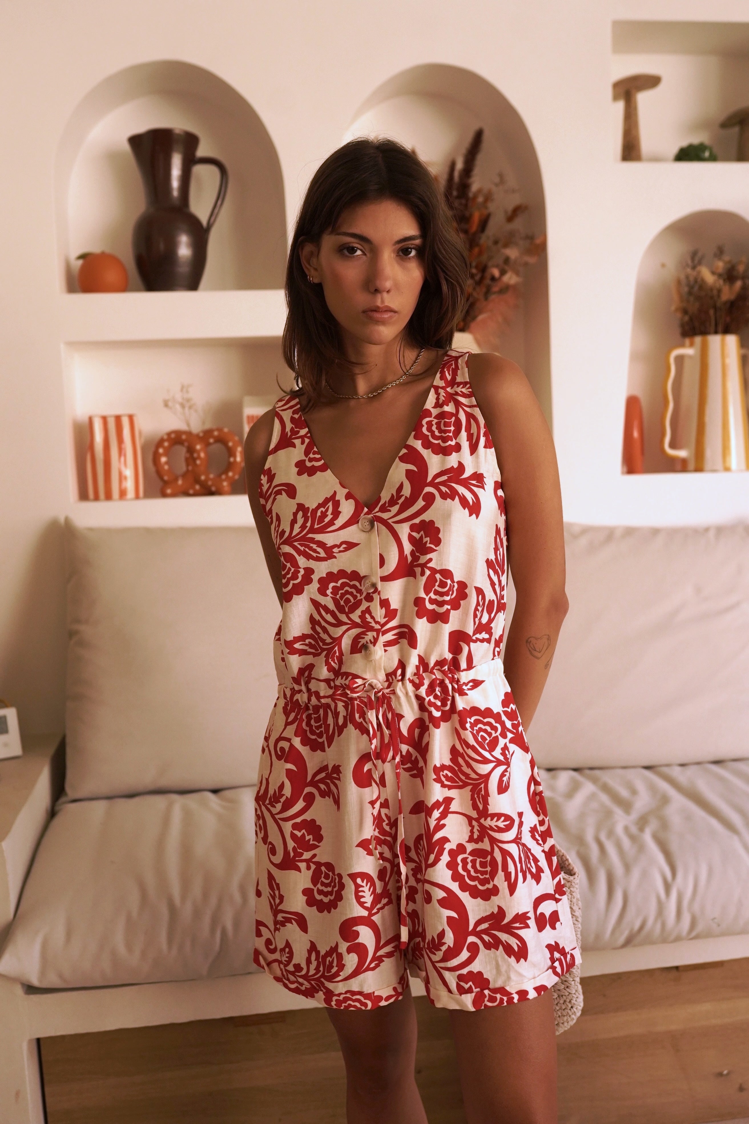 Combi-short en tissu fluide, imprimé rouge et blanc au motif floral. Coupe décontractée avec un décolleté cache-cœur et taille élastique pour un ajustement confortable. Idéal pour une allure estivale chic et décontractée.