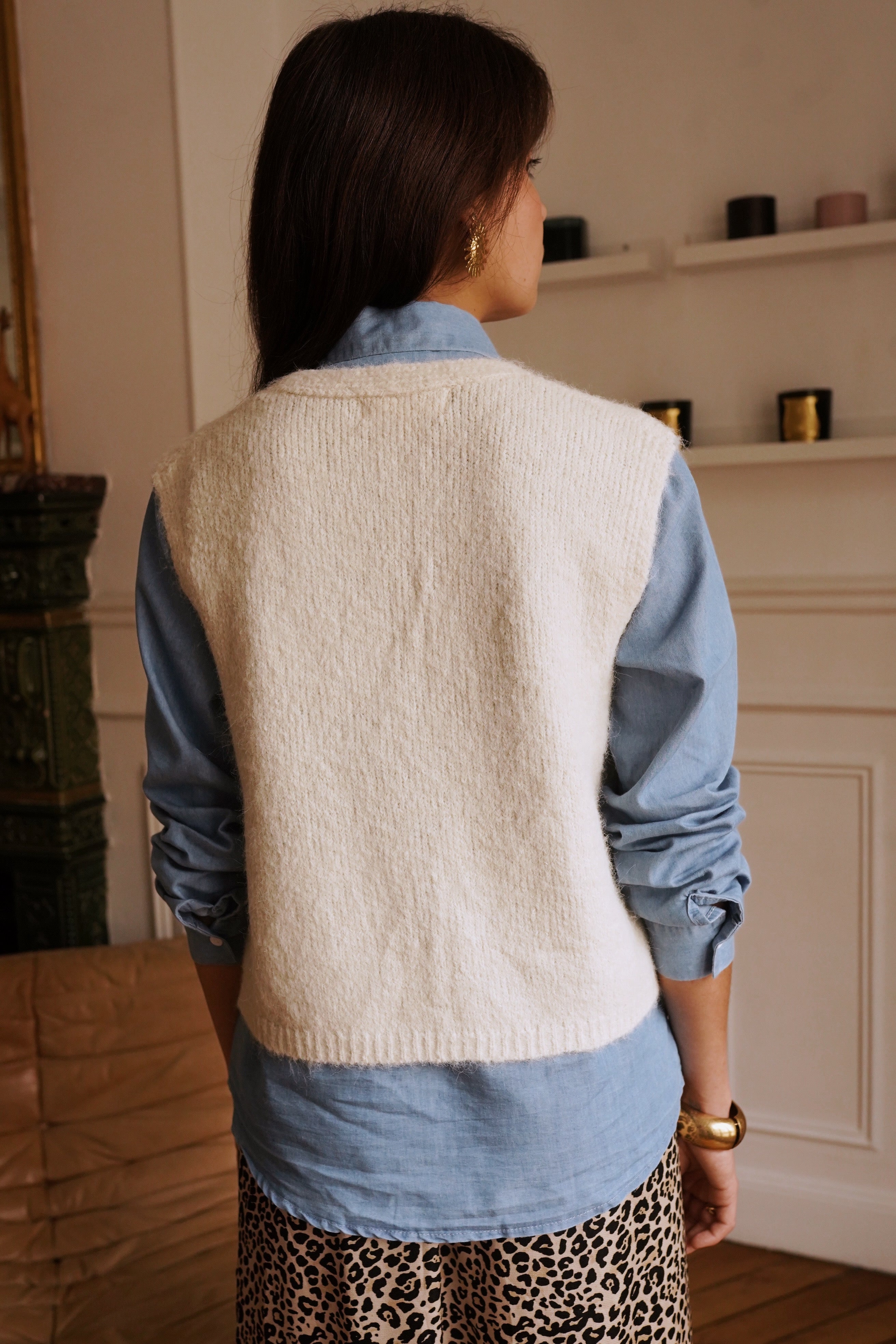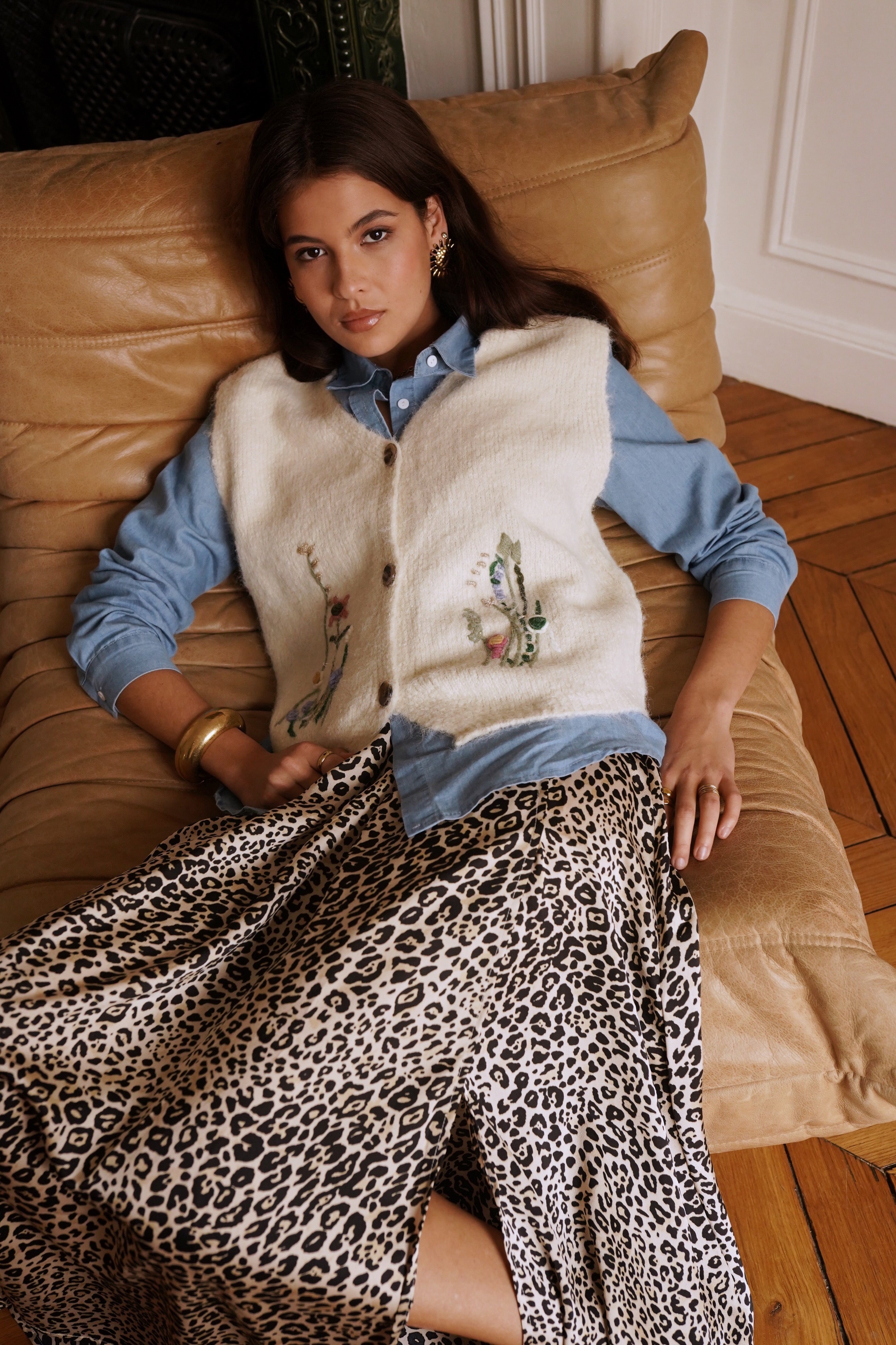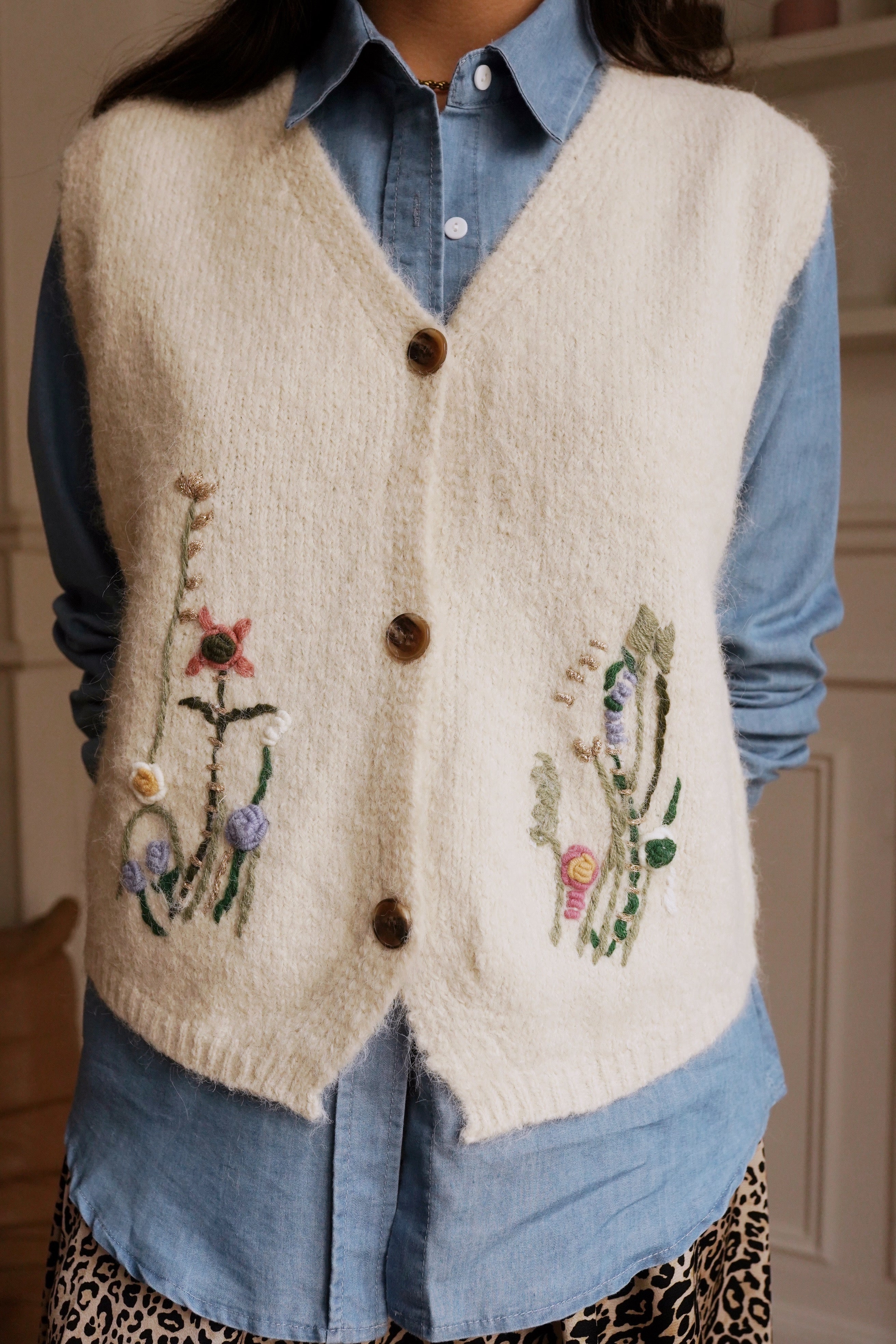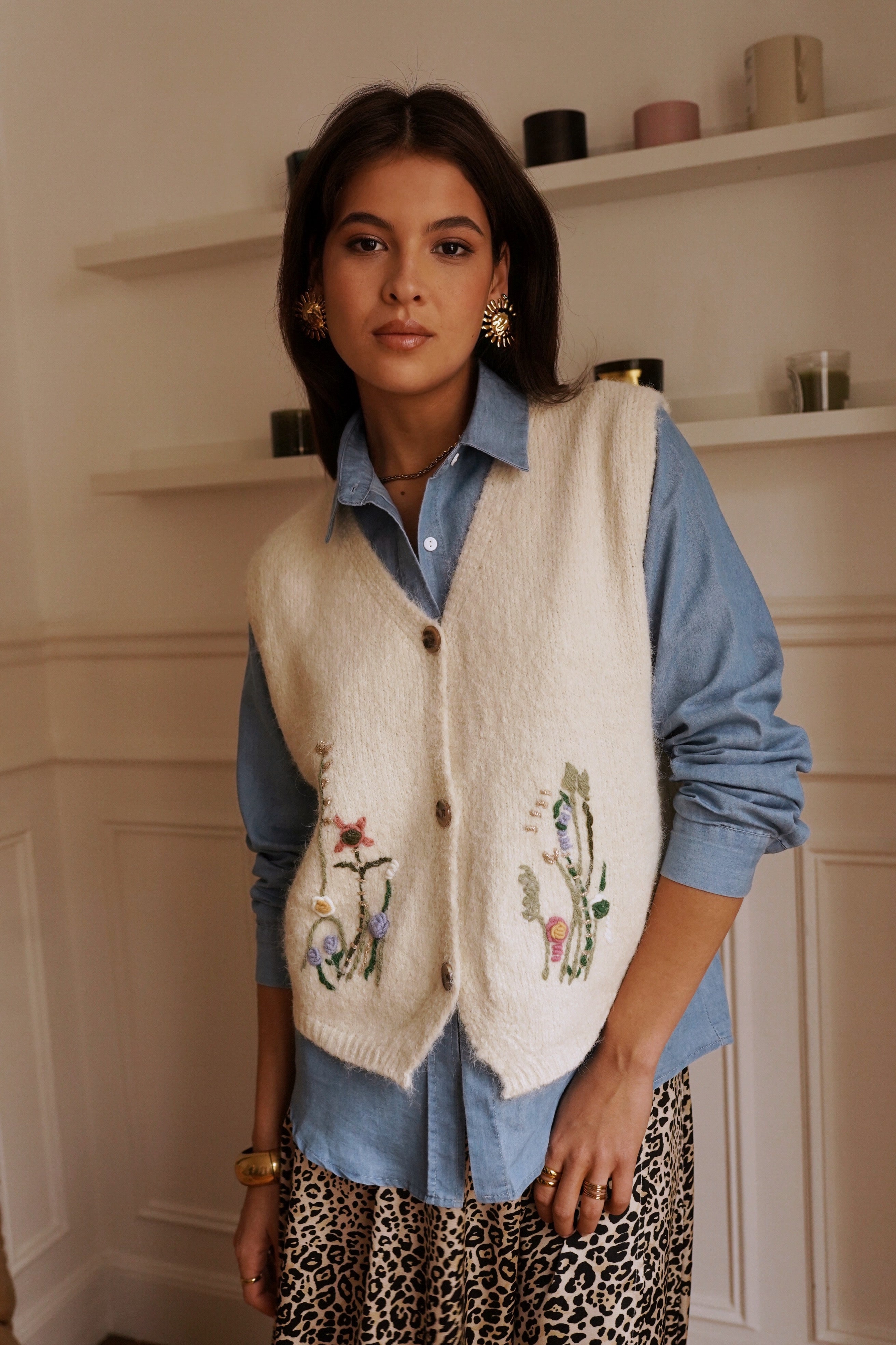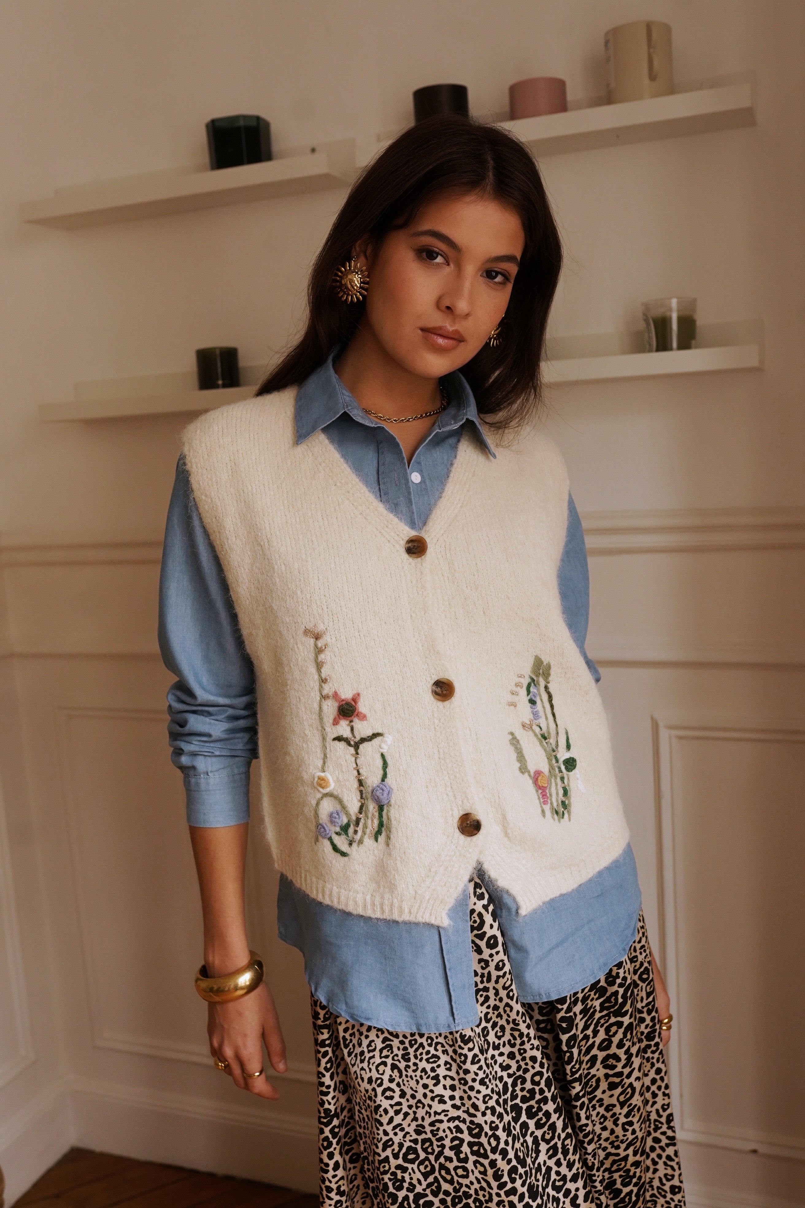 Alliant confort et raffinement, ce gilet est un indispensable pour les journées fraîches. Son design classique à boutons sur l’avant est sublimé par de délicates broderies, ajoutant une touche d’élégance et d’originalité. Doux et chaud, il se porte aussi bien sur une tenue décontractée que sur une robe pour un look cosy et sophistiqué.