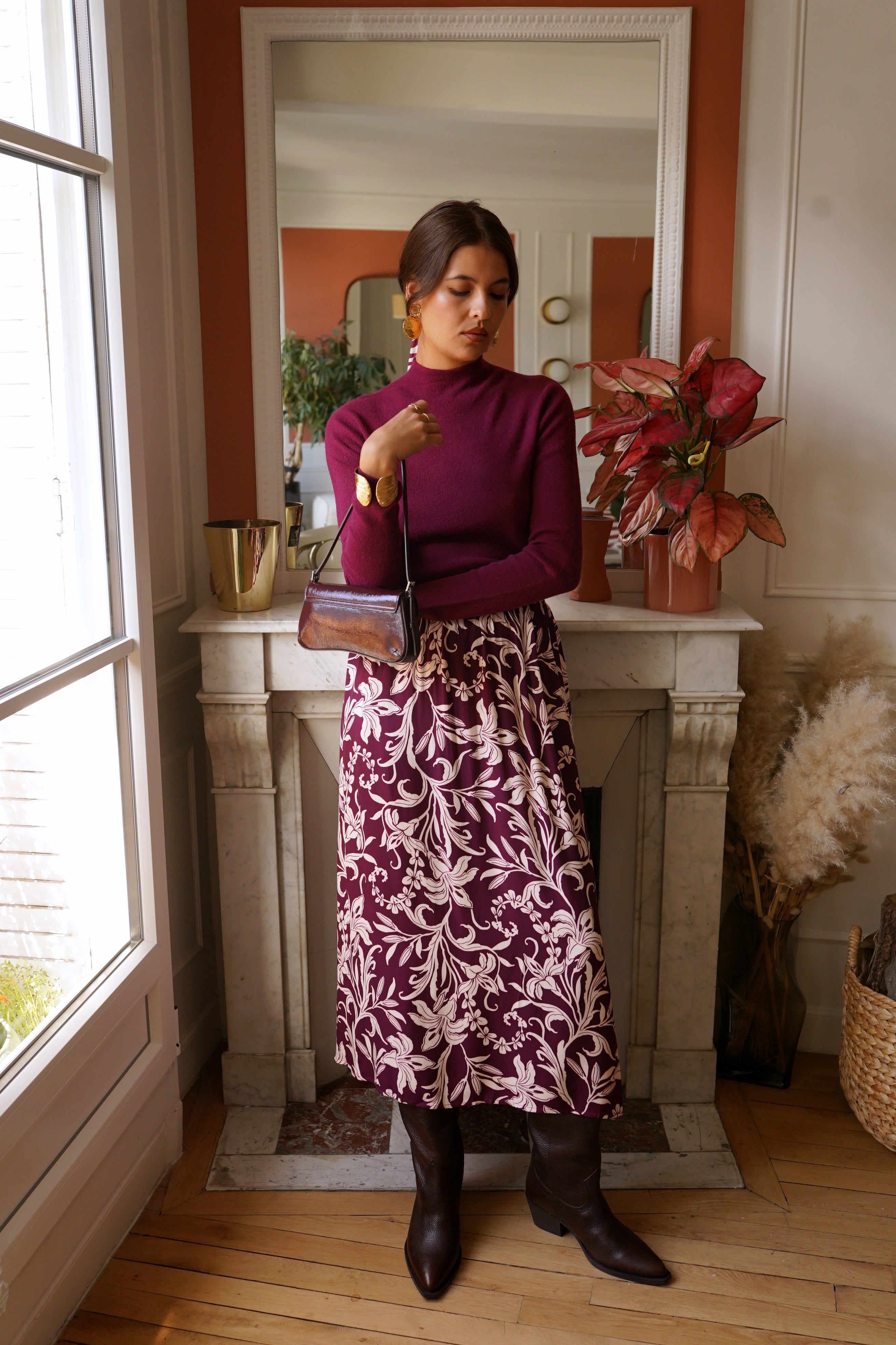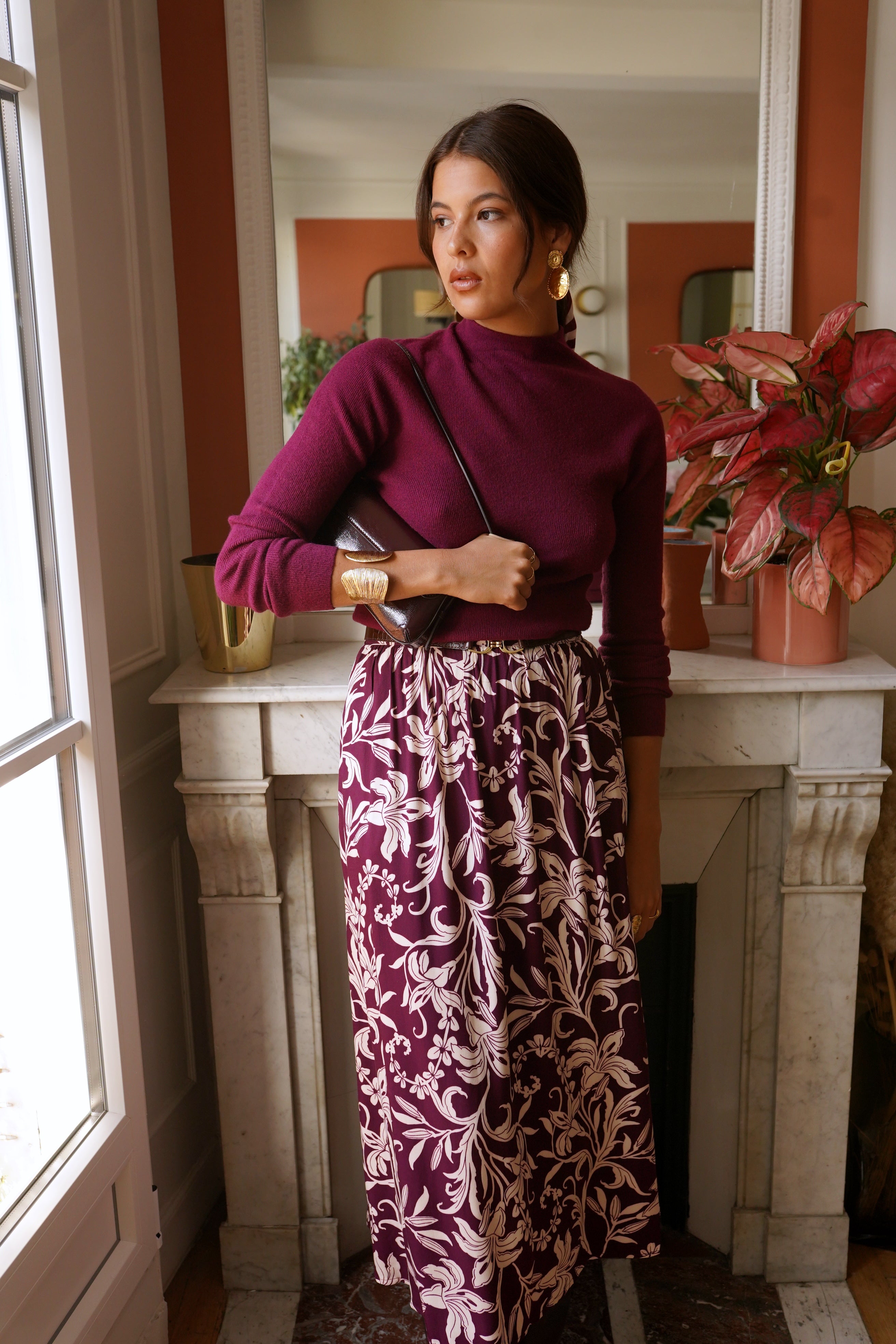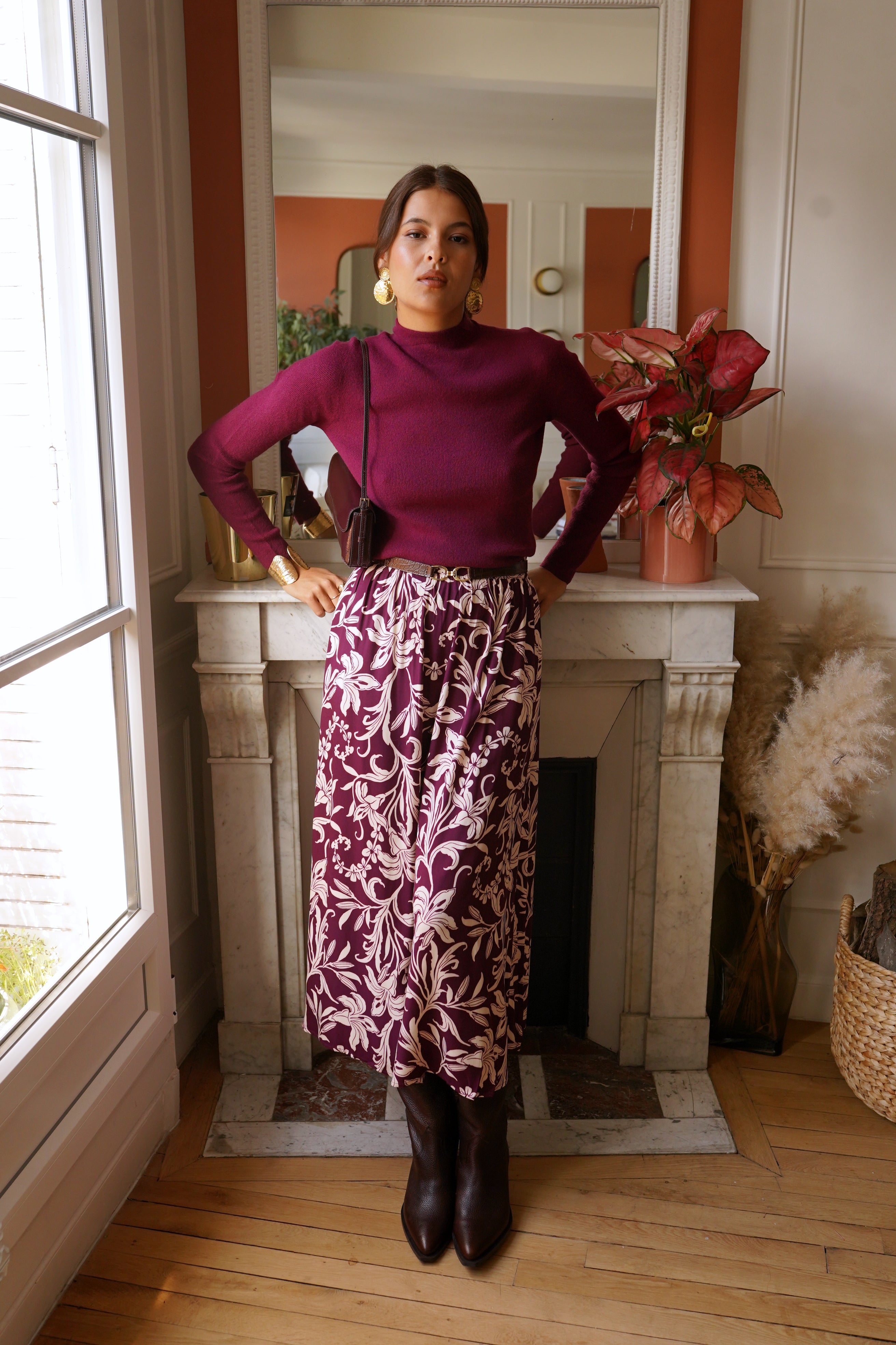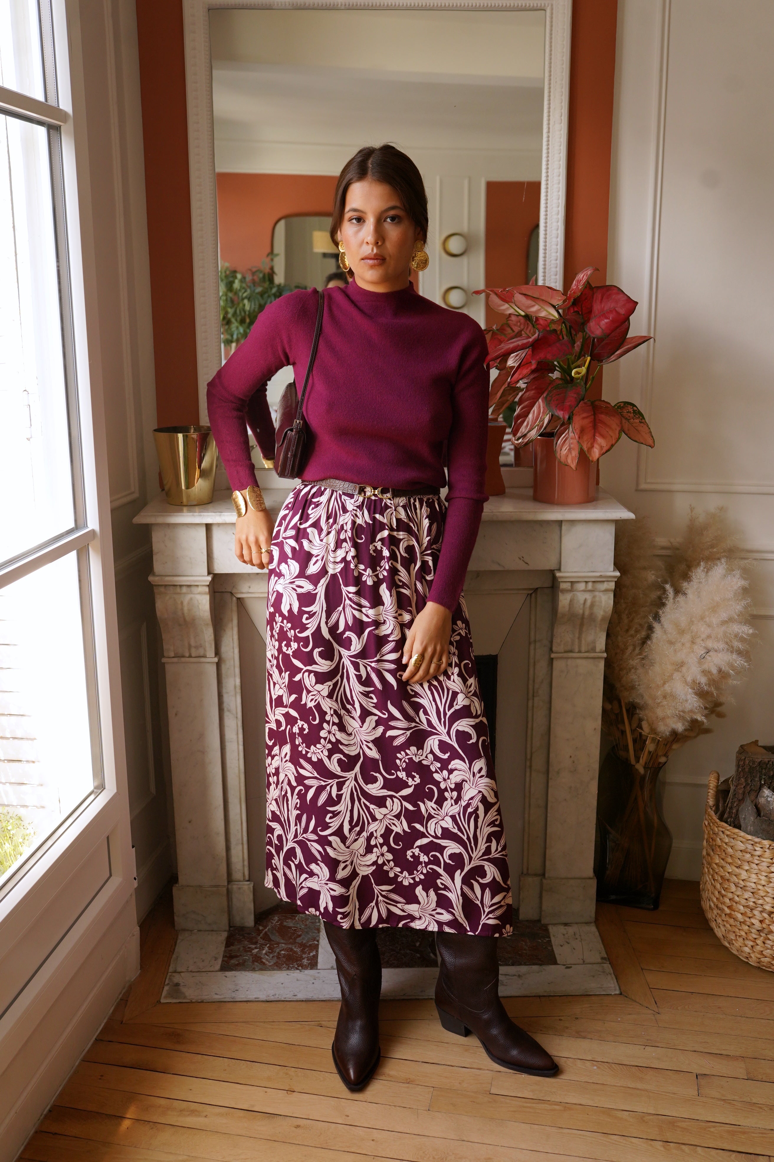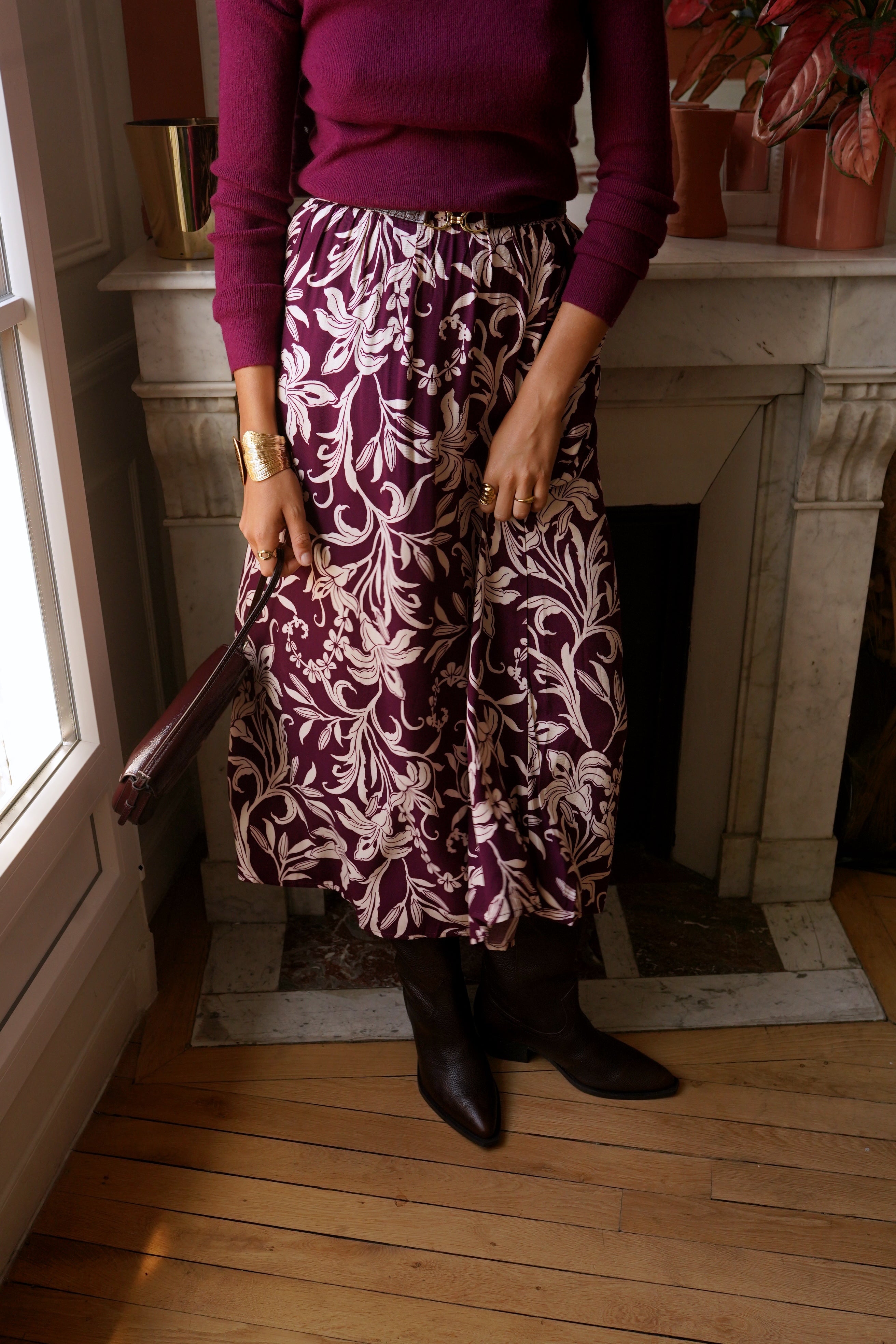 Avec son imprimé floral contrasté sur fond prune intense, la jupe Aisley incarne un style sophistiqué et audacieux. Sa coupe fluide et légèrement évasée épouse les mouvements, créant une allure féminine et affirmée. La taille ceinturée souligne la silhouette, tandis que la longueur midi offre l’équilibre parfait entre modernité et raffinement.