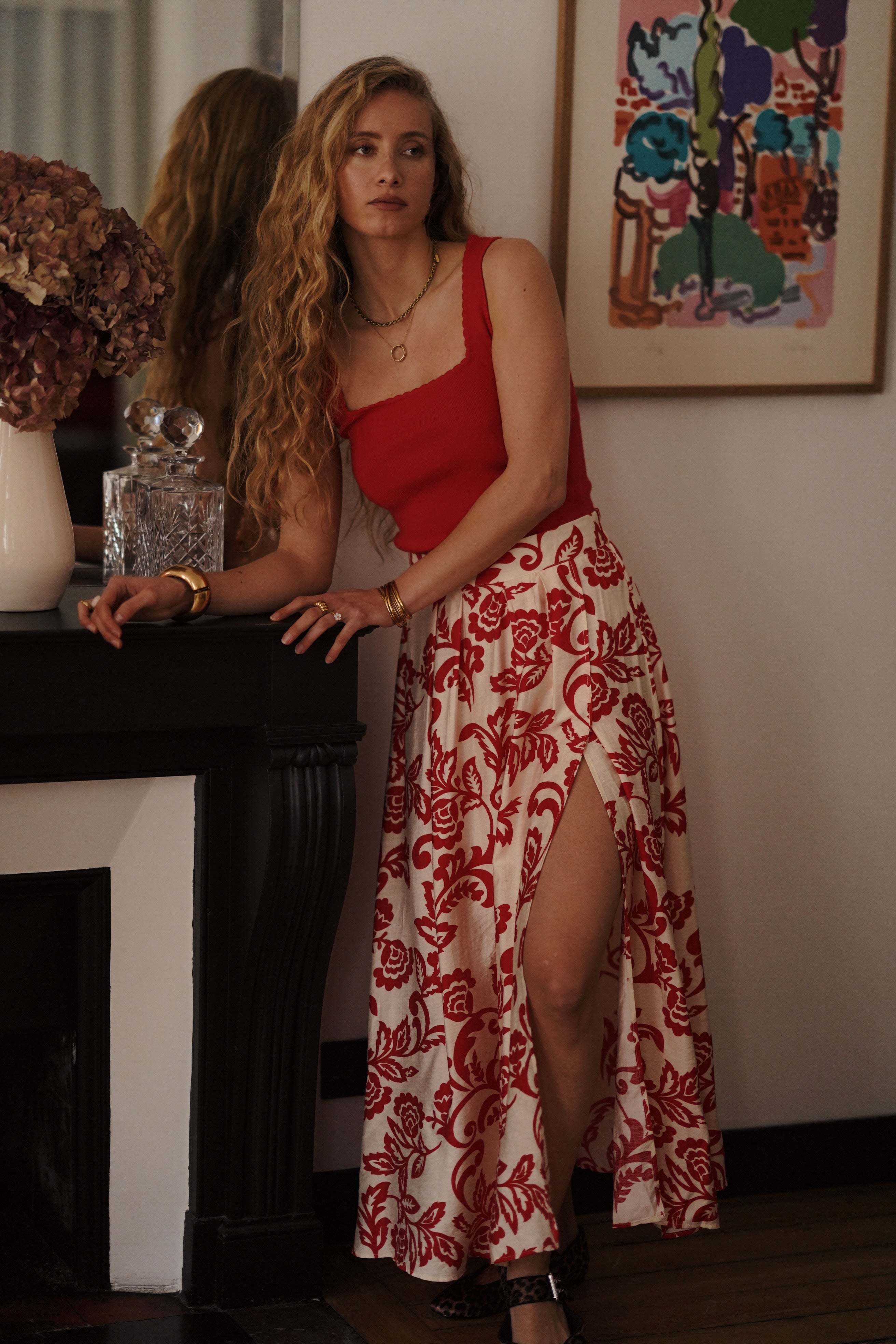 Des plis partant de la taille lui donne un beau volume évasé, fendue sur le coté.