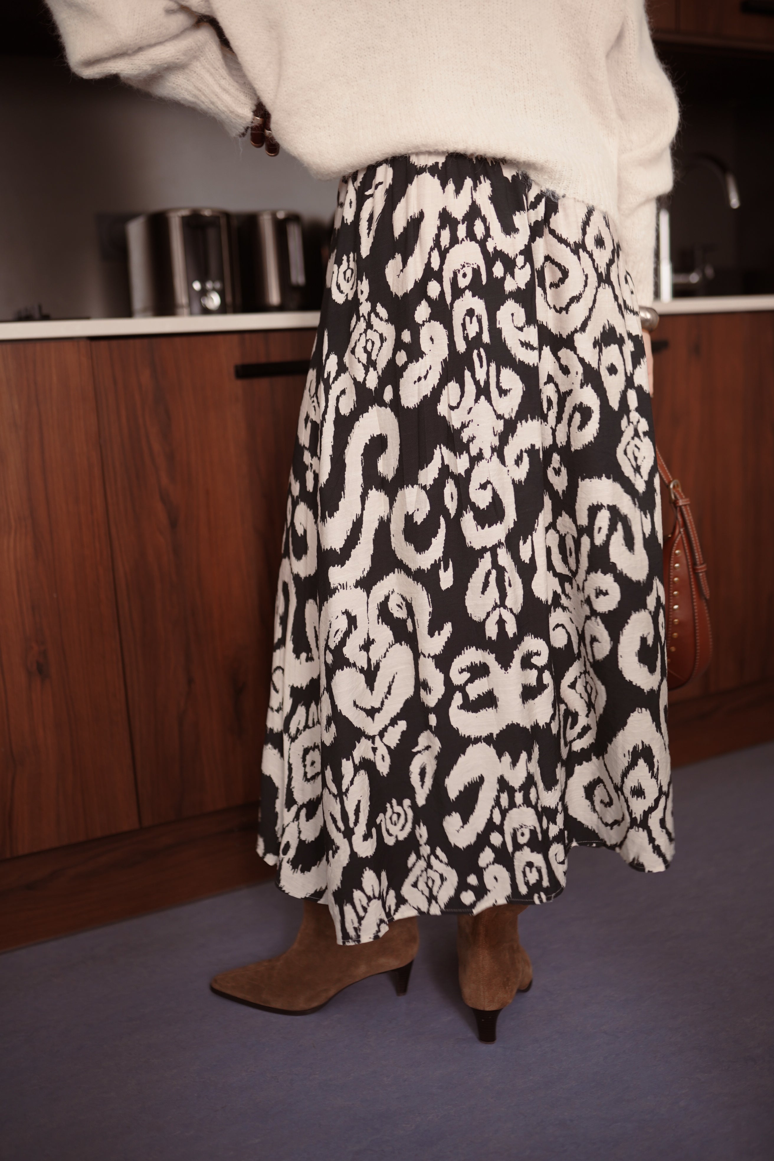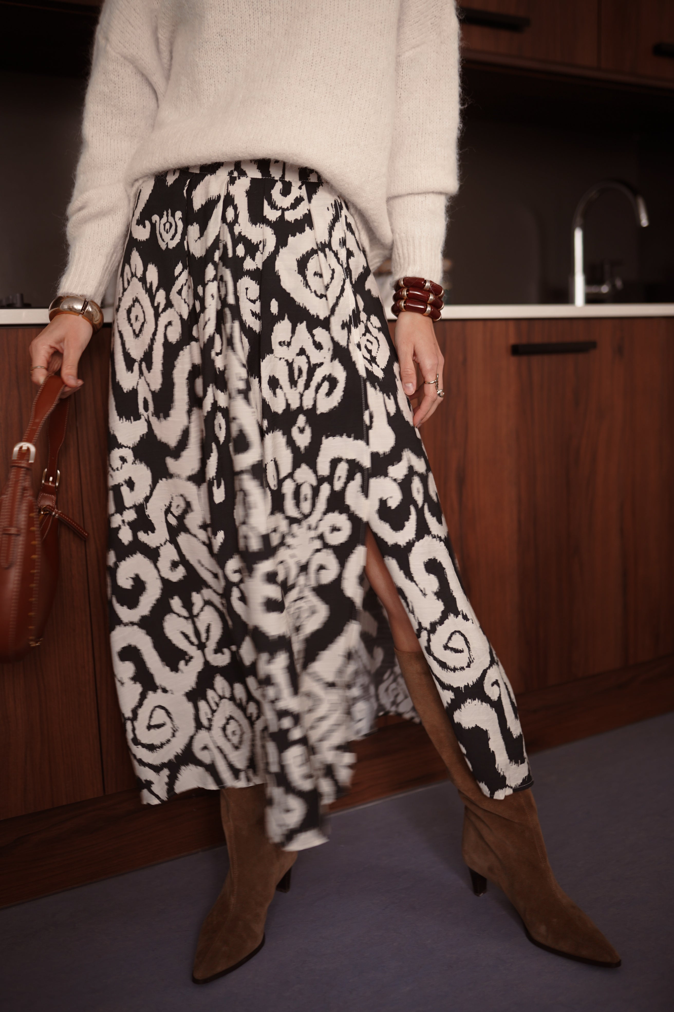 La jupe Sirine imprime une allure forte avec son motif noir et écru au caractère affirmé. Une coupe fluide, une fente subtile et un tombé élégant : la jupe qui capte le mouvement et structure la silhouette sans effort.
