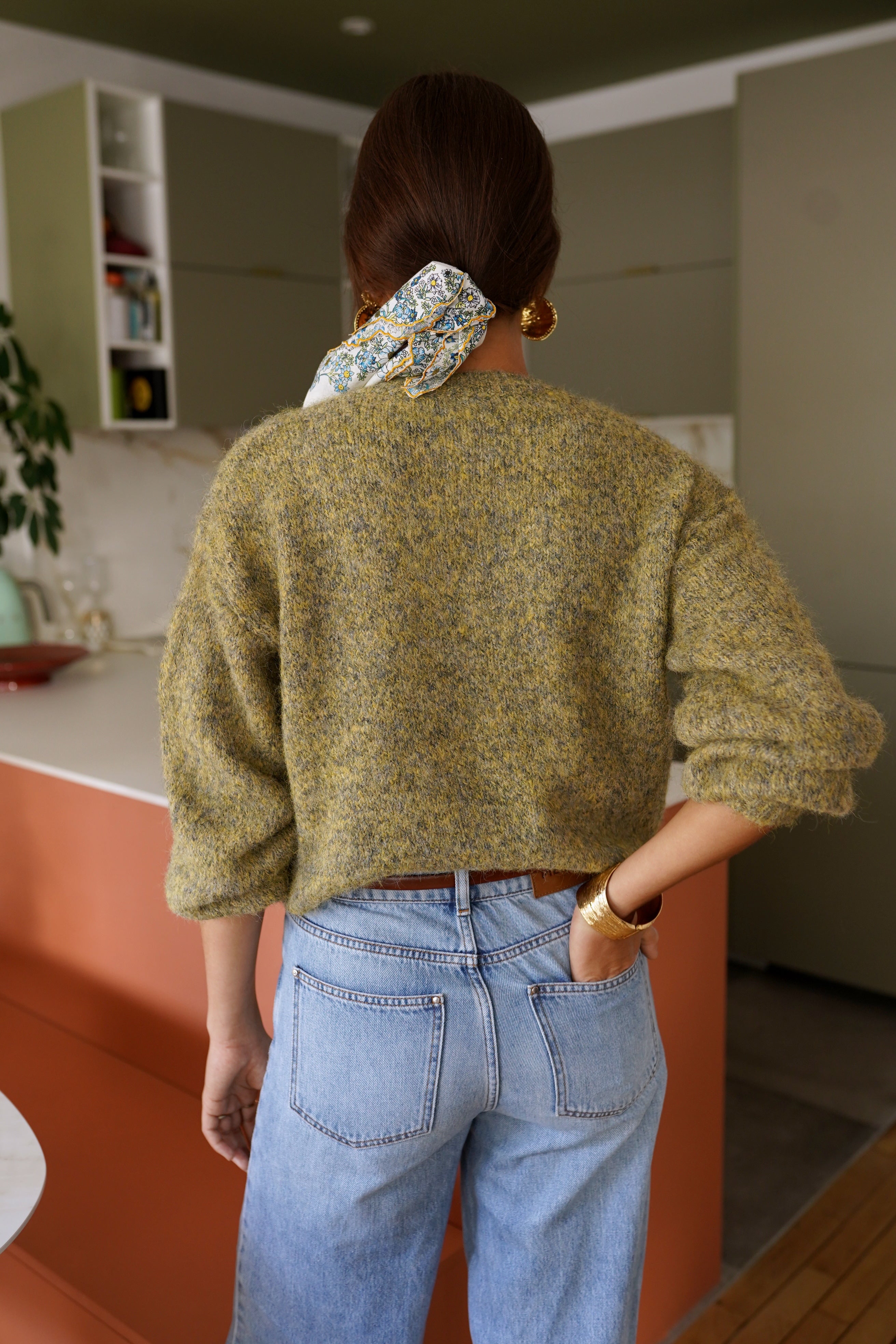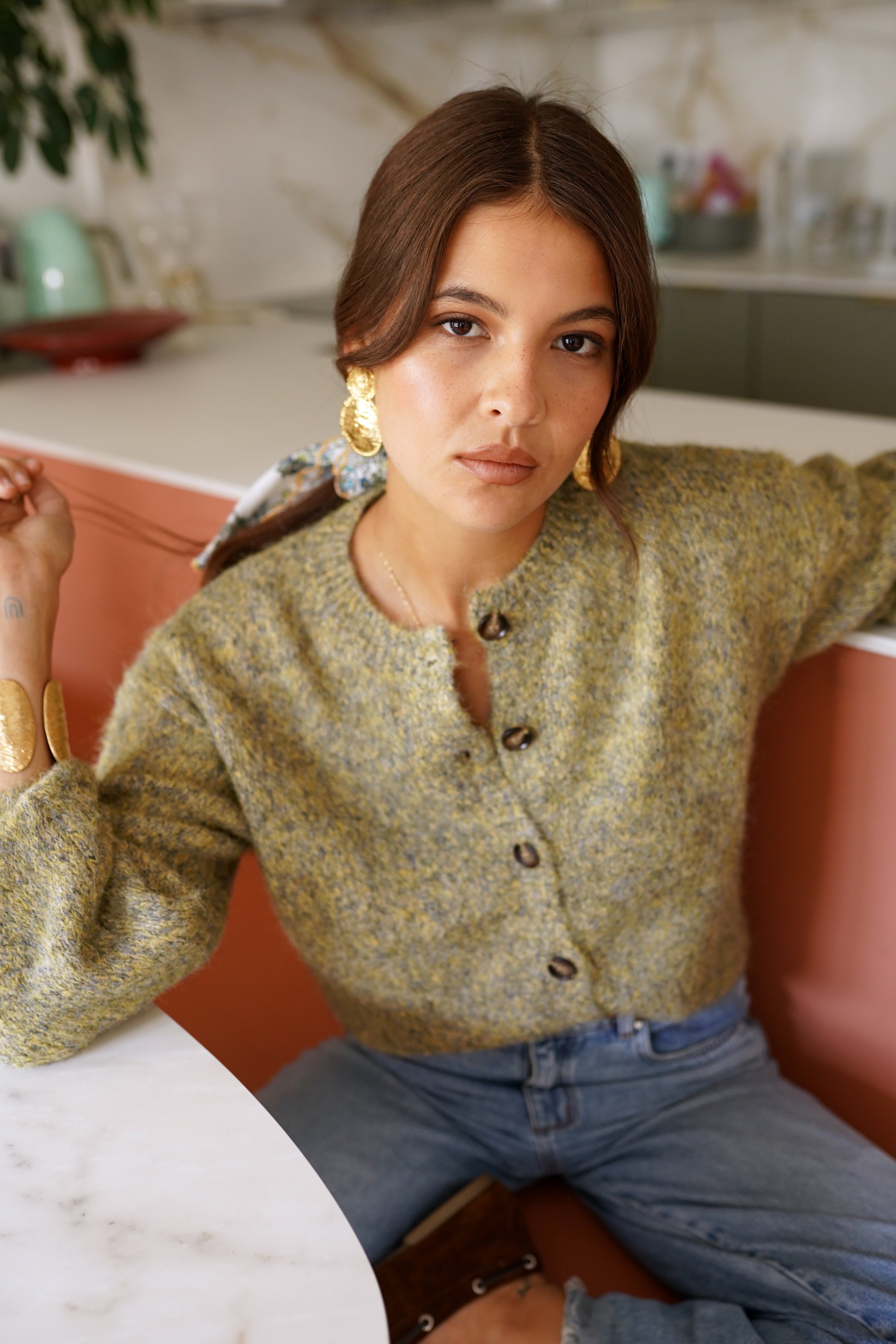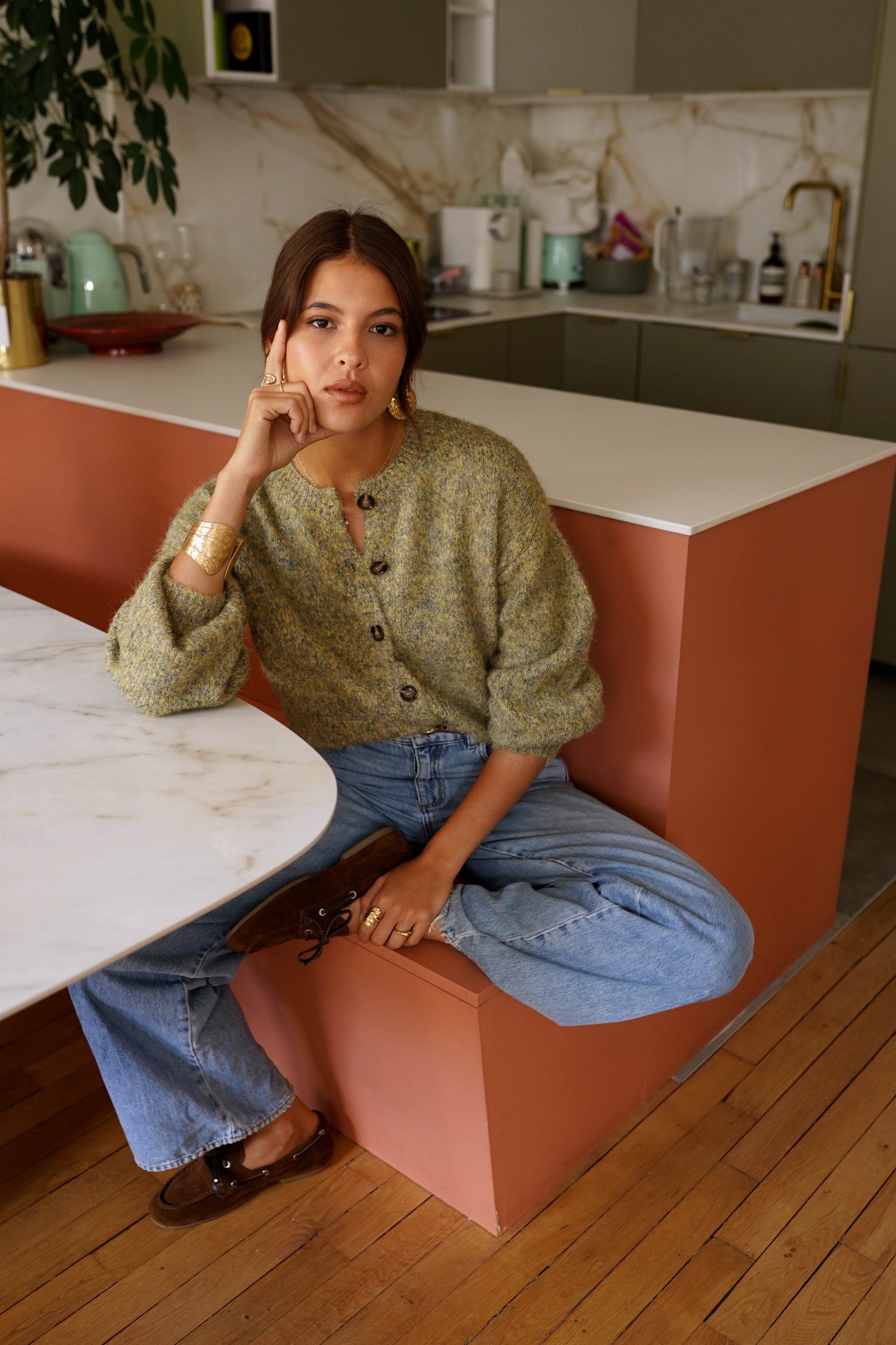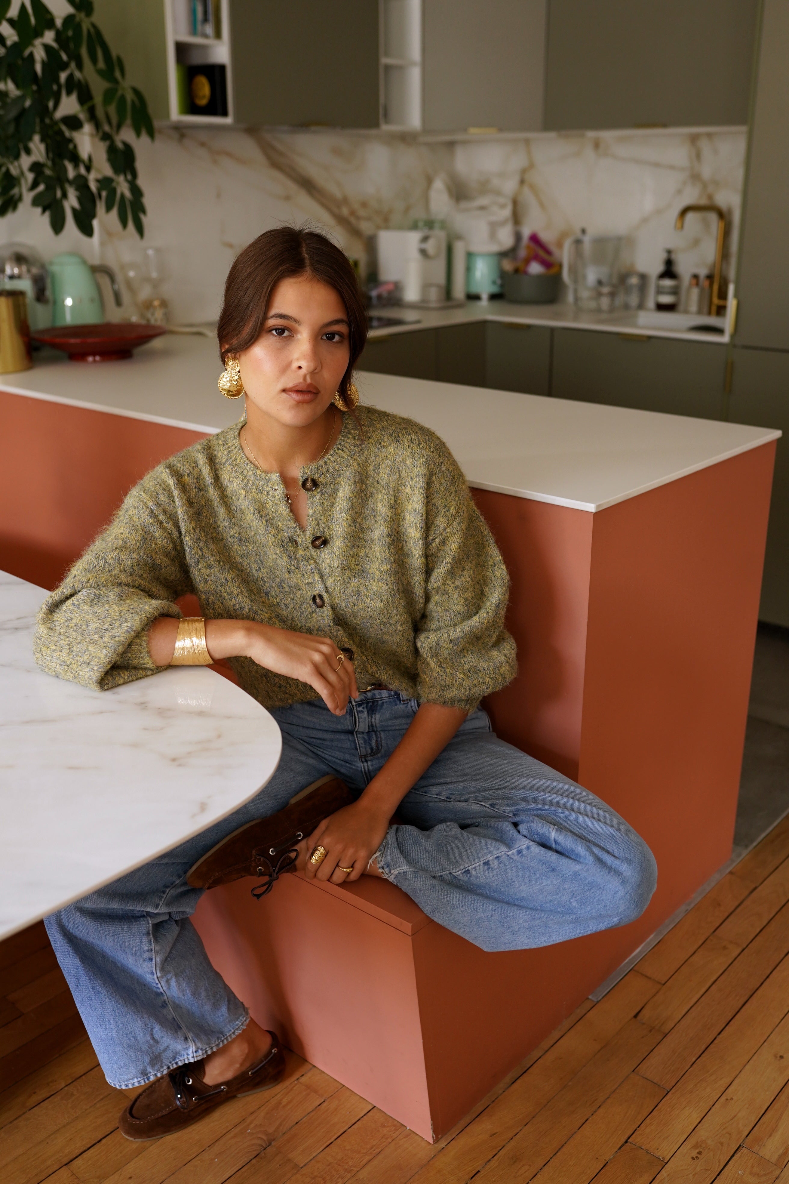 Avec sa coupe droite et ses boutons apparents, la maille Aris incarne l’élégance décontractée. Confectionnée dans une laine texturée aux nuances subtiles de vert chiné, elle réchauffe la silhouette tout en offrant un style unique. Ses manches légèrement bouffantes ajoutent du volume et une touche moderne, idéale pour twister un jean ou une jupe fluide.