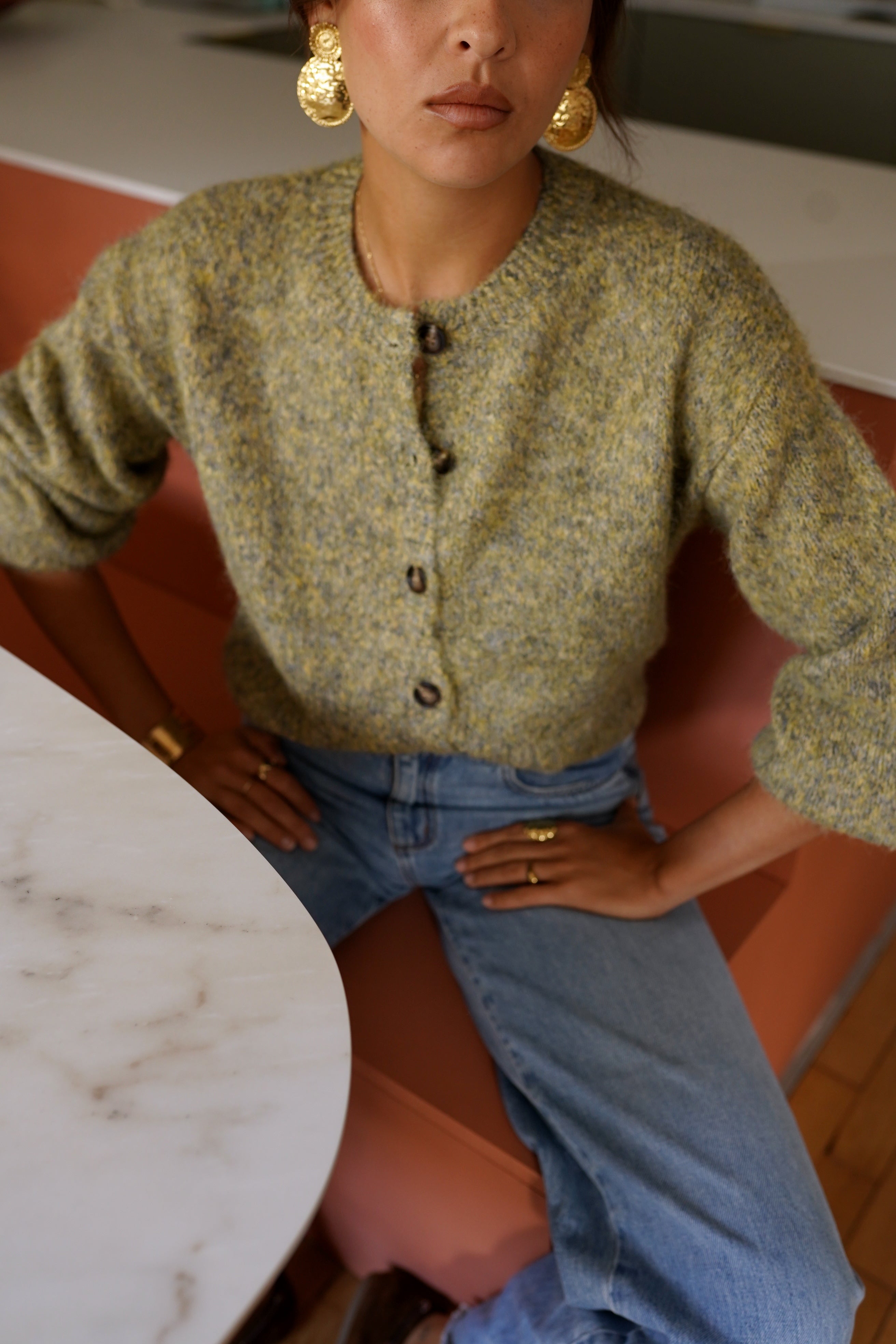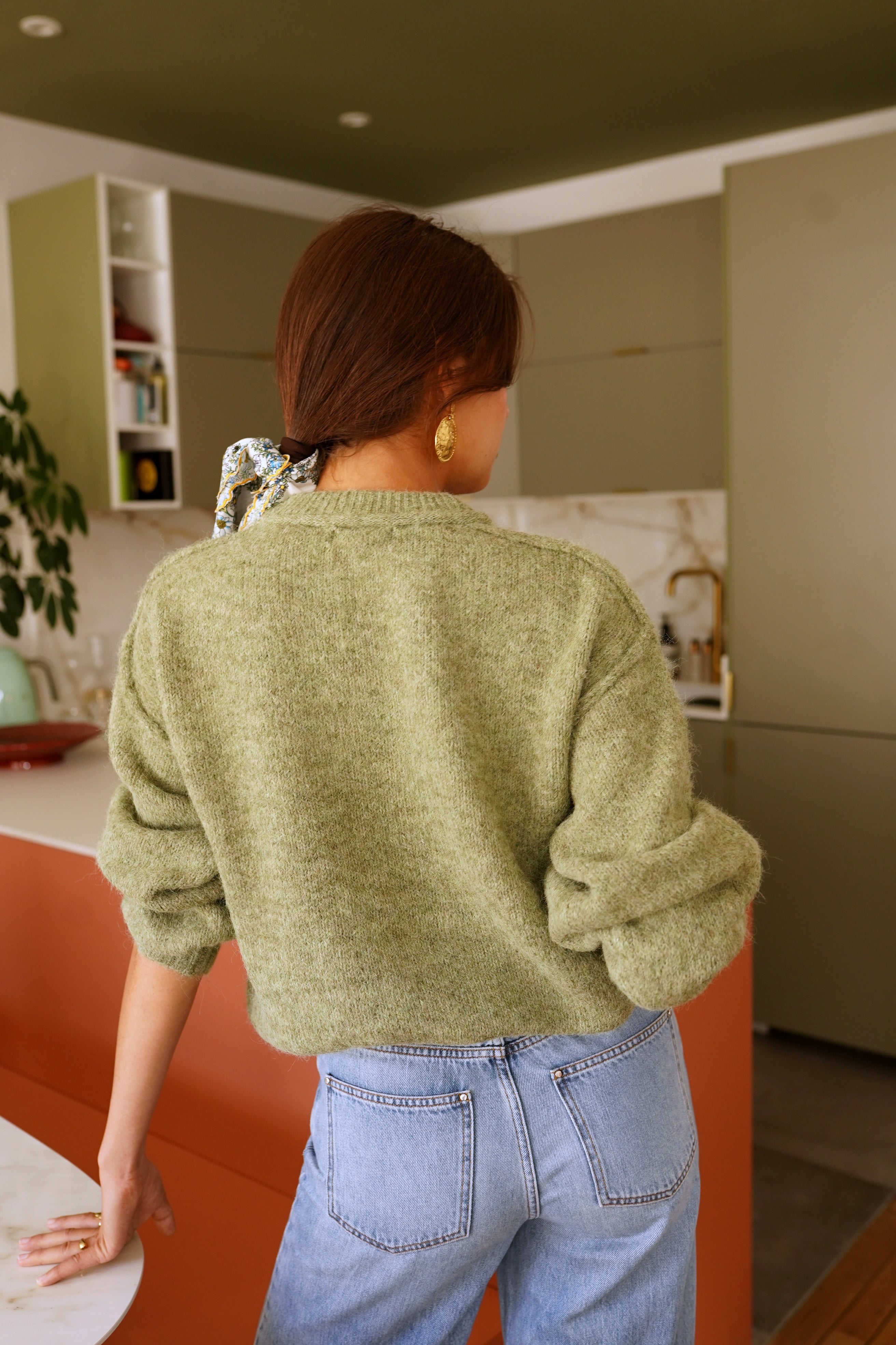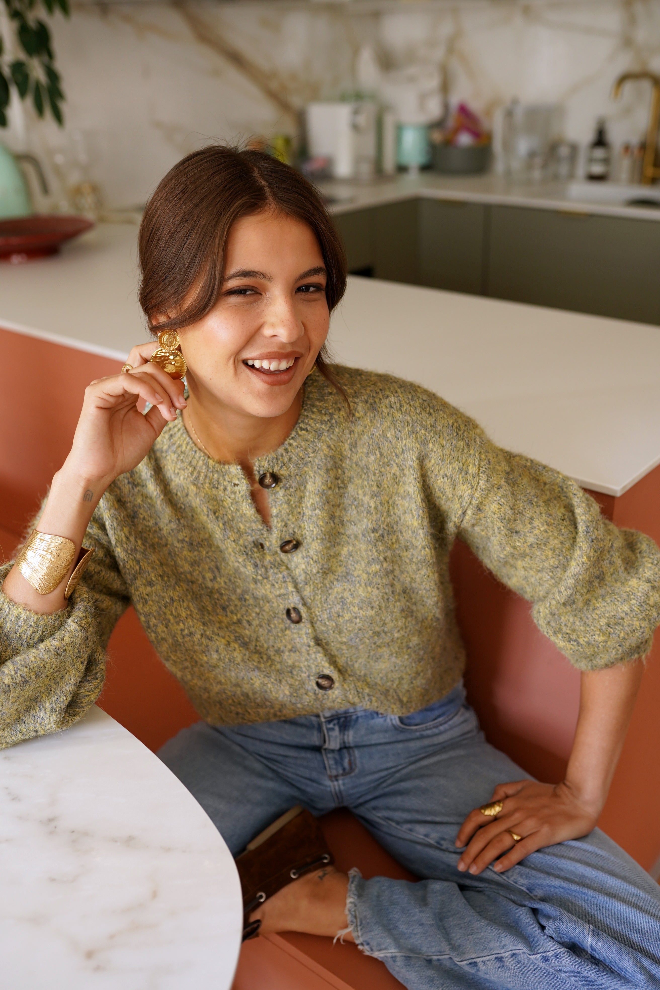 Avec sa coupe droite et ses boutons apparents, la maille Aris incarne l’élégance décontractée. Confectionnée dans une laine texturée aux nuances subtiles de vert chiné, elle réchauffe la silhouette tout en offrant un style unique. Ses manches légèrement bouffantes ajoutent du volume et une touche moderne, idéale pour twister un jean ou une jupe fluide.