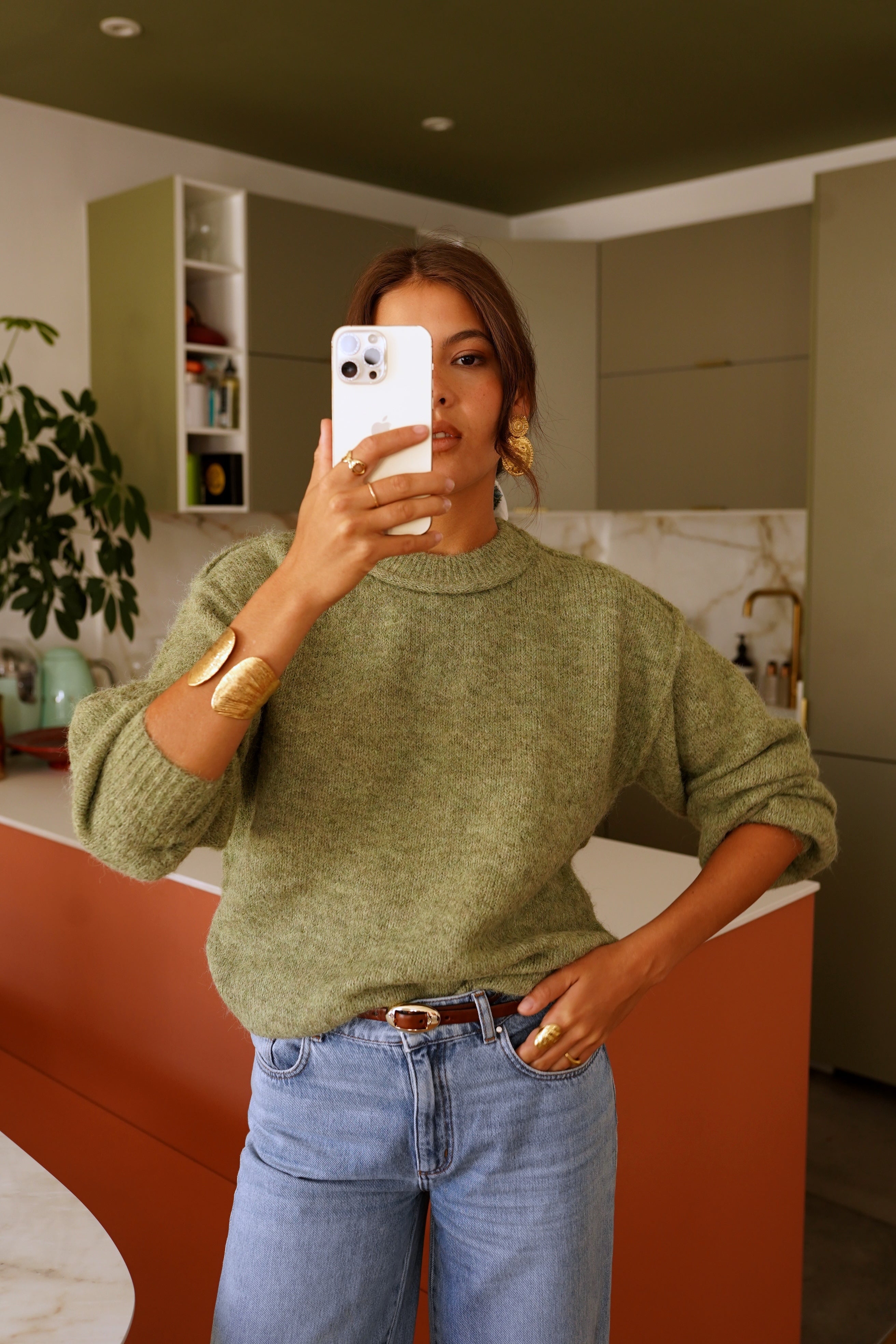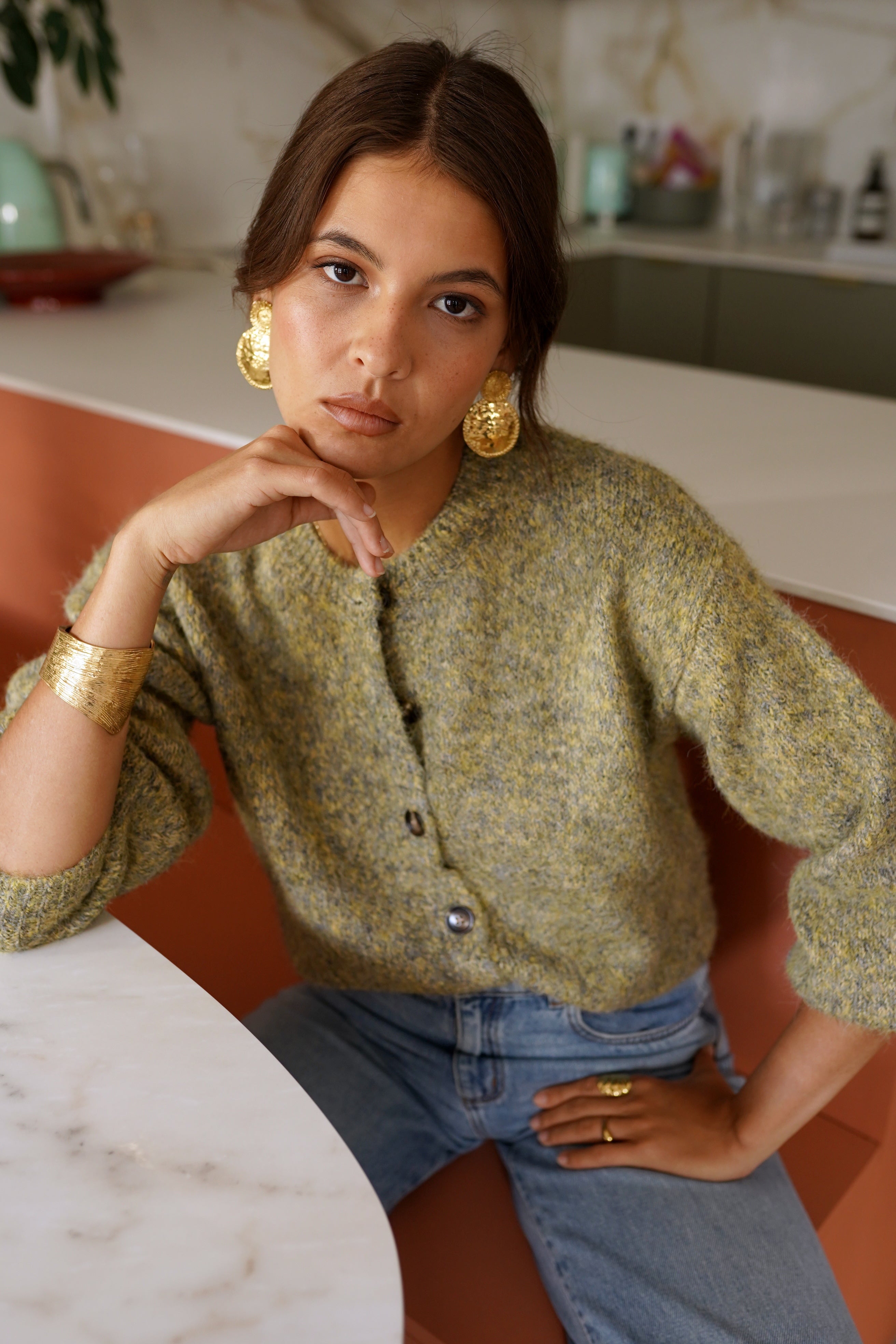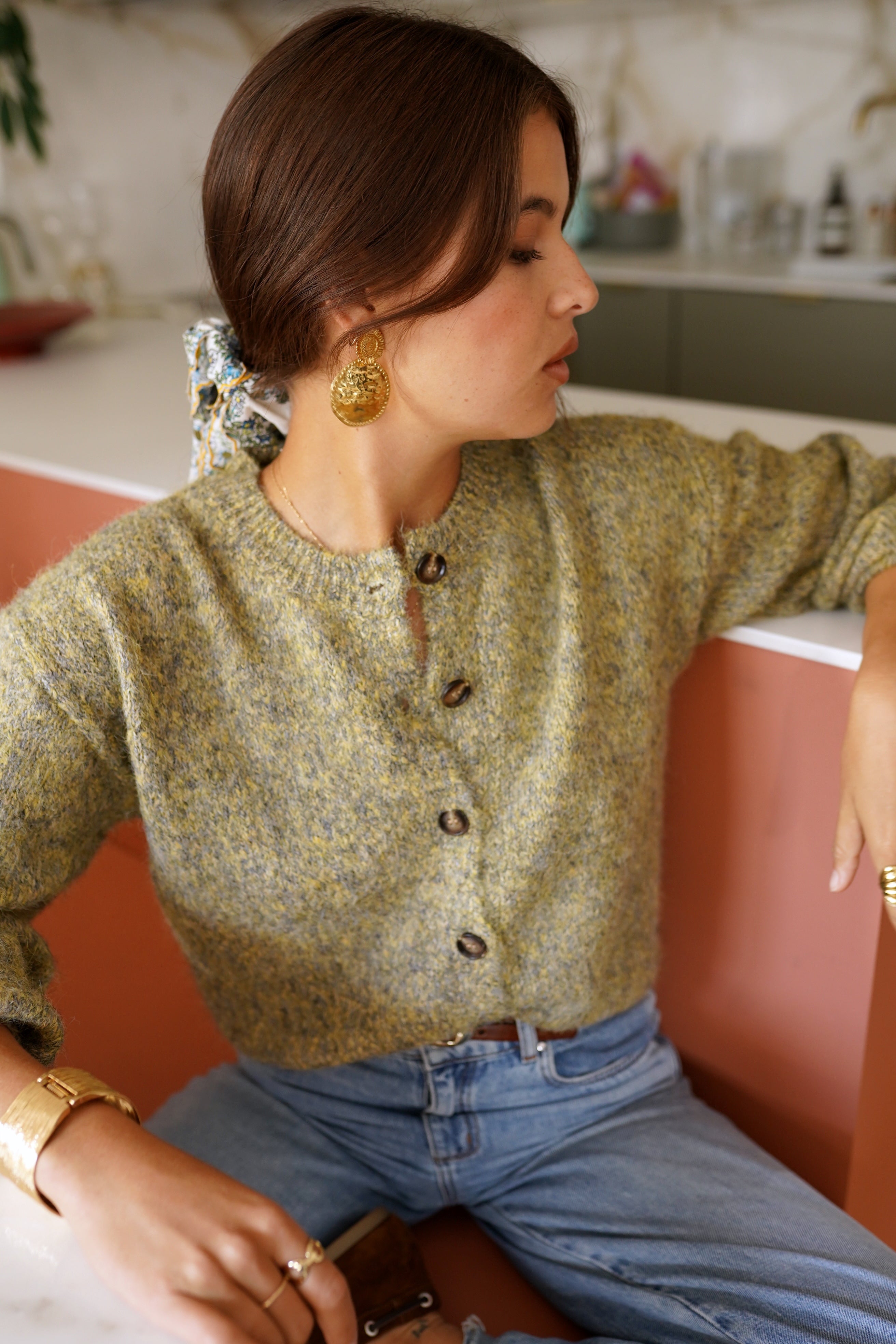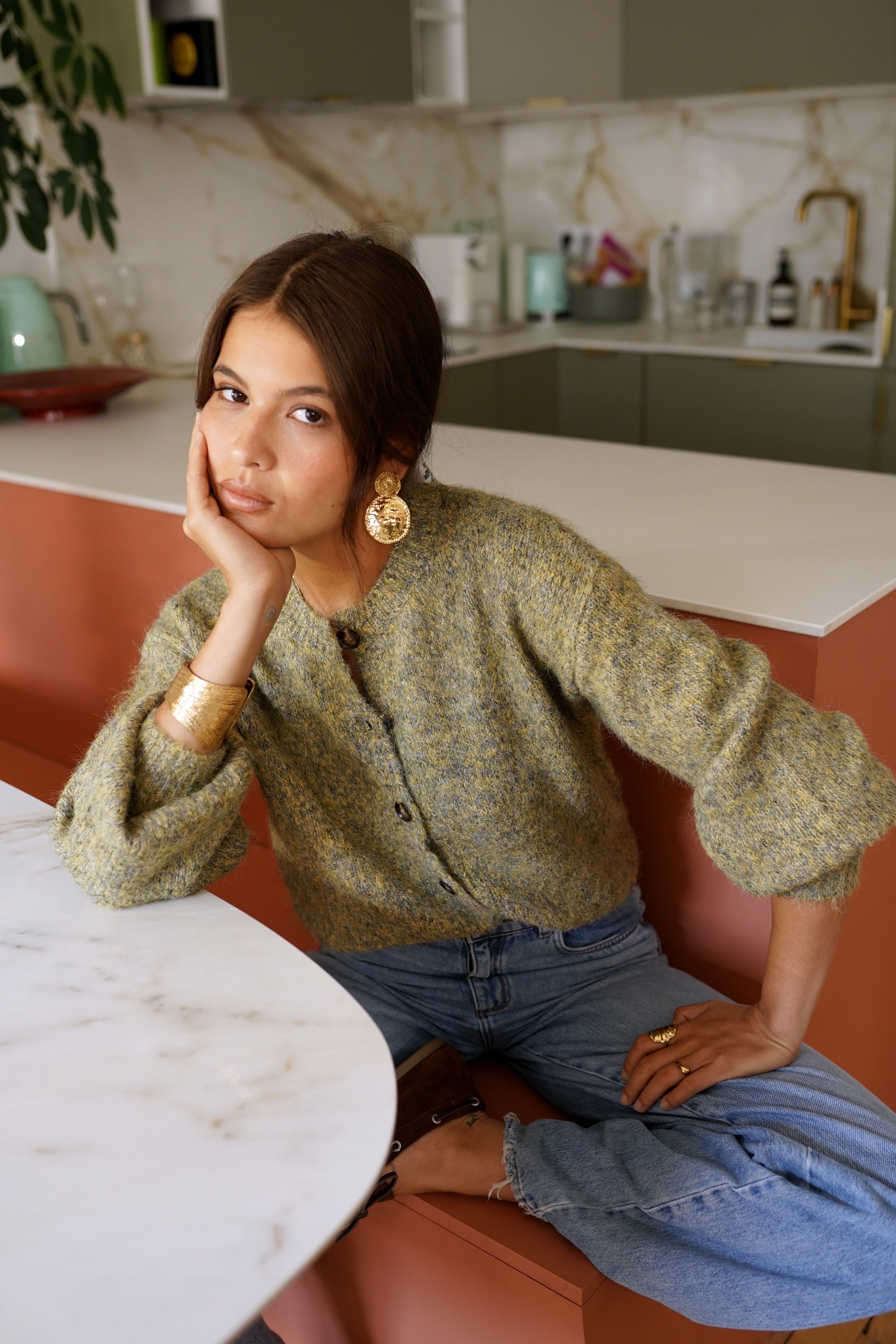 Avec sa coupe droite et ses boutons apparents, la maille Aris incarne l’élégance décontractée. Confectionnée dans une laine texturée aux nuances subtiles de vert chiné, elle réchauffe la silhouette tout en offrant un style unique. Ses manches légèrement bouffantes ajoutent du volume et une touche moderne, idéale pour twister un jean ou une jupe fluide.