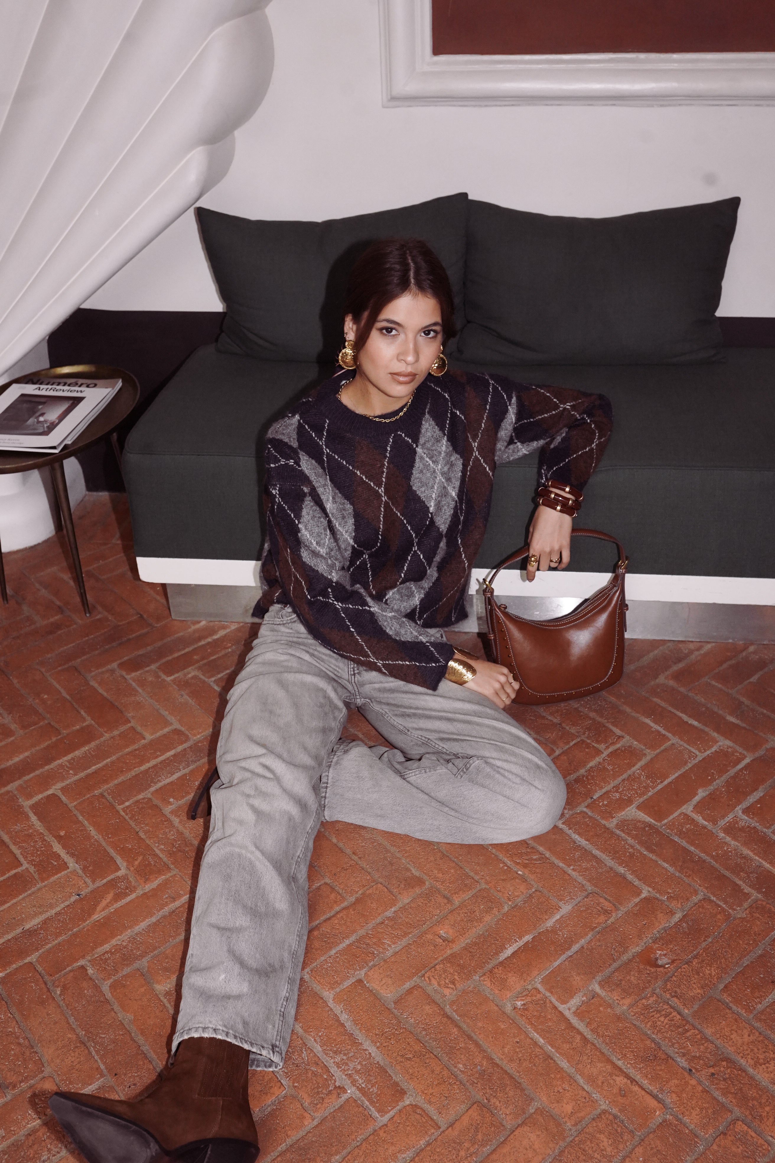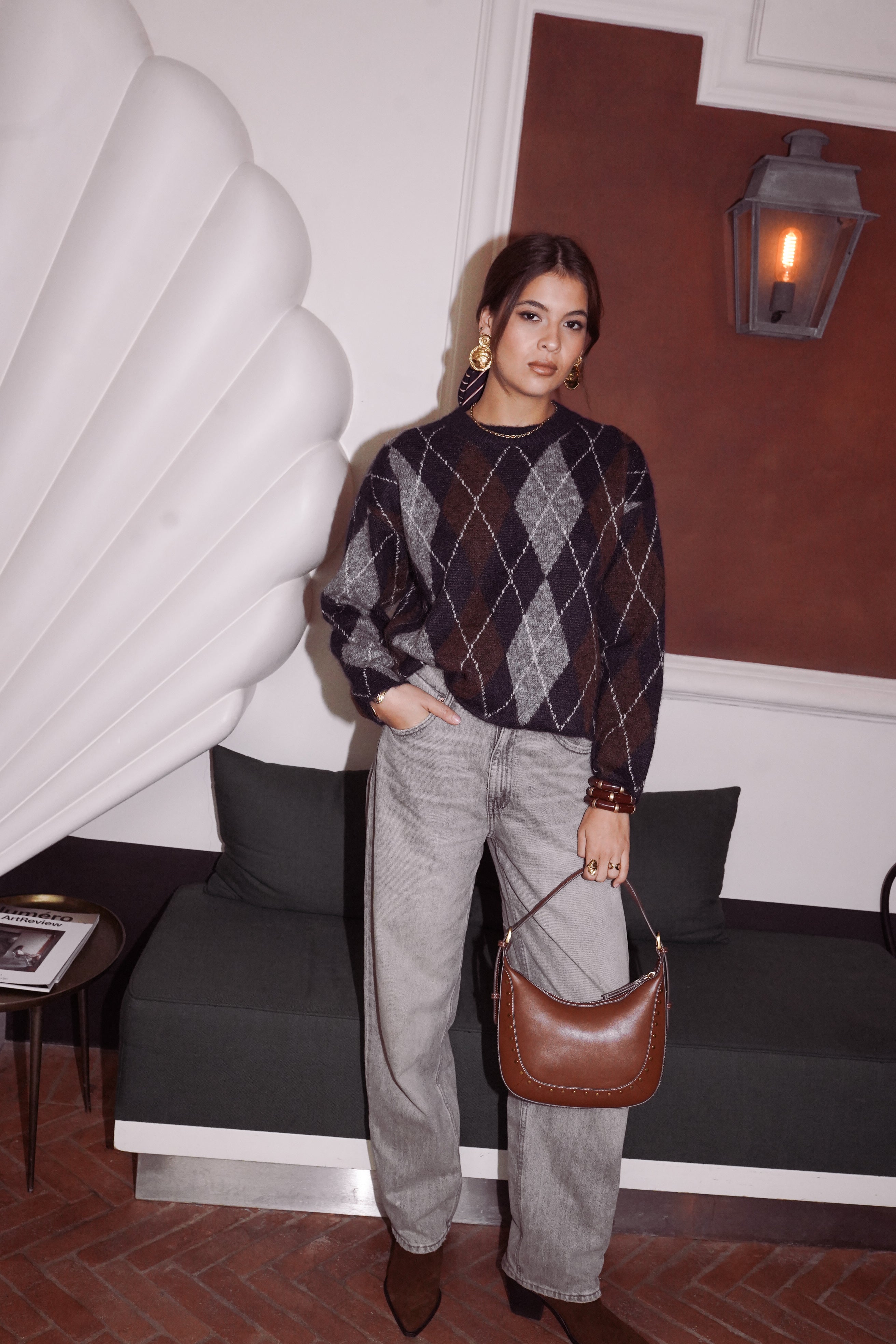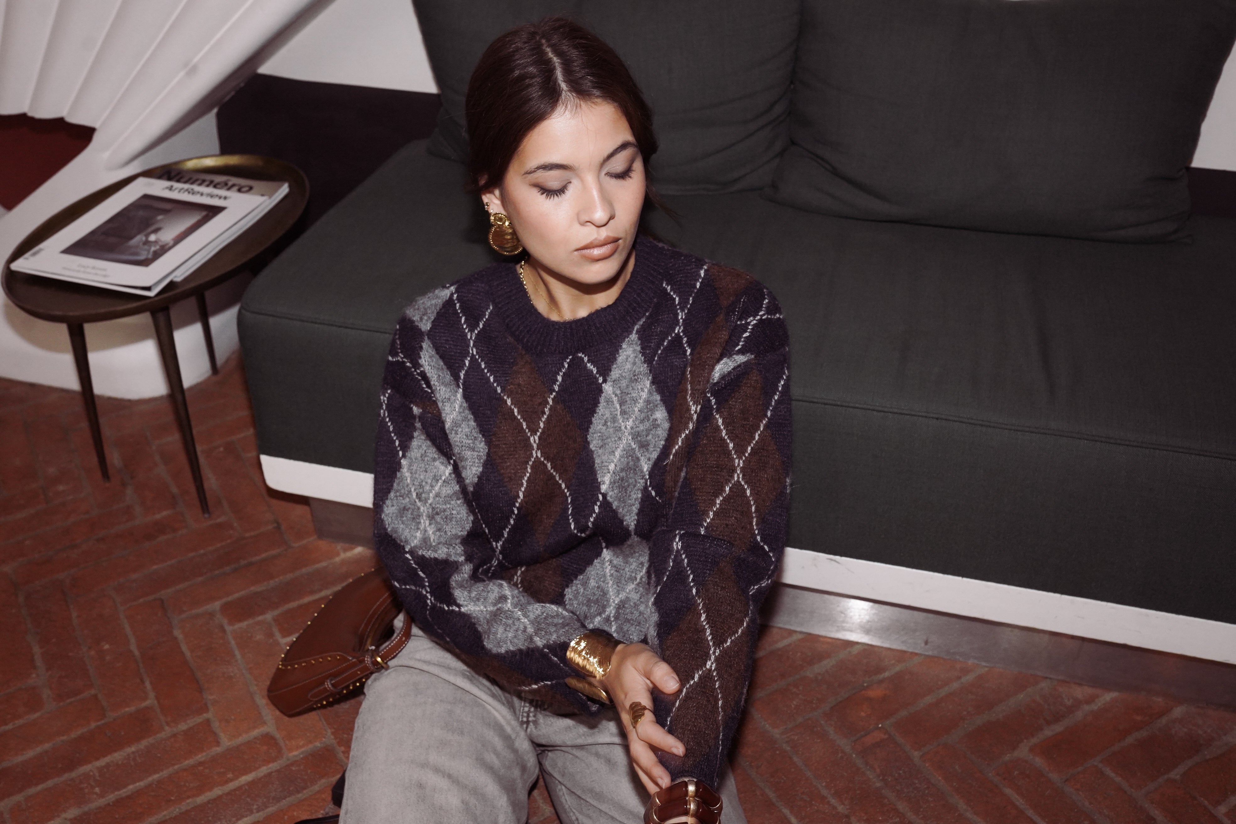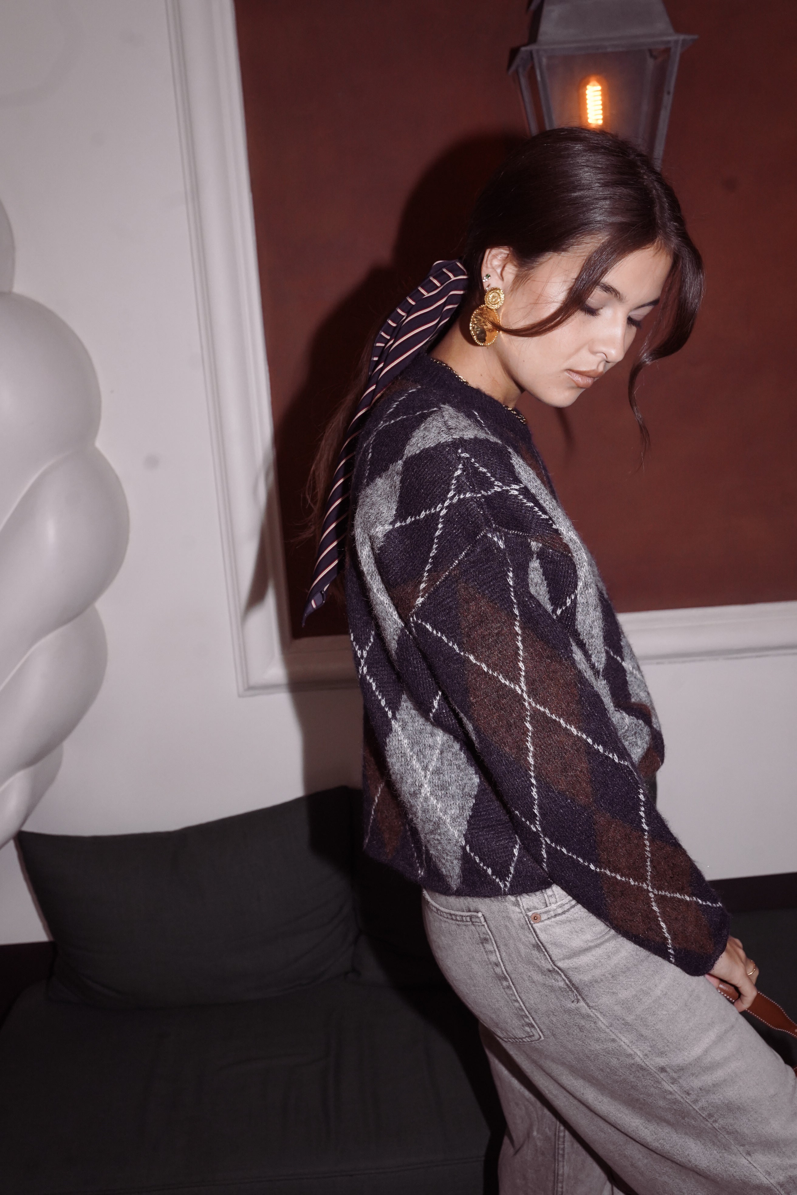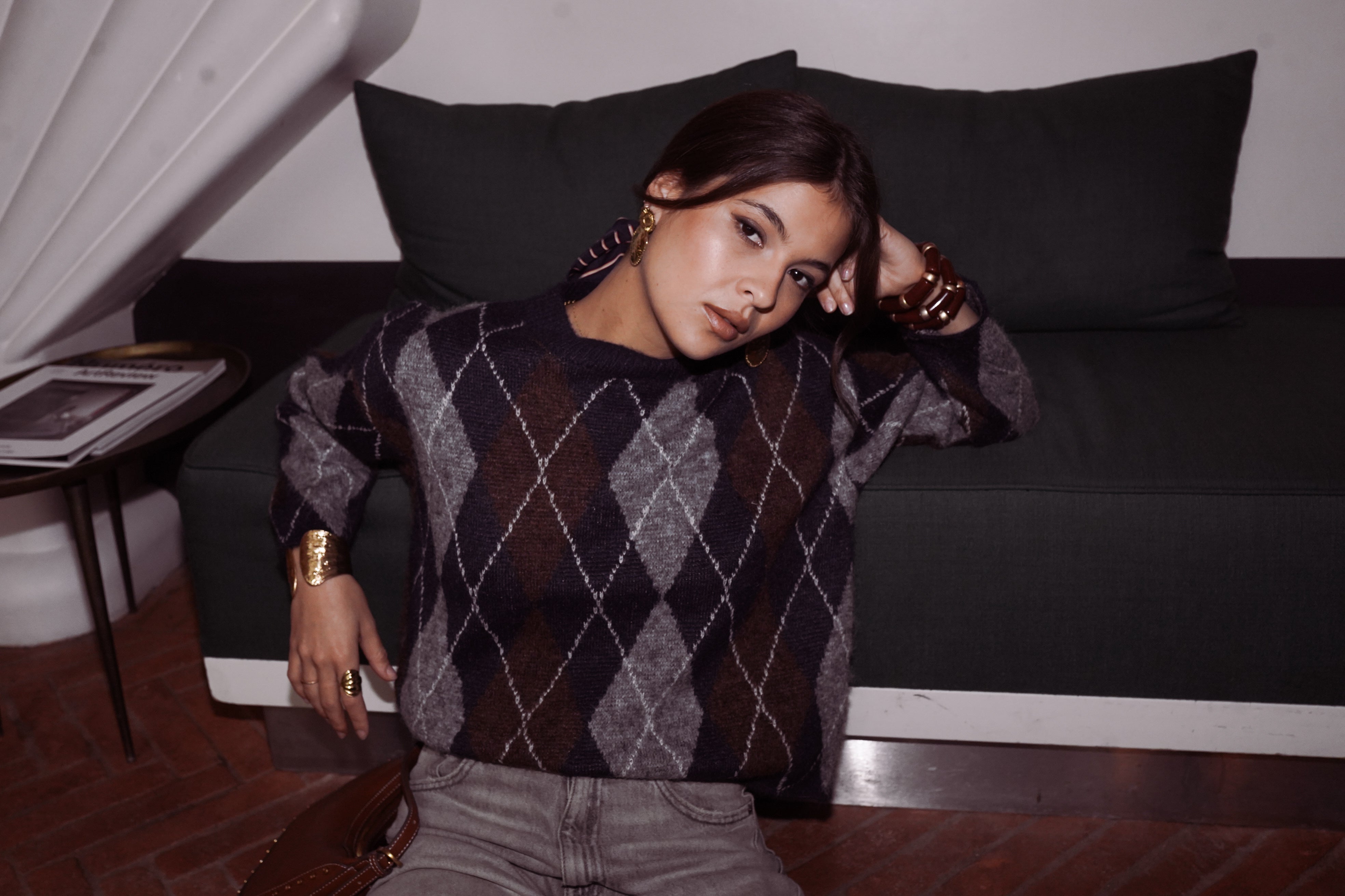 Arthus mêle des losanges bleu nuit, brun cacao et gris chiné : un trio profond qui structure la silhouette et apporte immédiatement du caractère.