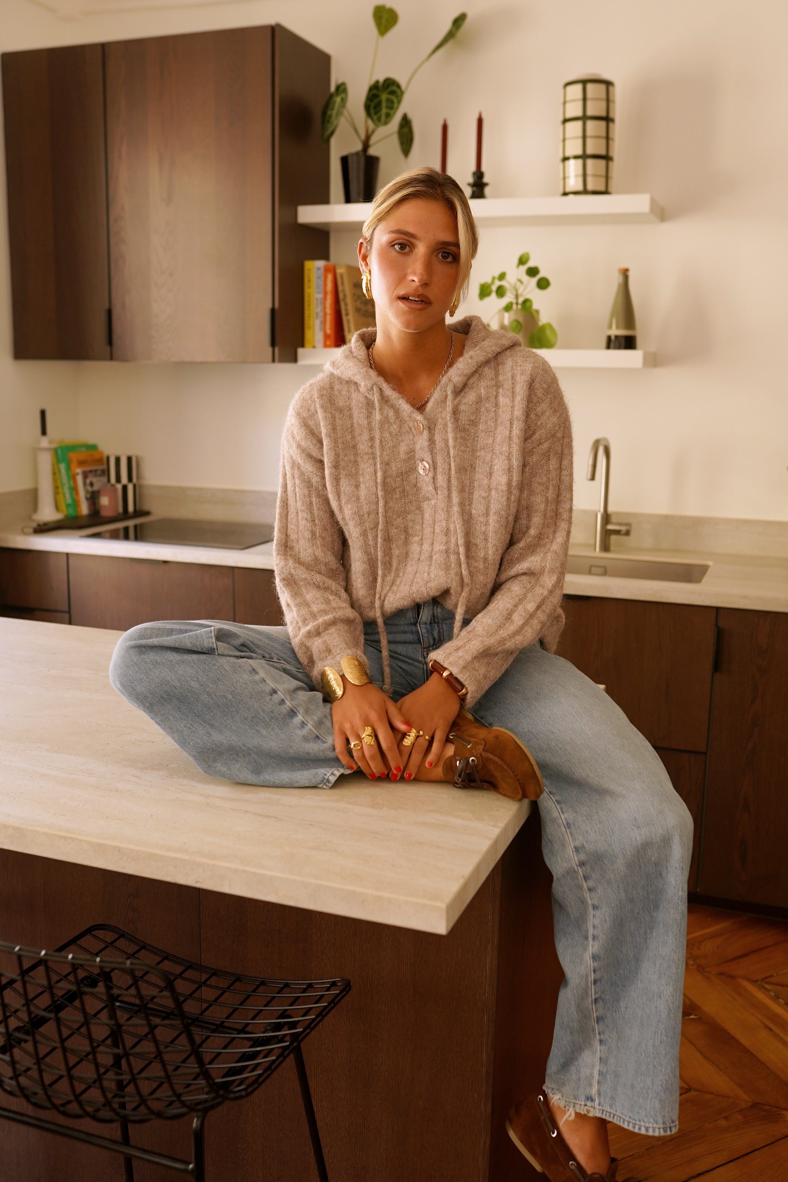 Avec sa coupe légèrement ample et son esprit casual-chic, elle se porte aussi bien en intérieur qu’en extérieur, pour une allure décontractée mais toujours sophistiquée. La maille Belly allie confort et modernité avec son col capuche et sa maille duveteuse à rayures texturées.