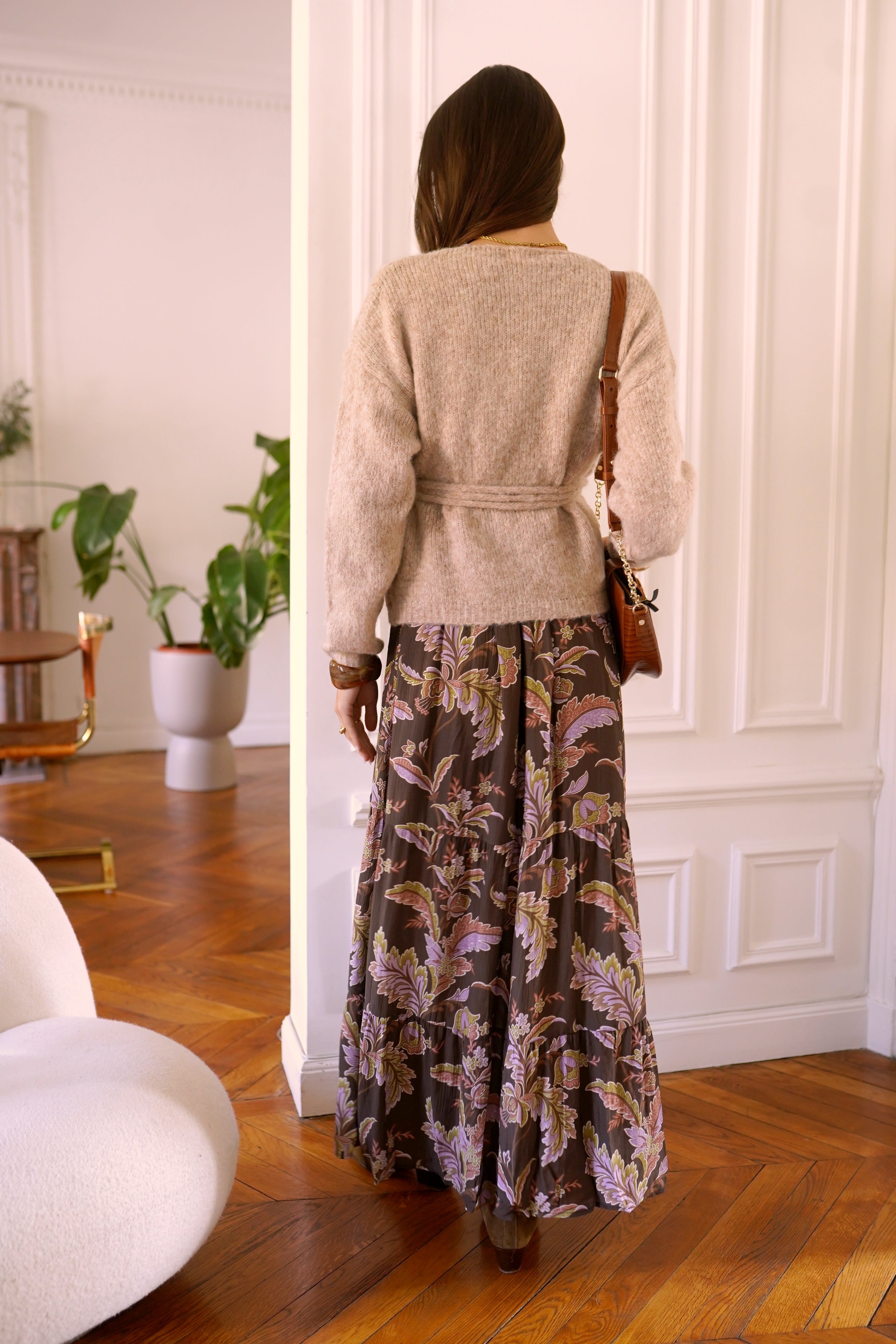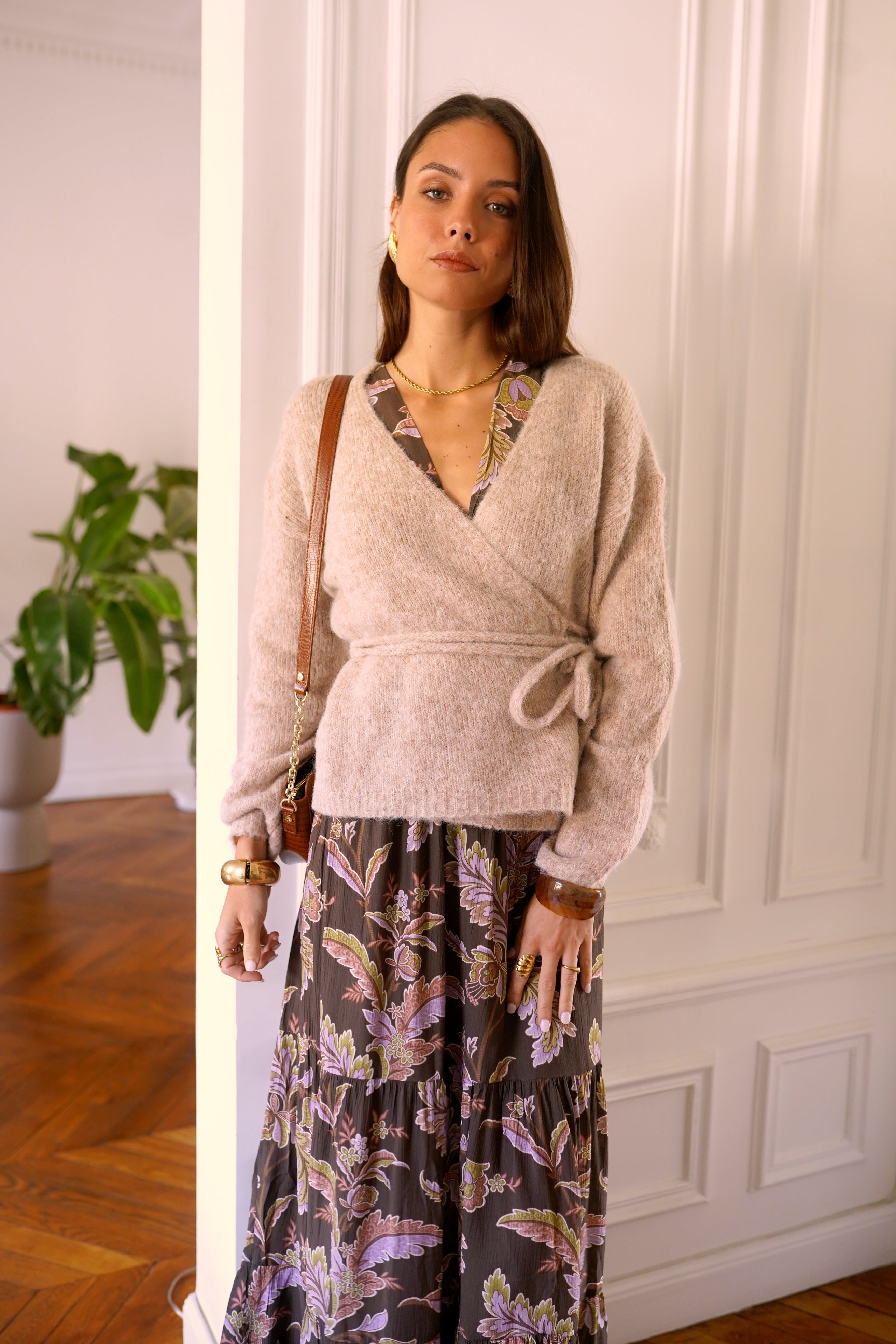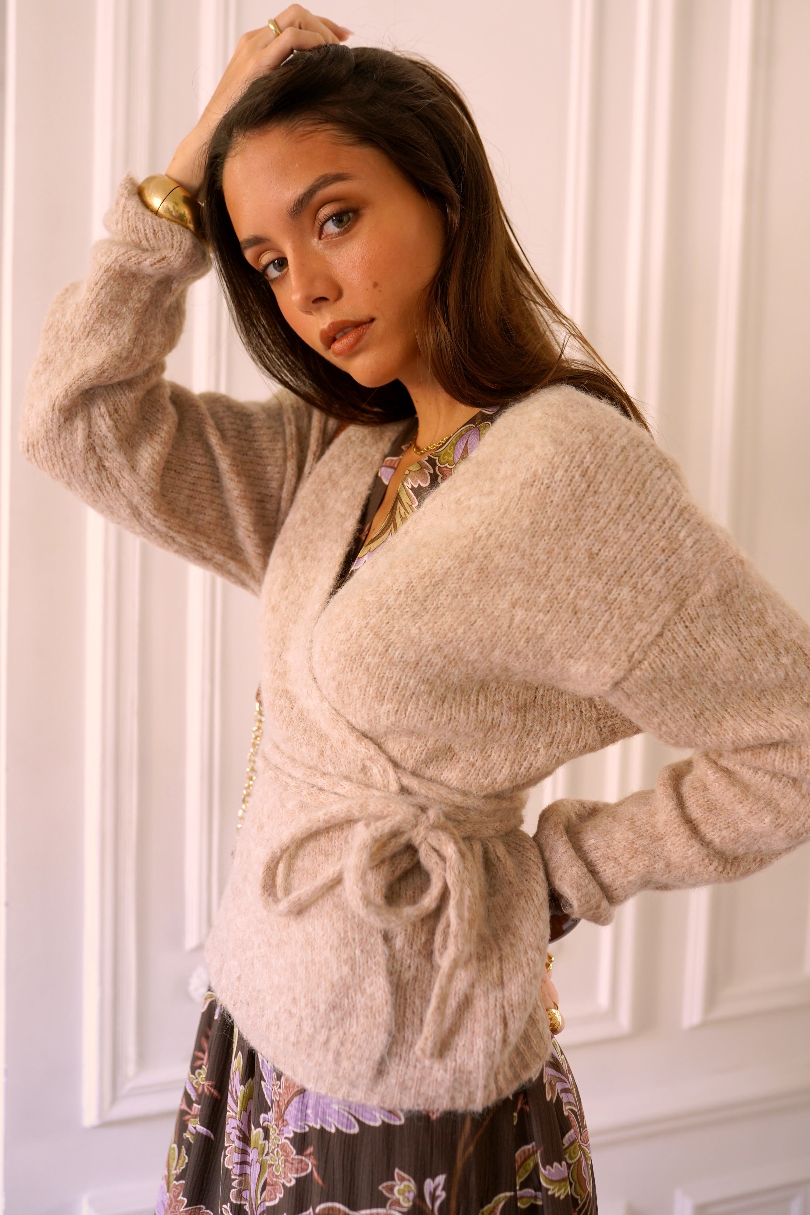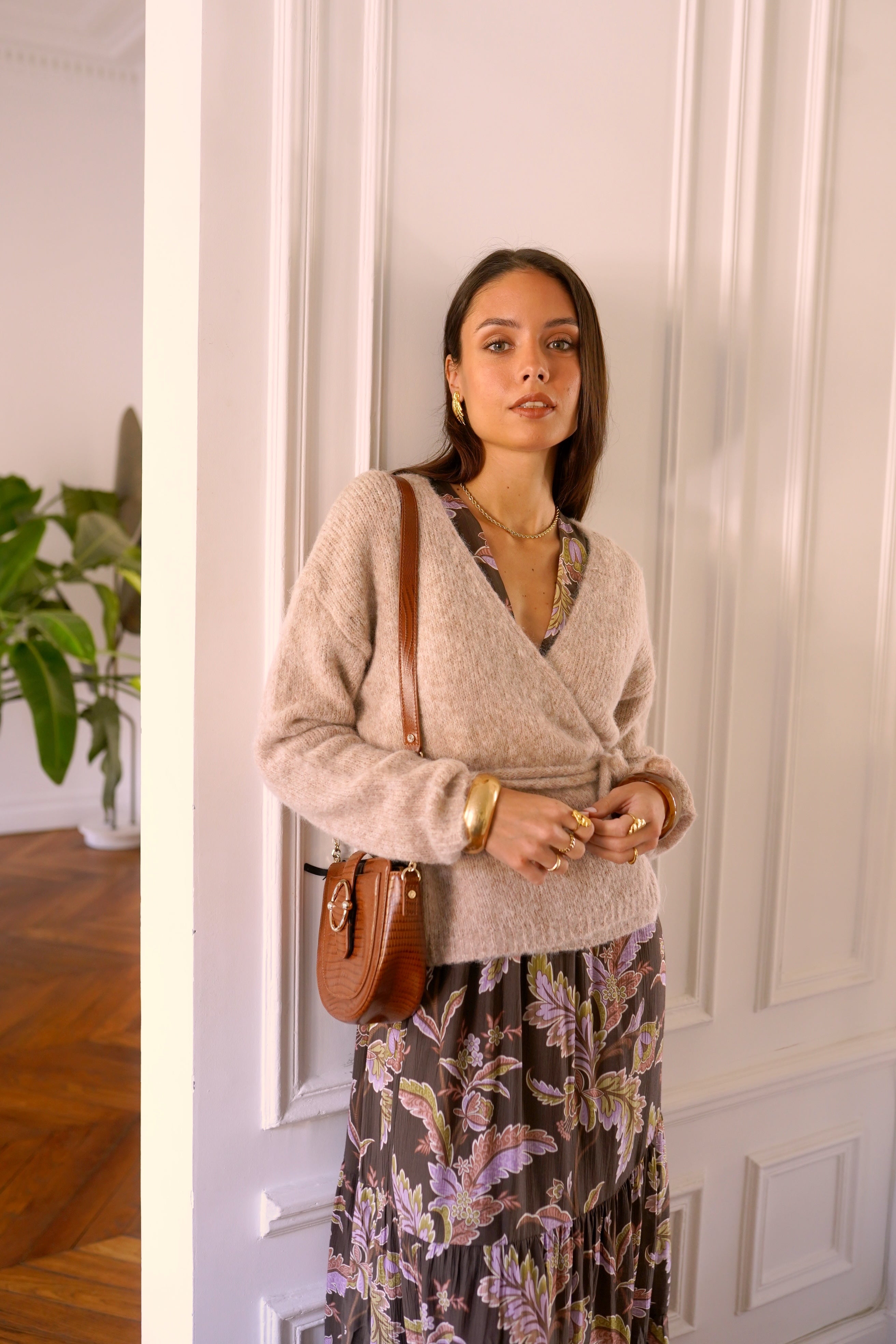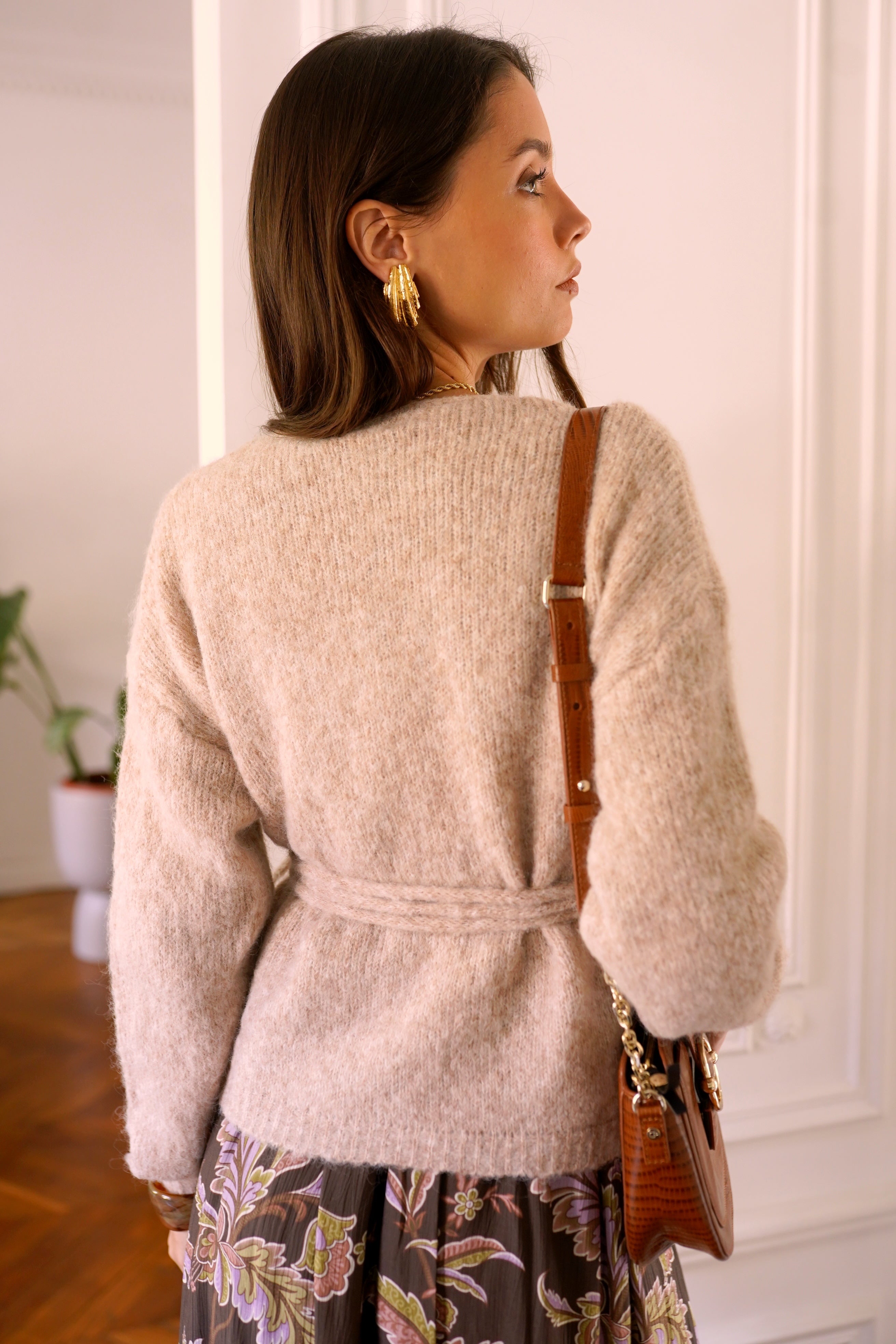 La maille Campbell mise sur une élégance discrète et intemporelle. Confectionnée dans un tricot beige doux au toucher moelleux, elle se distingue par son large col à revers côtelé qui structure joliment la silhouette. Sa coupe droite légèrement ample et ses manches longues en font une pièce à la fois confortable et raffinée, idéale pour accompagner toutes vos tenues de saison.