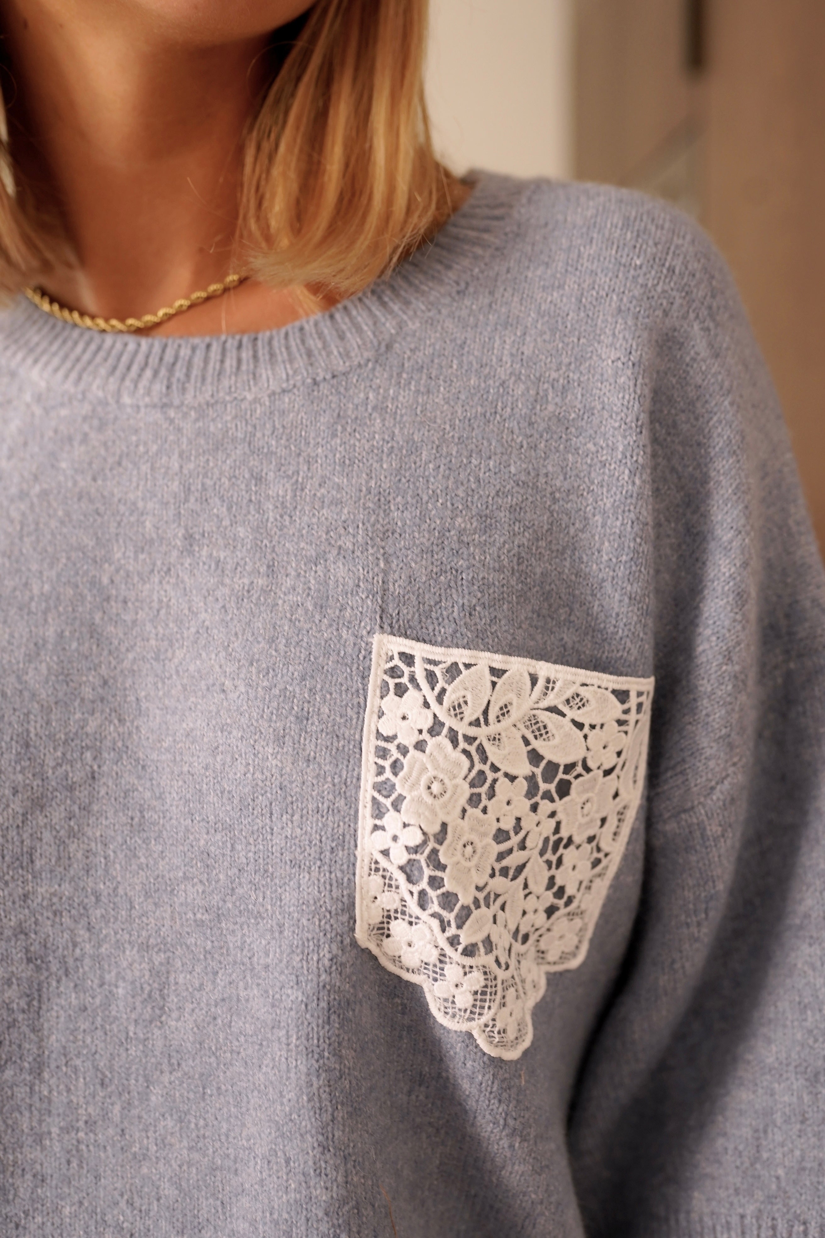 Son bleu tendre rencontre la finesse de la dentelle ivoire, appliquée en manches et en poche poitrine, pour un jeu de matières raffiné et féminin. La maille Délia est une pièce qui twiste l’esprit casual avec une touche précieuse.