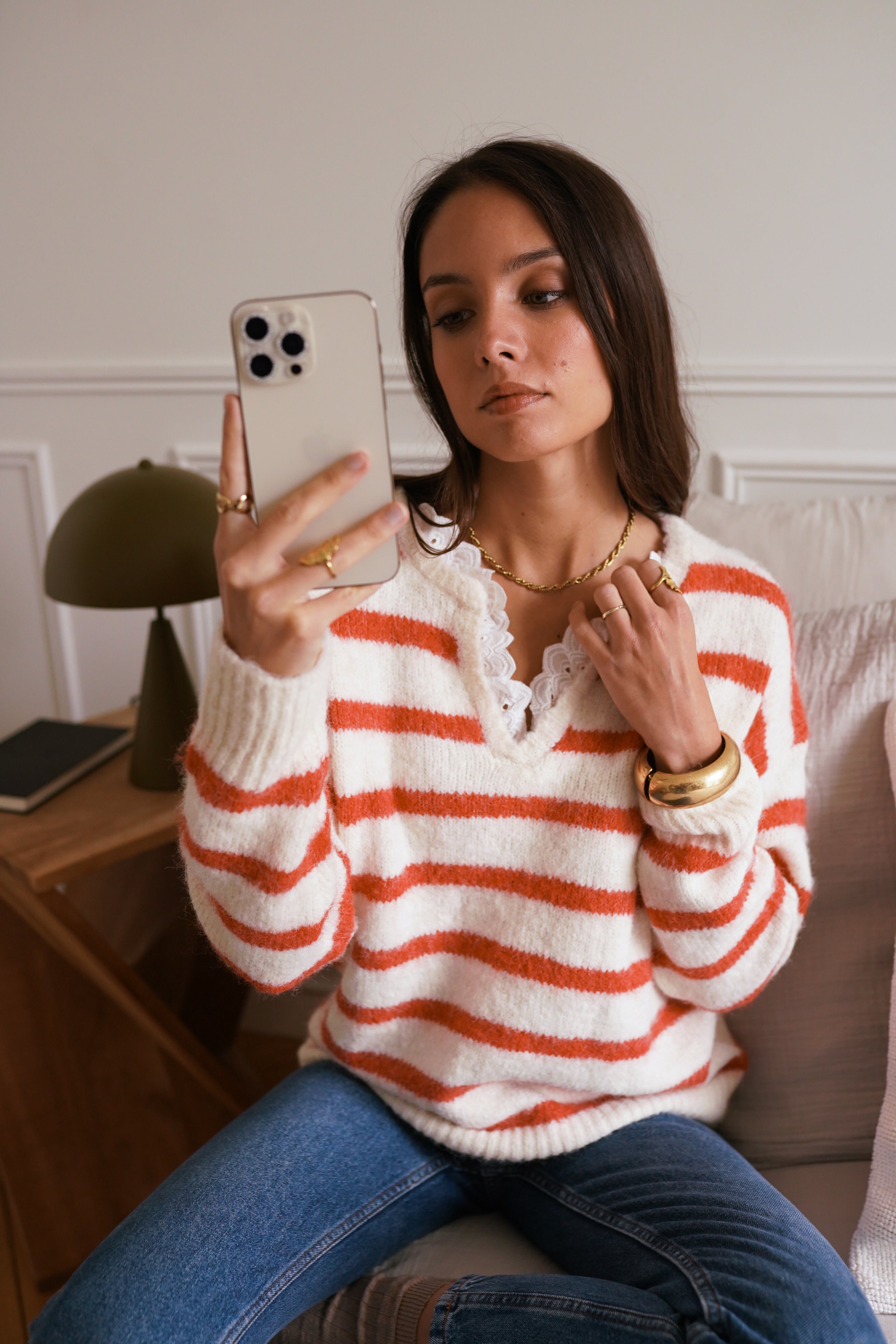 La maille Elora joue la carte du contraste entre douceur et caractère. Ses rayures écru et rouge réveillent le look, tandis que son col V bordé de dentelle apporte une touche féminine assumée. Détail signature : le petit cœur brodé ton sur ton.