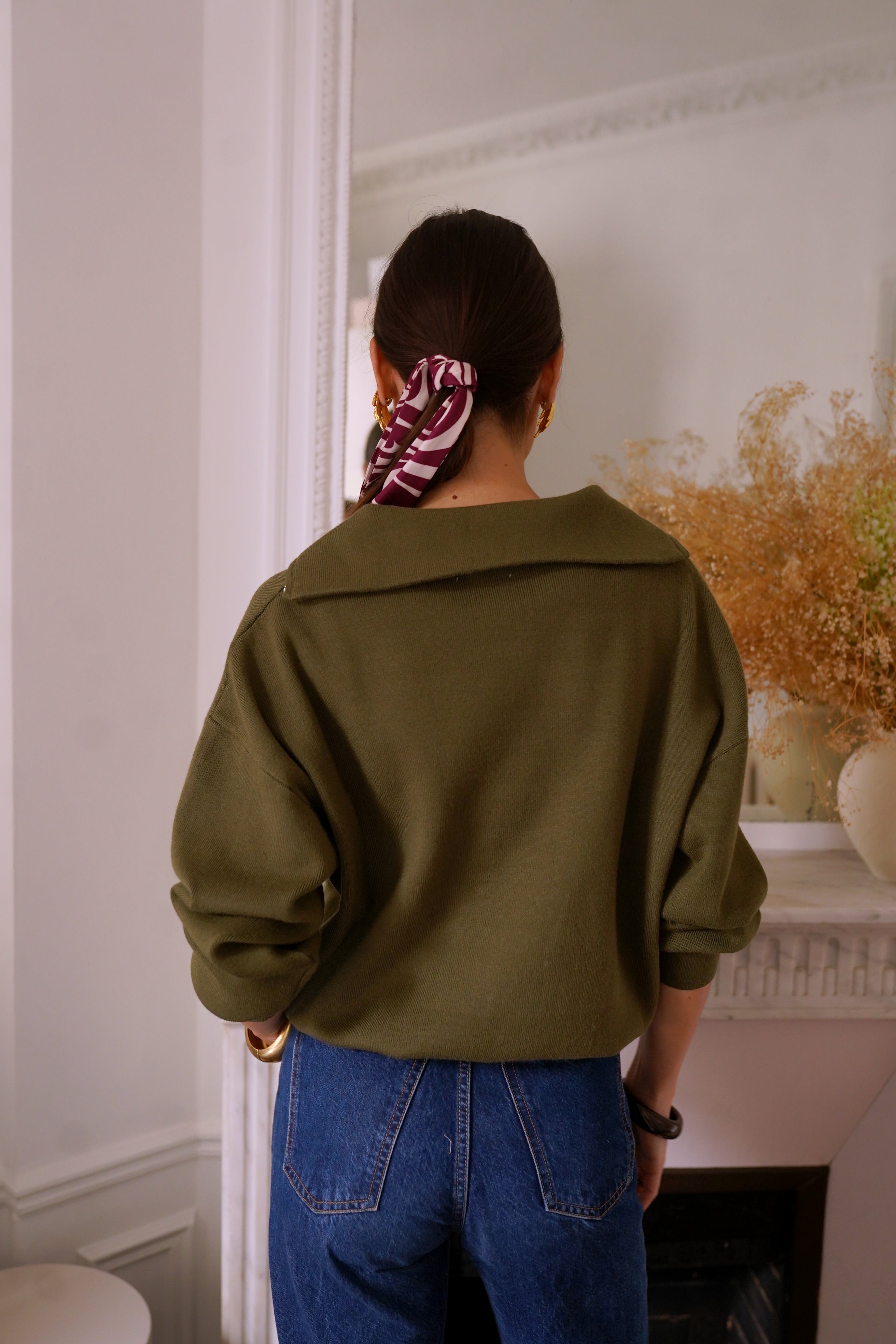 Le sweat Fallon mêle simplicité et détail signature. Décliné dans un vert kaki profond, il est rehaussé d’un petit cœur brodé doré sur la poitrine, clin d’œil discret et raffiné. Son col zippé, qui peut se porter ouvert ou fermé selon l’envie, lui apporte une touche sportive et moderne. Sa coupe droite légèrement ample assure confort et liberté de mouvement au quotidien.