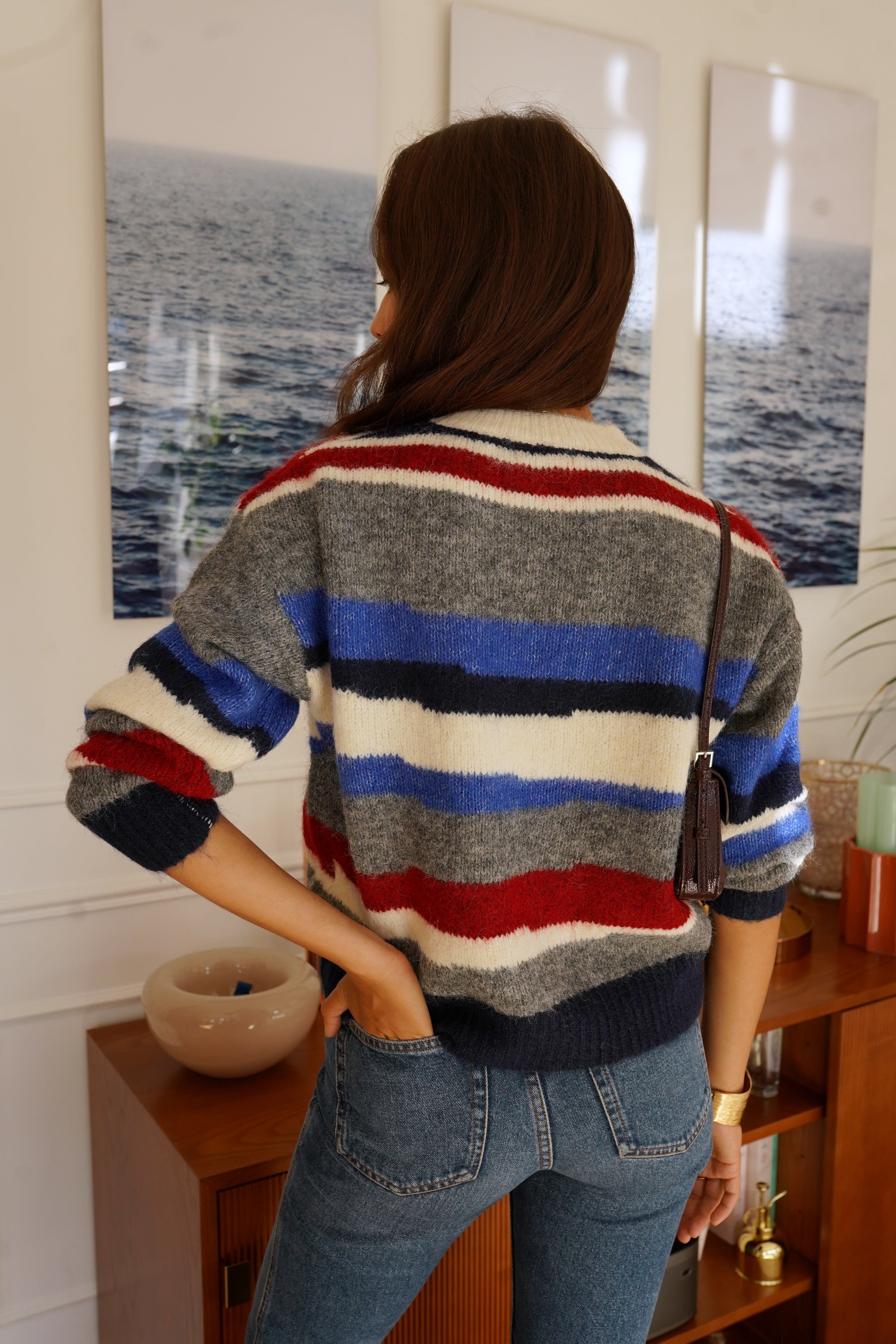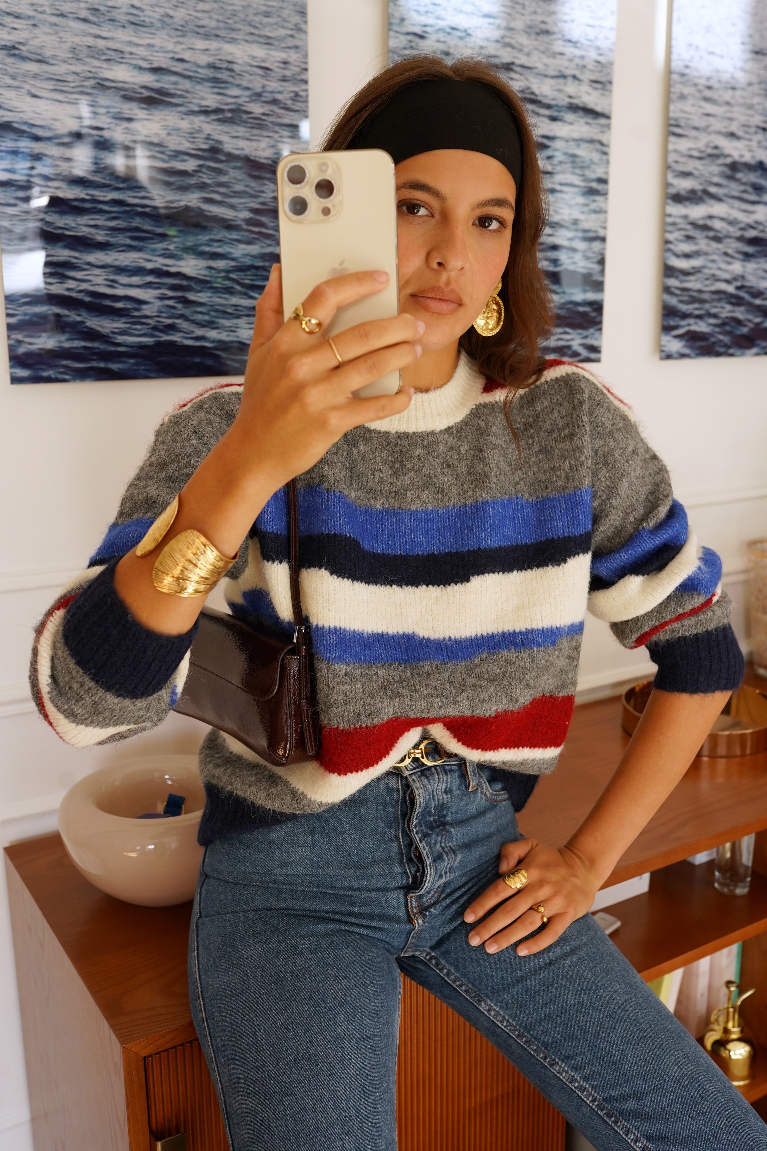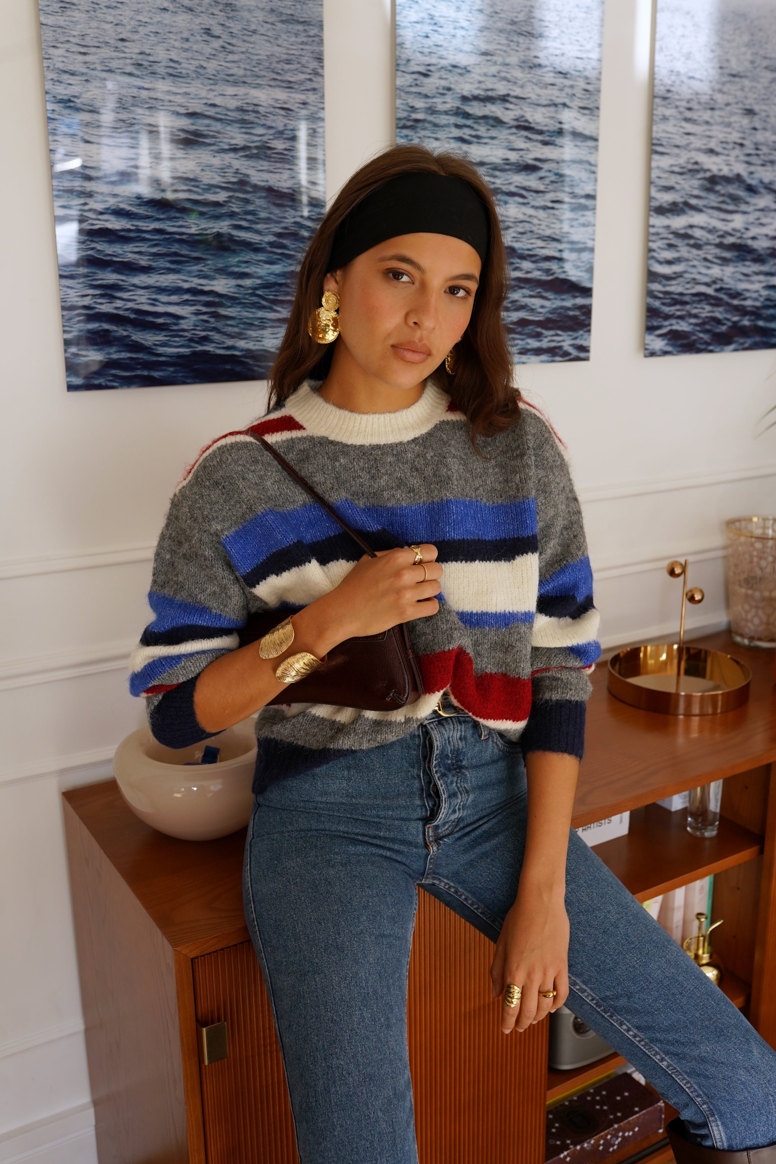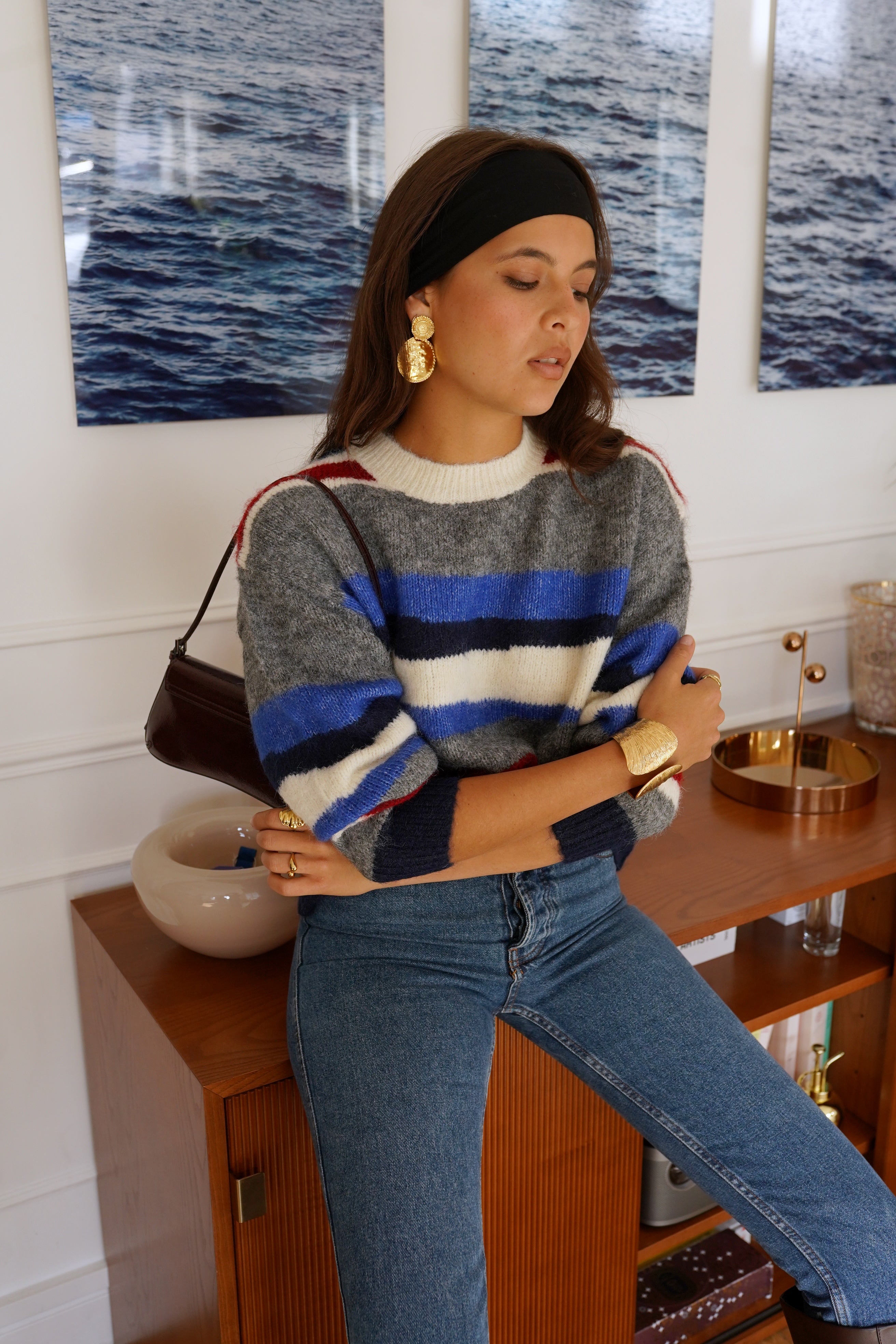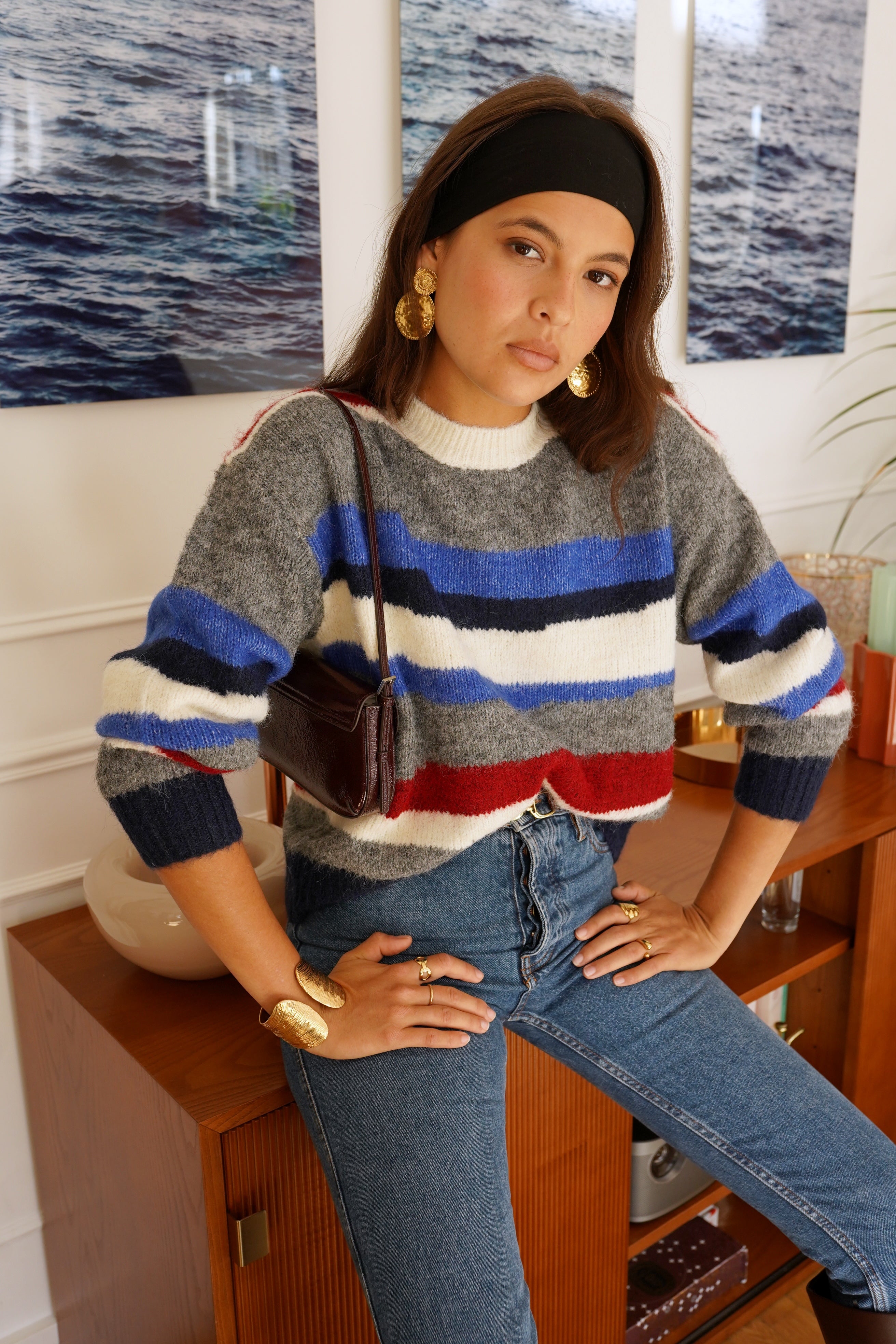 La maille Faustine se distingue par son jeu de rayures colorées qui apportent une touche dynamique et moderne aux looks d’hiver. Confortable et douce, elle séduit par son volume légèrement loose et son style casual-chic.