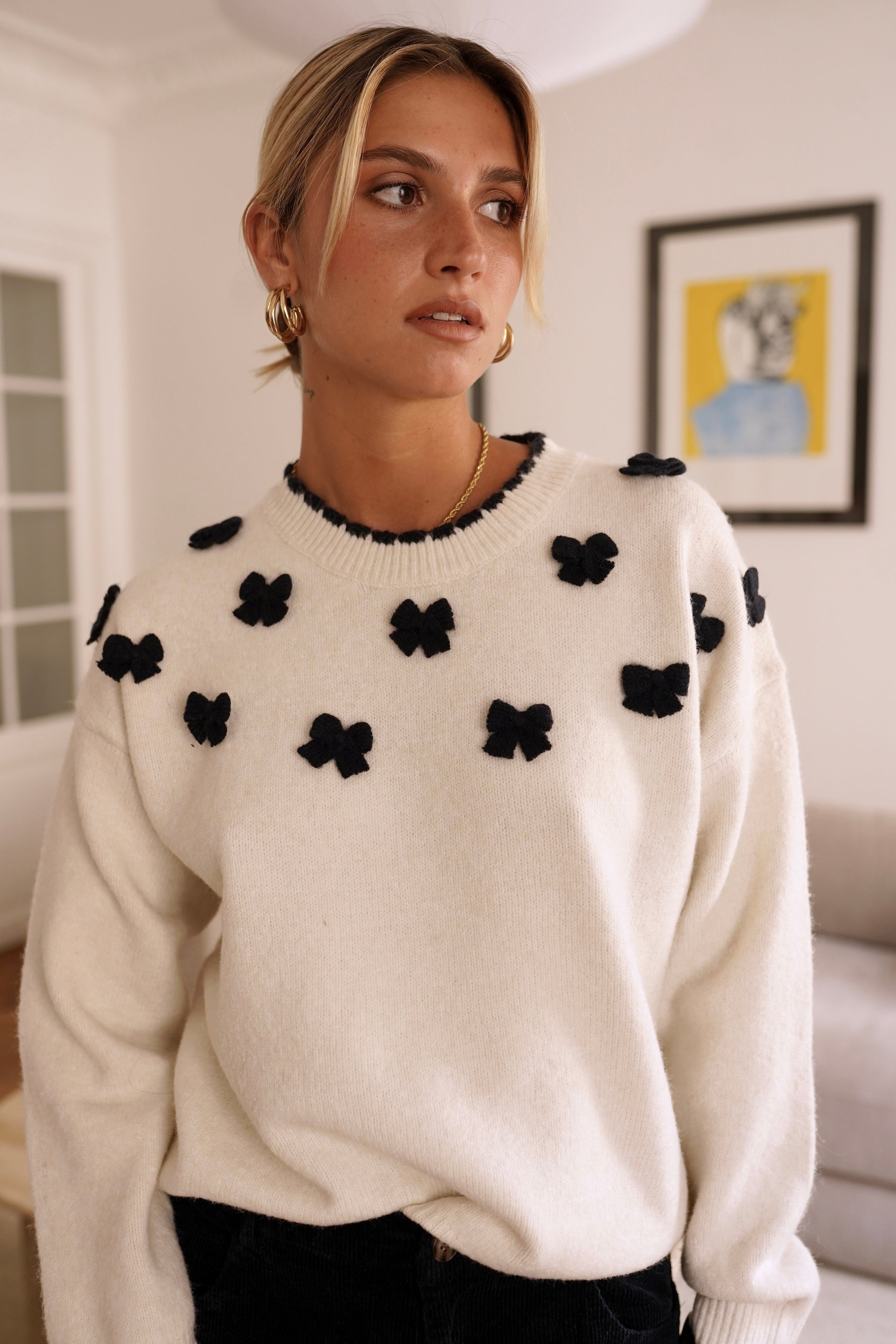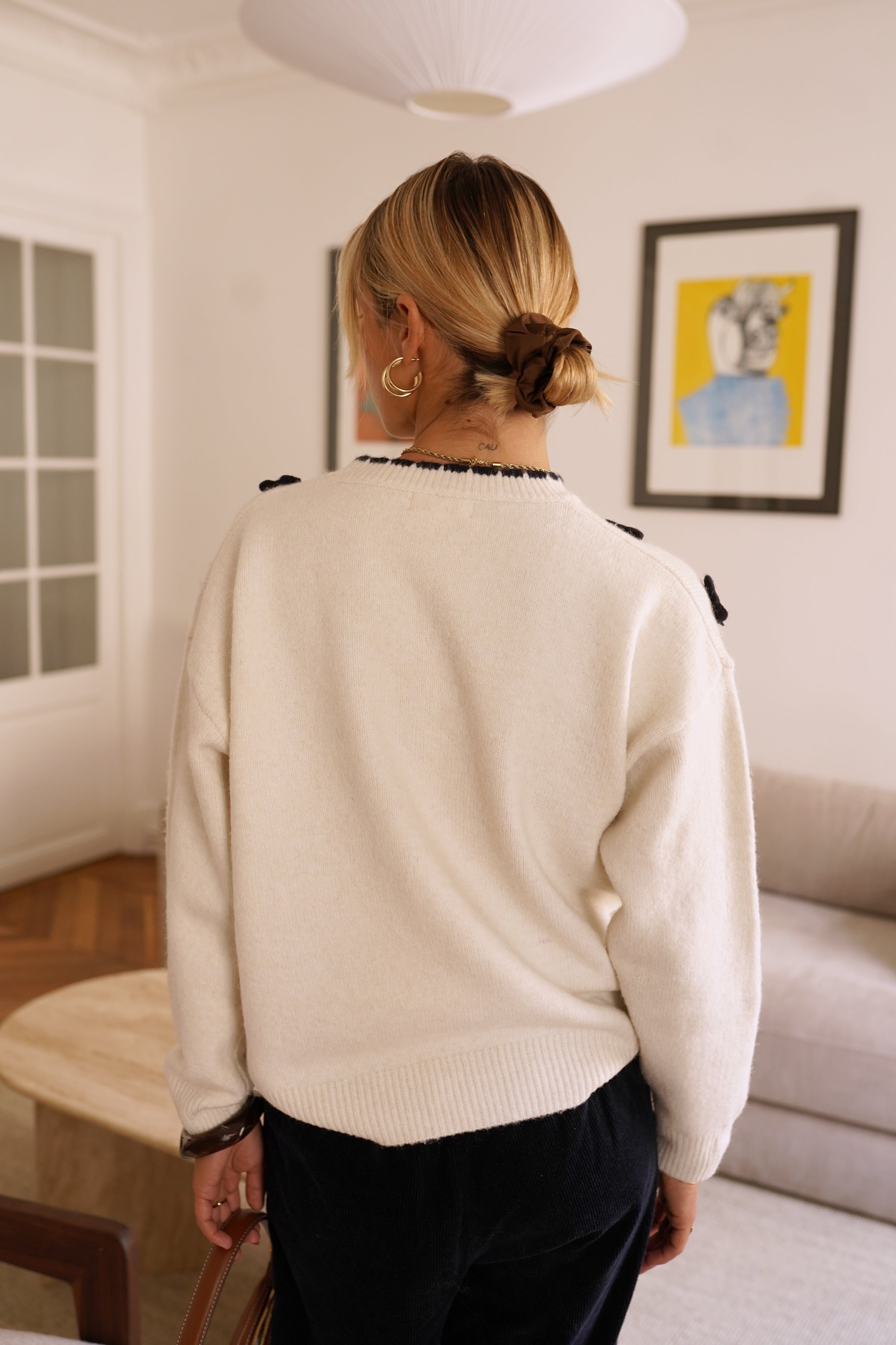 La maille Fira, le contraste parfait entre élégance et audace. Sur sa base écrue, ses petits nœuds noirs appliqués viennent jouer les détails graphiques et féminins, transformant une pièce intemporelle en un essentiel au twist ludique.