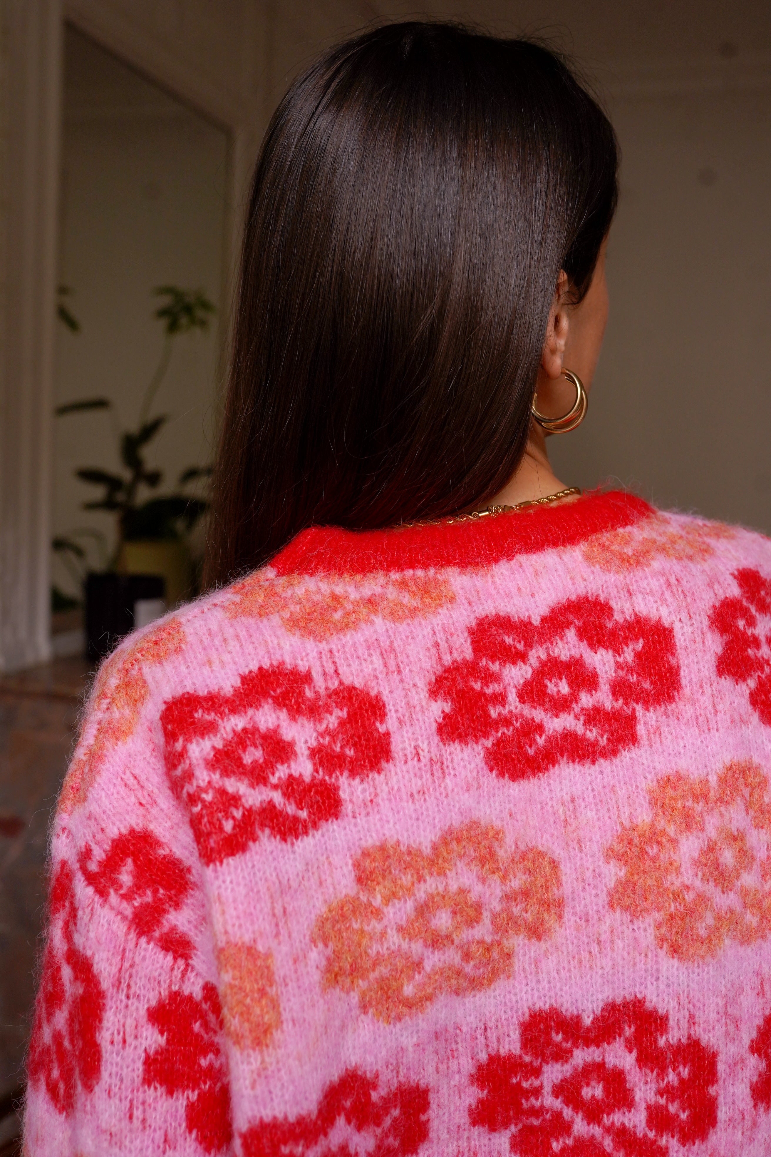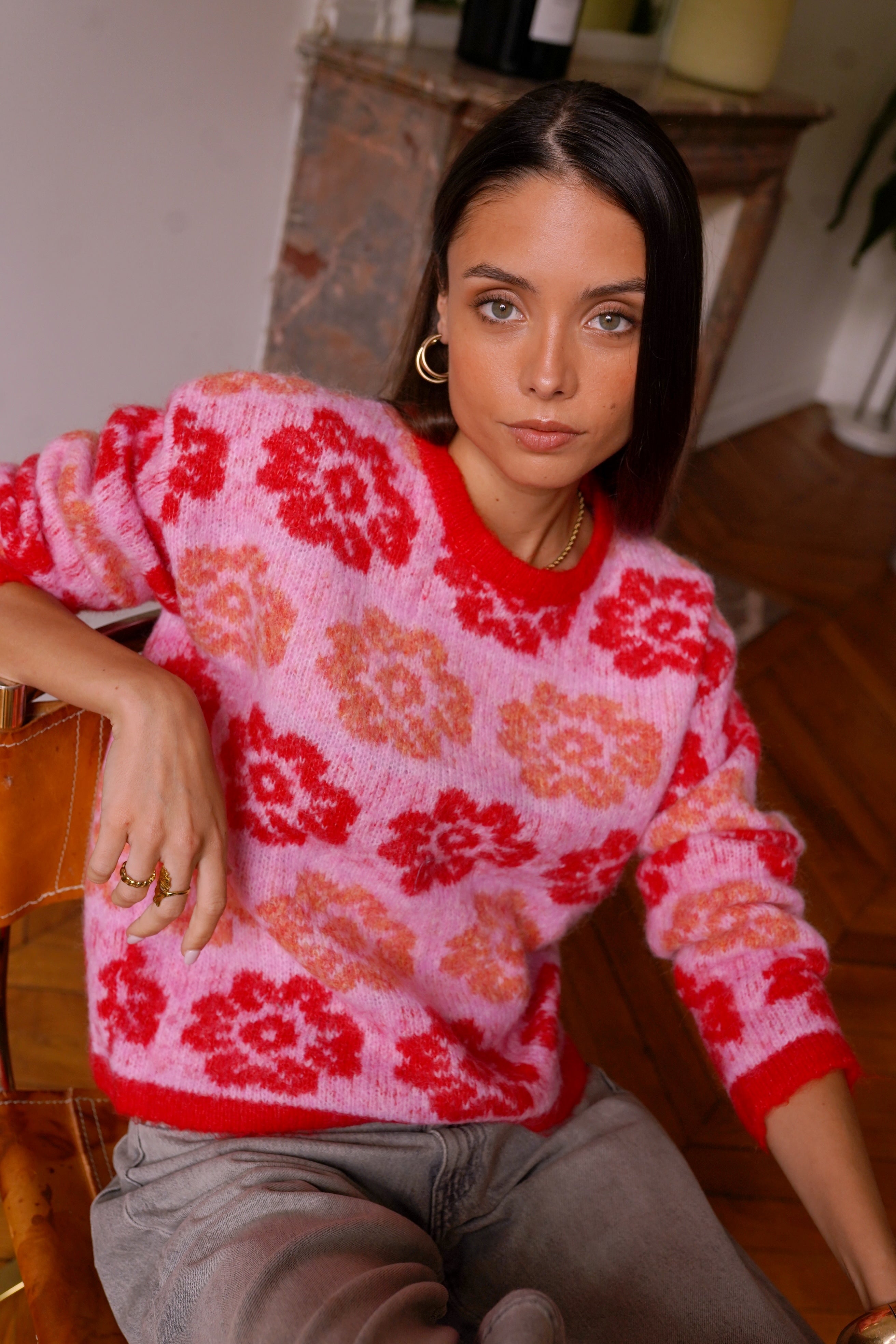 Le pull Harmonie célèbre la couleur et l’énergie des imprimés audacieux. Sur une base rose vive, il se pare de grands motifs floraux déclinés en nuances de rouge et d’orangé, créant un effet graphique et lumineux. Son col rond, ses manches longues et ses finitions côtelées apportent structure et confort, tandis que sa maille moelleuse enveloppe la silhouette avec chaleur.
