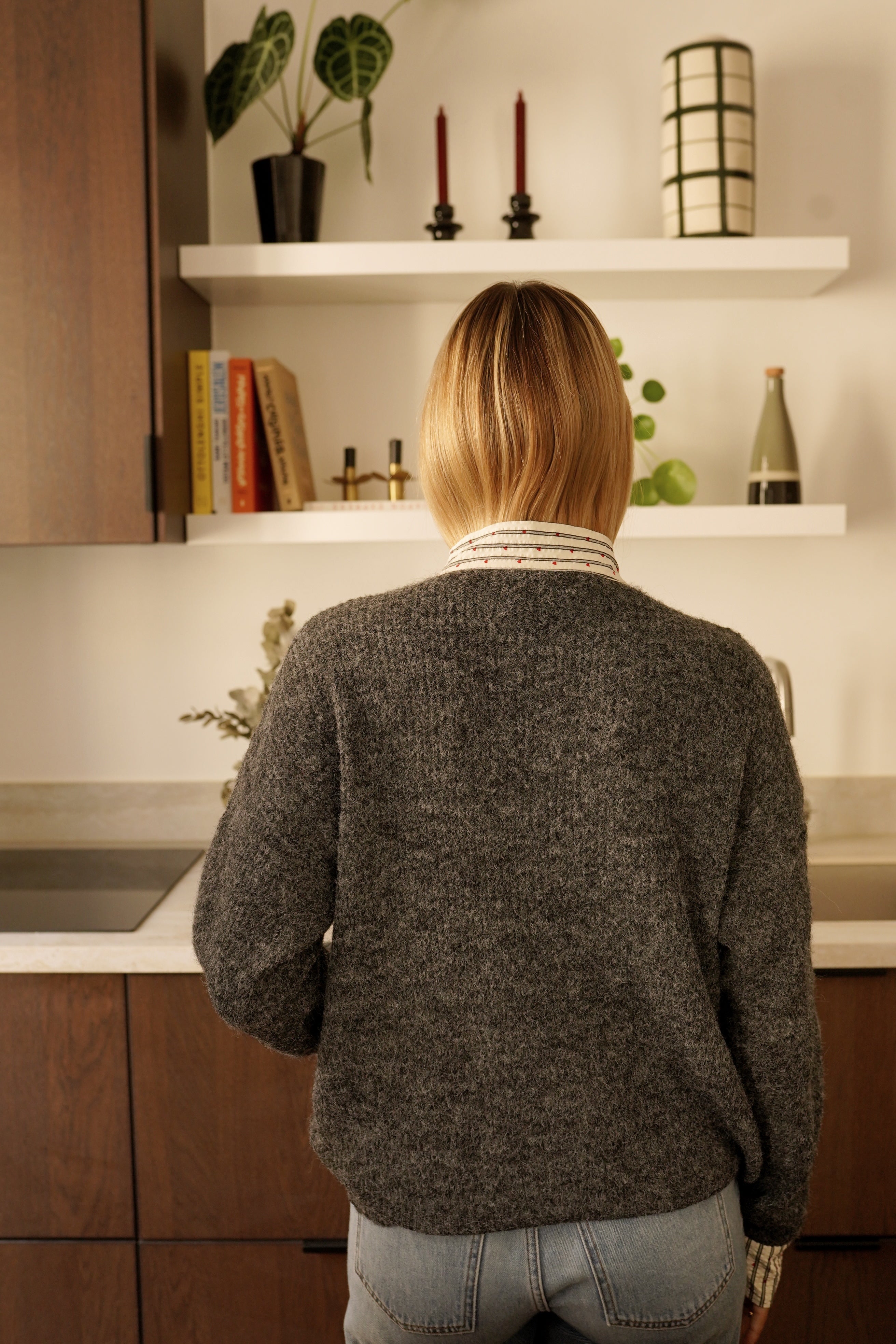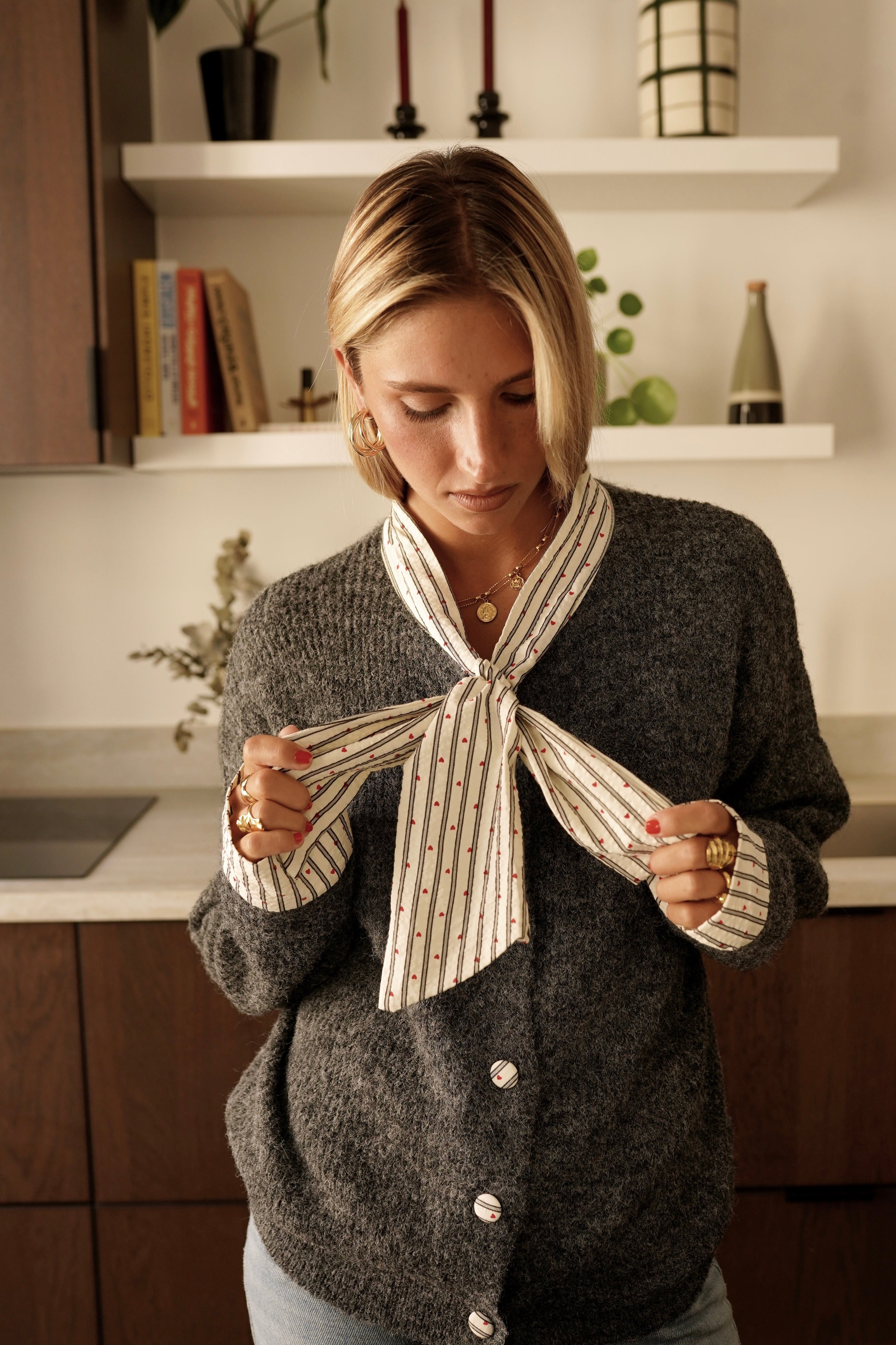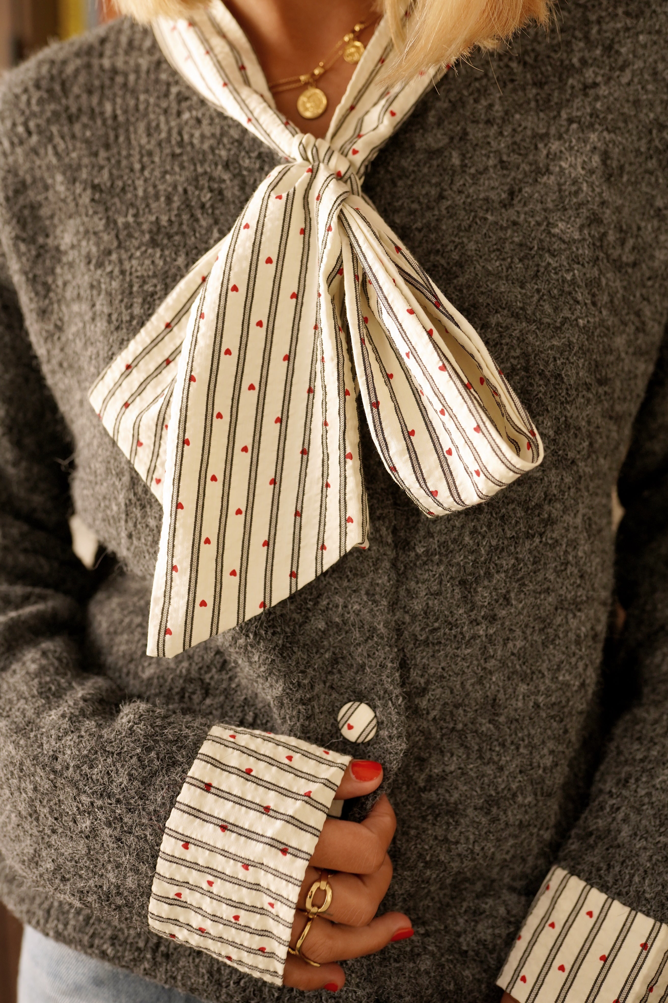 Sous ses lignes sobres, la maille Héloise cache une touche de fantaisie : ses finitions contrastées en tissu rayé ponctué de petits cœurs rouges. Un jeu de matières qui lui confère un charme singulier, à la fois raffiné et espiègle.