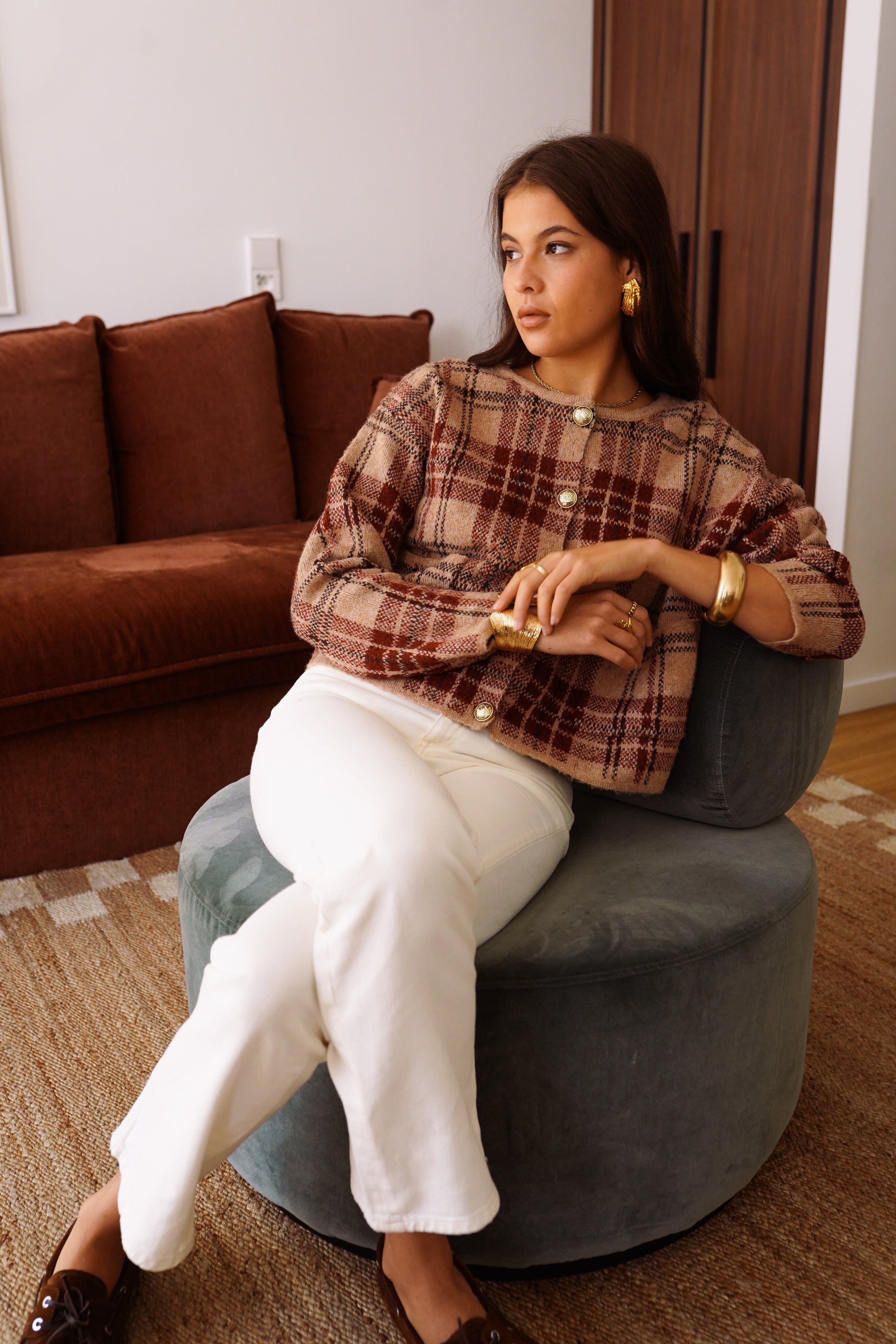 La maille Juana s’inspire des vestes rétro avec son motif à carreaux et ses boutons dorés gravés. Sa texture moelleuse et ses teintes chaudes en font une pièce à la fois élégante et réconfortante, parfaite pour les jours frais.
