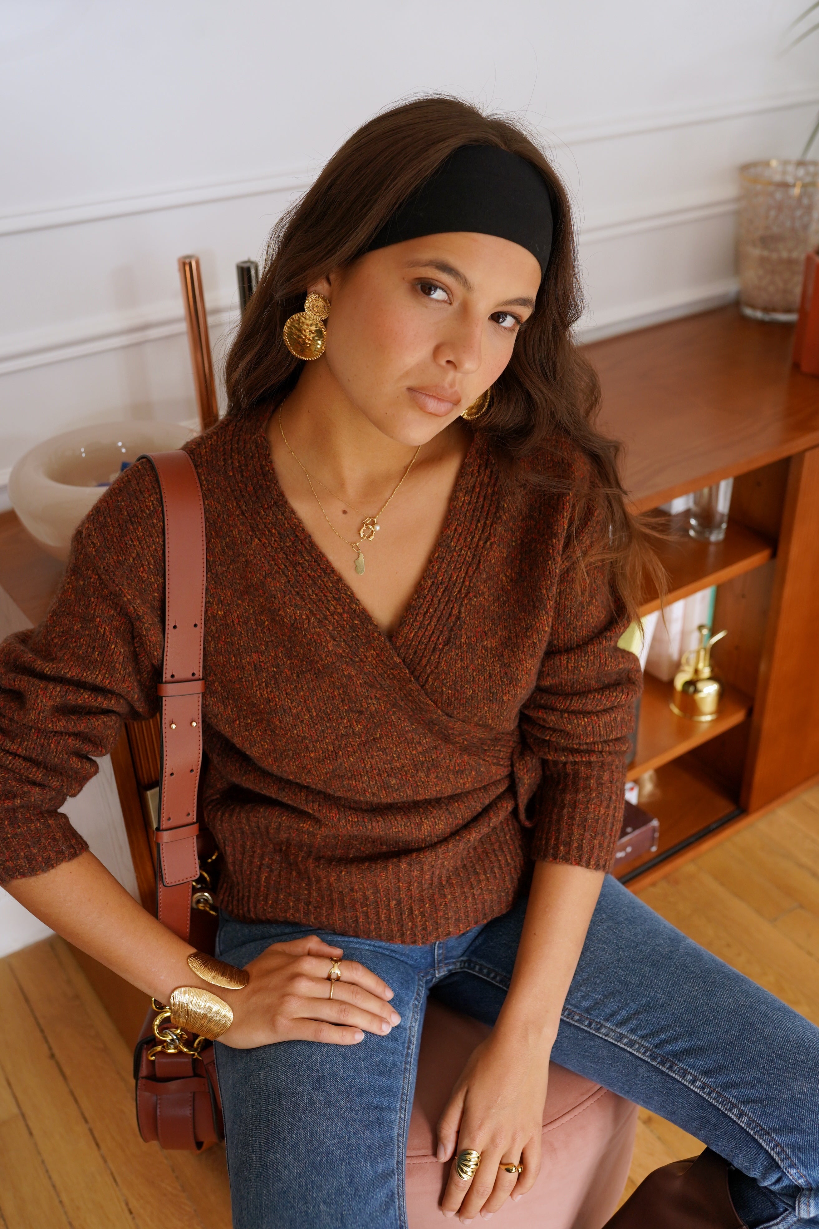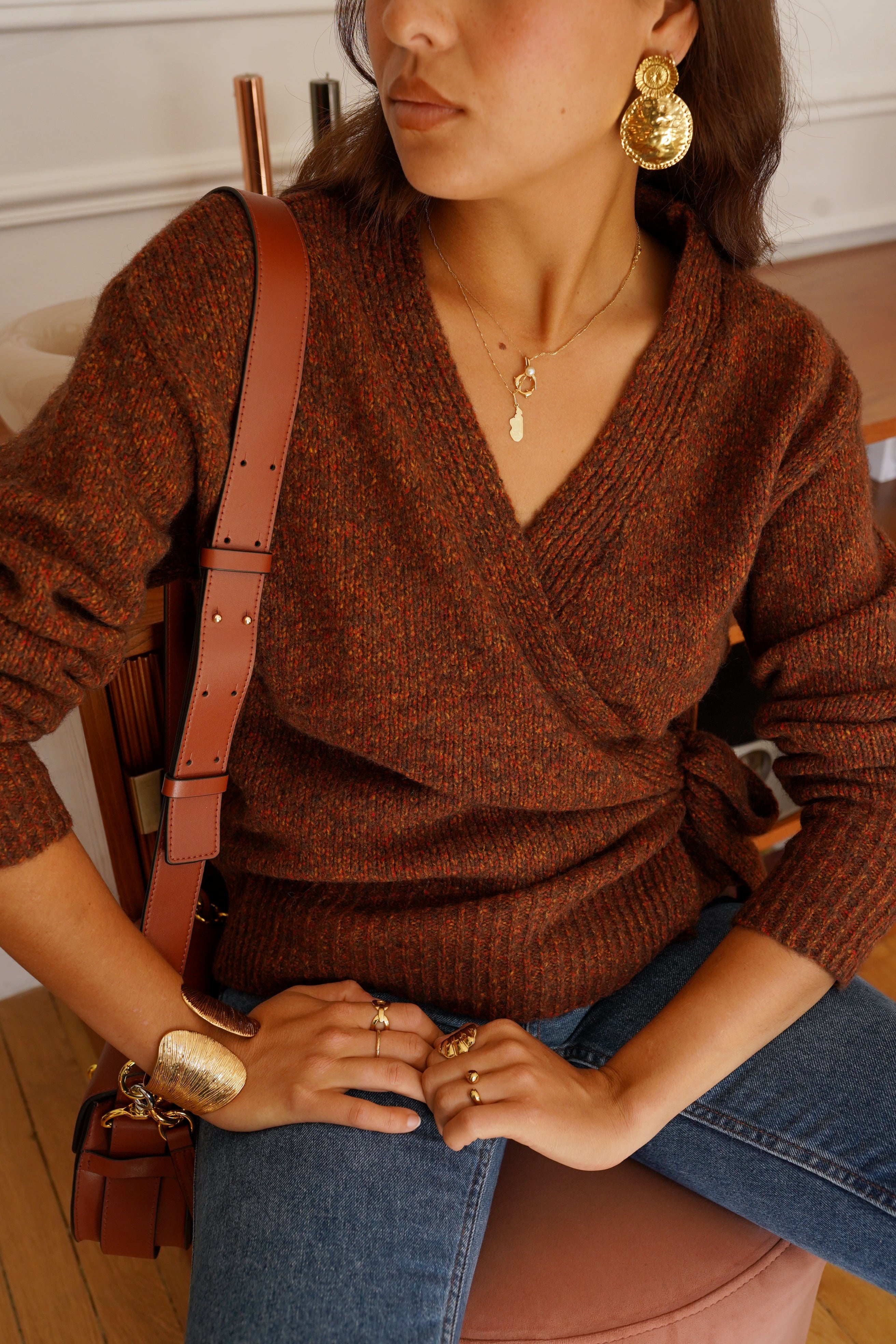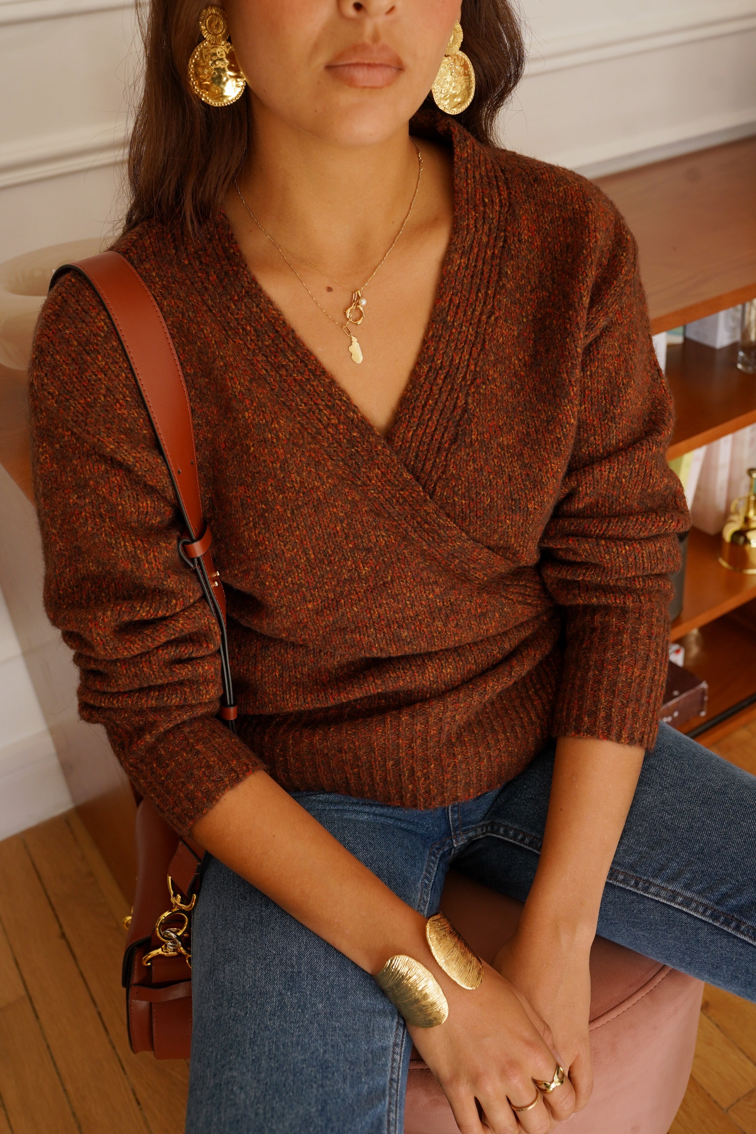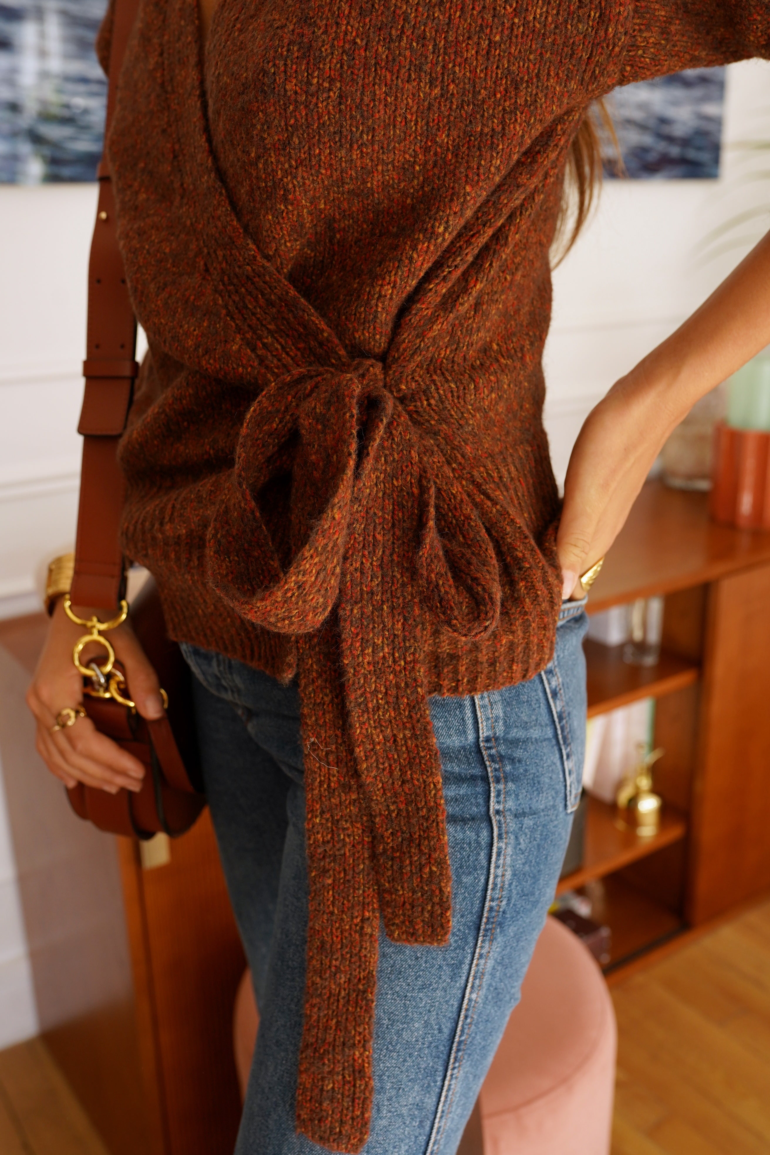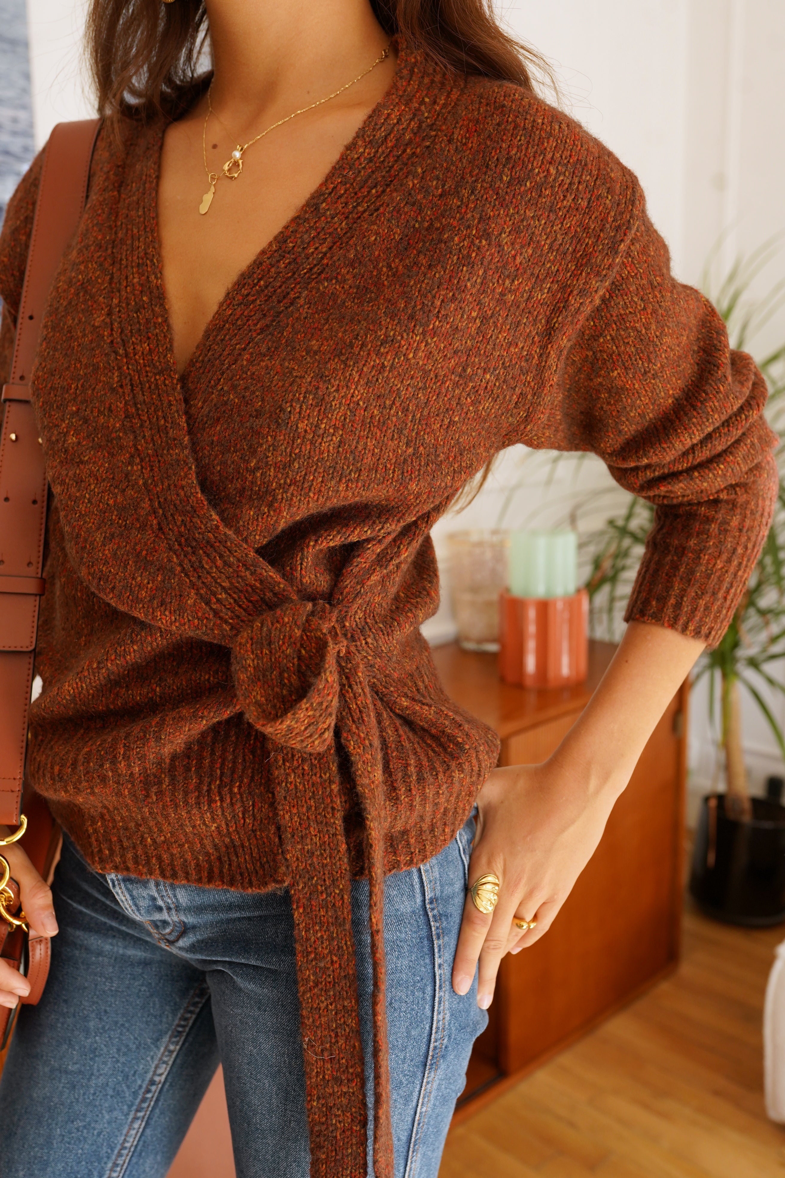 La maille Laufey séduit par son allure féminine et sa coupe cache-cœur sublimée d’un lien à nouer sur le côté. Sa texture riche, dans un mélange de tons brun et rouille, réchauffe instantanément le vestiaire automnal.