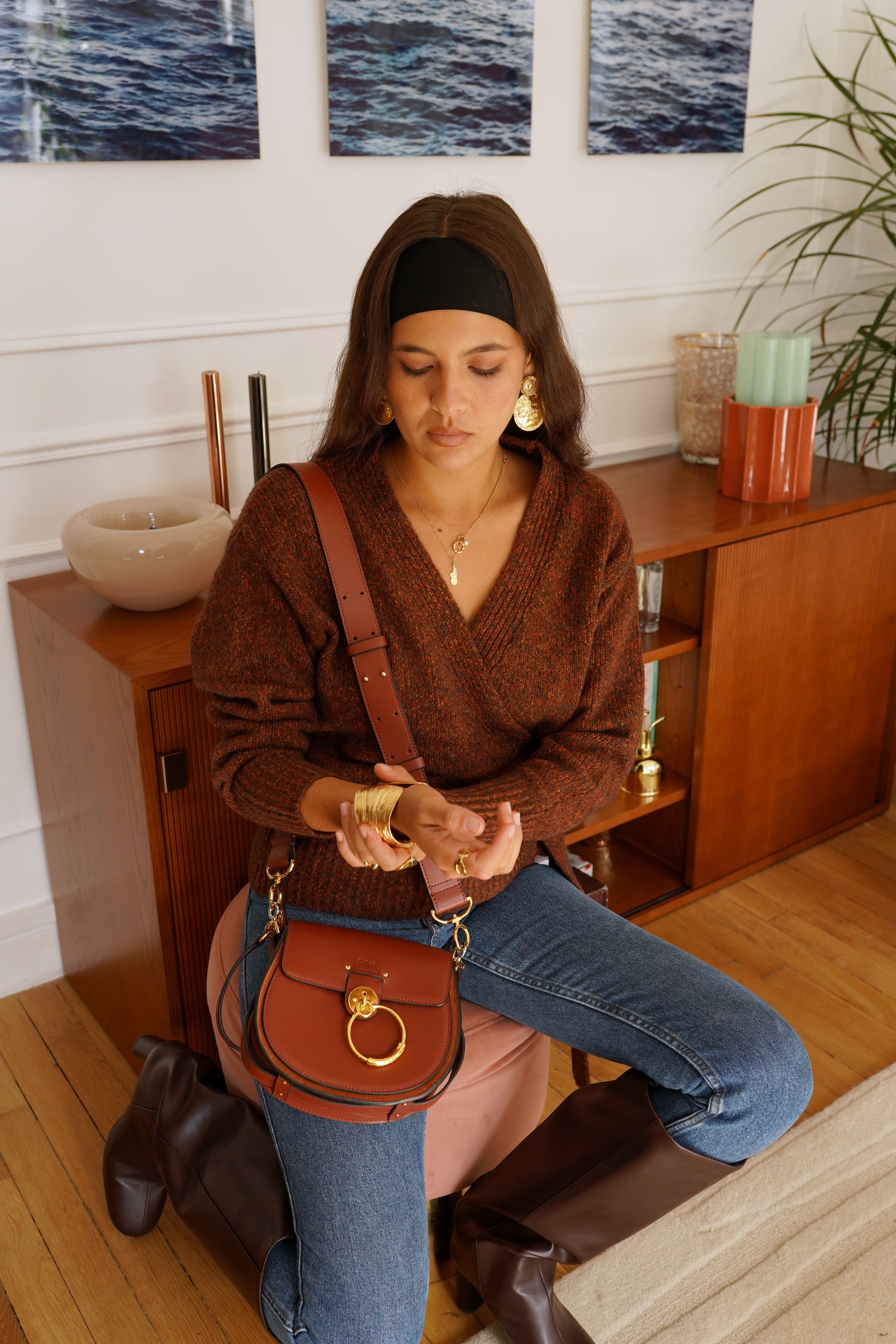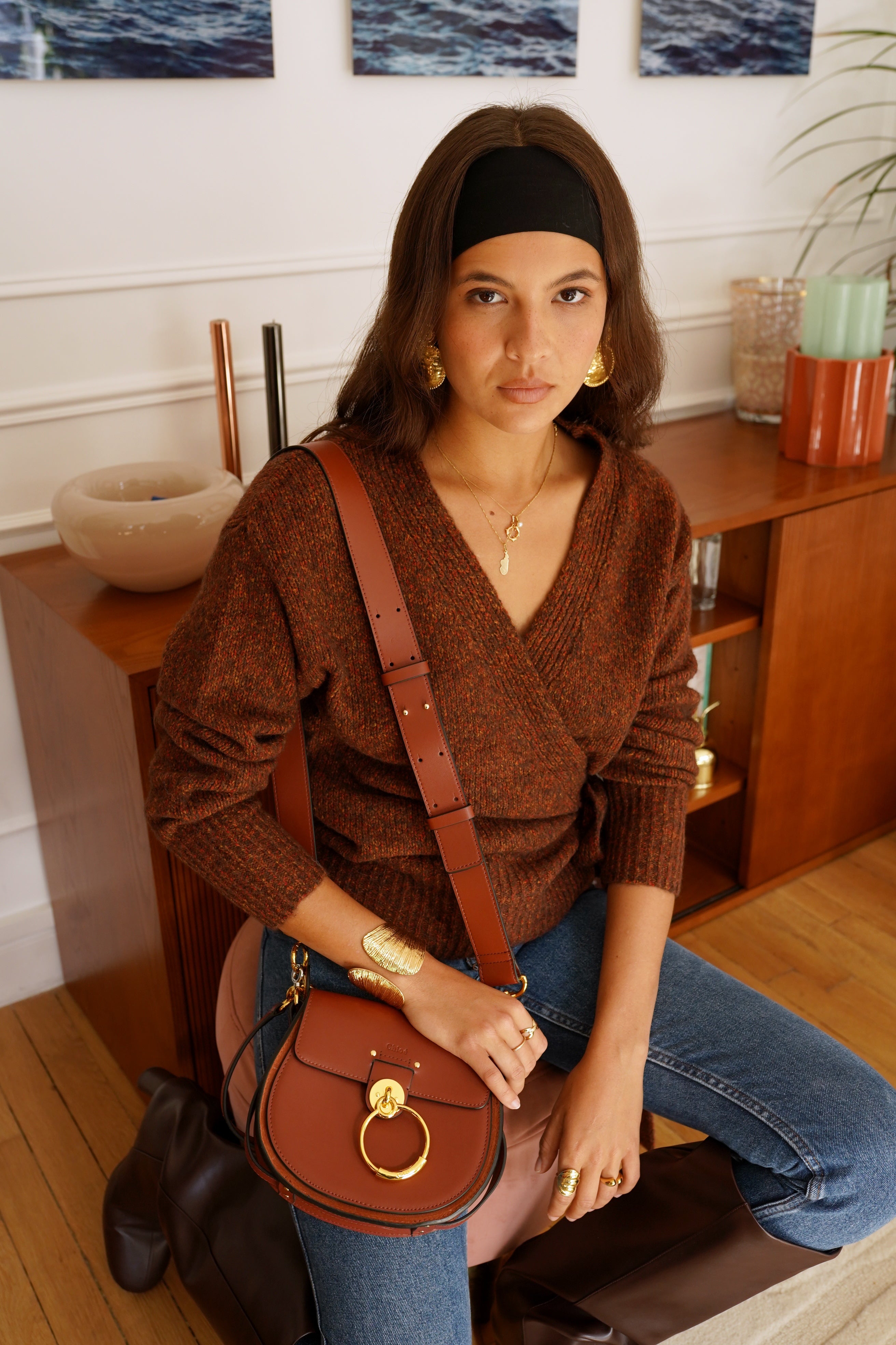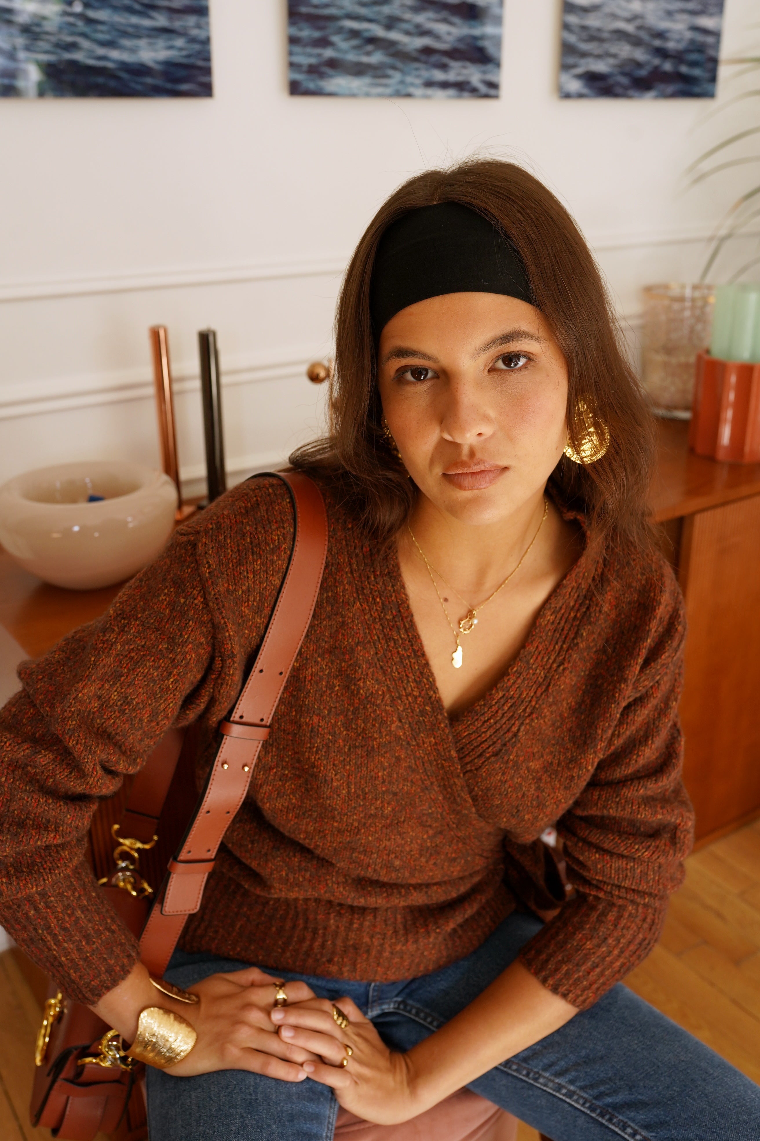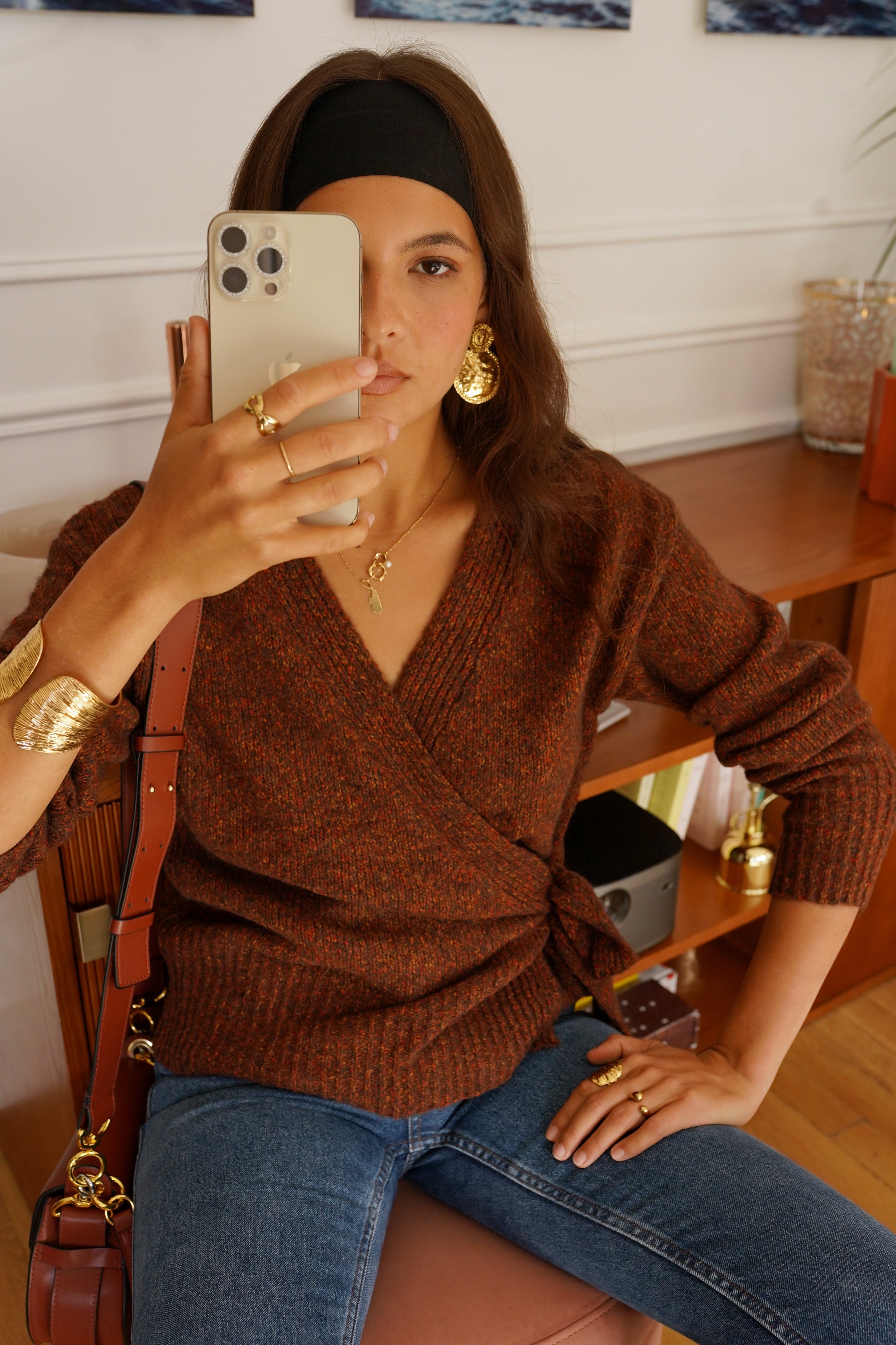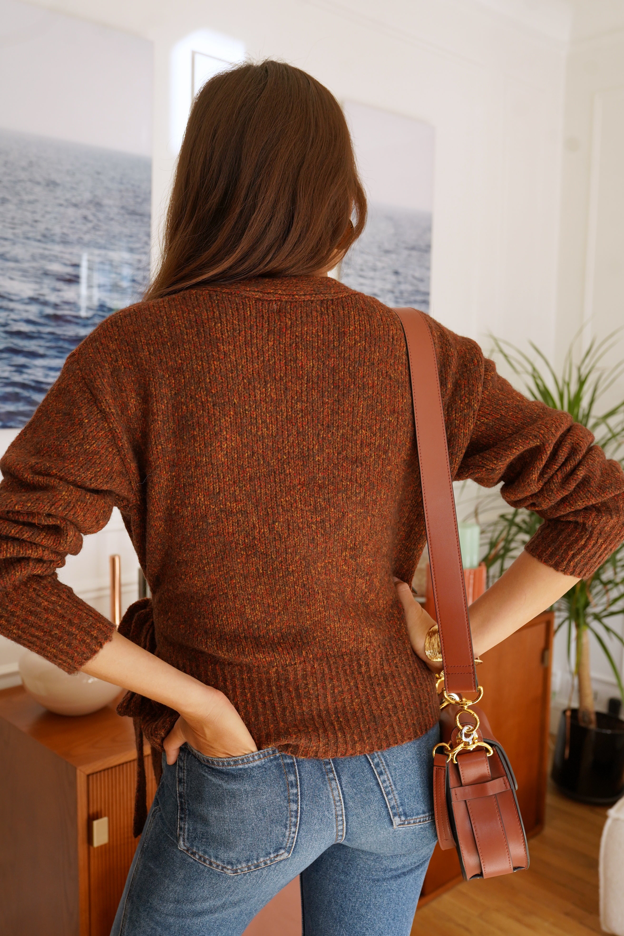 La maille Laufey séduit par son allure féminine et sa coupe cache-cœur sublimée d’un lien à nouer sur le côté. Sa texture riche, dans un mélange de tons brun et rouille, réchauffe instantanément le vestiaire automnal.