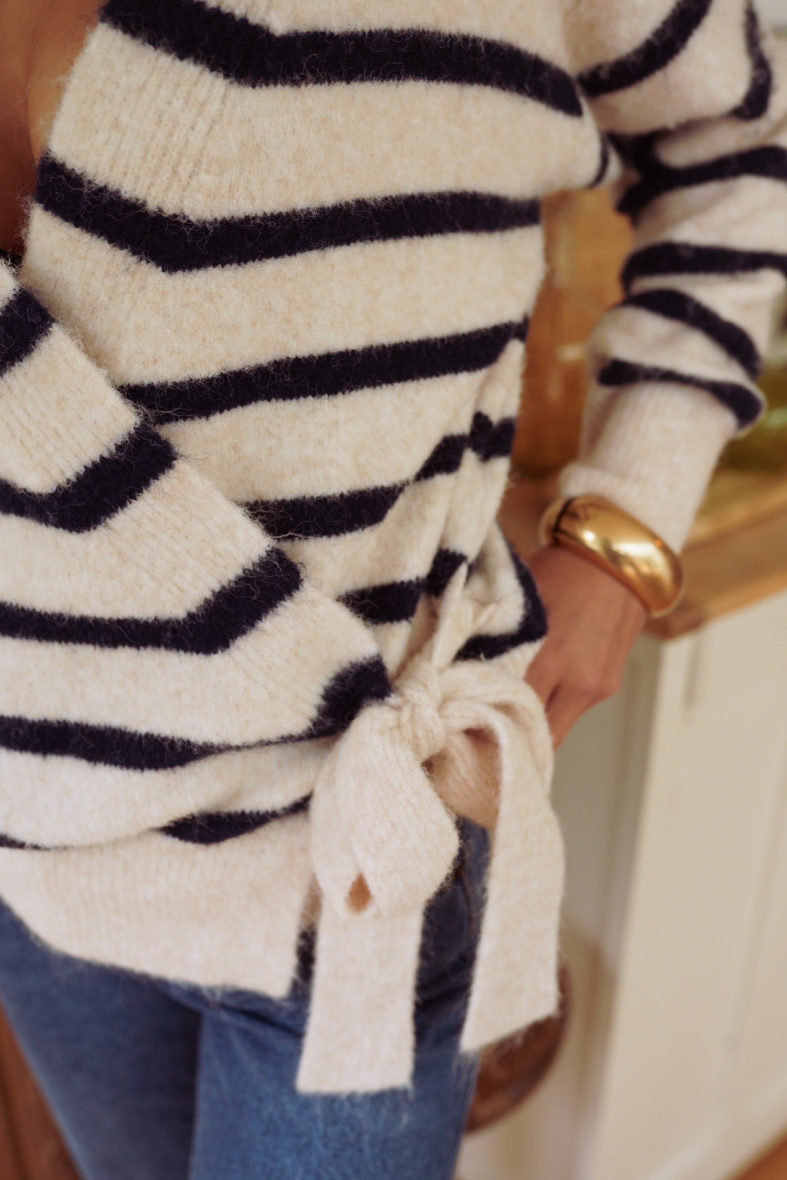 Le pull Laureen revisite l’indémodable marinière dans une version douce et féminine. Sa coupe cache-cœur souligne naturellement la silhouette, tandis que sa maille moelleuse apporte tout le confort qu’on aime.