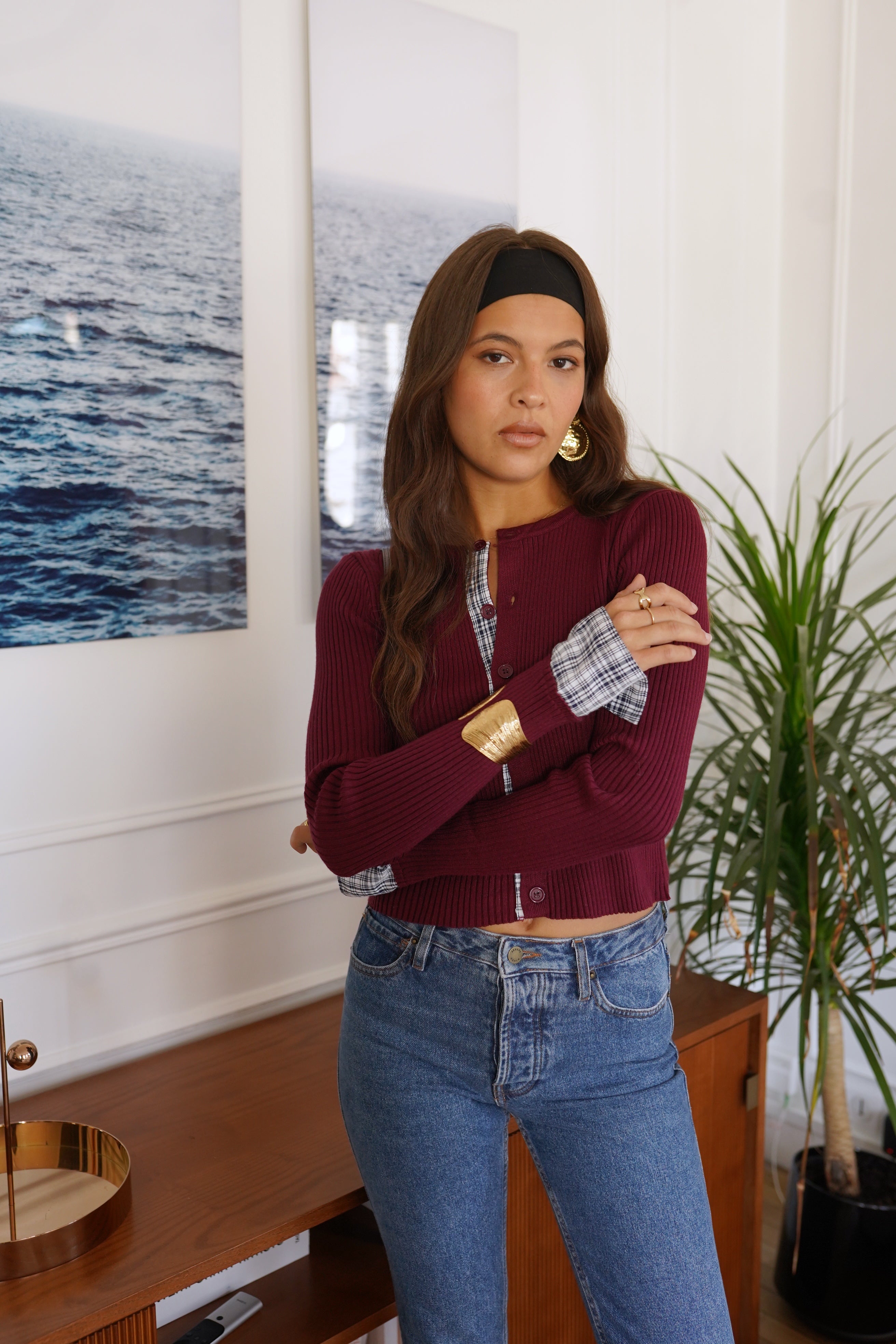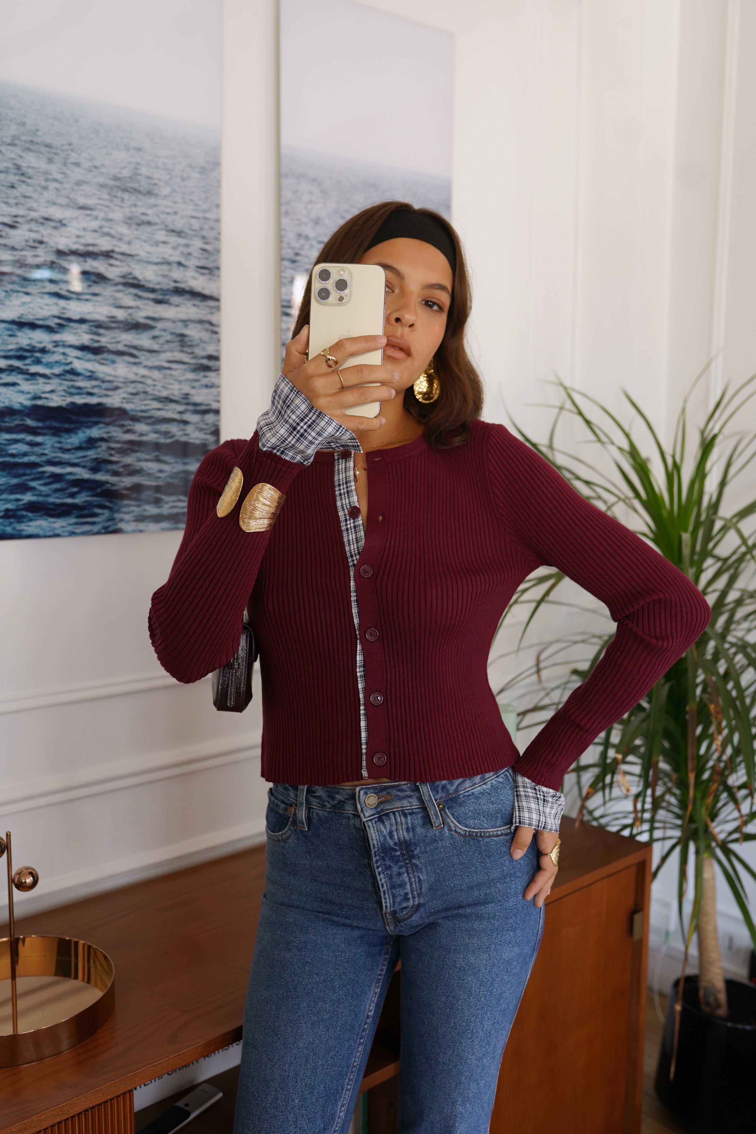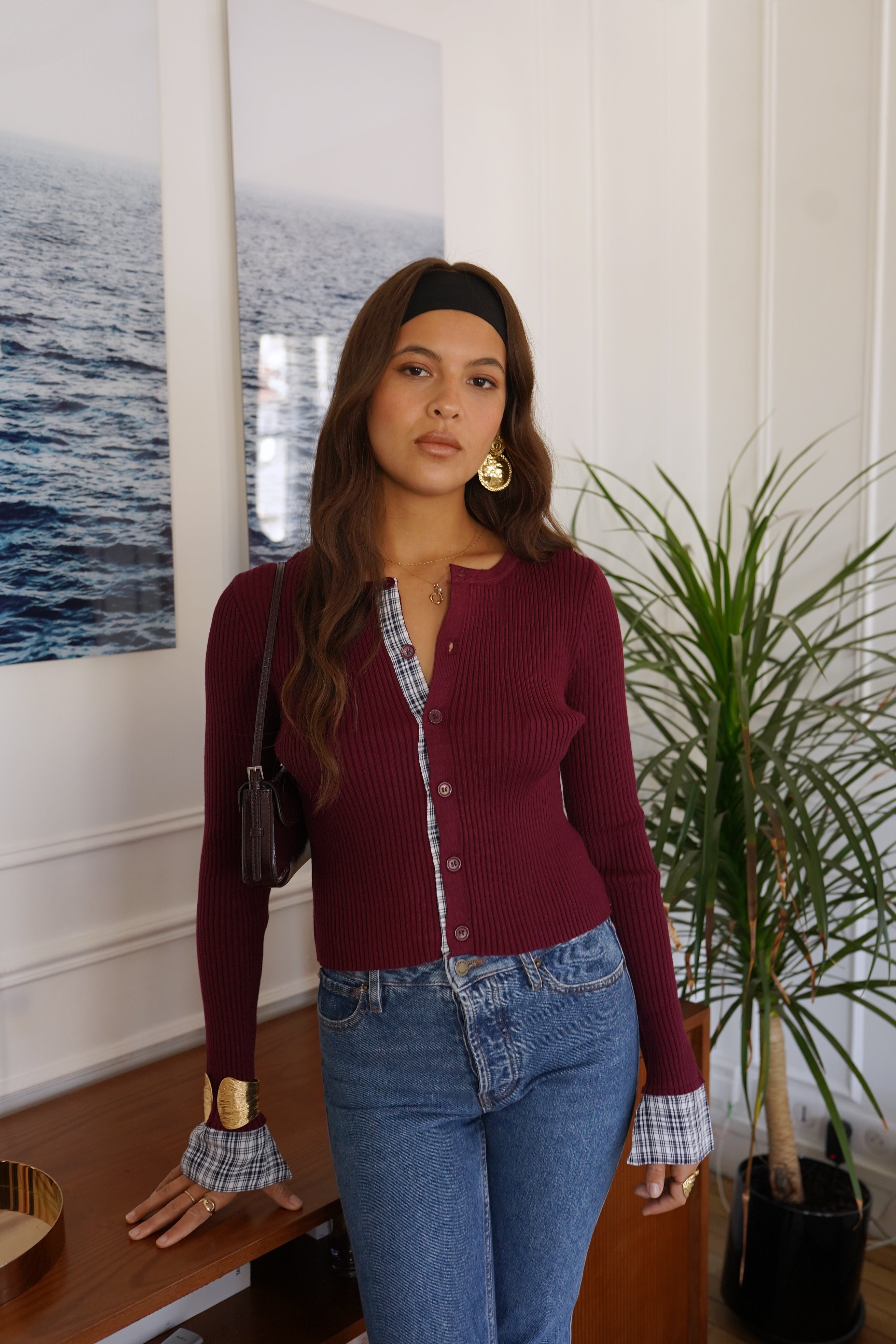 Le haut Mikhail revisite le cardigan avec audace ? sa coupe près du corps et son coloris bordeaux intense et ses finitions contrastées façon chemise à carreaux apportent un twist original et moderne, parfait pour donner du caractère à vos looks.