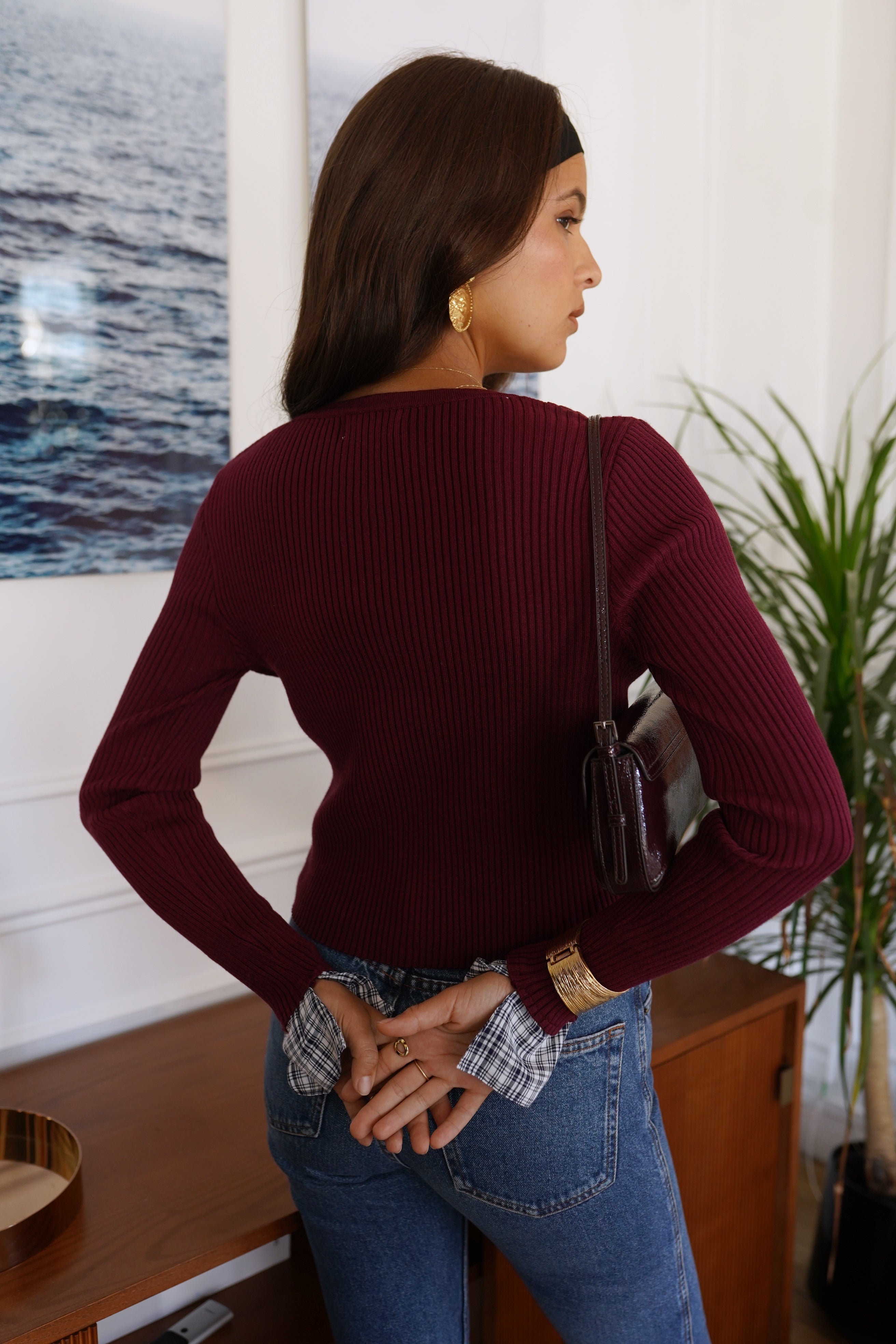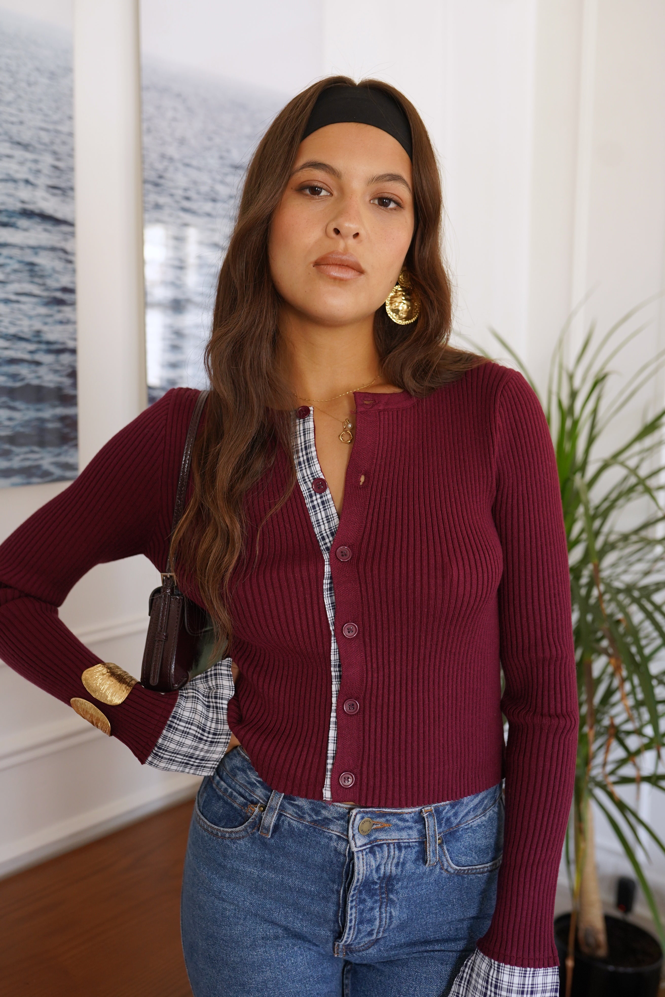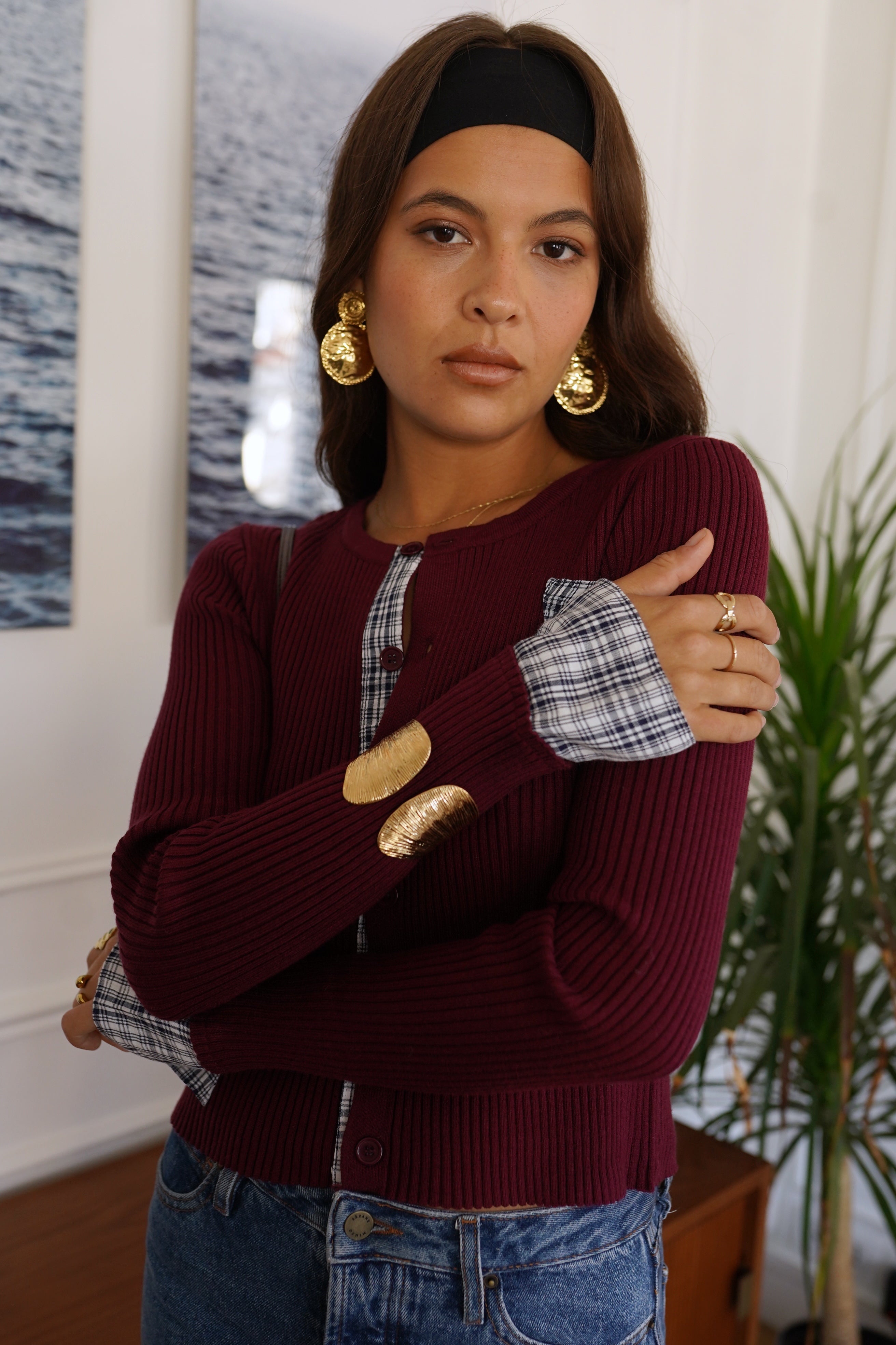 Le haut Mikhail revisite le cardigan avec audace ? sa coupe près du corps et son coloris bordeaux intense et ses finitions contrastées façon chemise à carreaux apportent un twist original et moderne, parfait pour donner du caractère à vos looks.